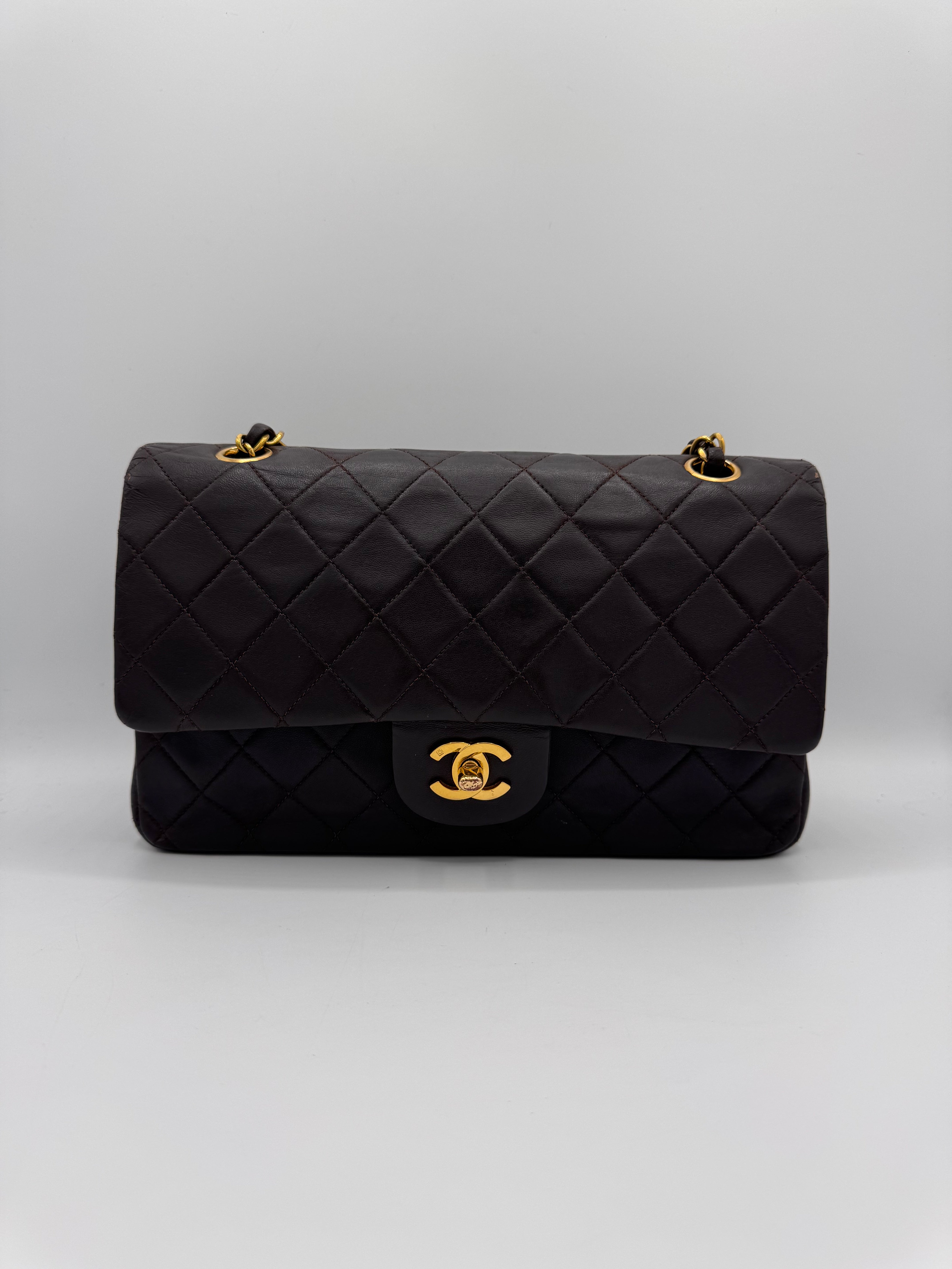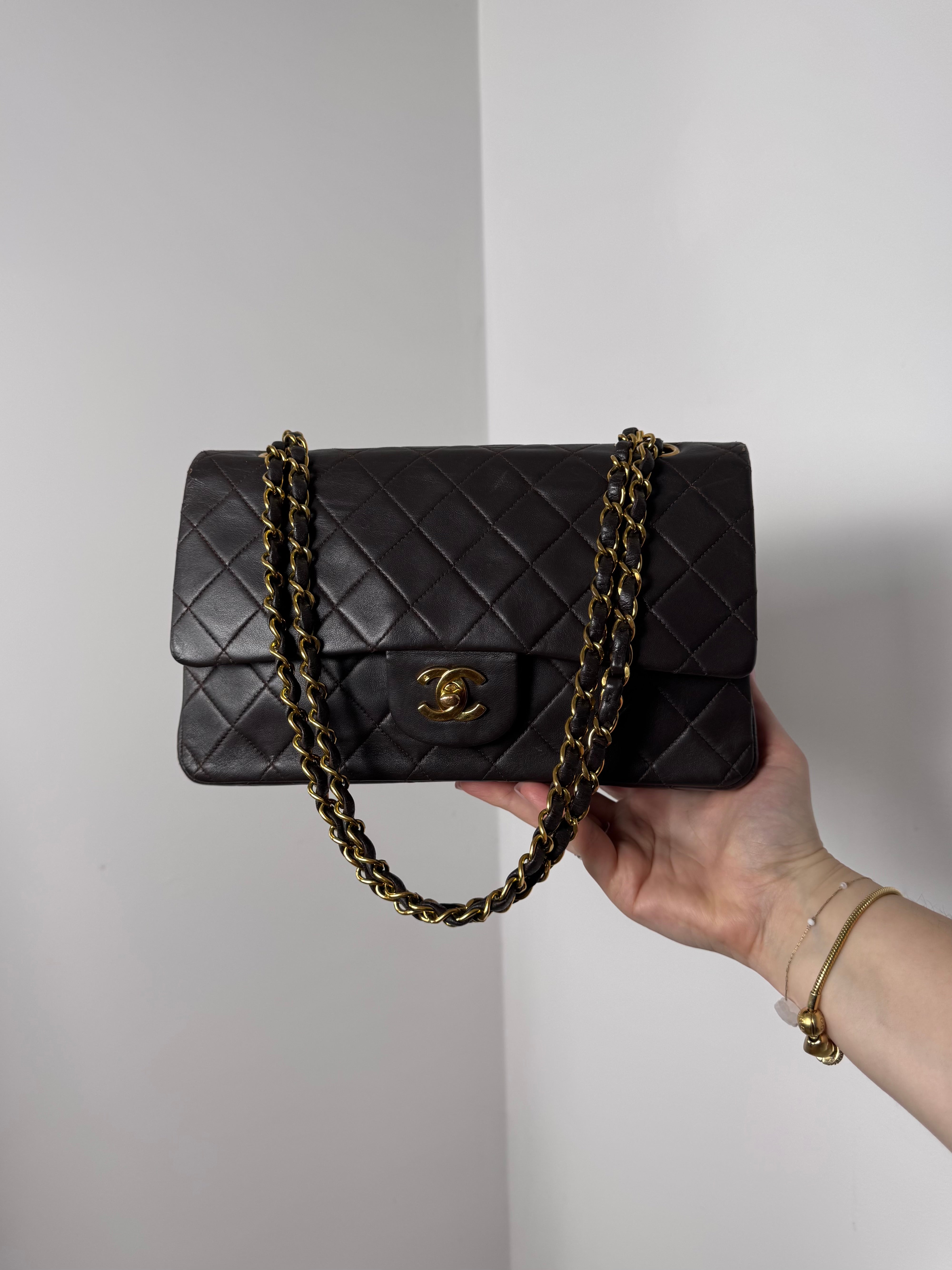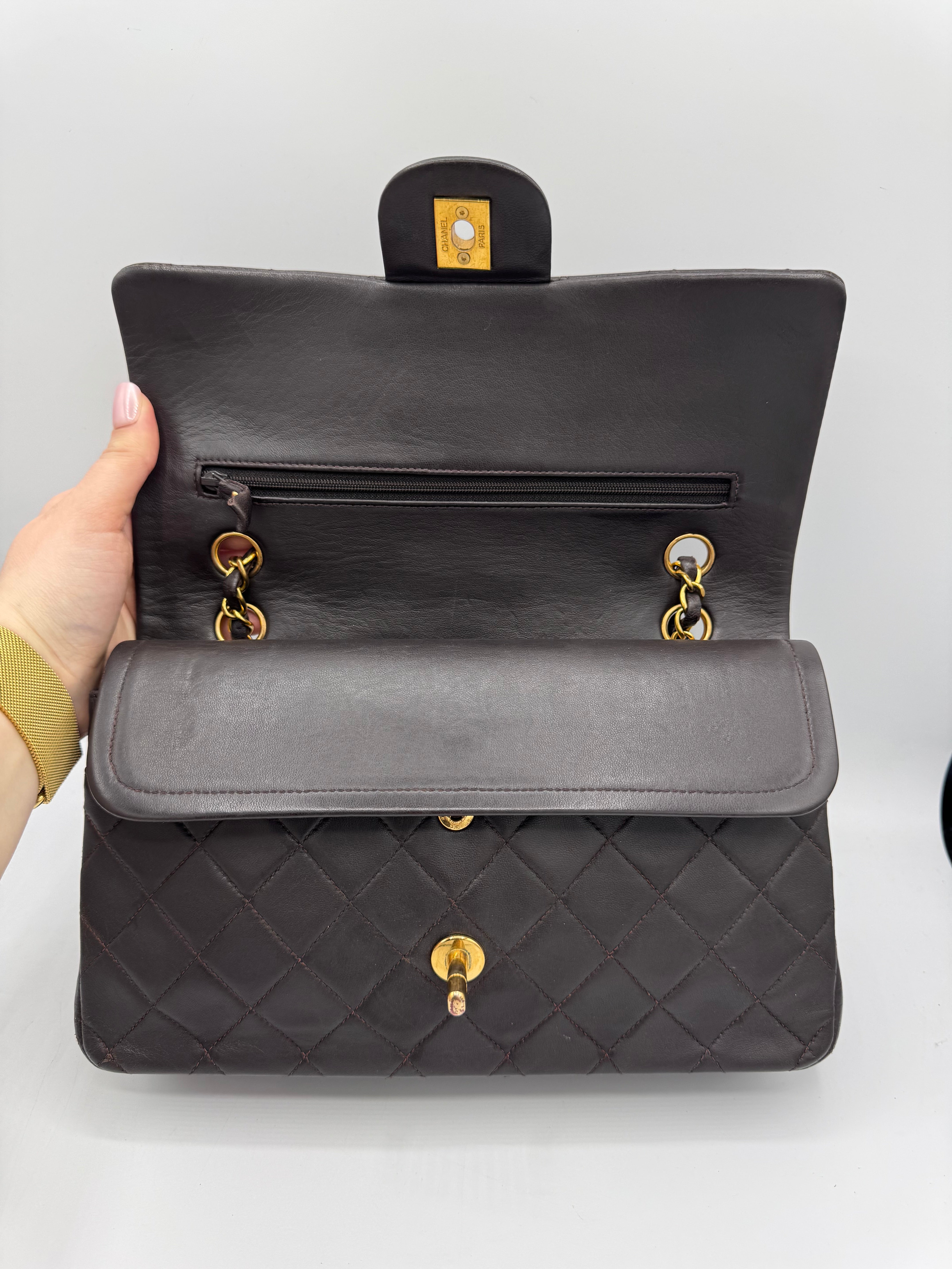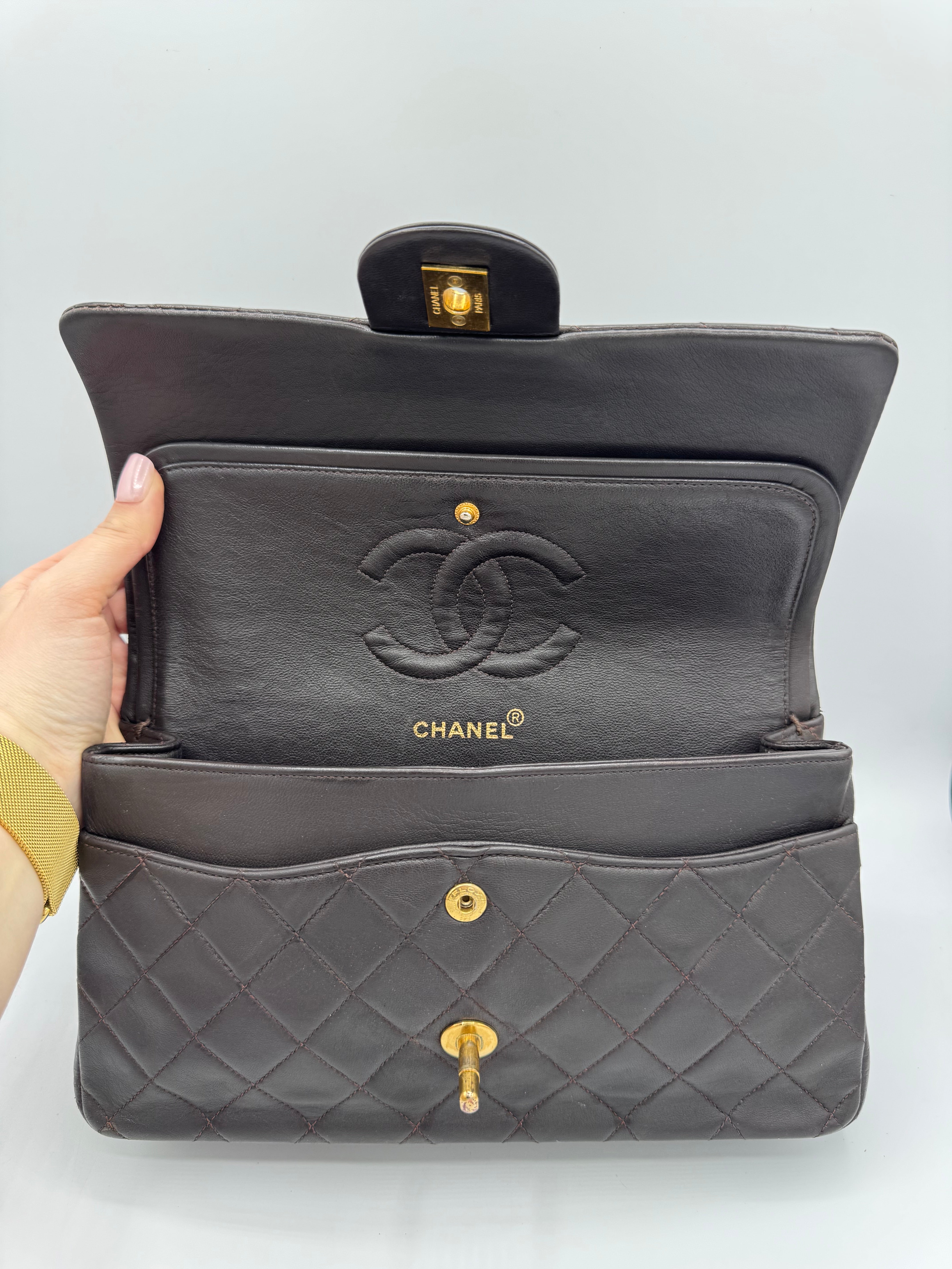 Sac Chanel Timeless vintage double rabat coloris chocolat, en très bon état.