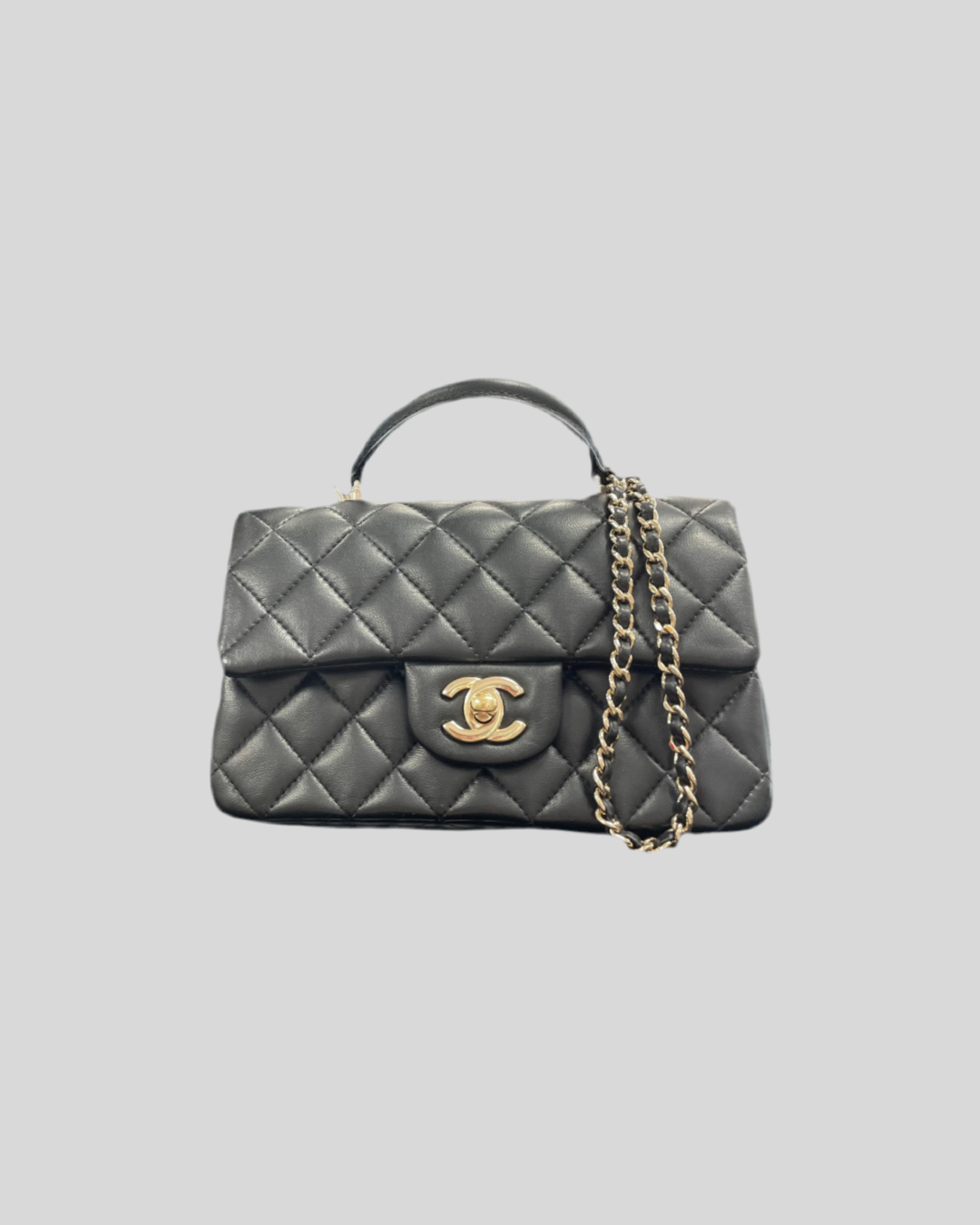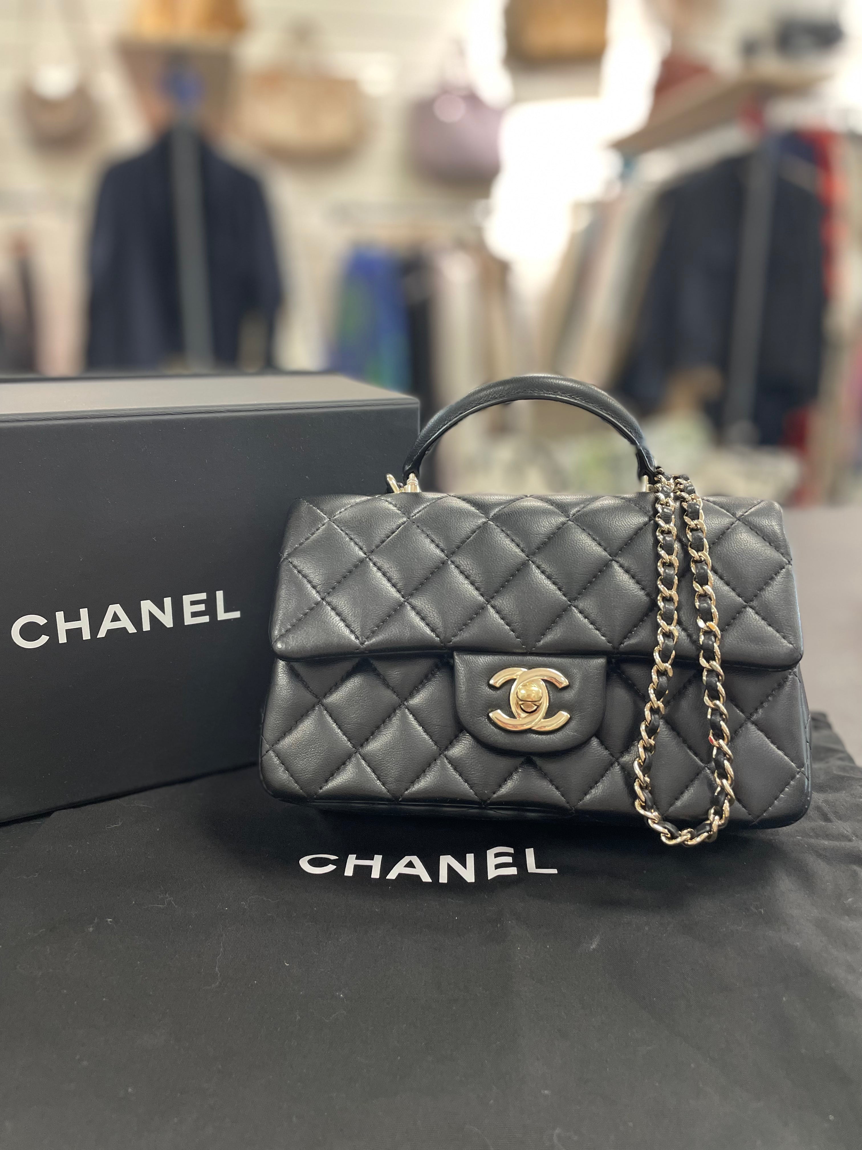 Sac Timeless Top Handle Chanel noir, bijouterie champagne en très bon état.
