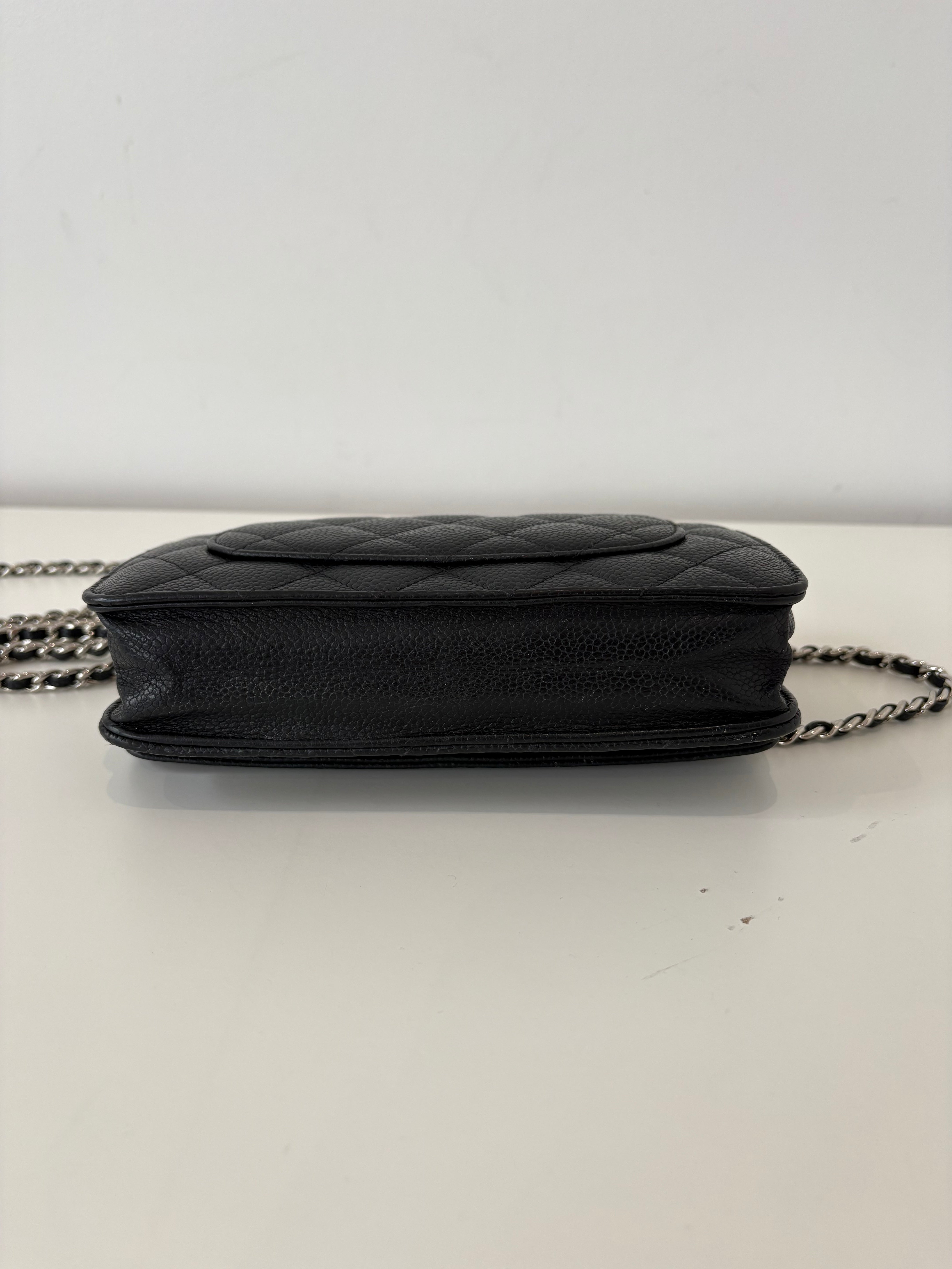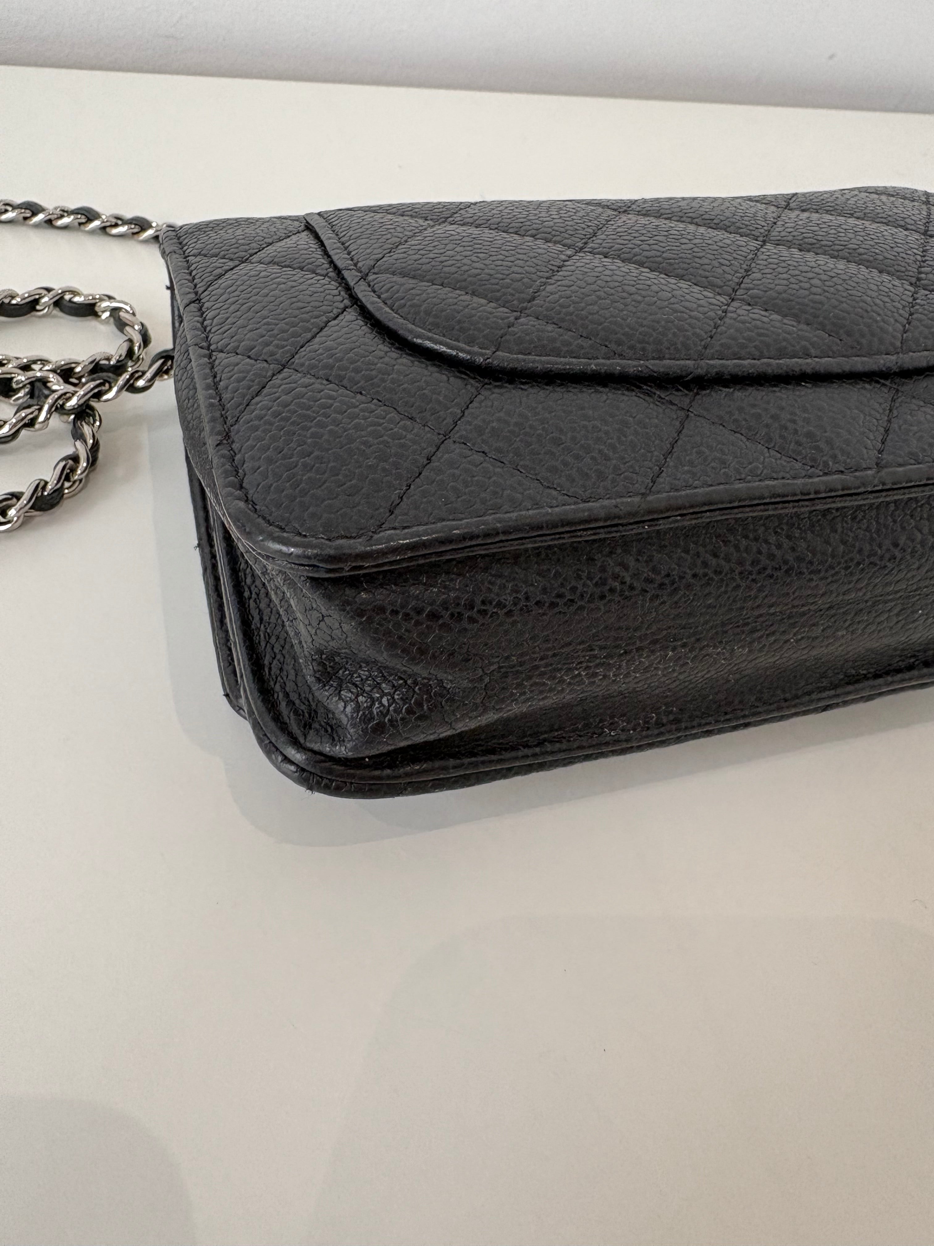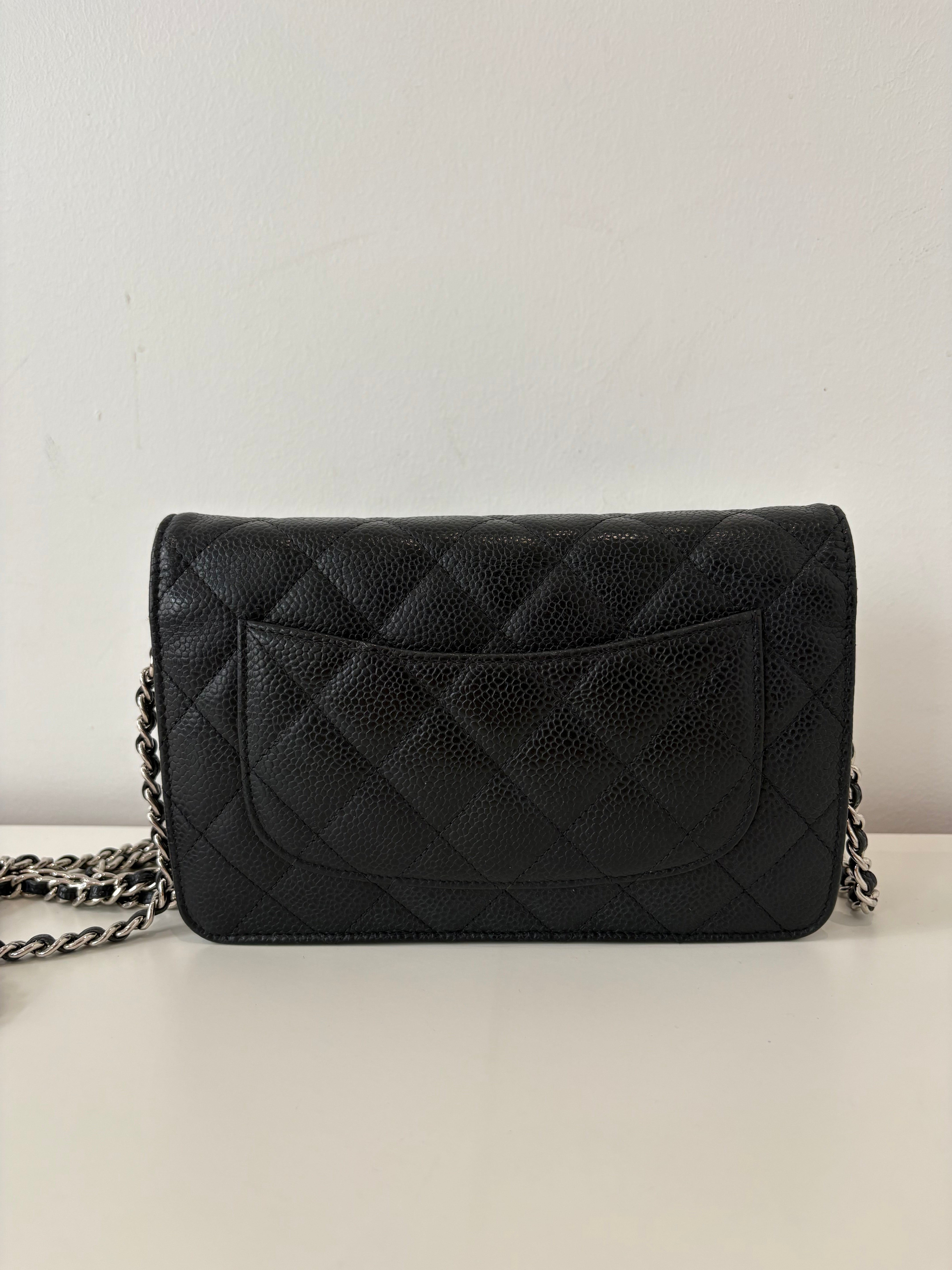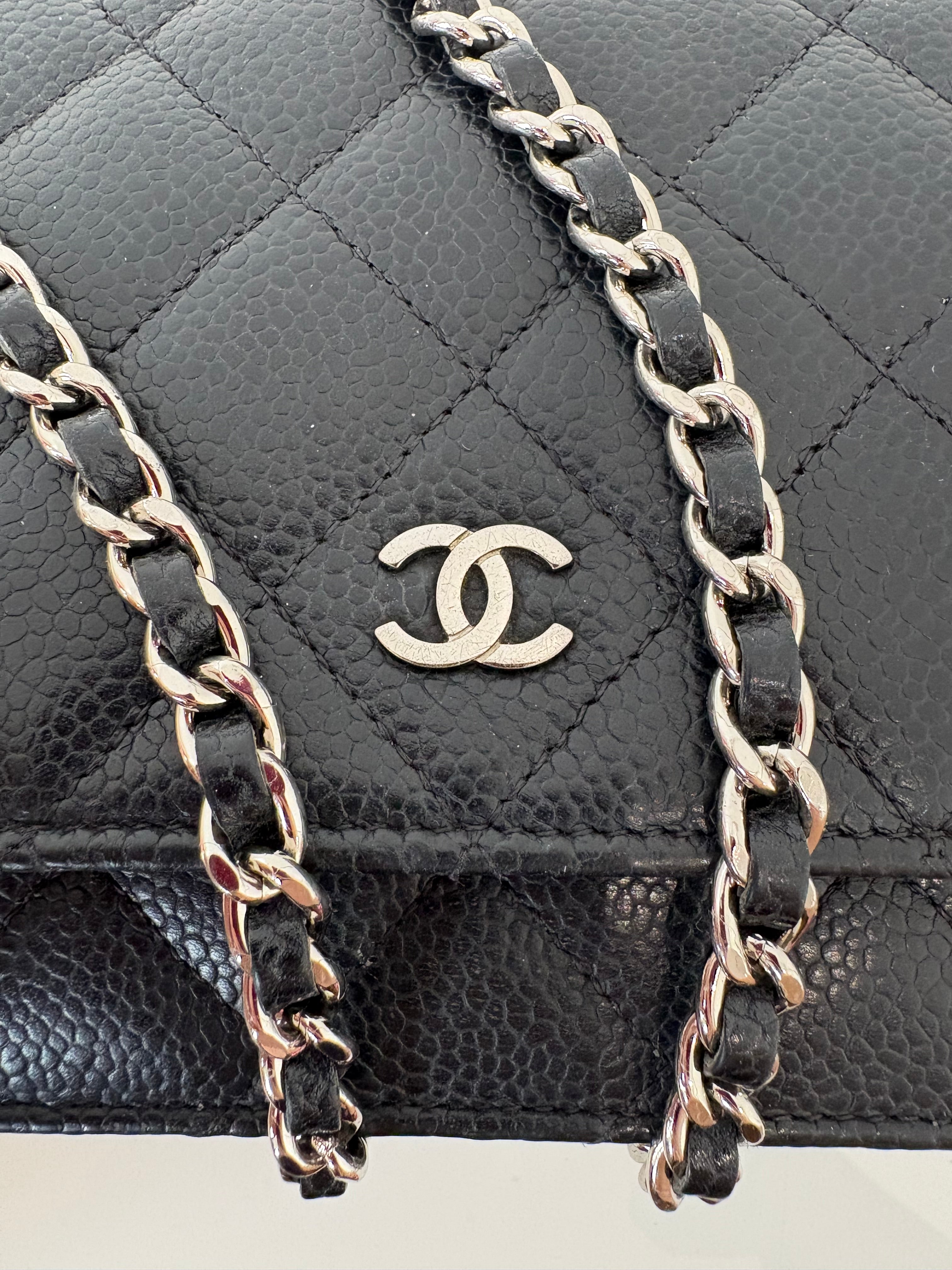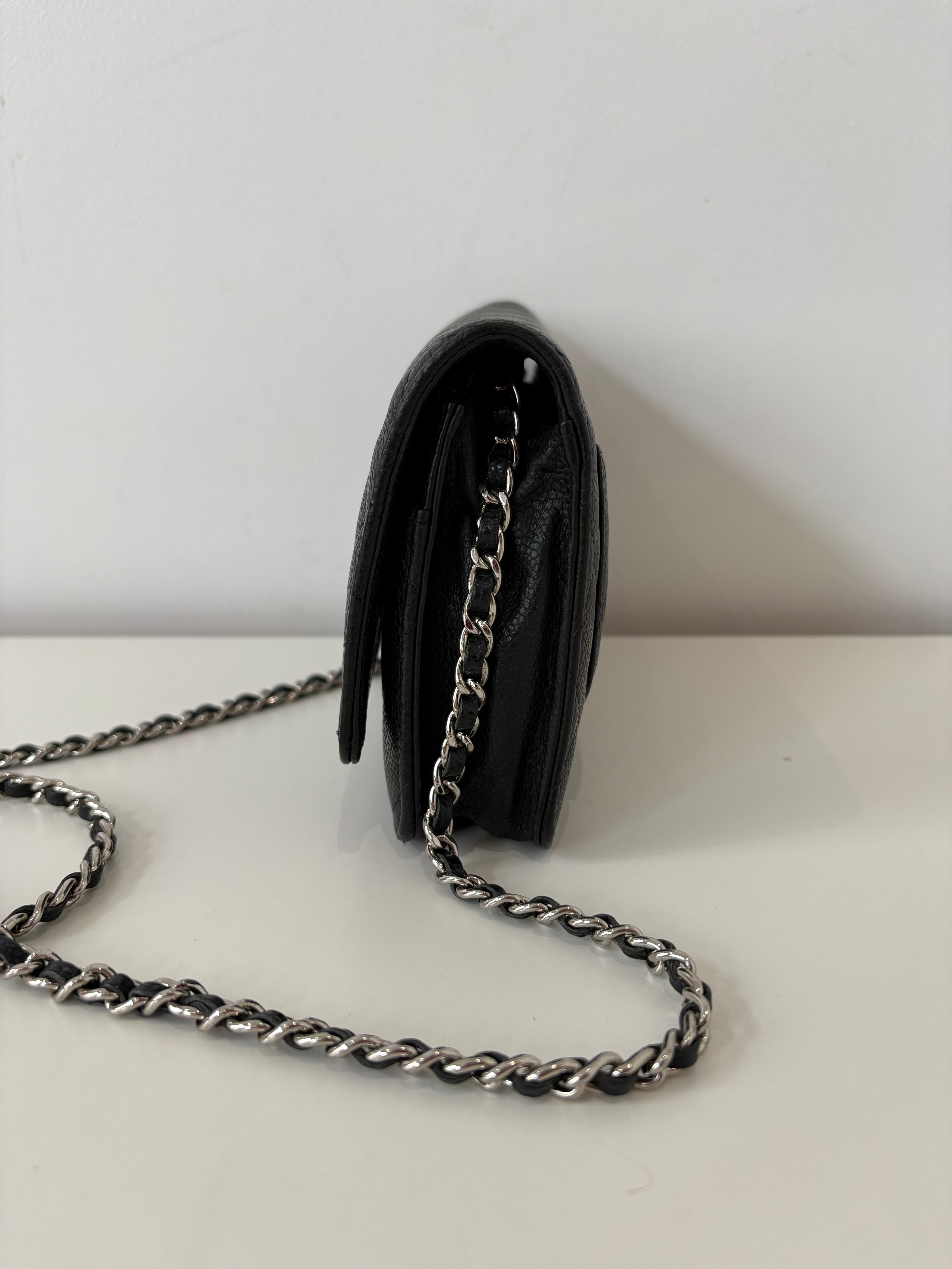 Wallet on Chain Chanel en cuir de veau grainé noir, bijouterie palladium, argentée.