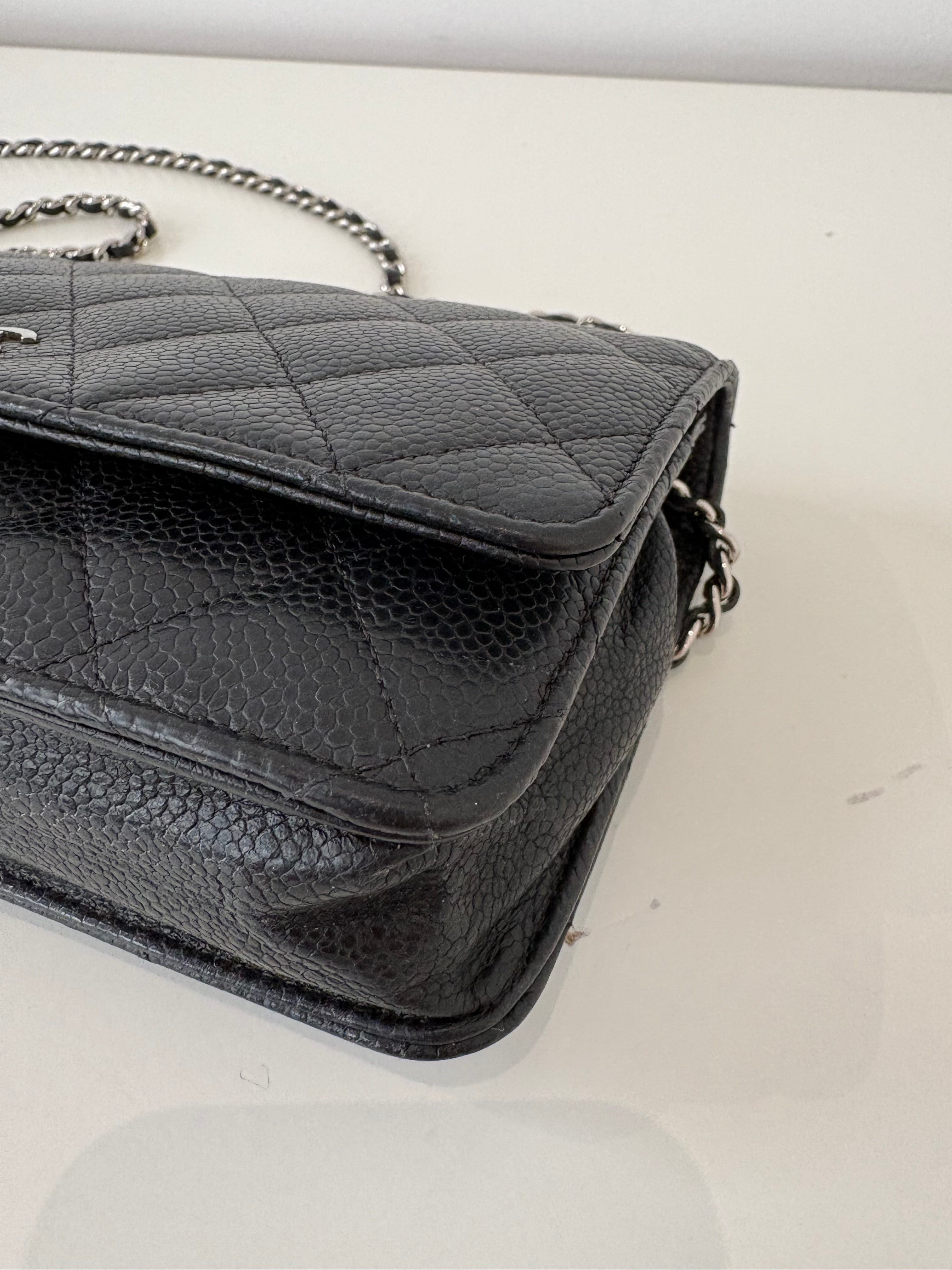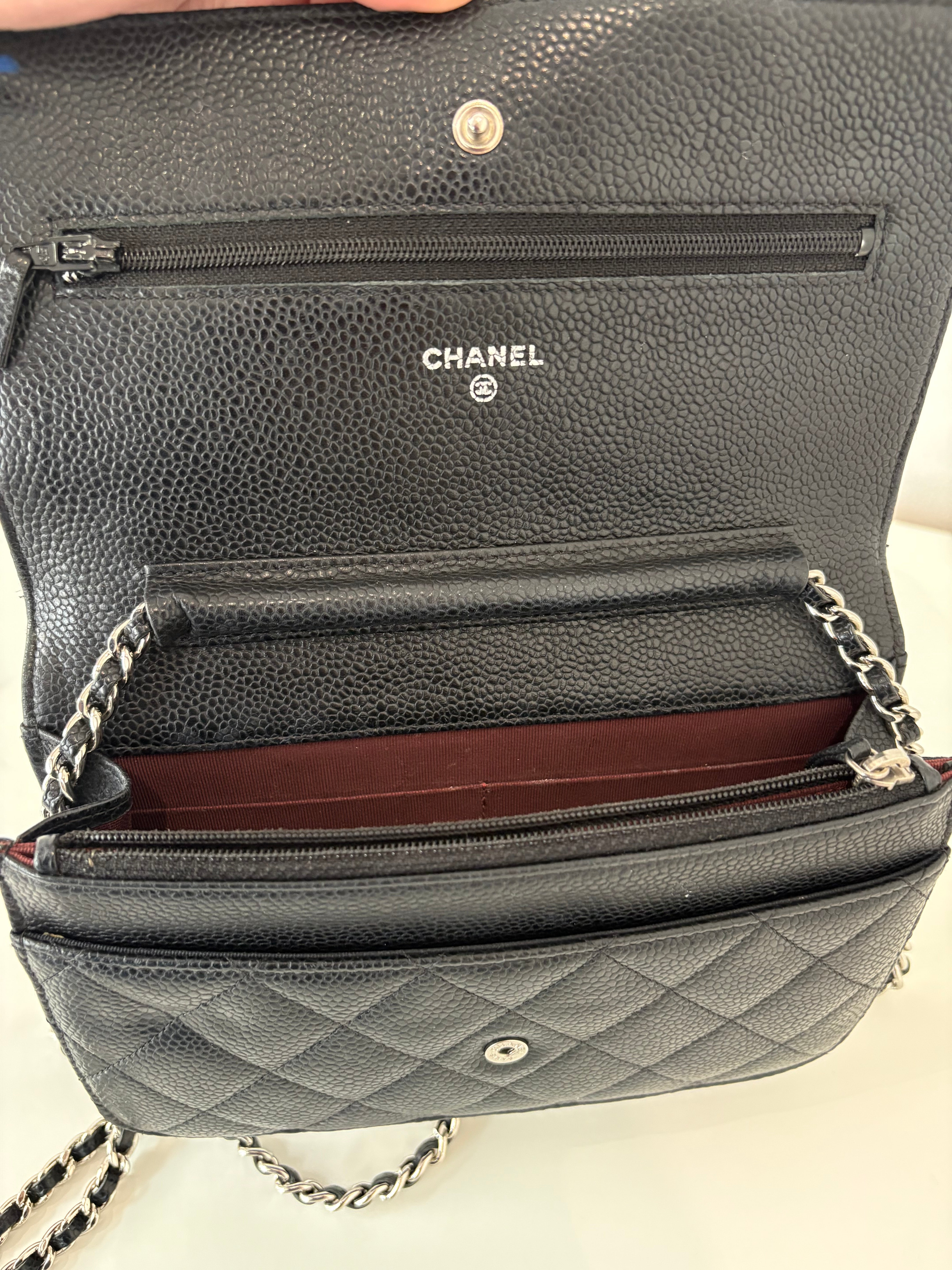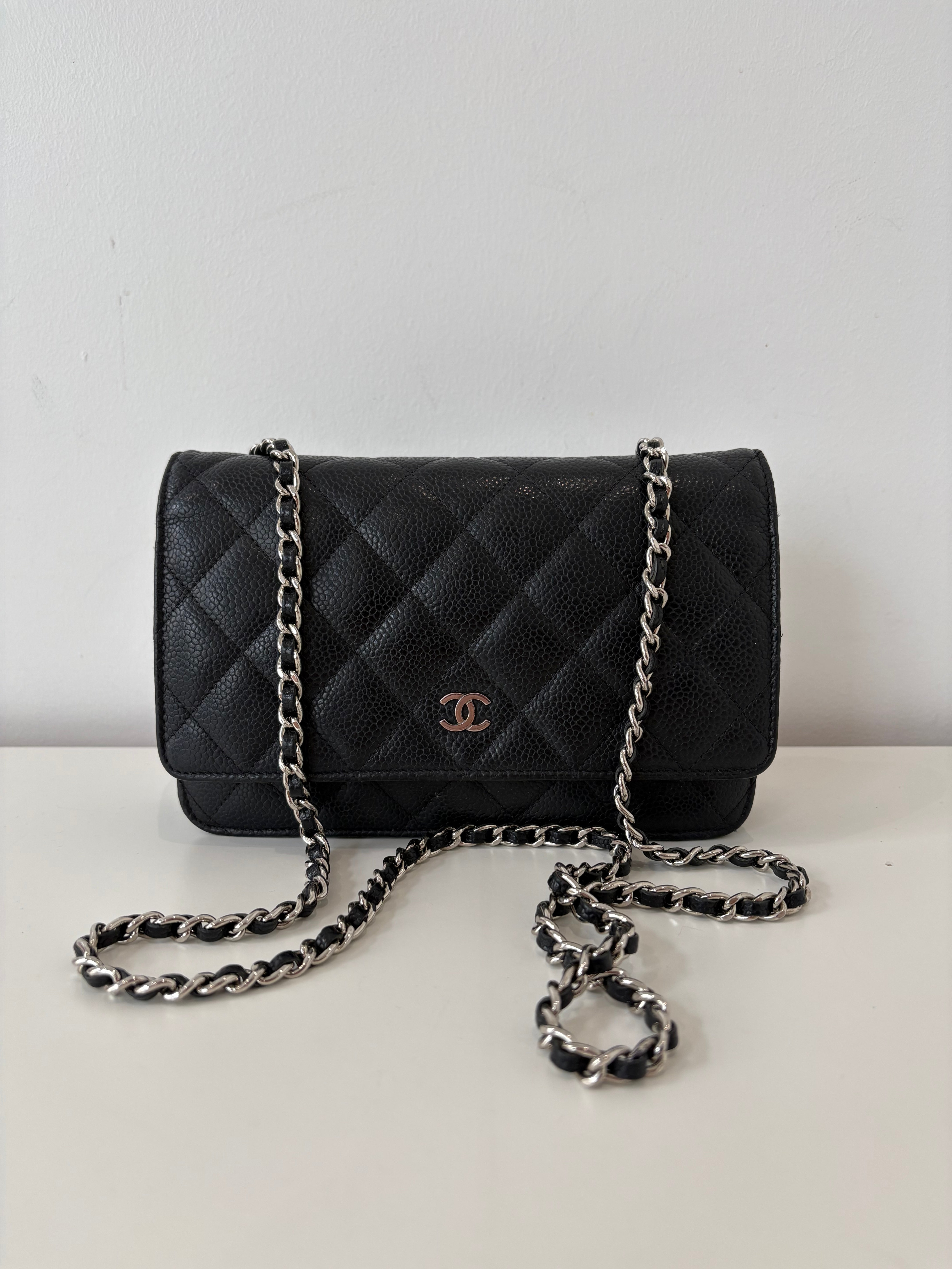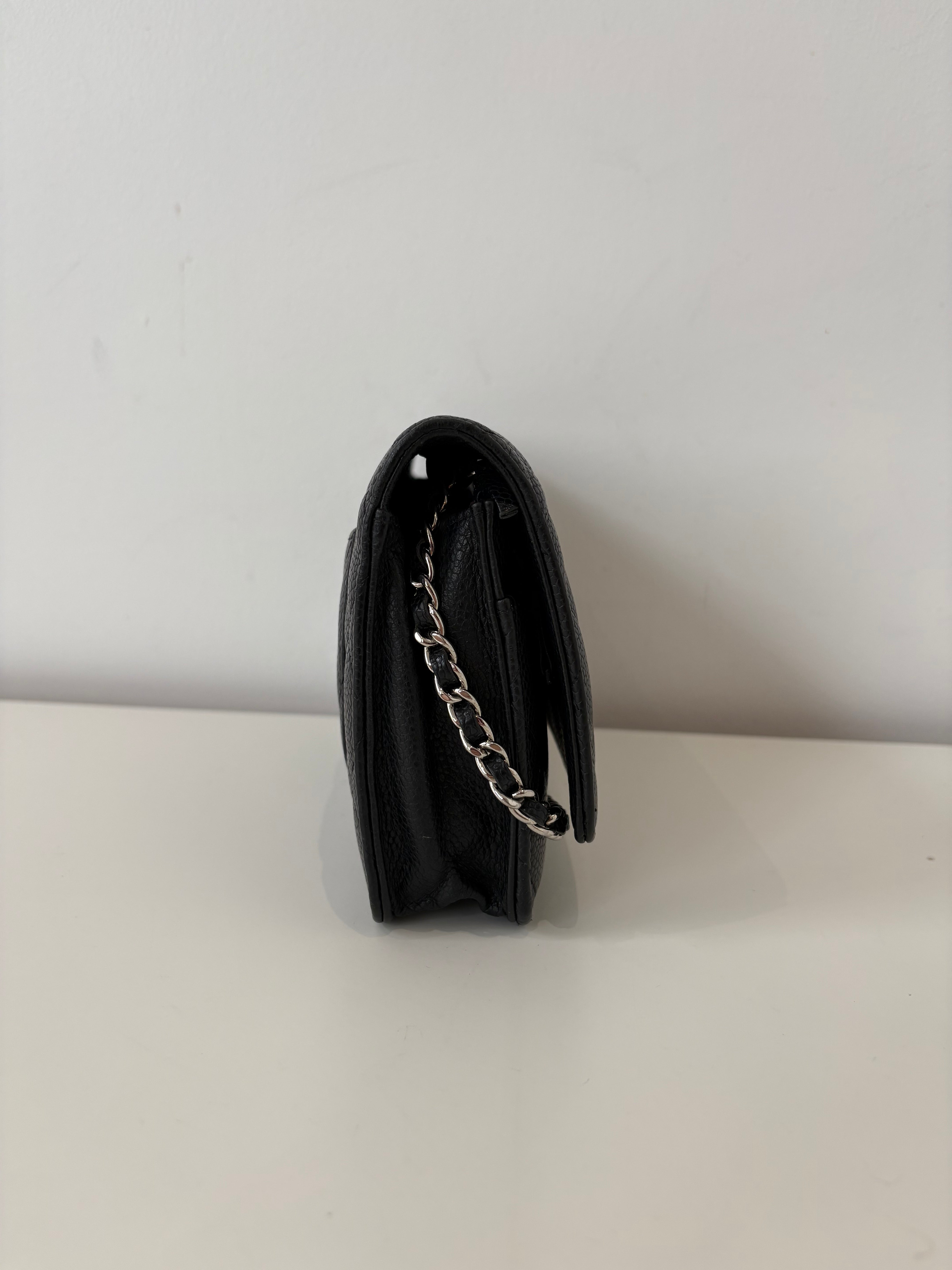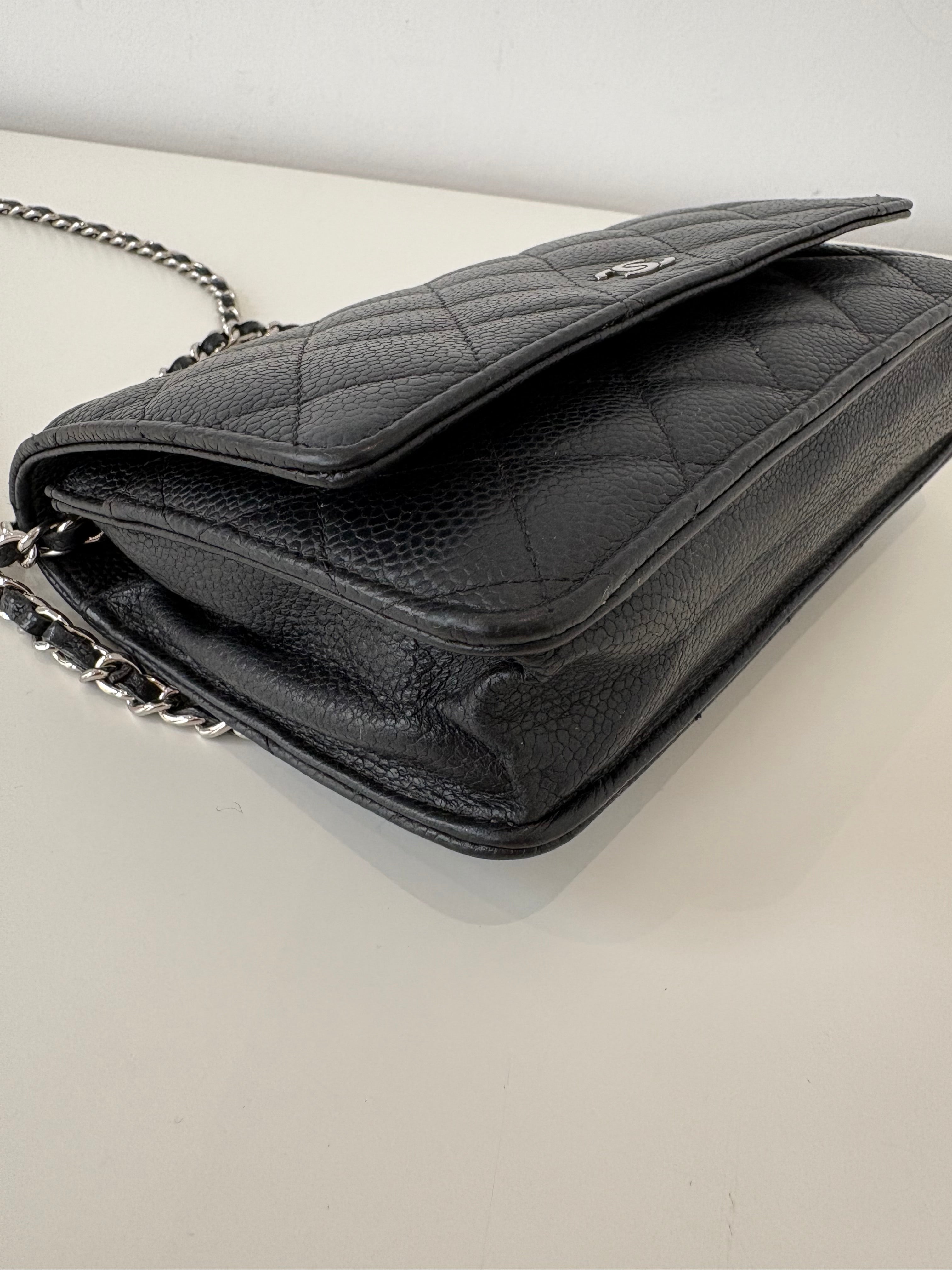 Wallet on Chain Chanel en cuir de veau grainé noir, bijouterie palladium, argentée.