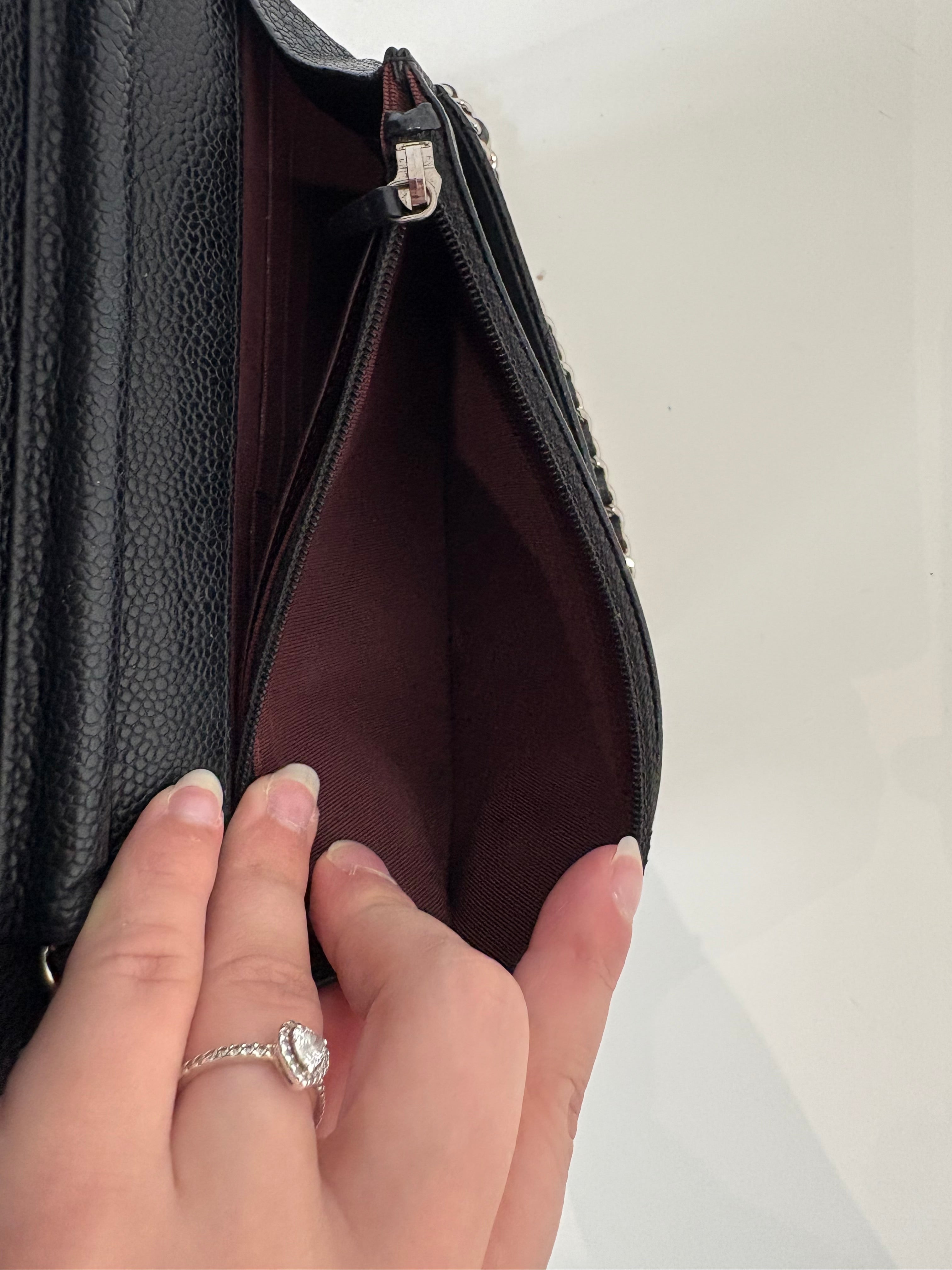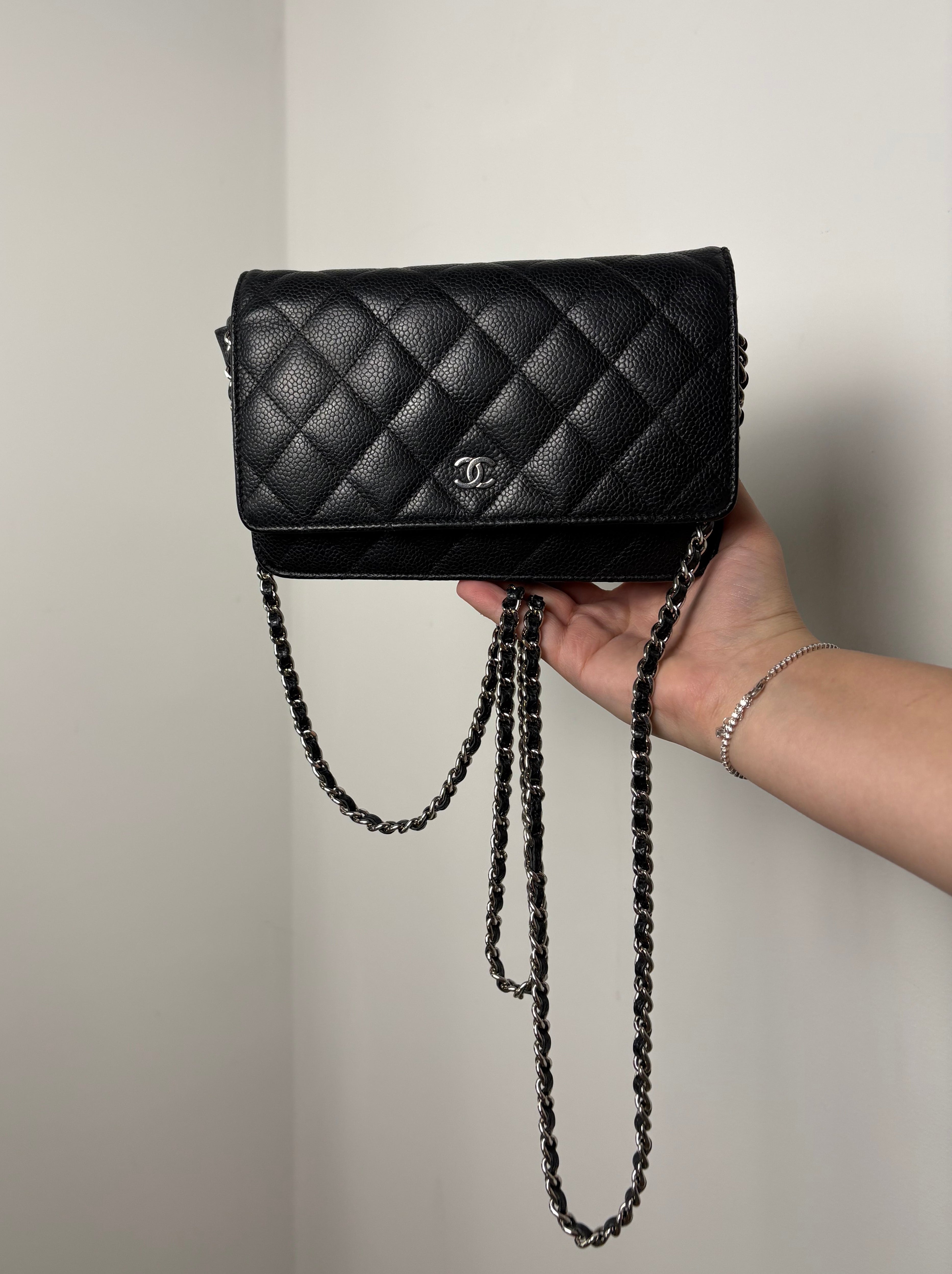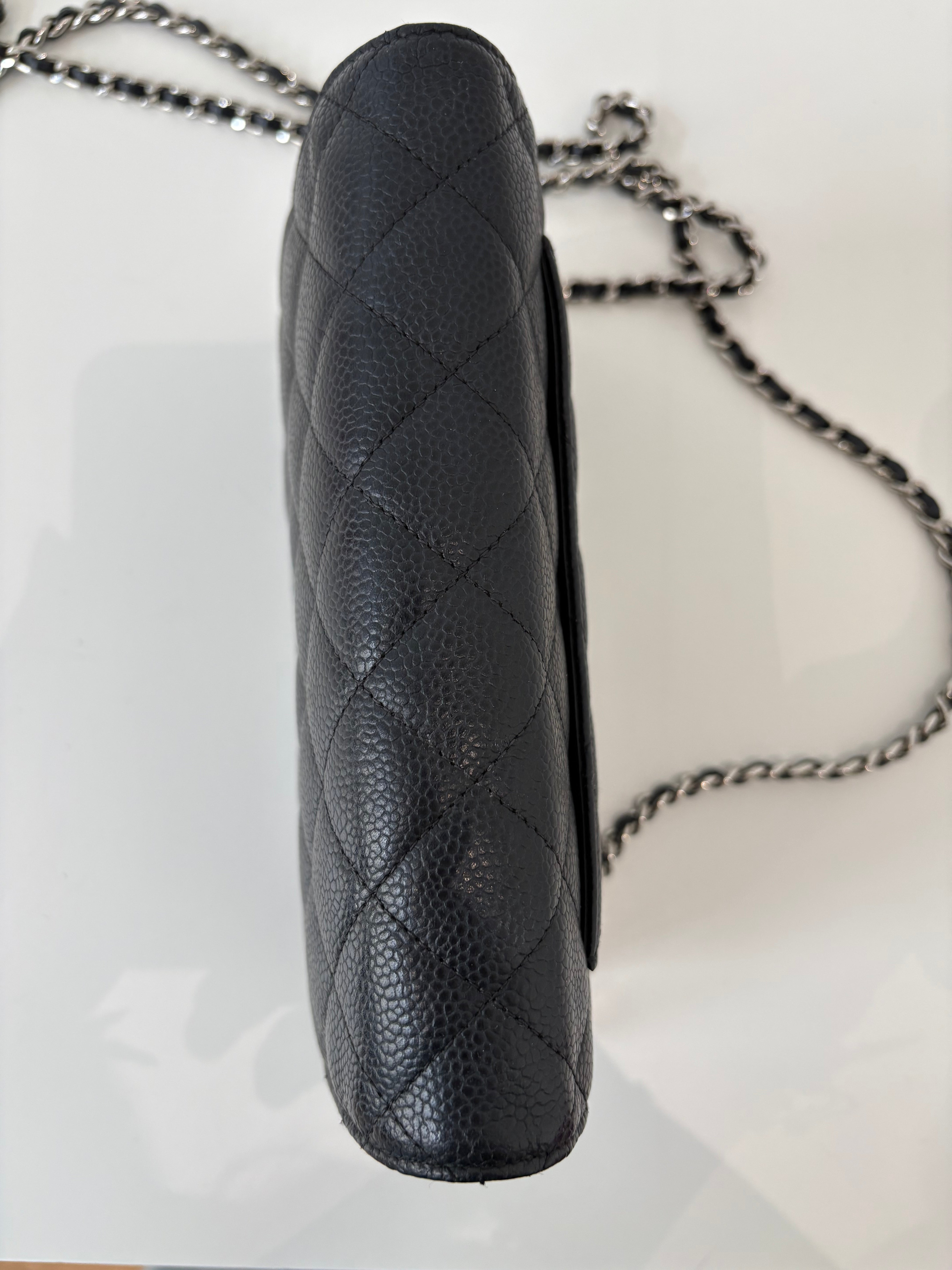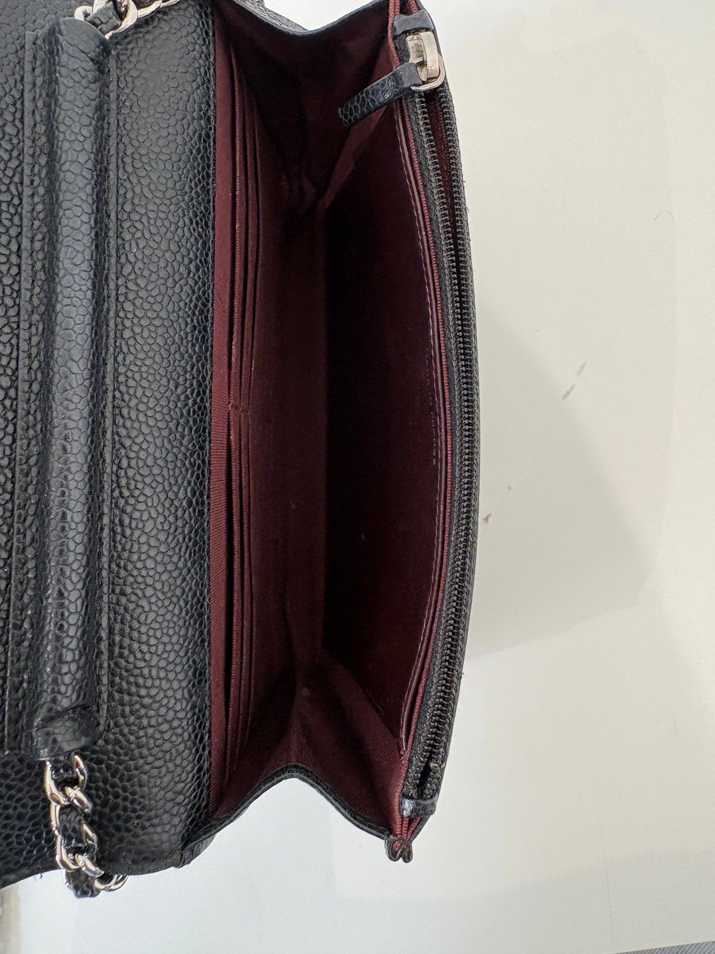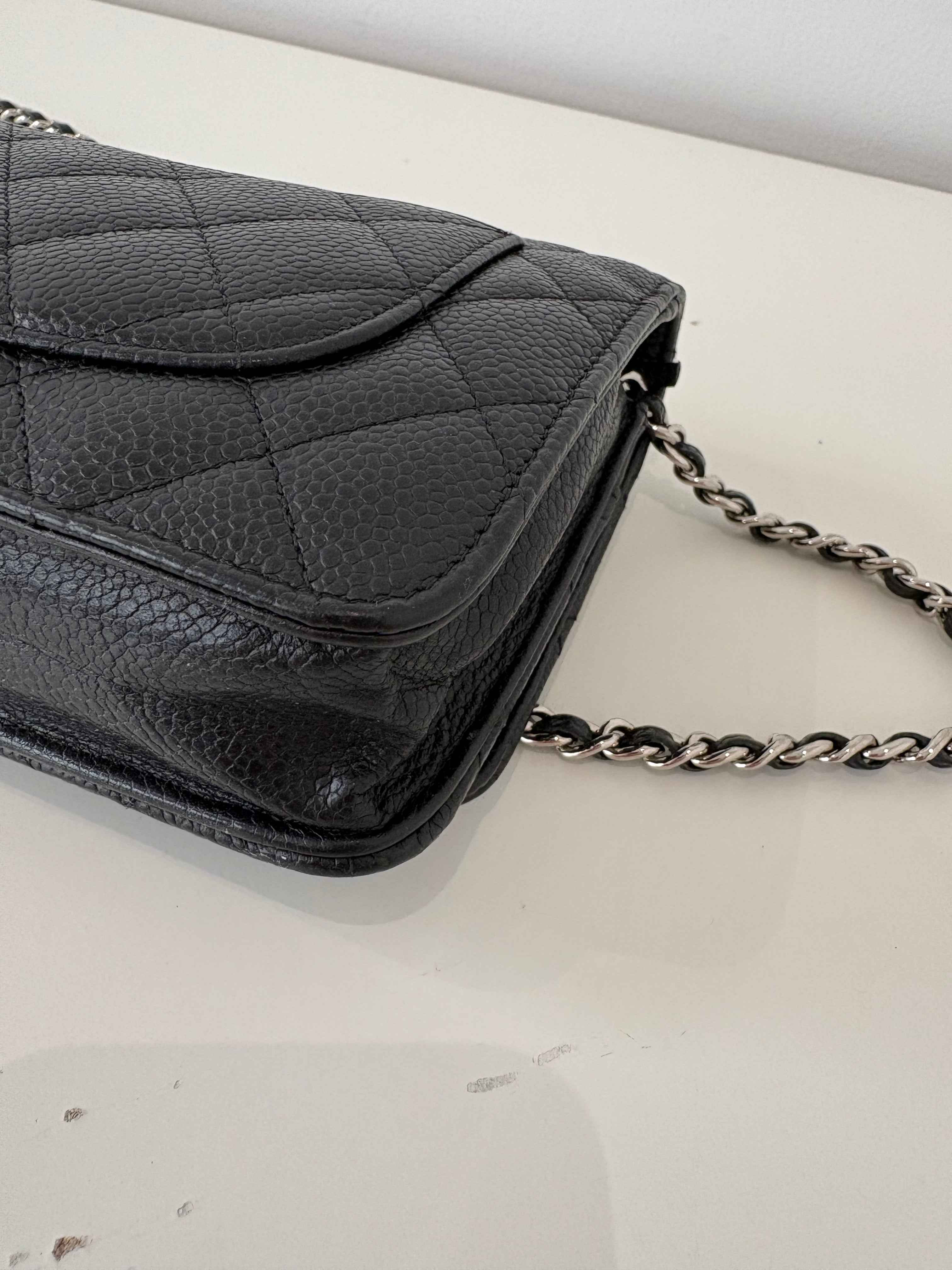 Wallet on Chain Chanel en cuir de veau grainé noir, bijouterie palladium, argentée.