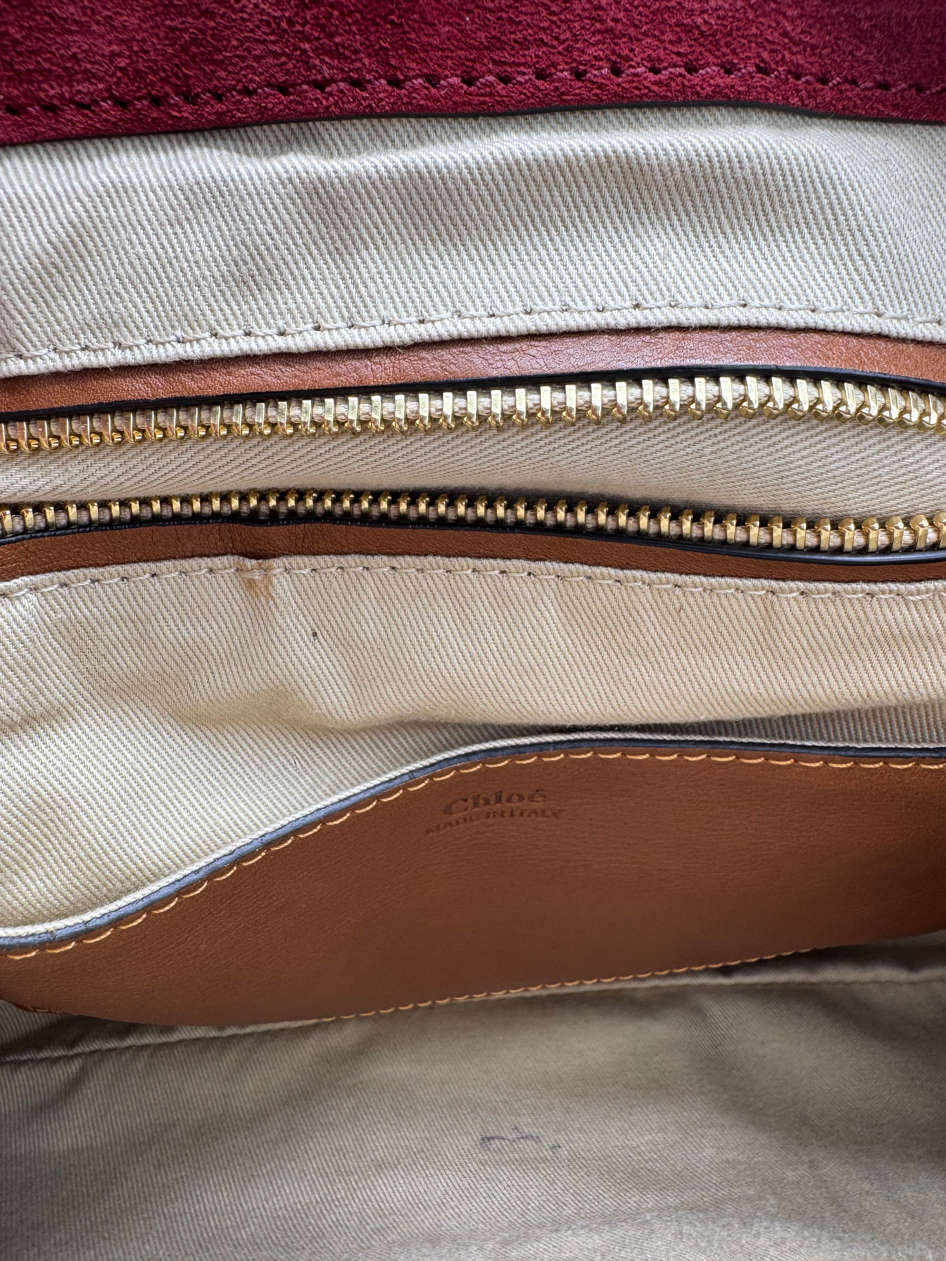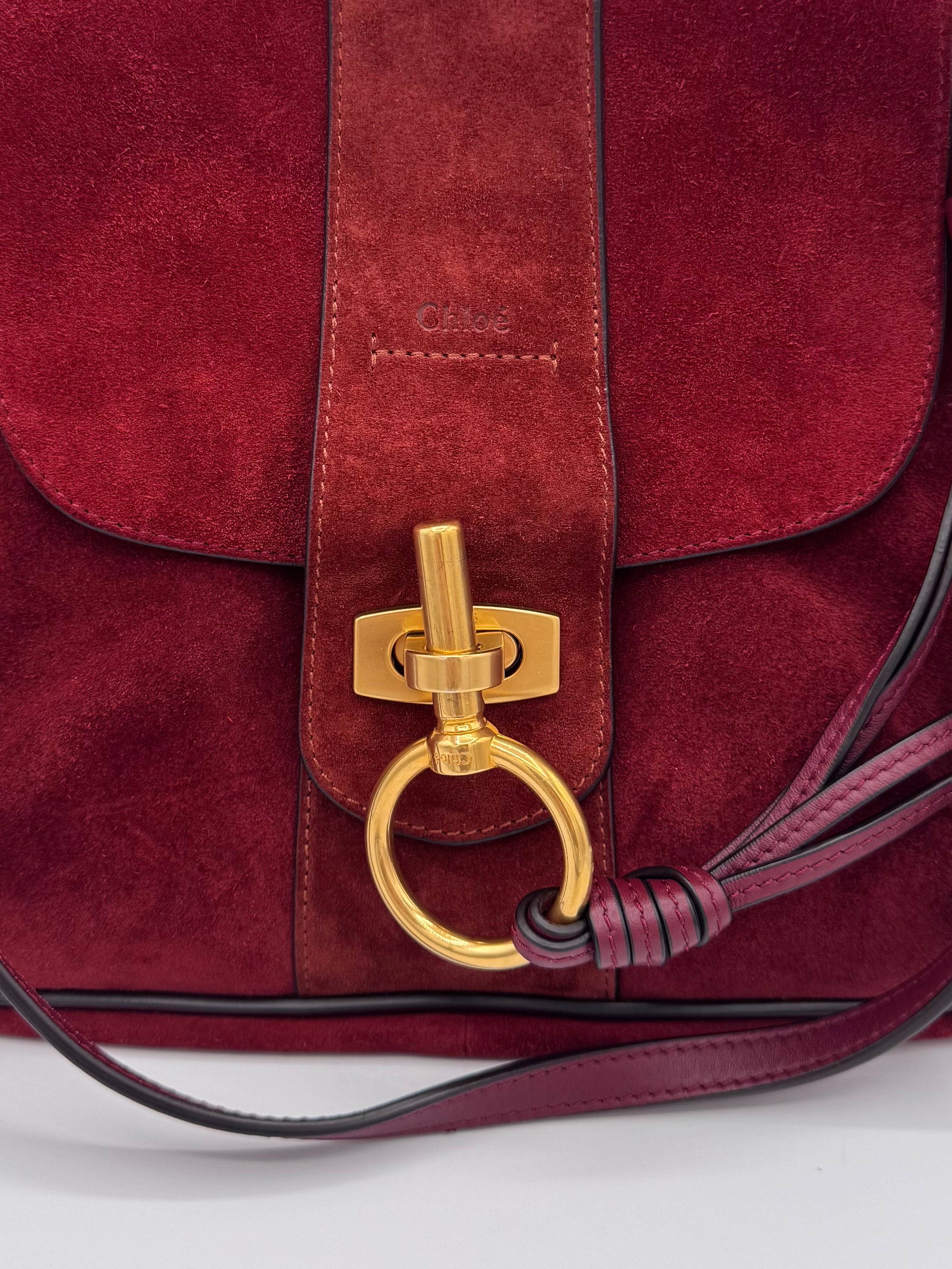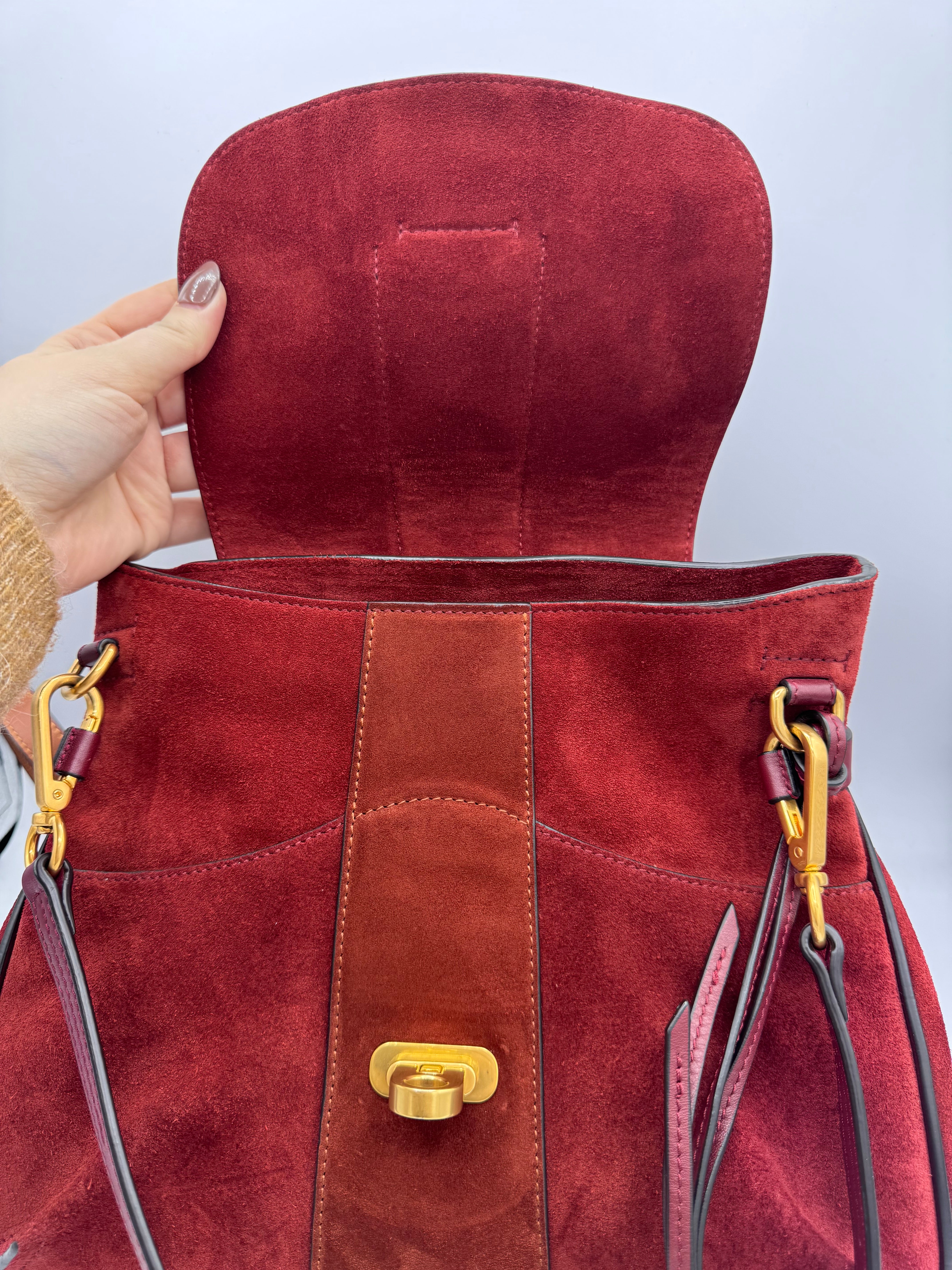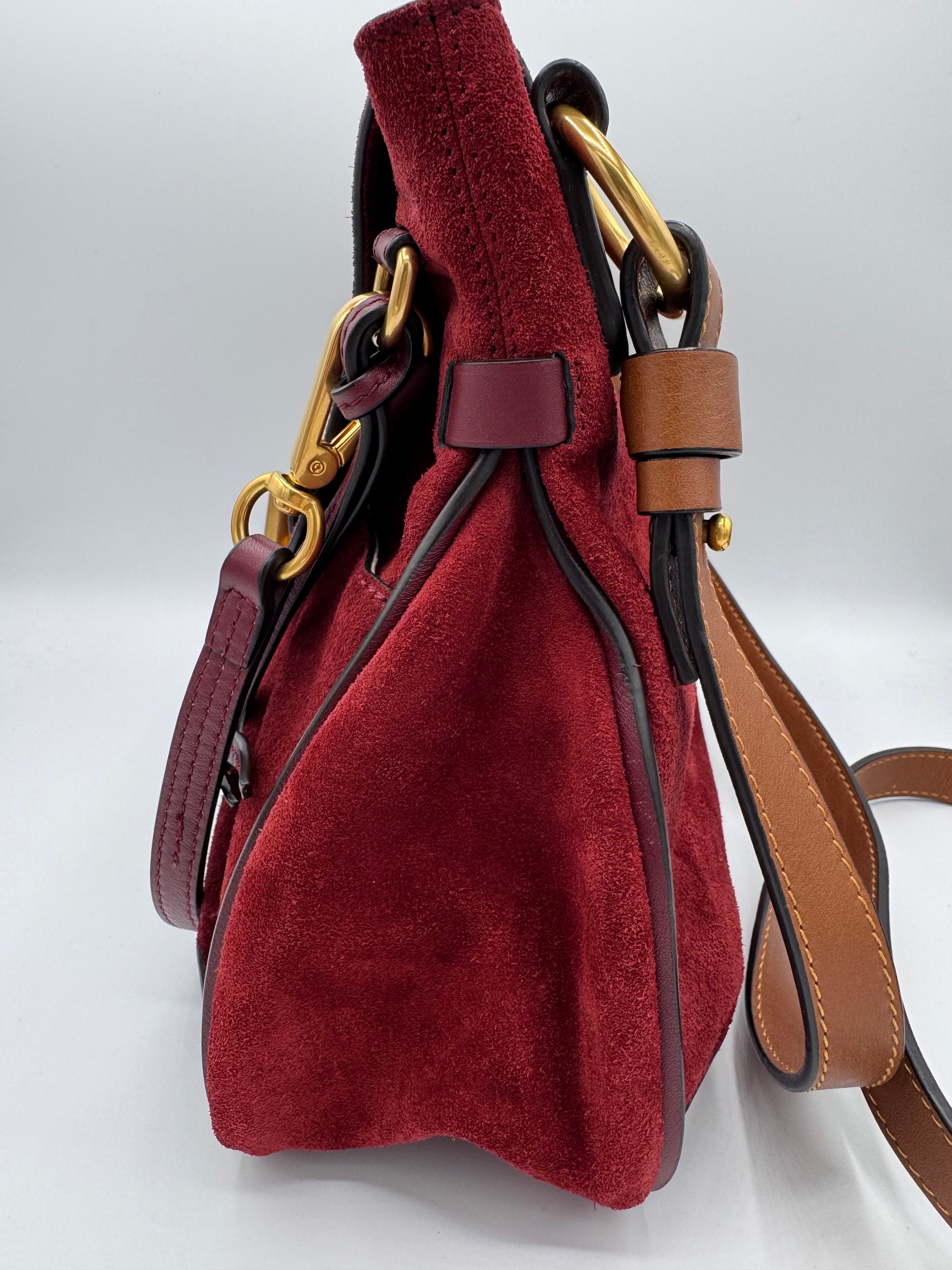 Sac Lexa de chez Chloé en cuir et suede bordeaux, bijouterie dorée, en état excellent.