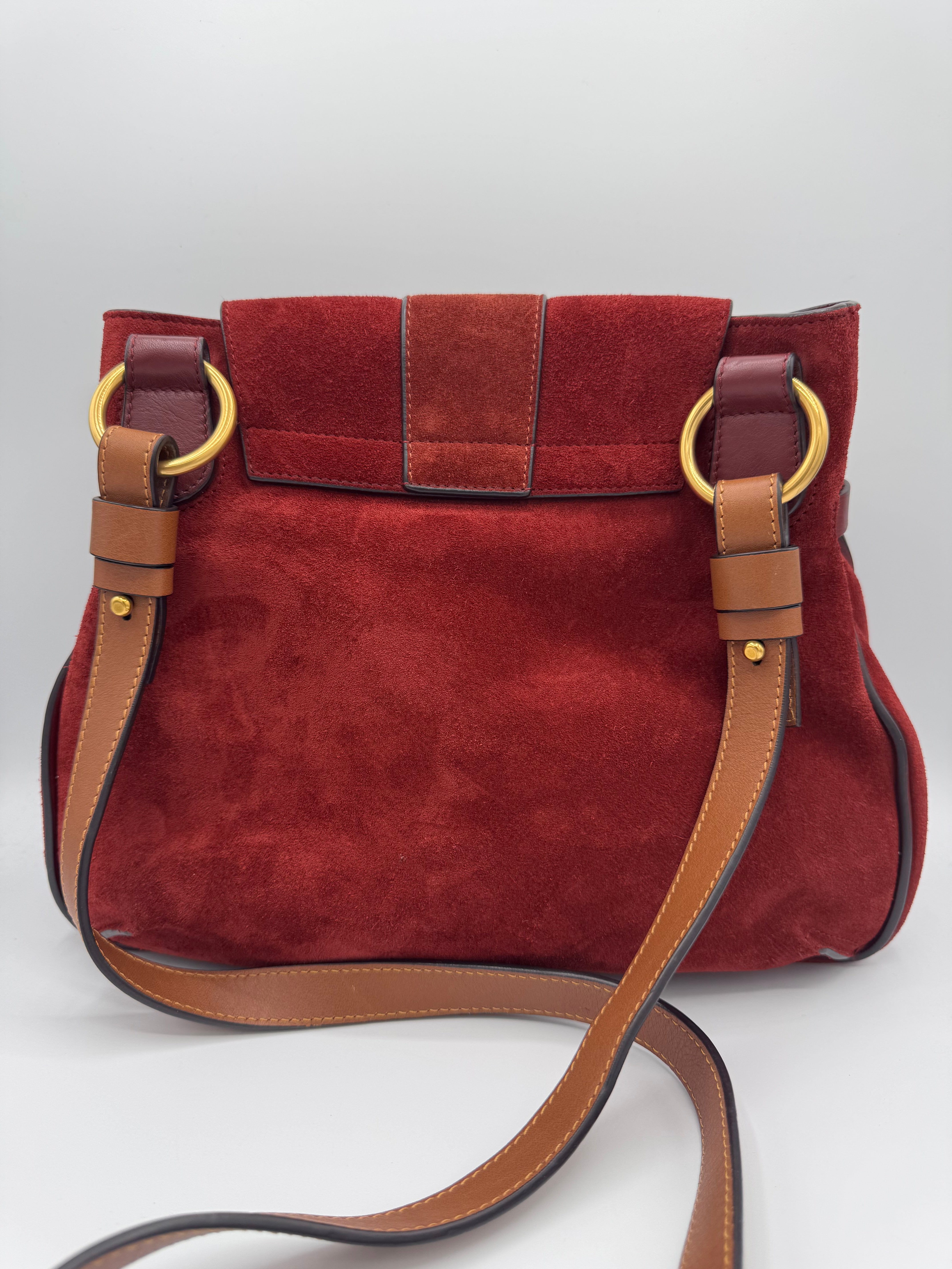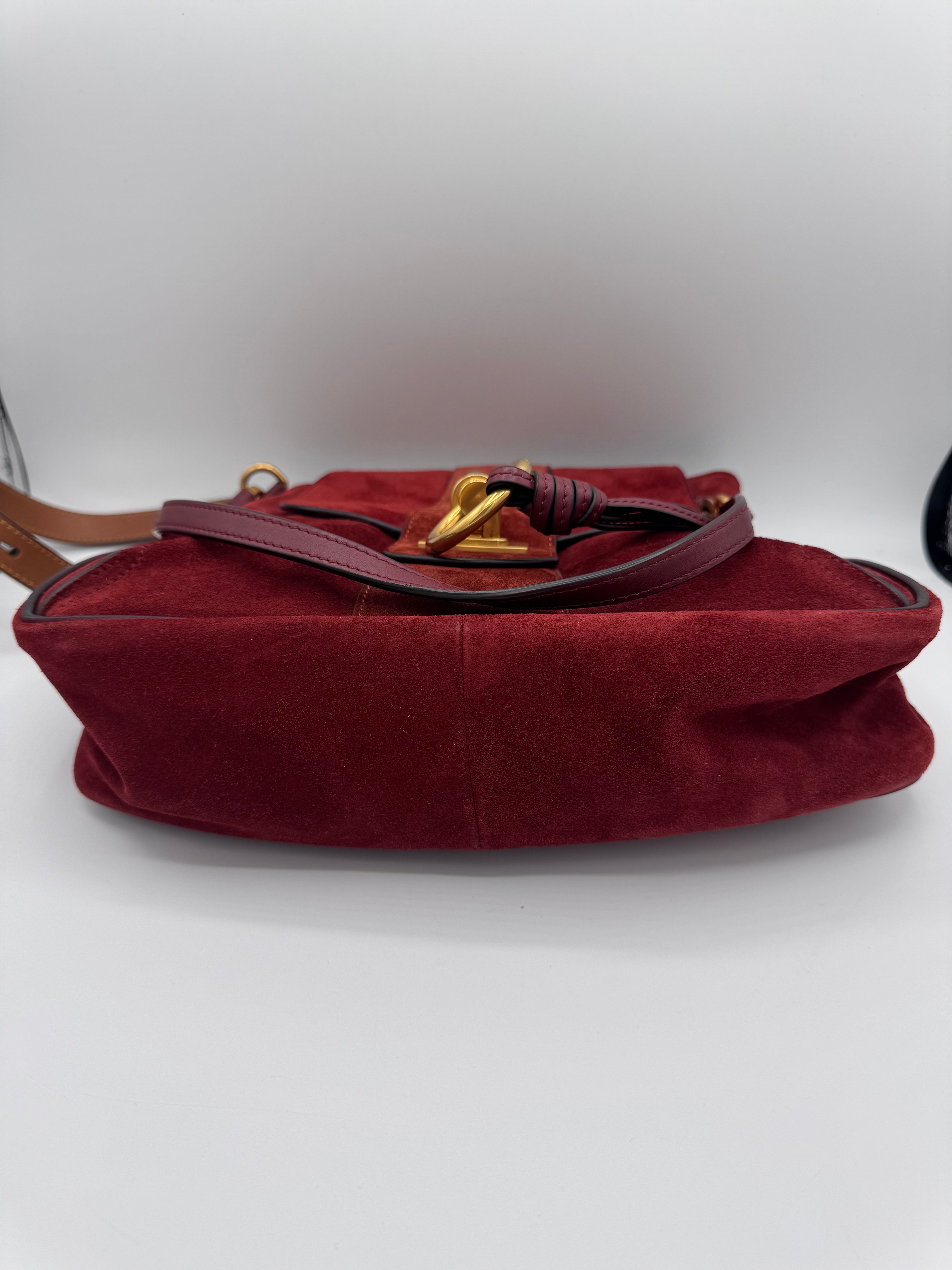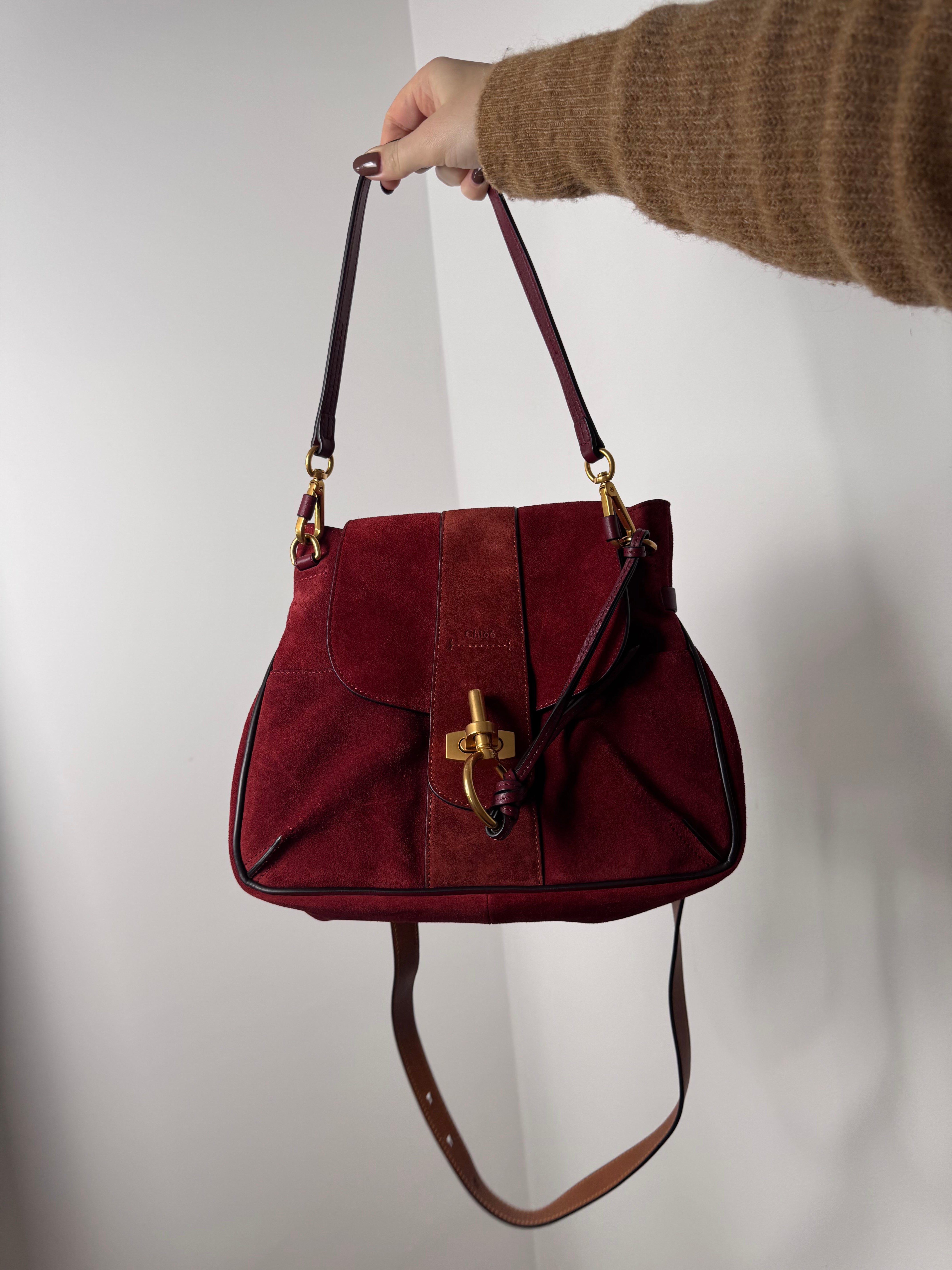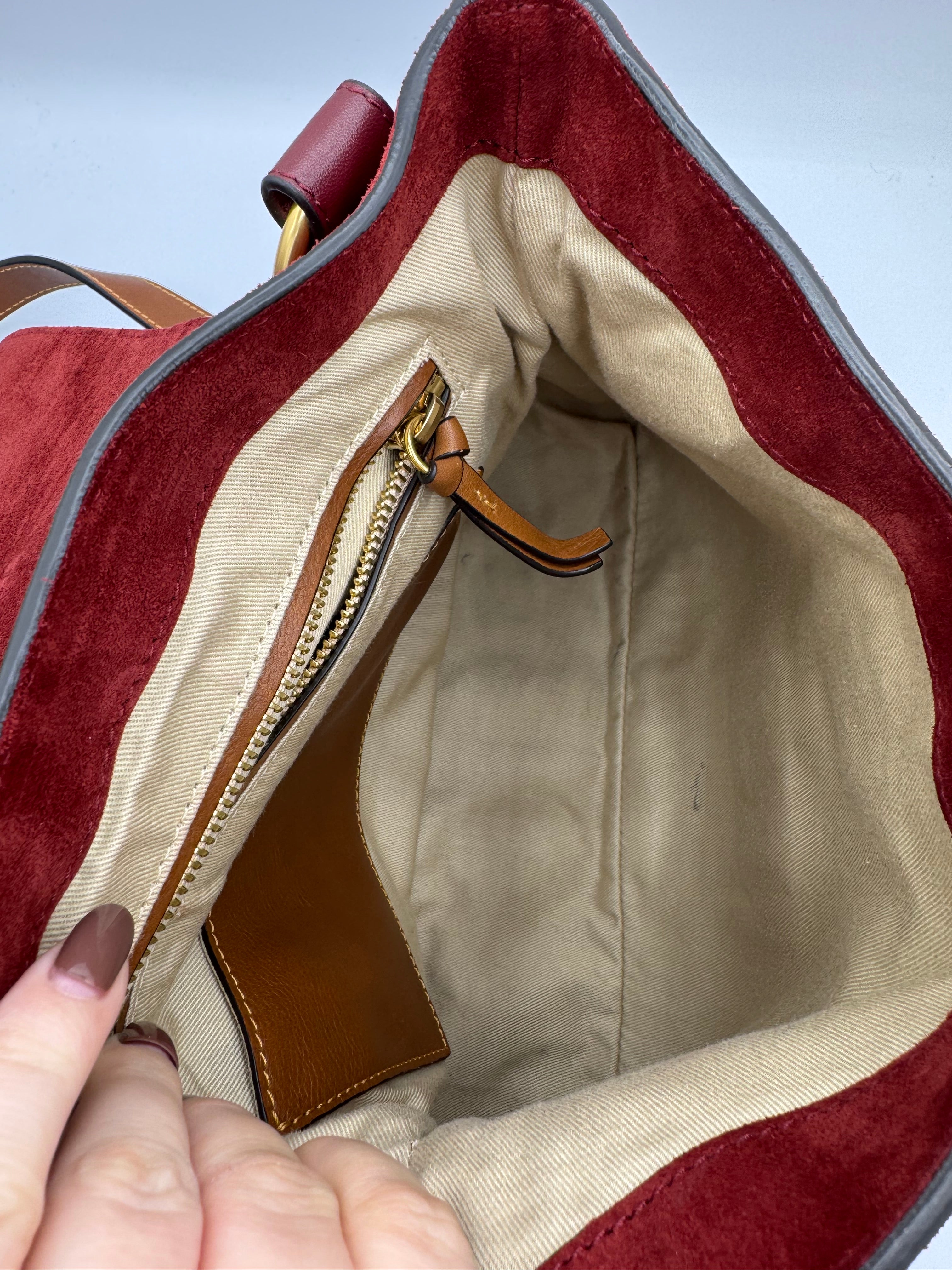 Sac Lexa de chez Chloé en cuir et suede bordeaux, bijouterie dorée, en état excellent.