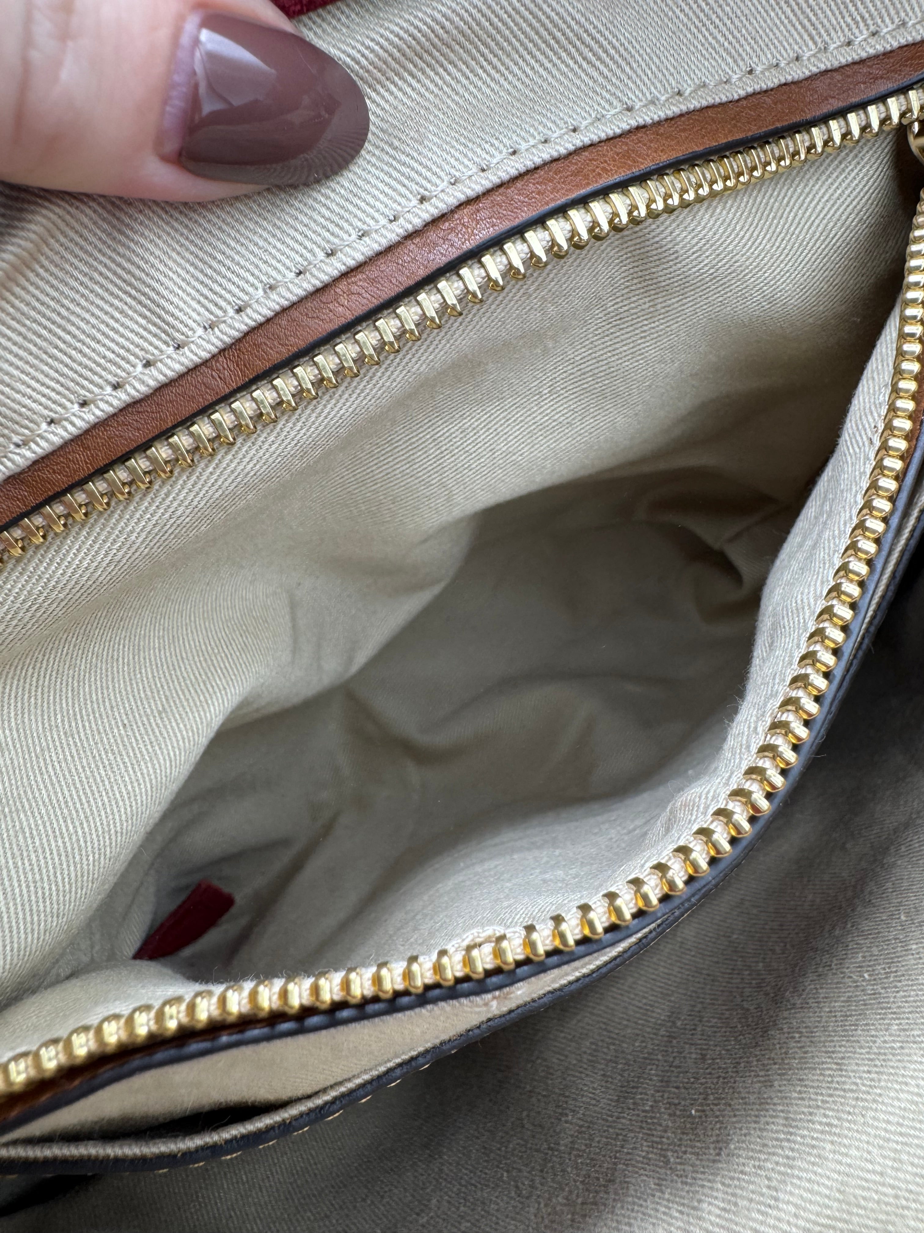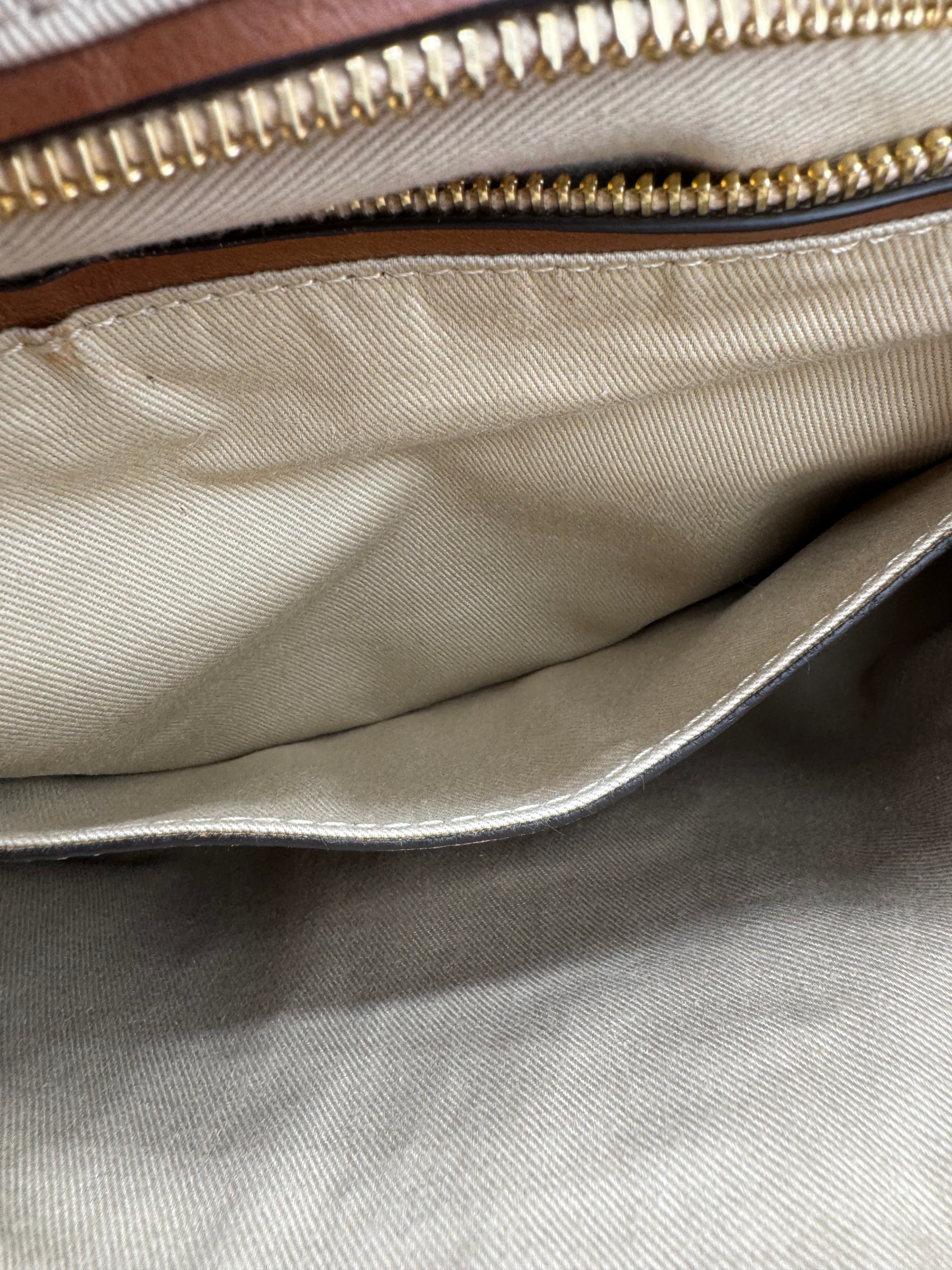 Uniquement quelques traces à l'intérieur sur le tissu beige. Quelques micro-rayures sur la bijouterie.