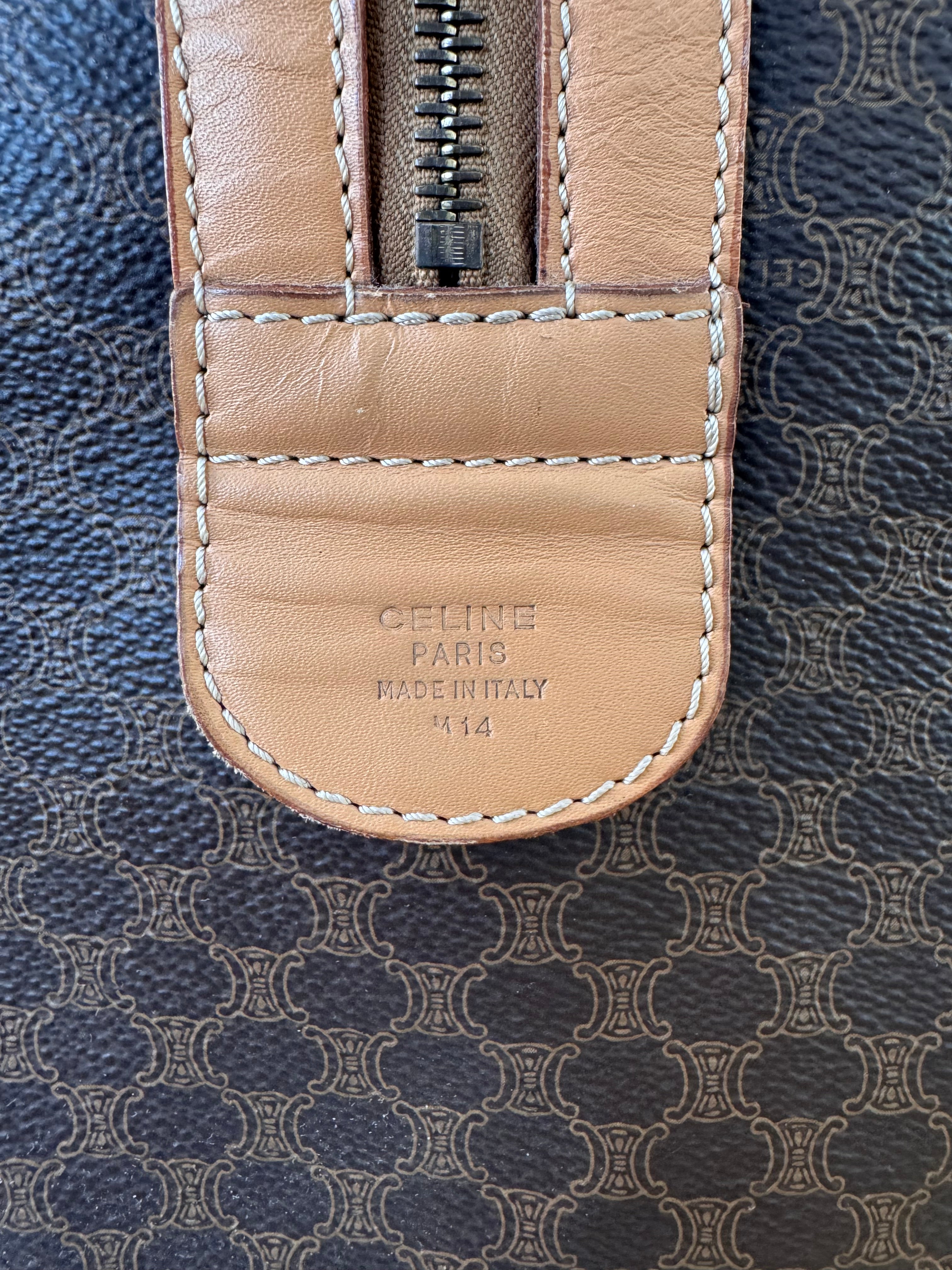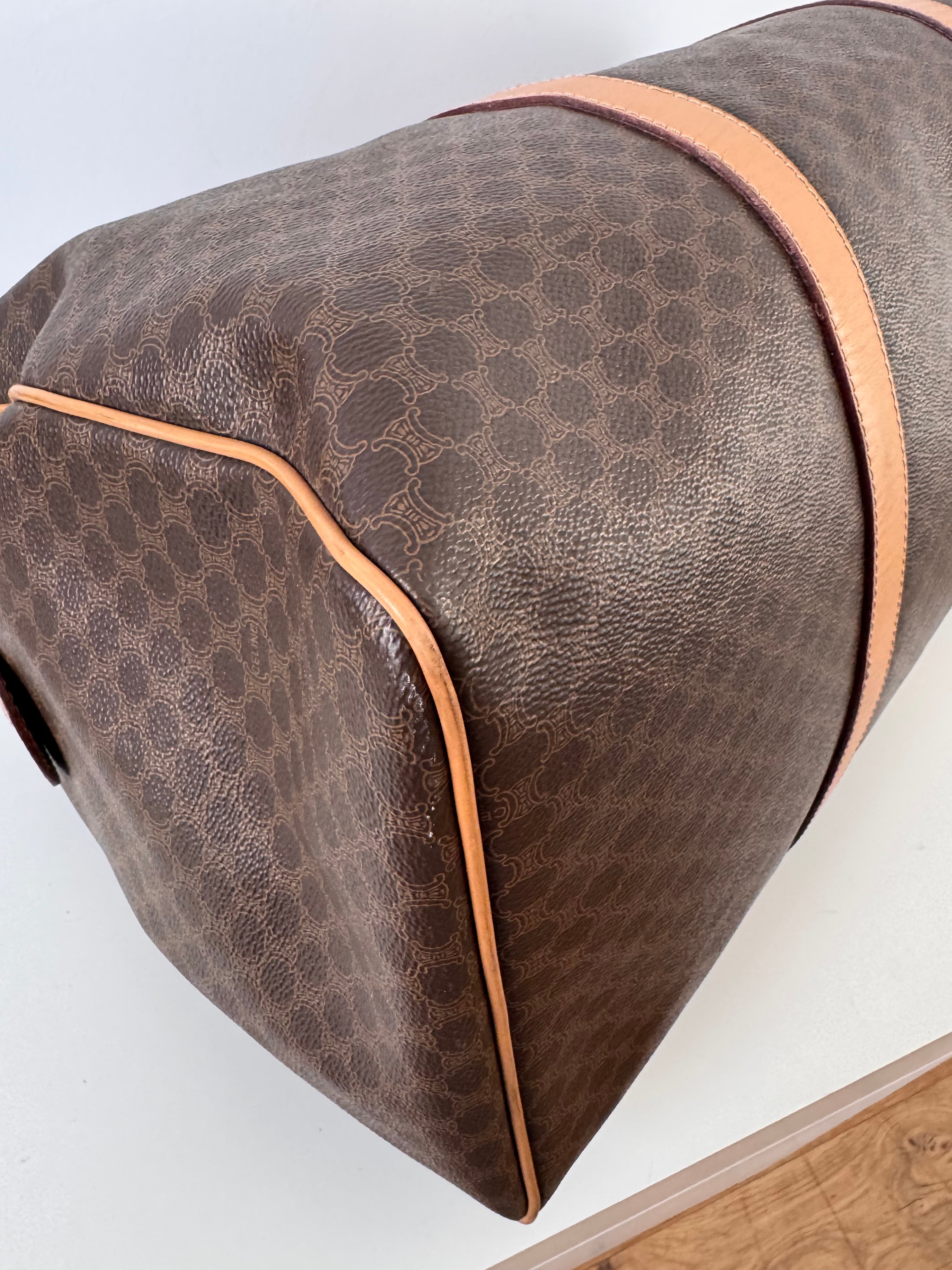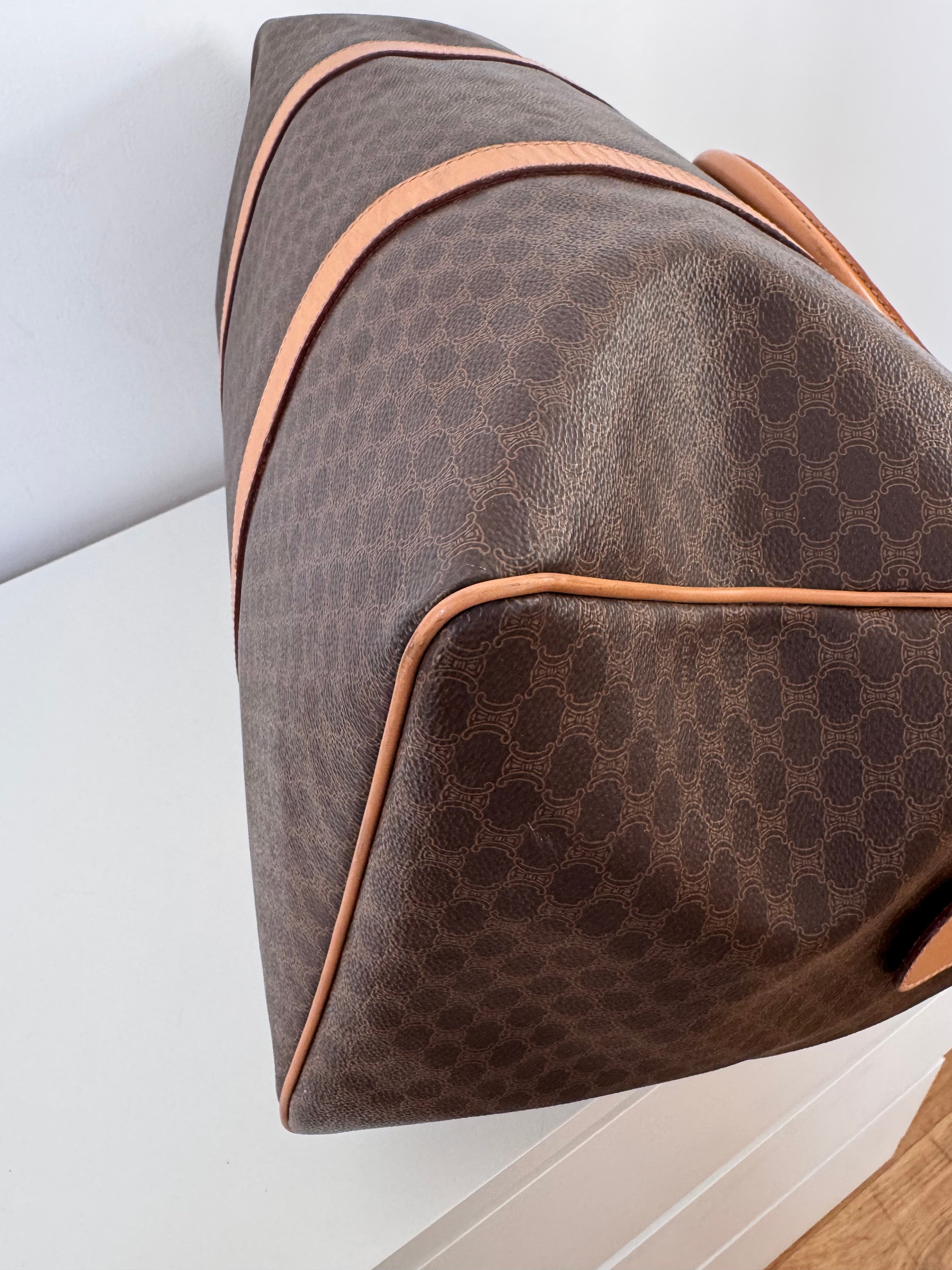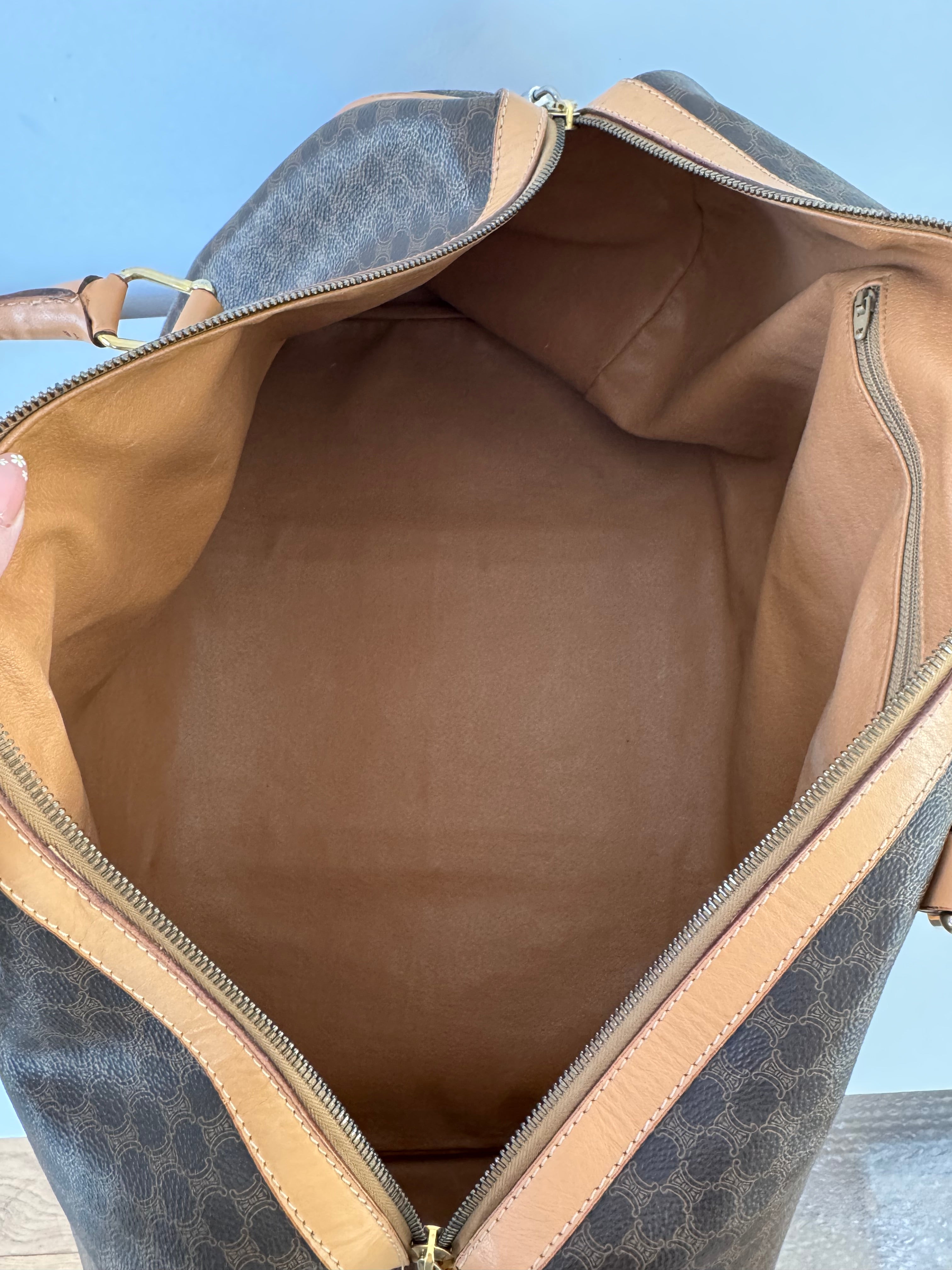 Sac Boston Celine grand modèle en toile triomphe et cuir de veau, en très bon état.