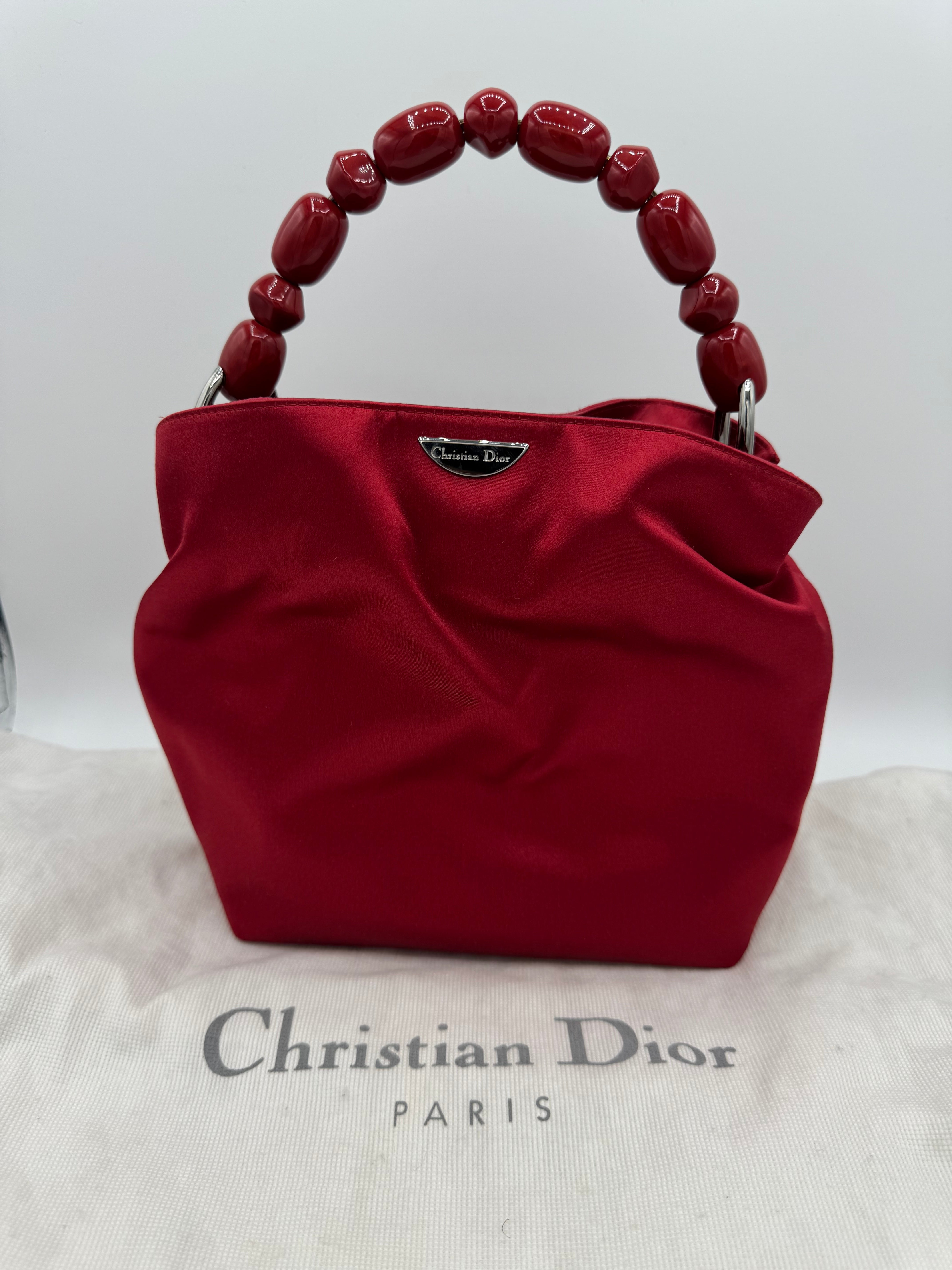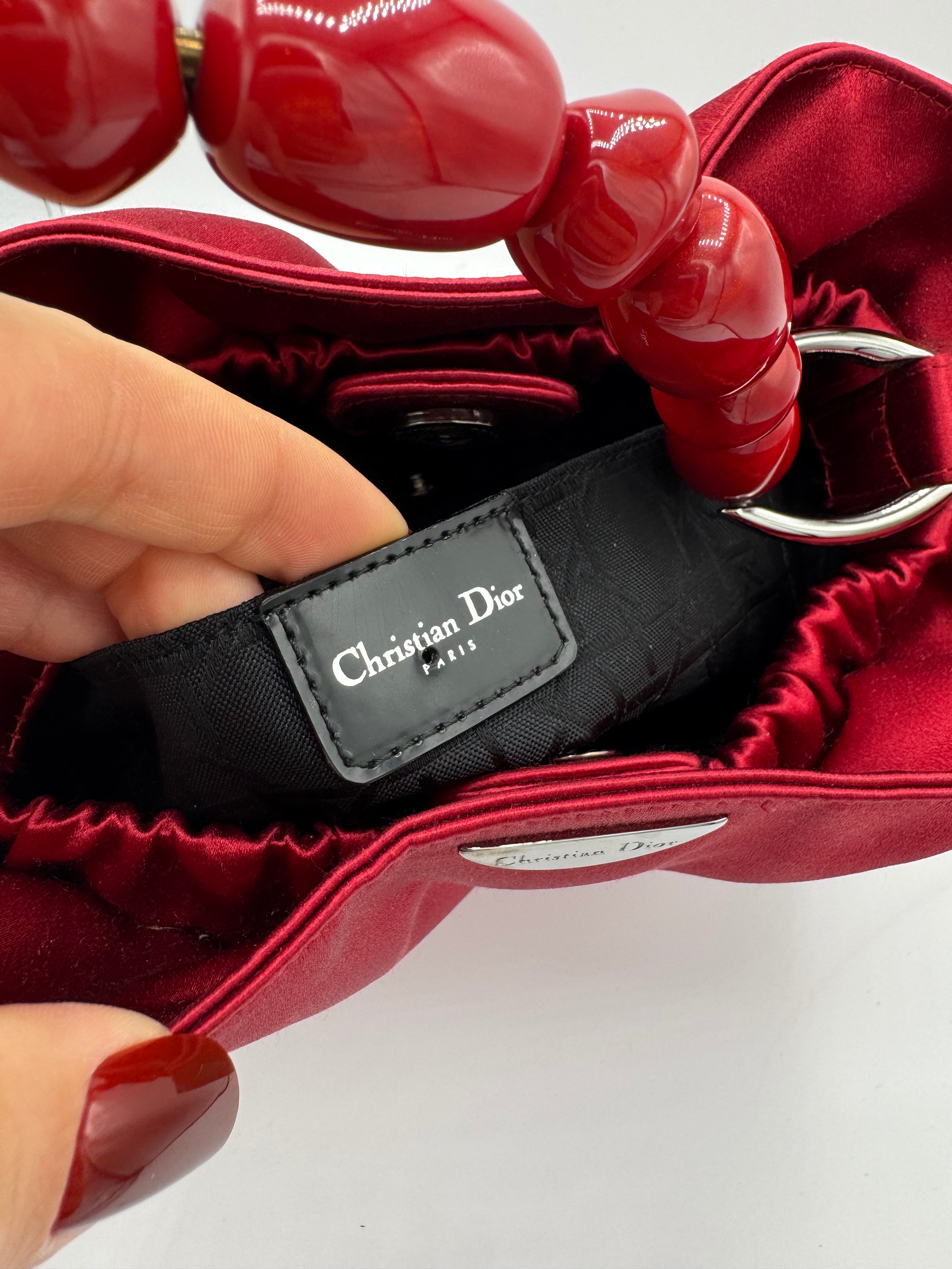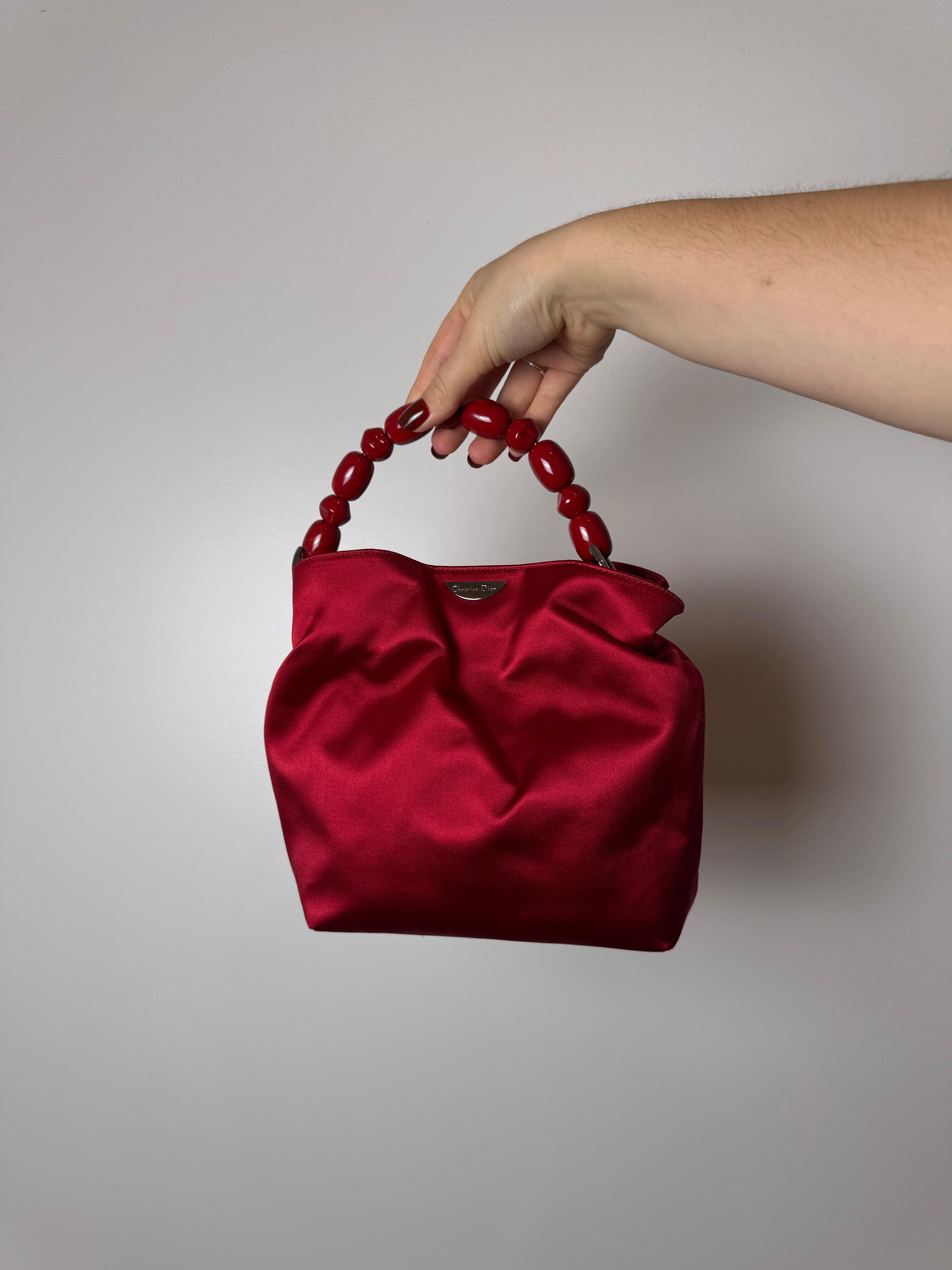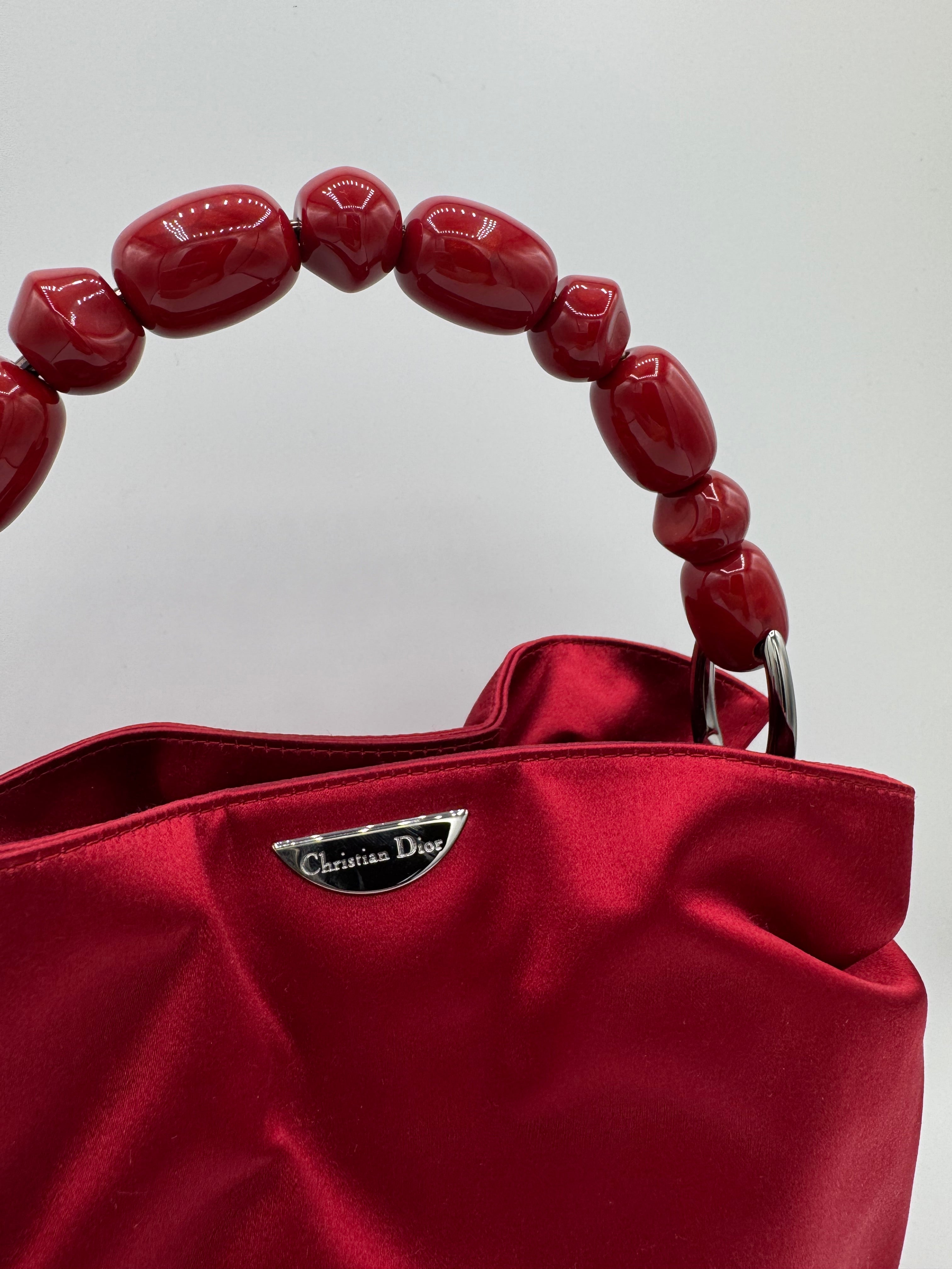 Sac Dior Maris Pearl, en rouge satin et fantaisie, en très bon état.