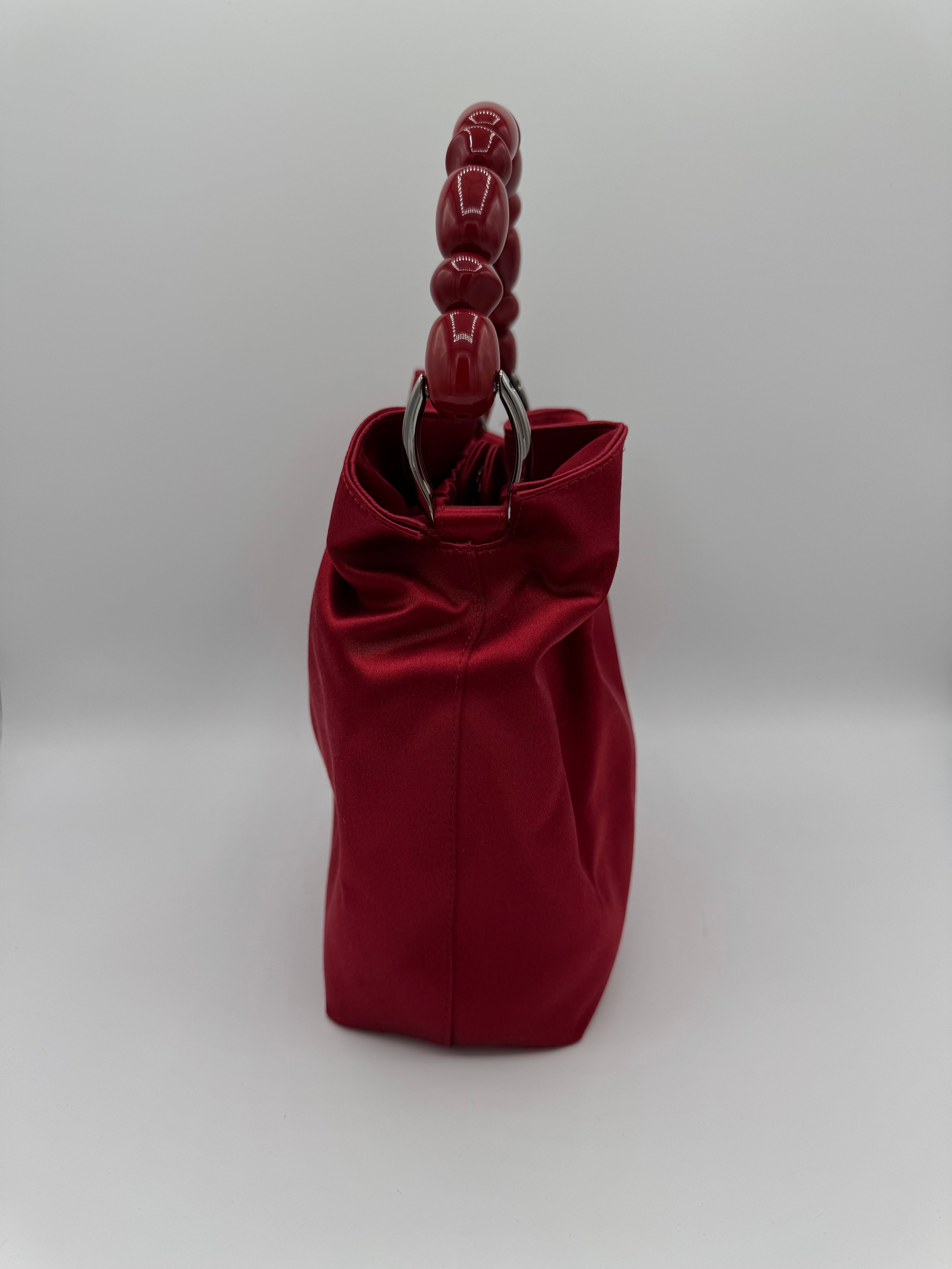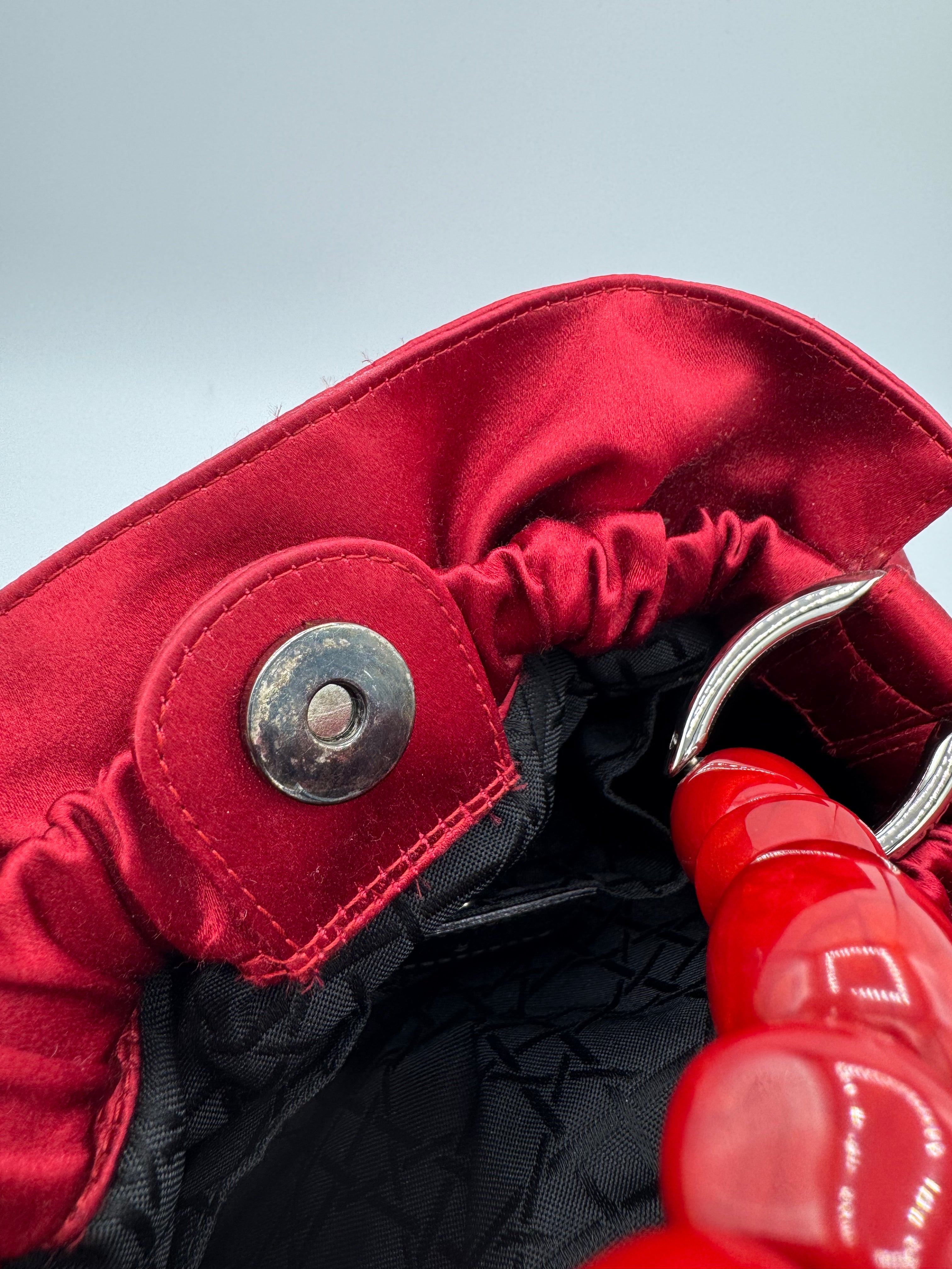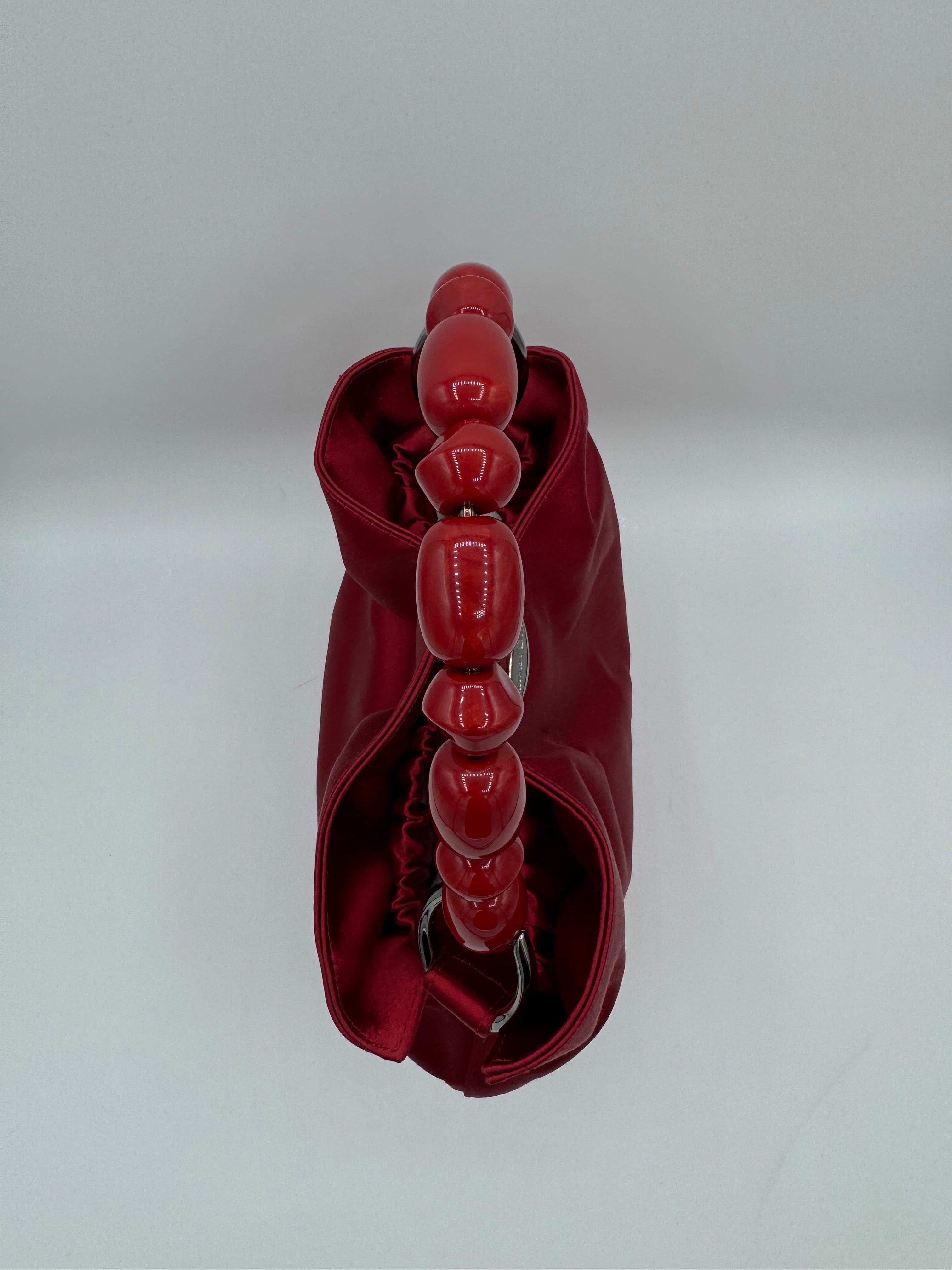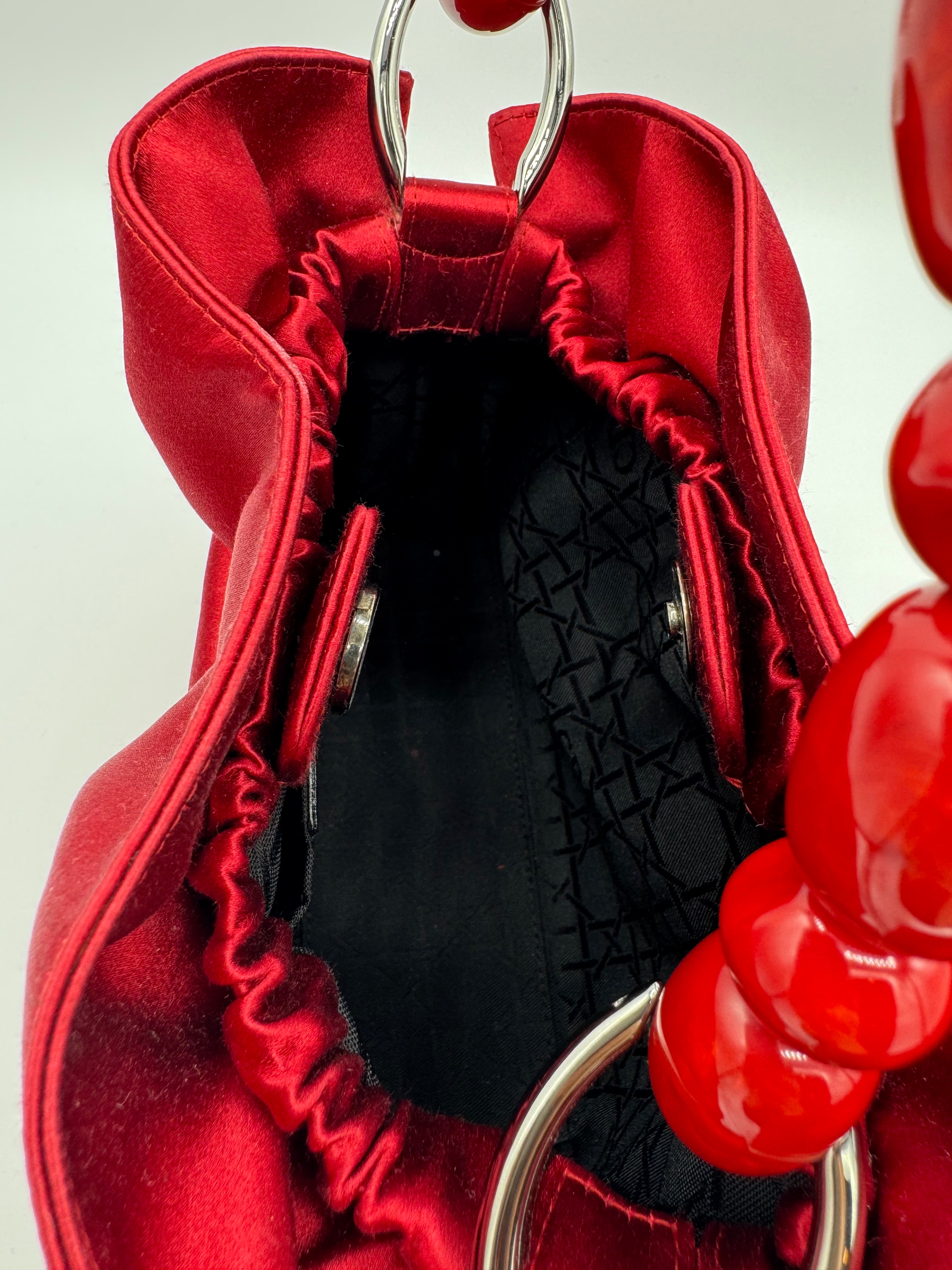 Sac Dior Maris Pearl, en rouge satin et fantaisie, en très bon état.
