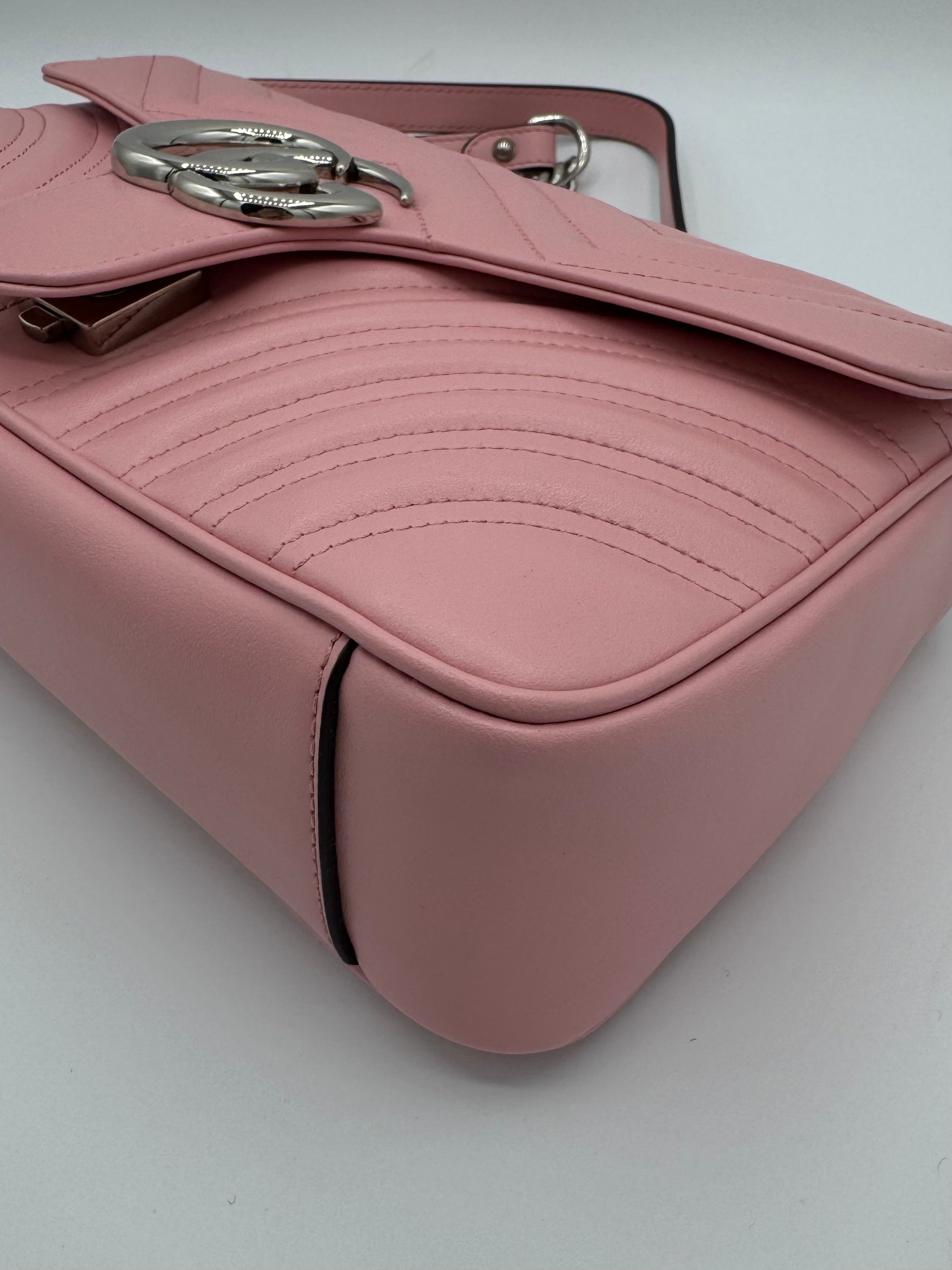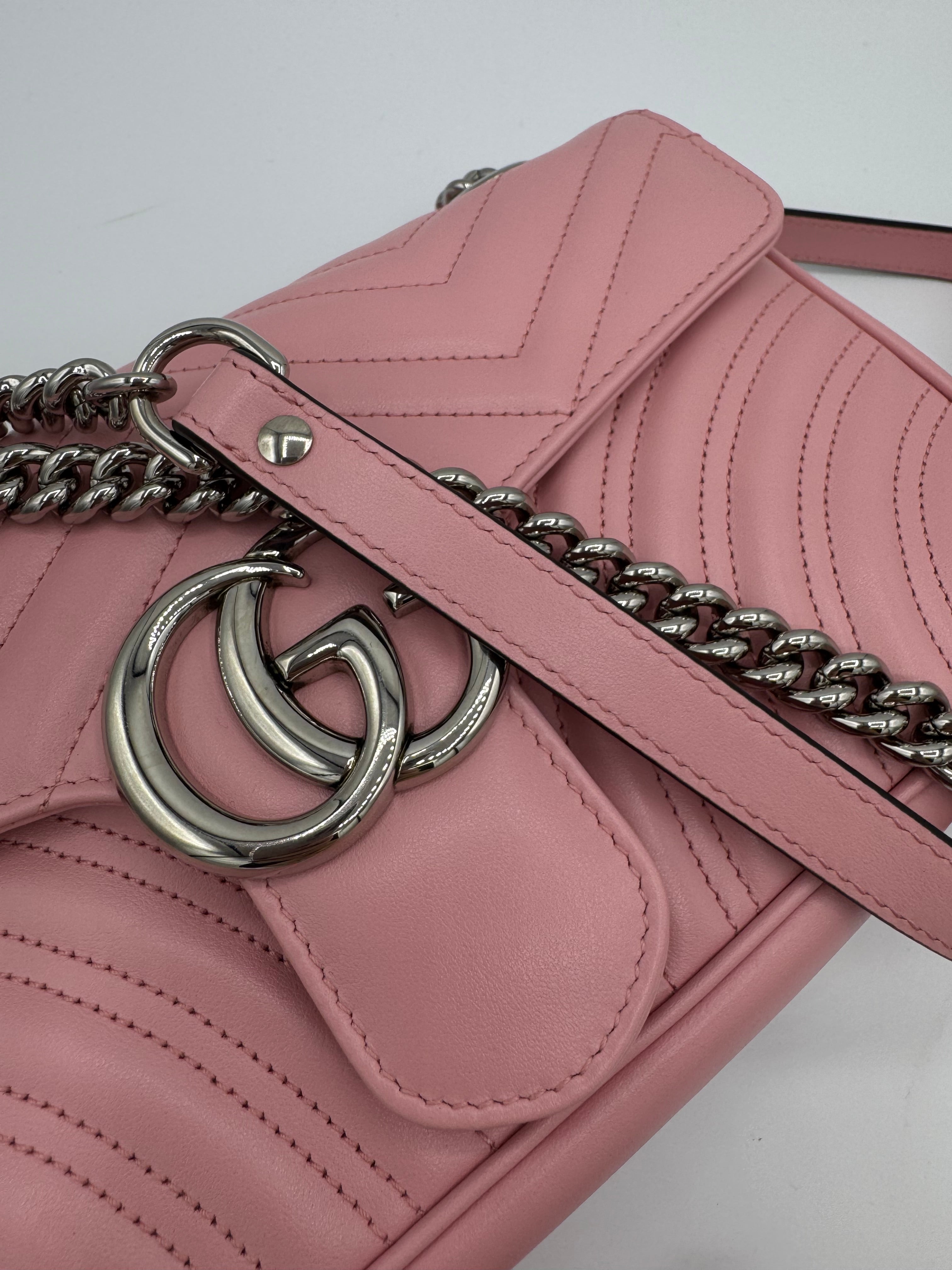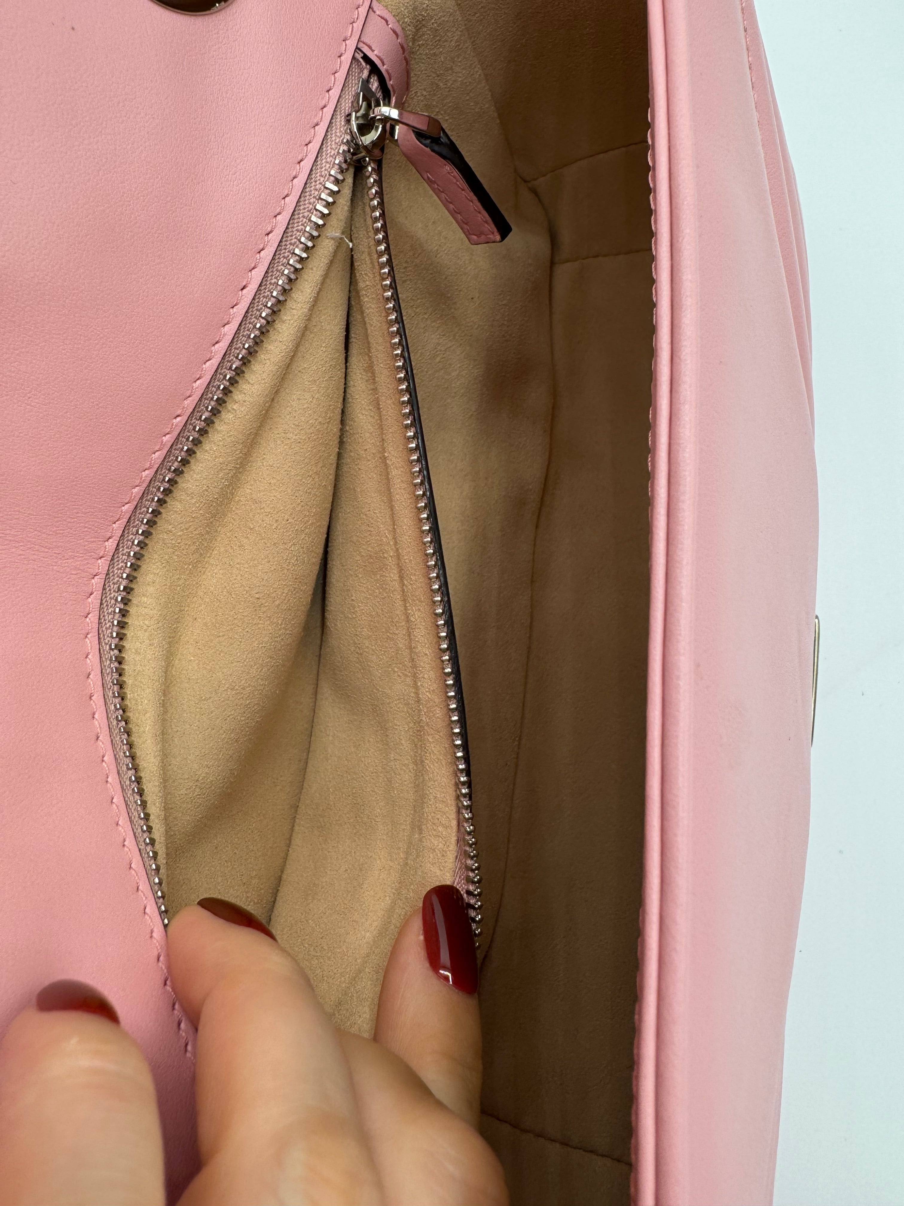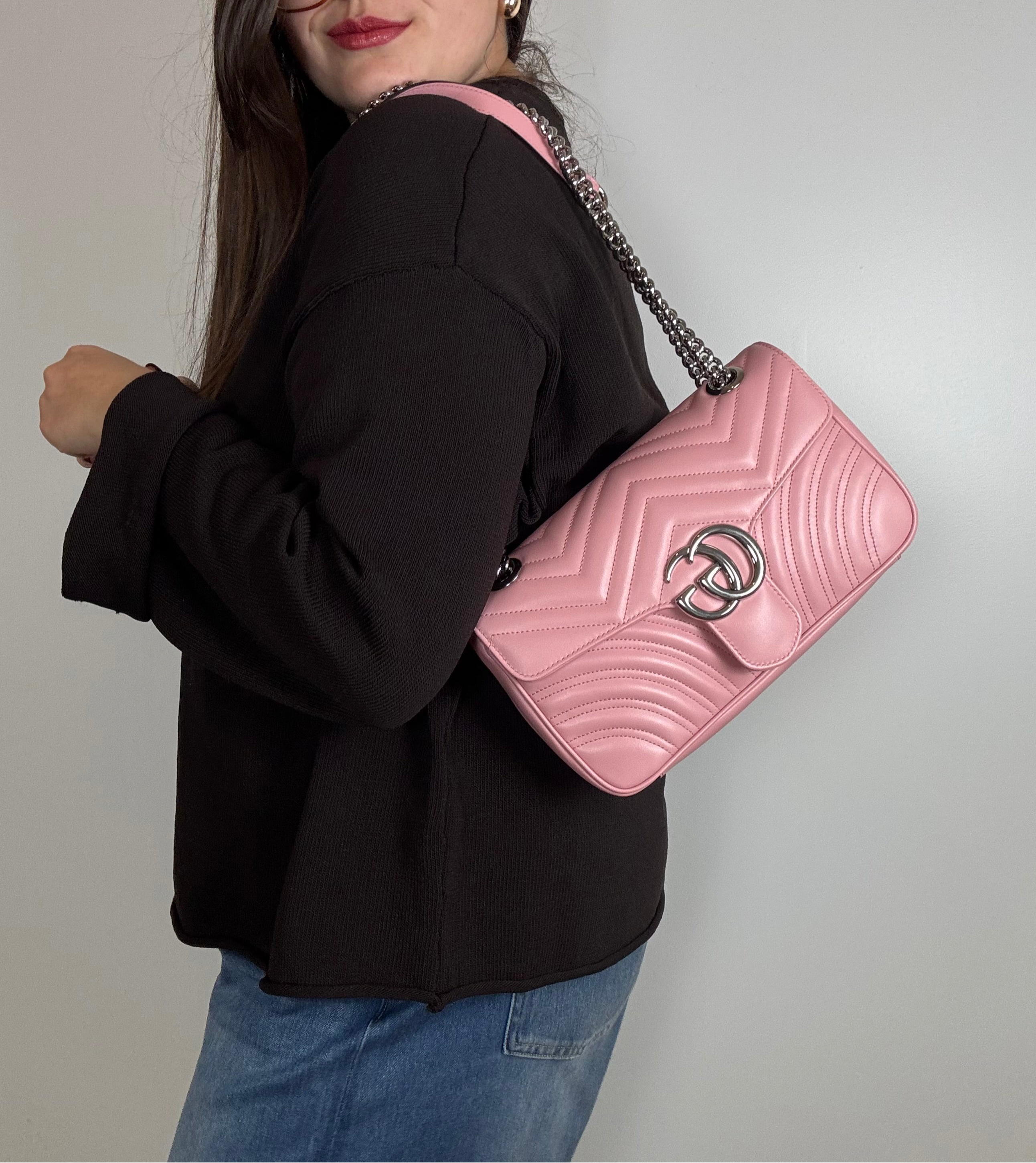 Sac GG Marmont Moyen Gucci, en cuir de veau rose, en état excellent.