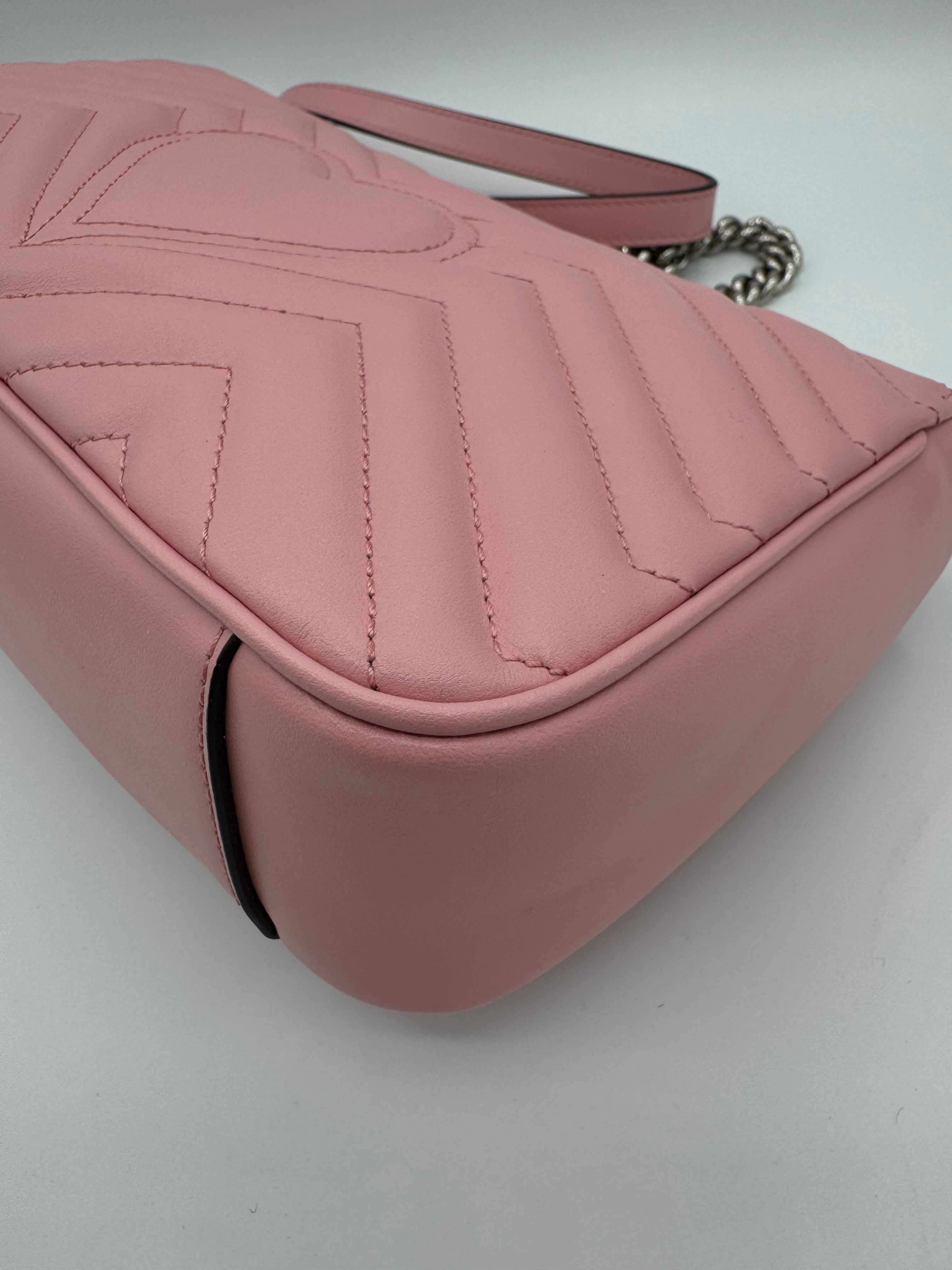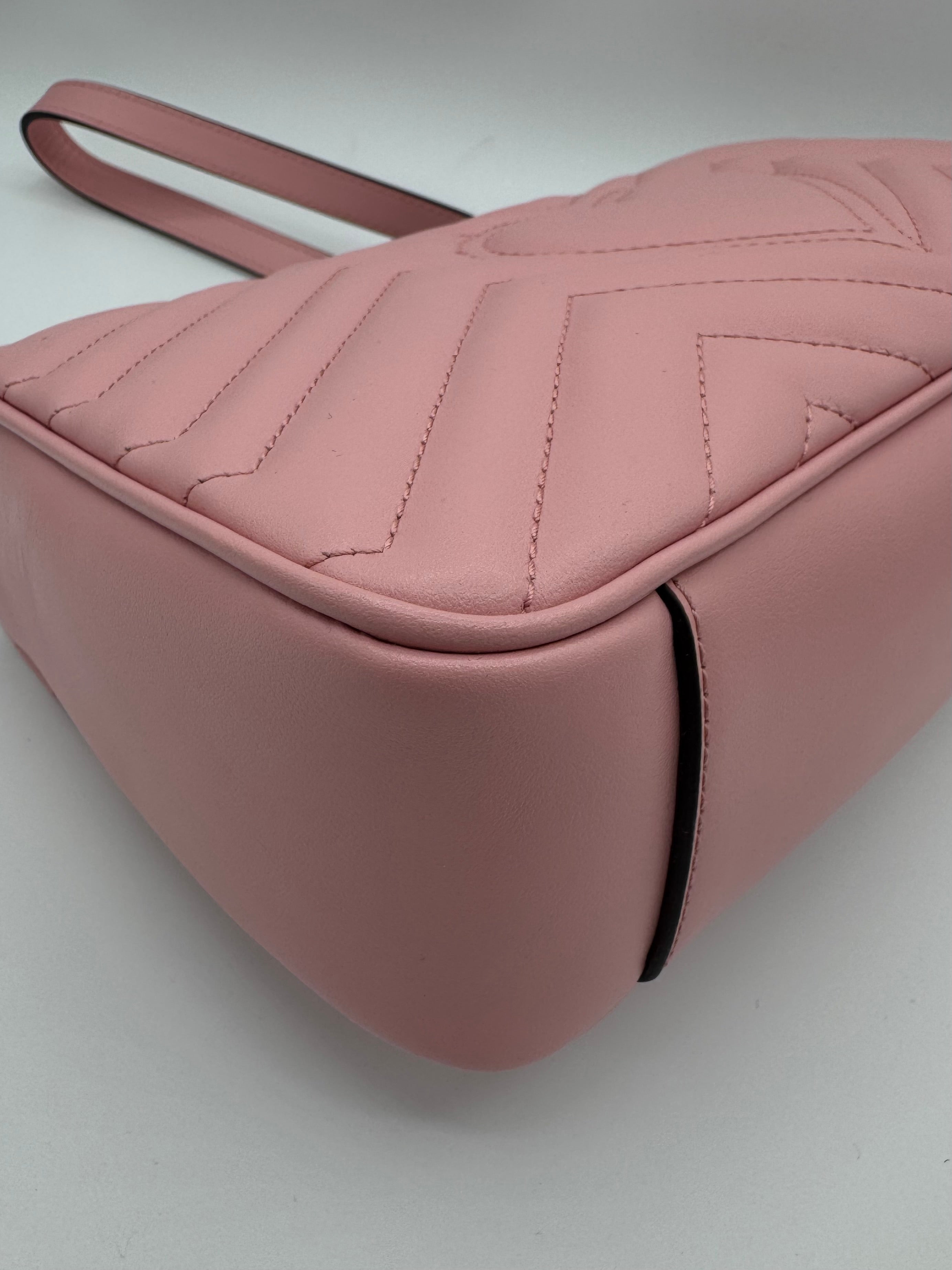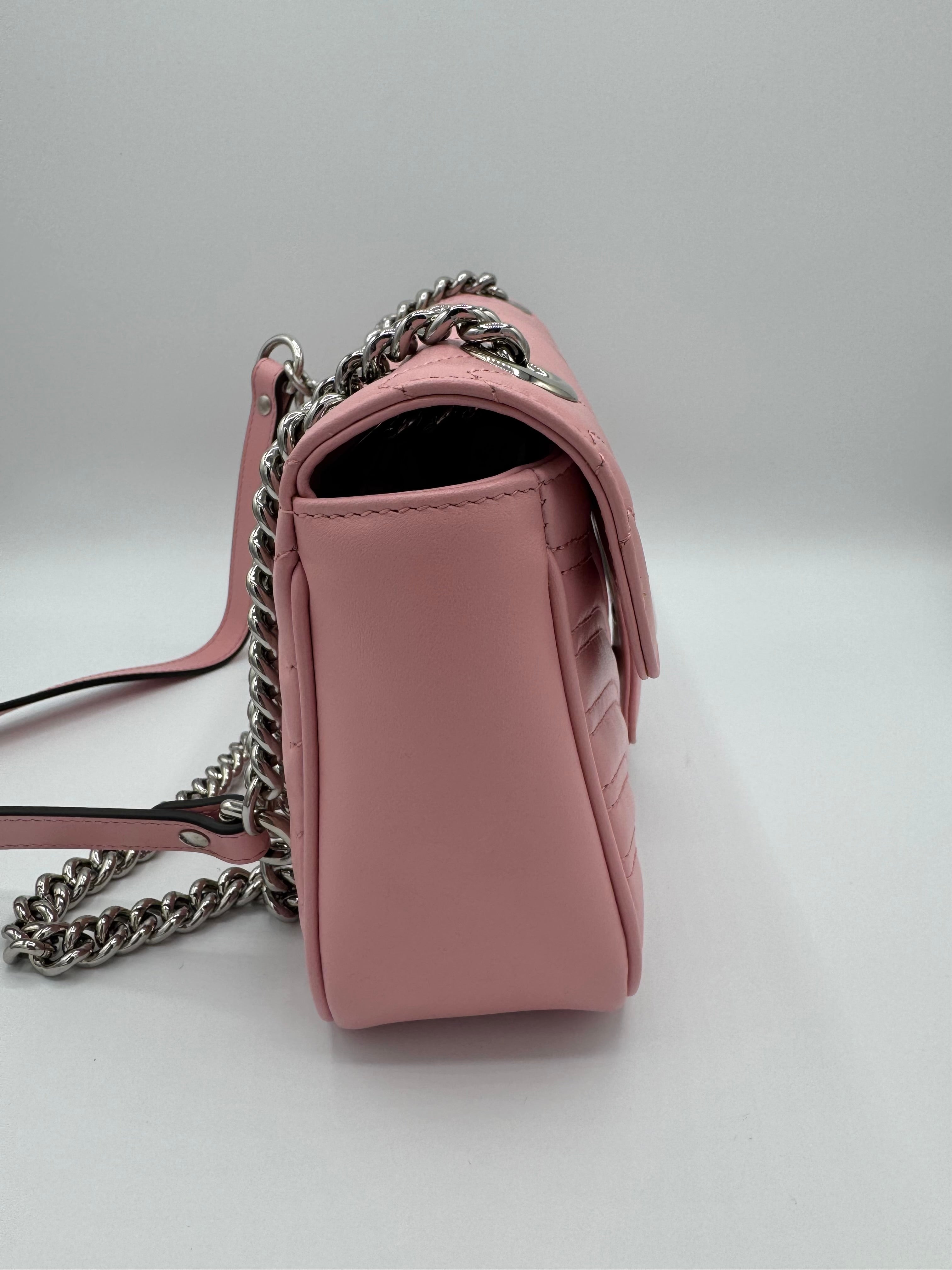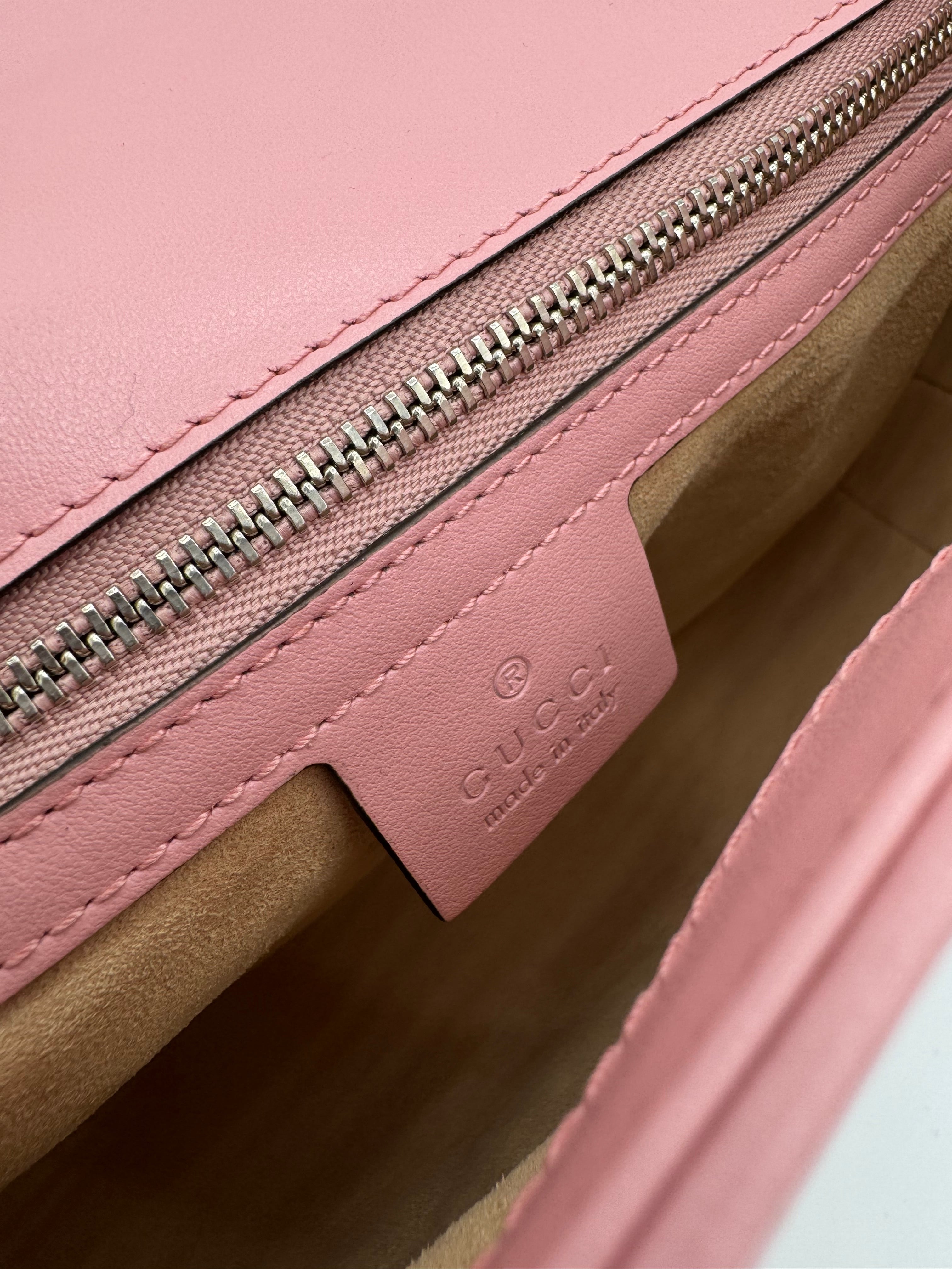Sac GG Marmont Moyen Gucci, en cuir de veau rose, en état excellent.