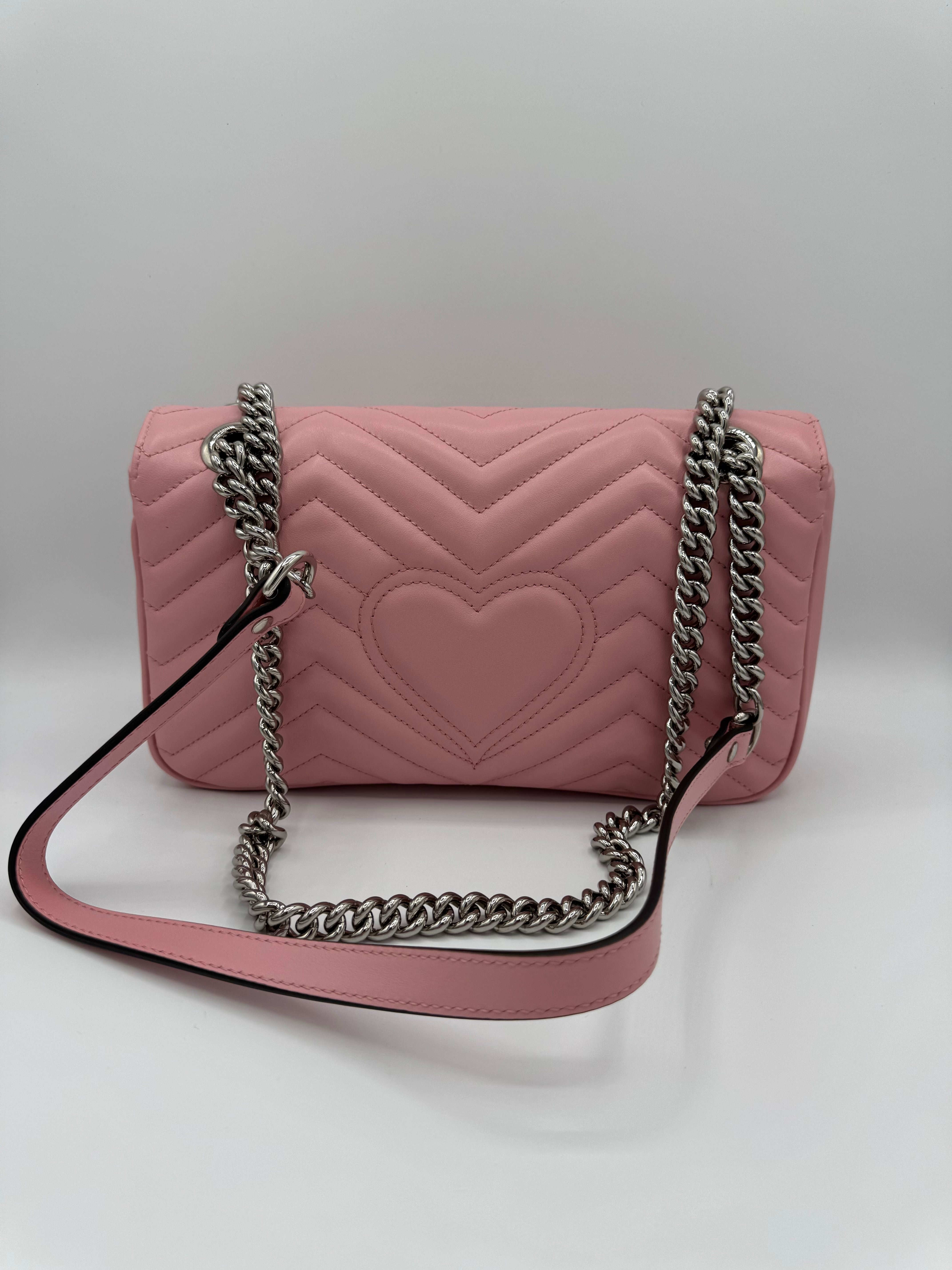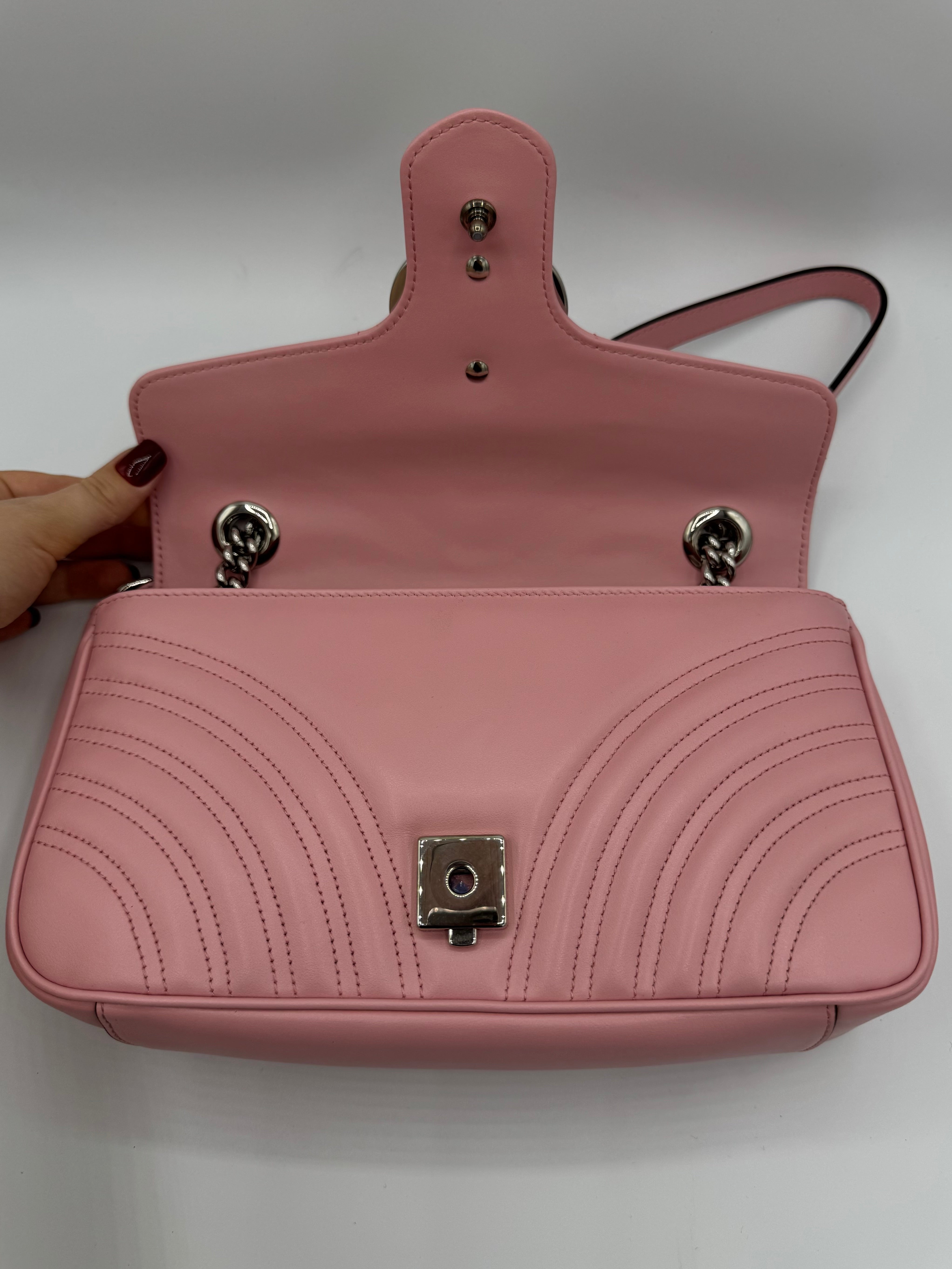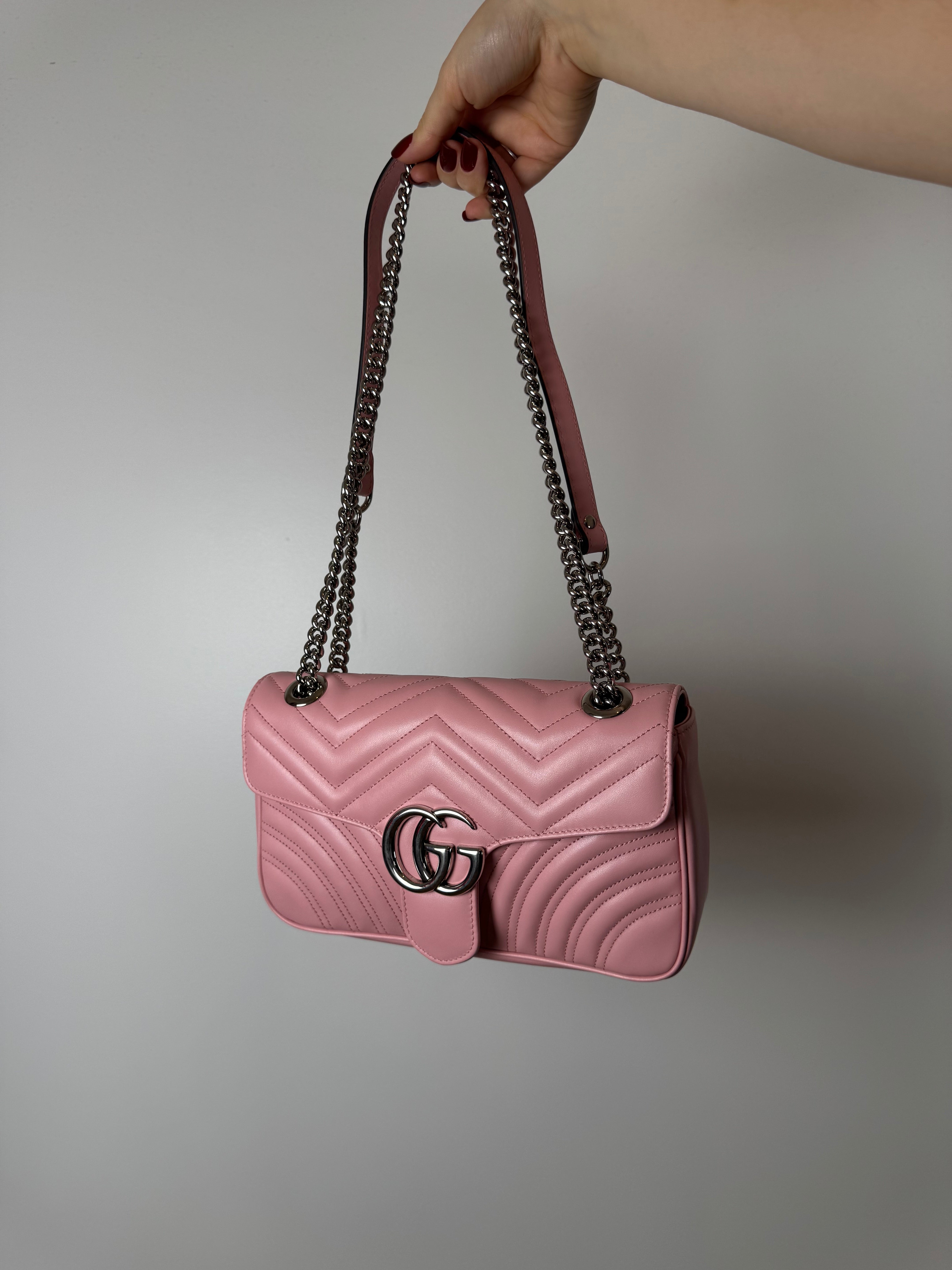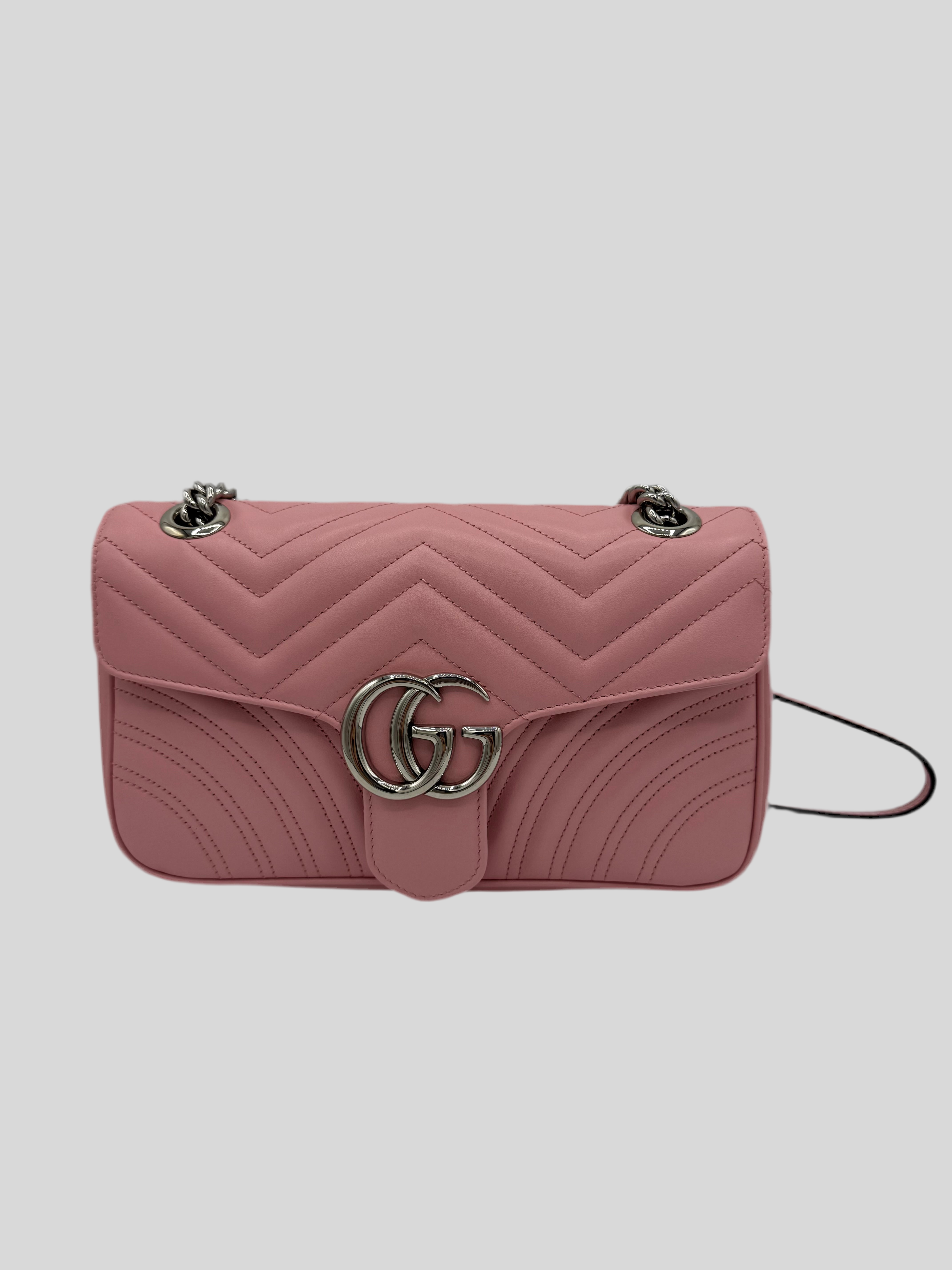 Sac GG Marmont Moyen Gucci, en cuir de veau rose, en état excellent.