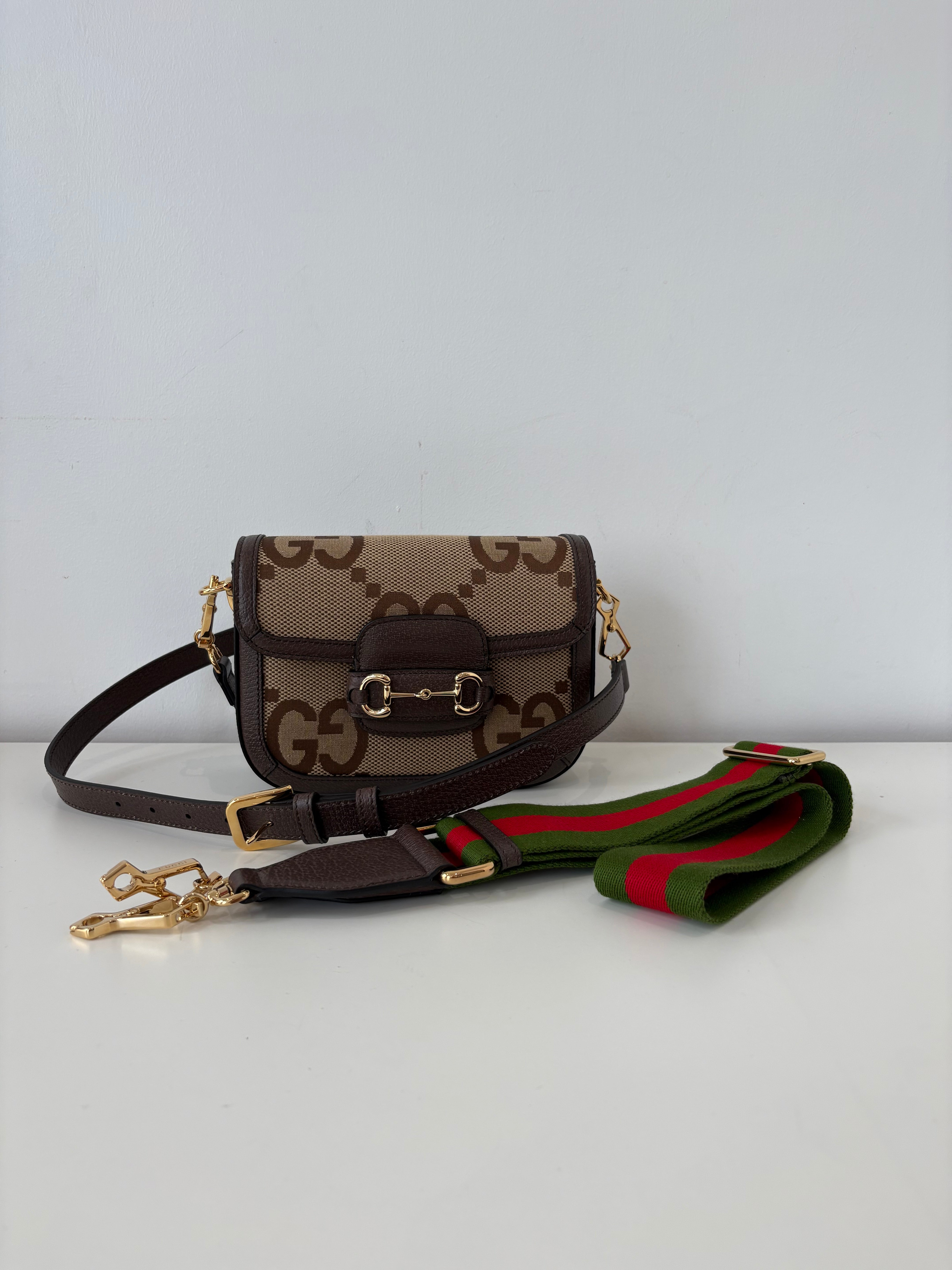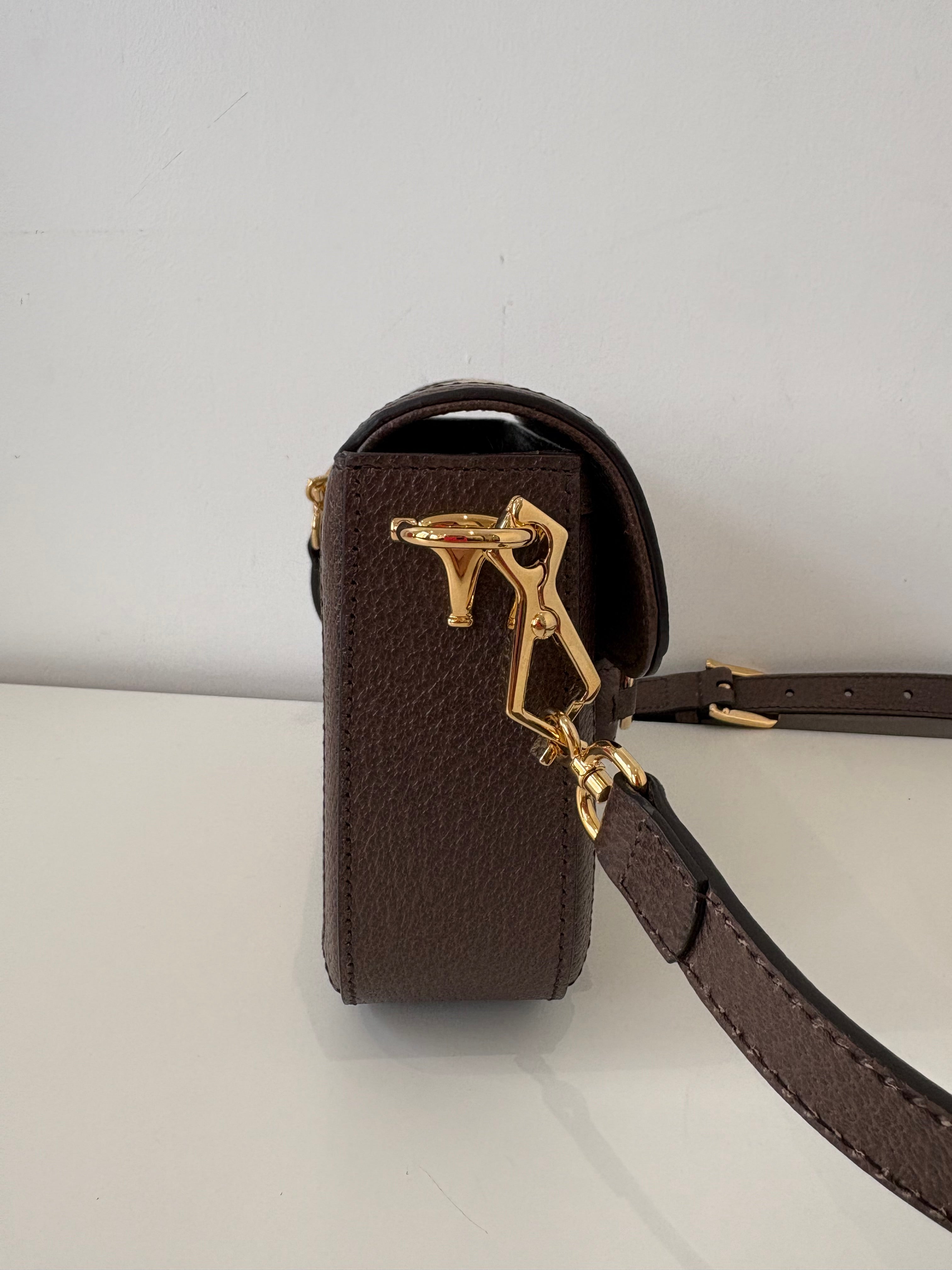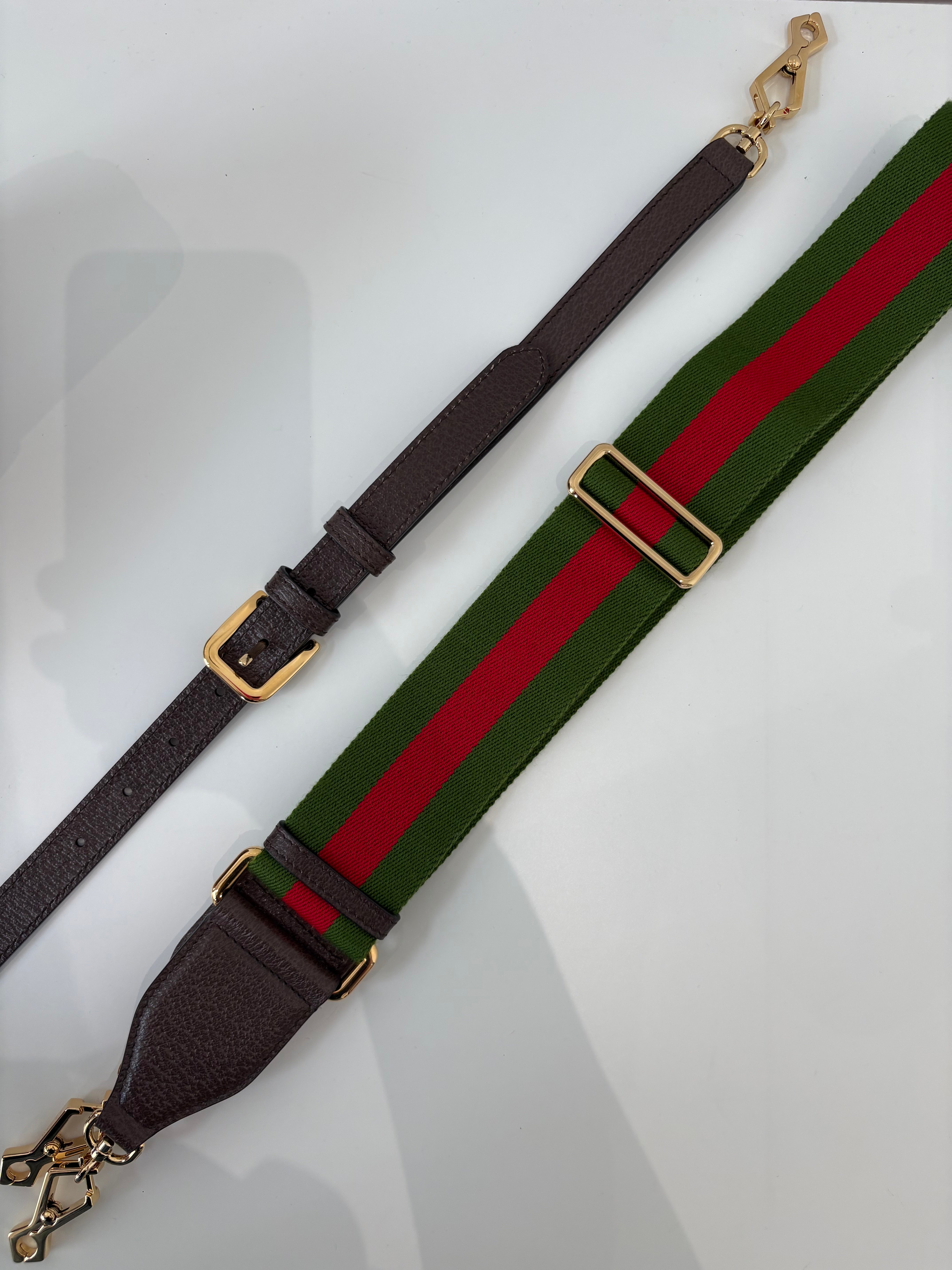 Fourni avec deux bandoulières amovibles l’une avec bandes vertes et rouges, l’autre fine en cuir tan (réglables les deux).