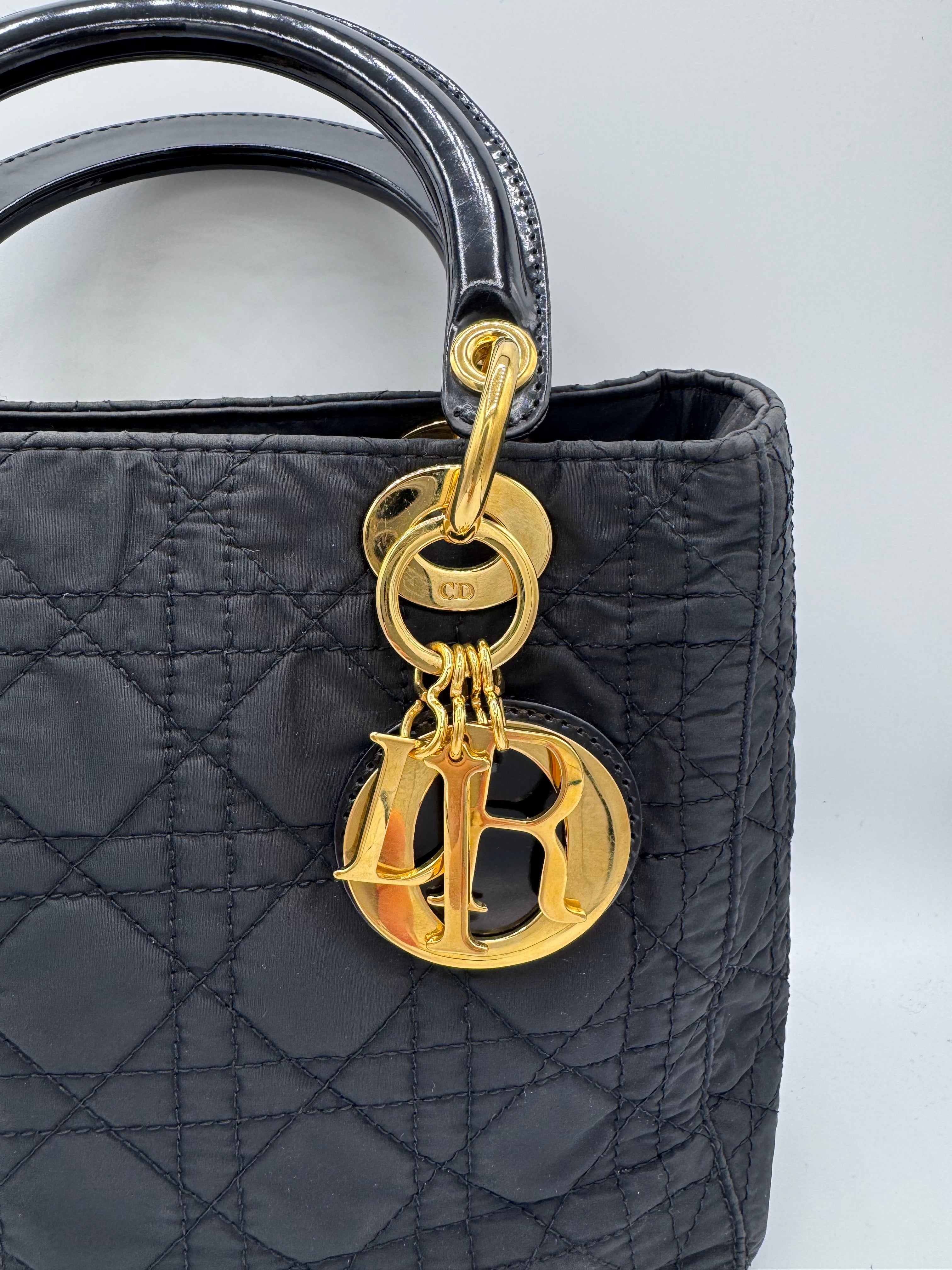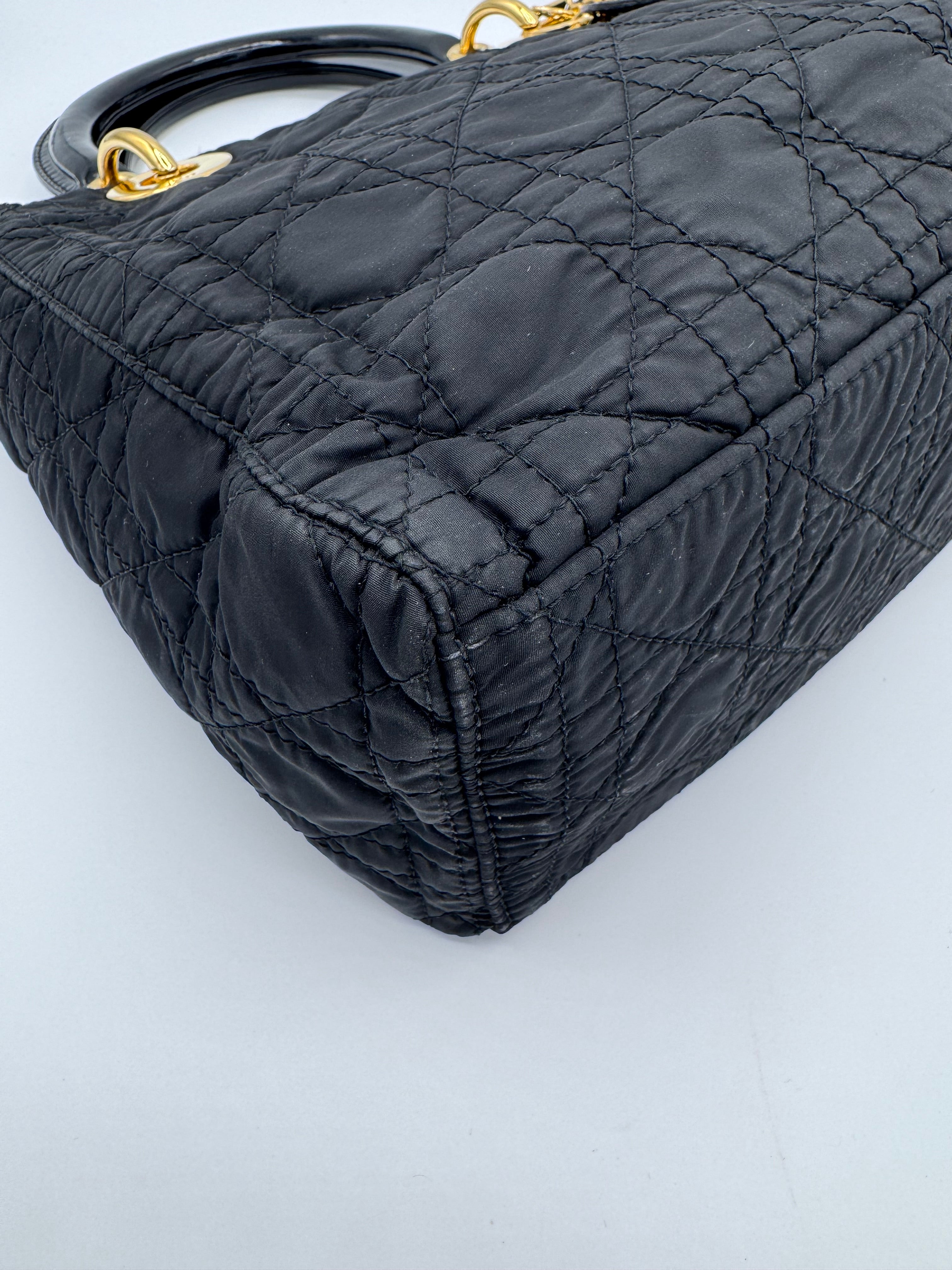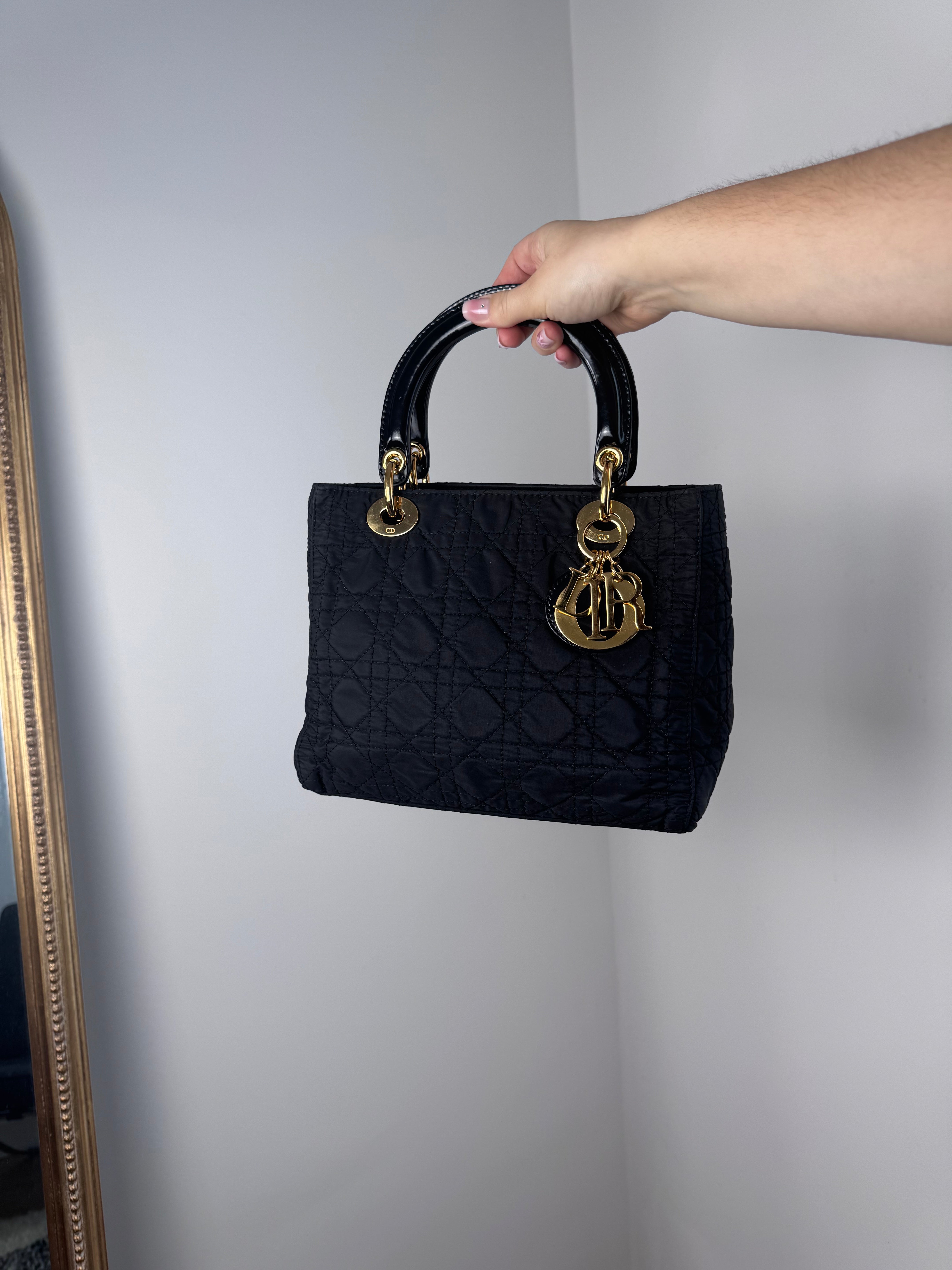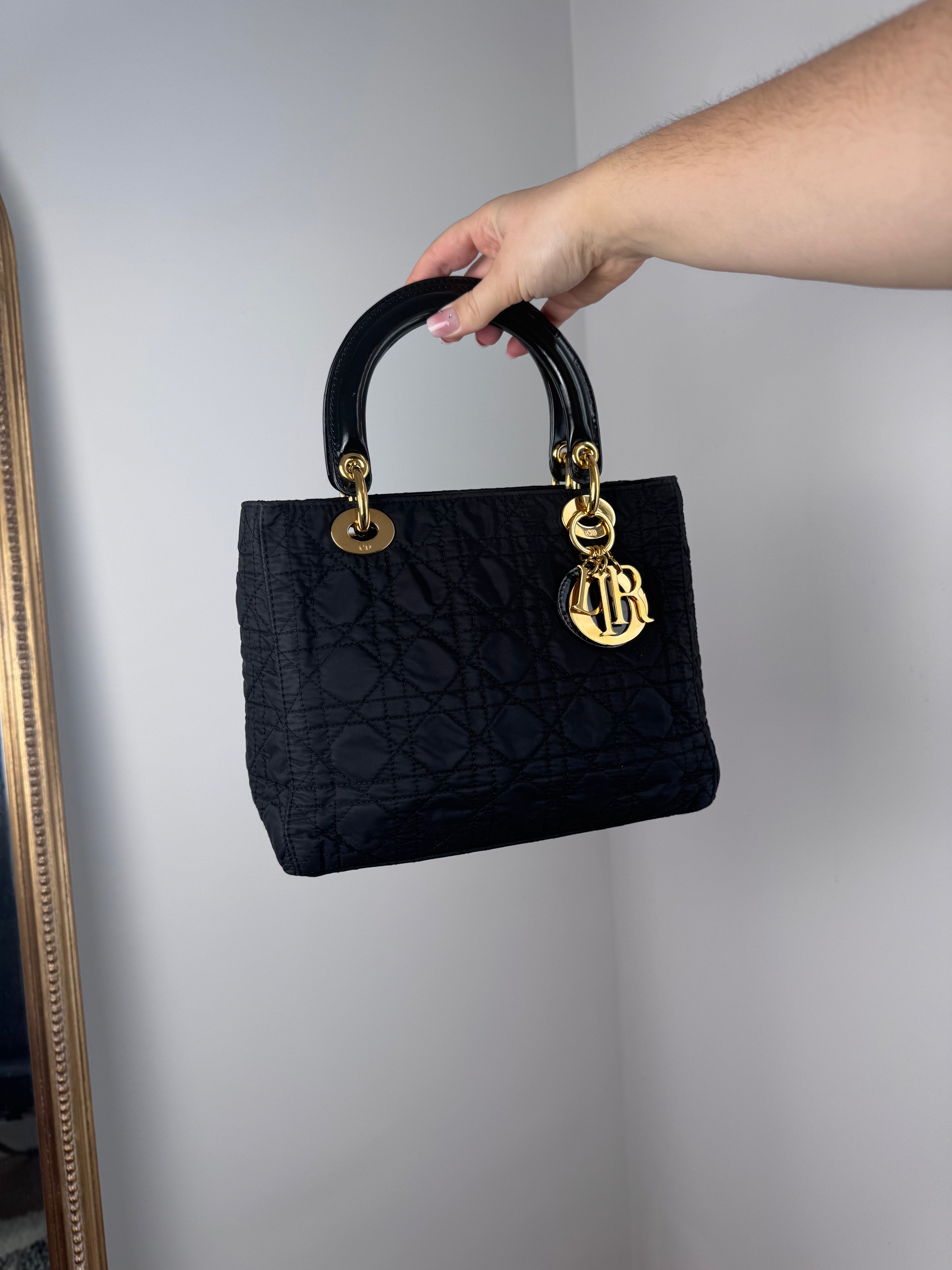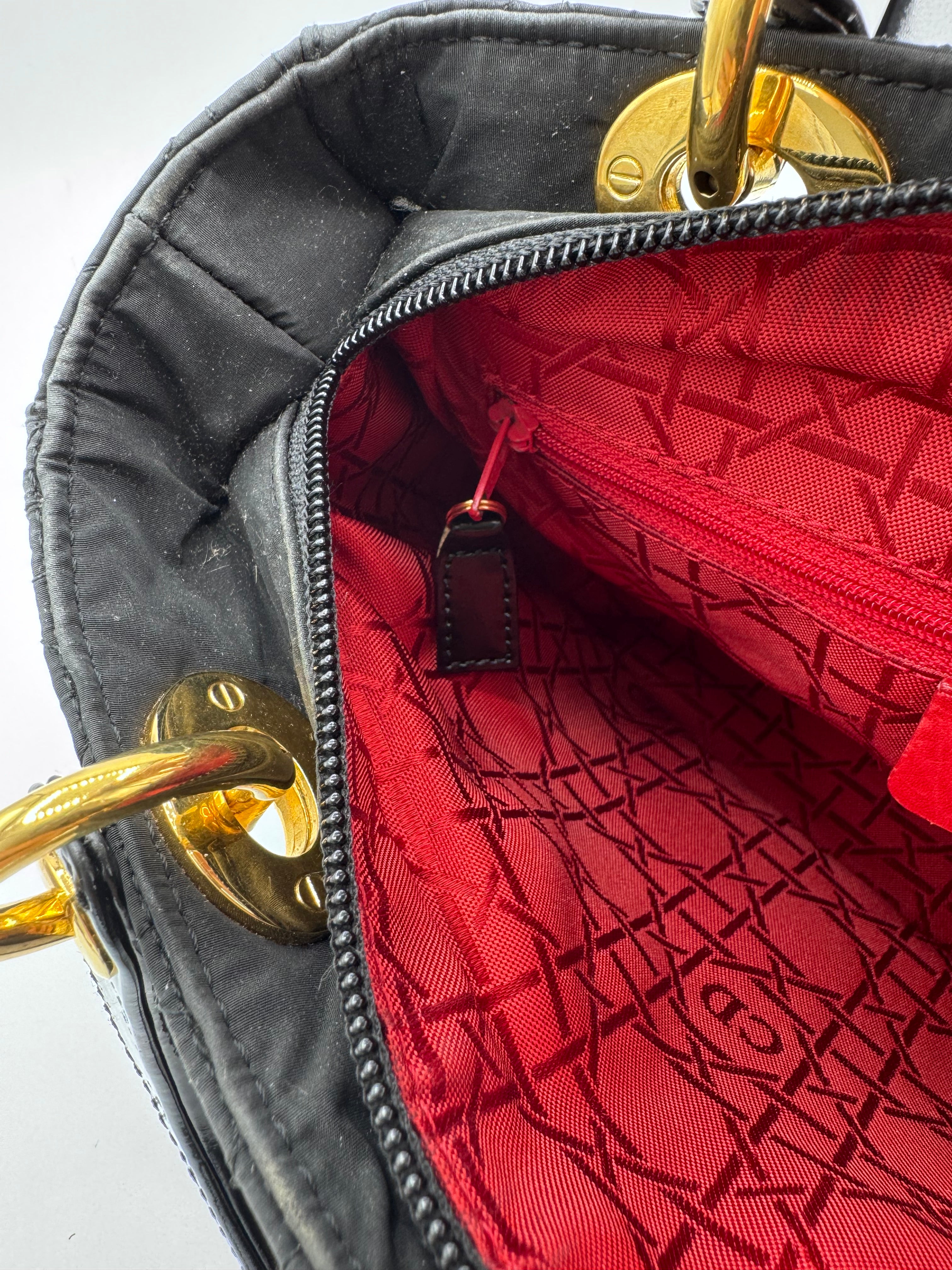 Ce Sac Lady Dior Medium en tissu noir et bijouterie dorée est en très bon état général.