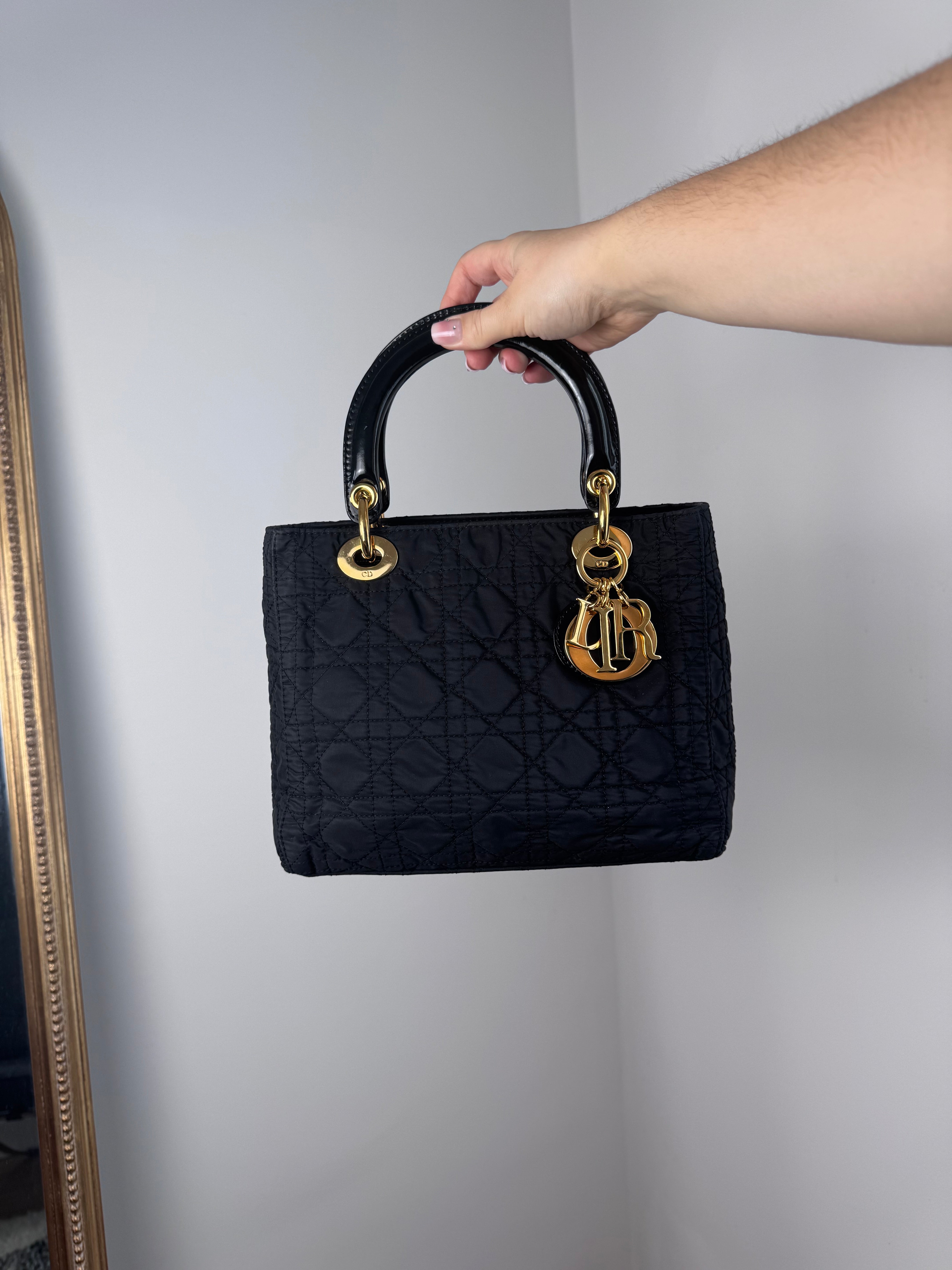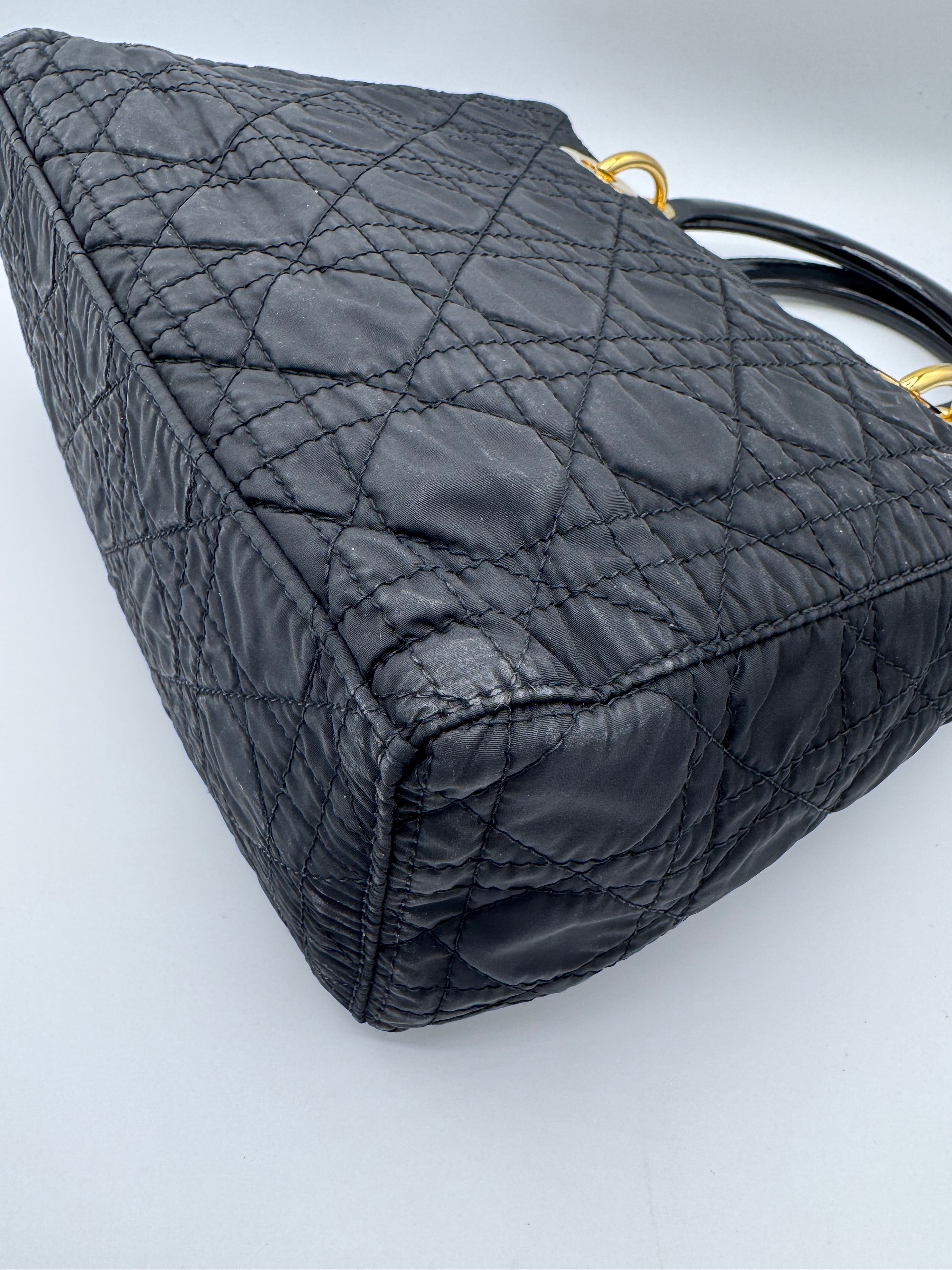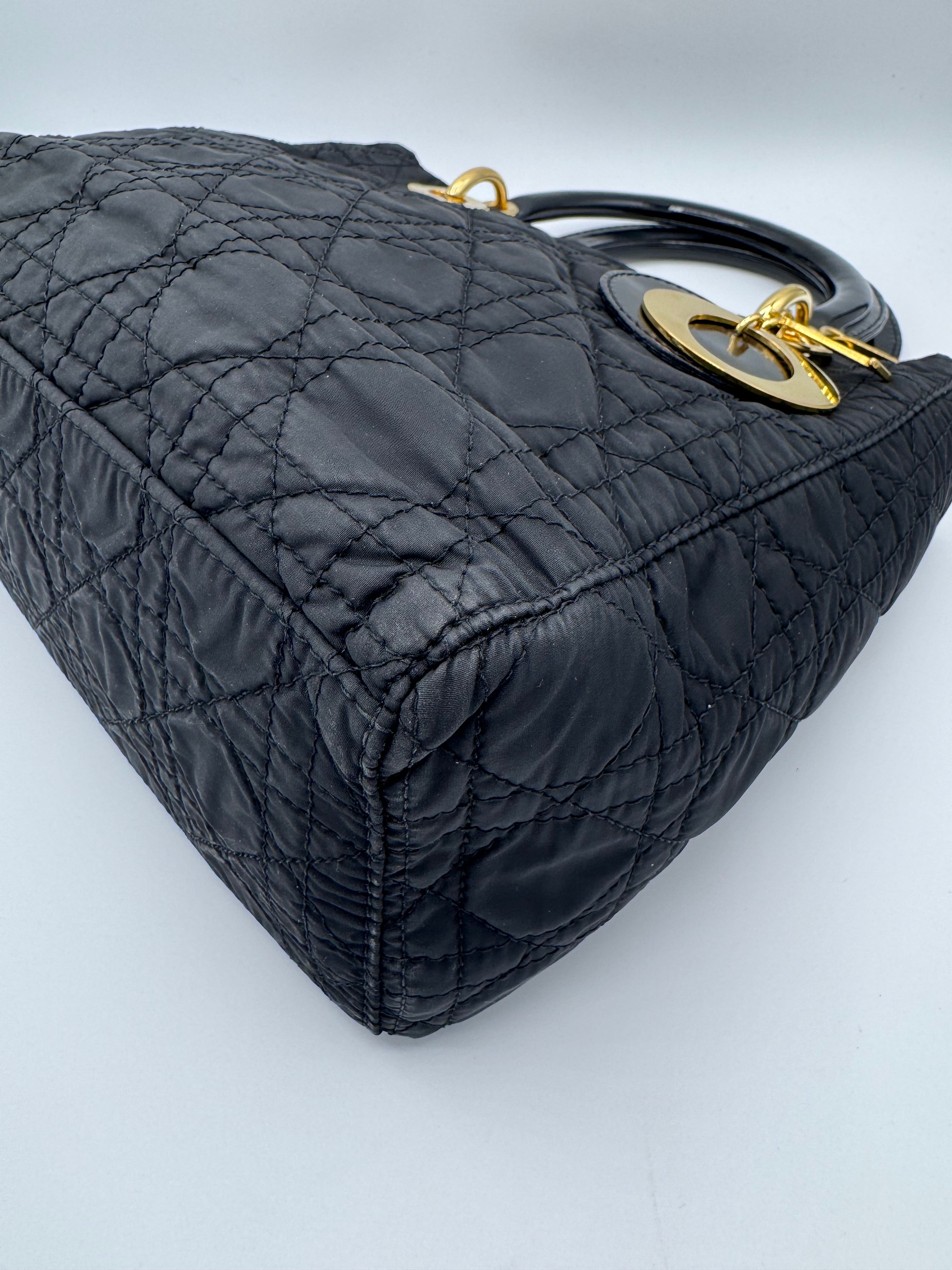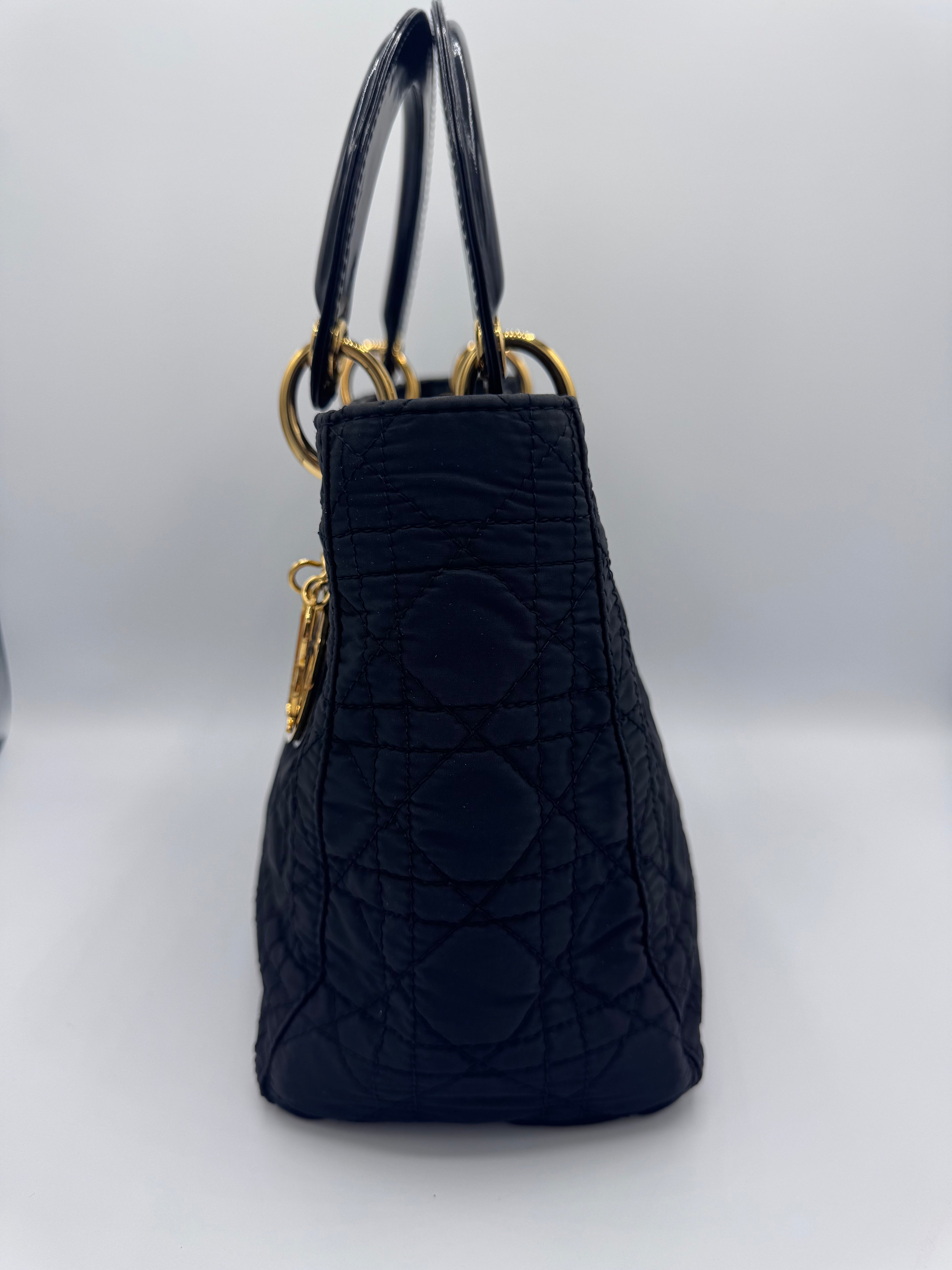 Ce Sac Lady Dior Medium en tissu noir et bijouterie dorée est en très bon état général.