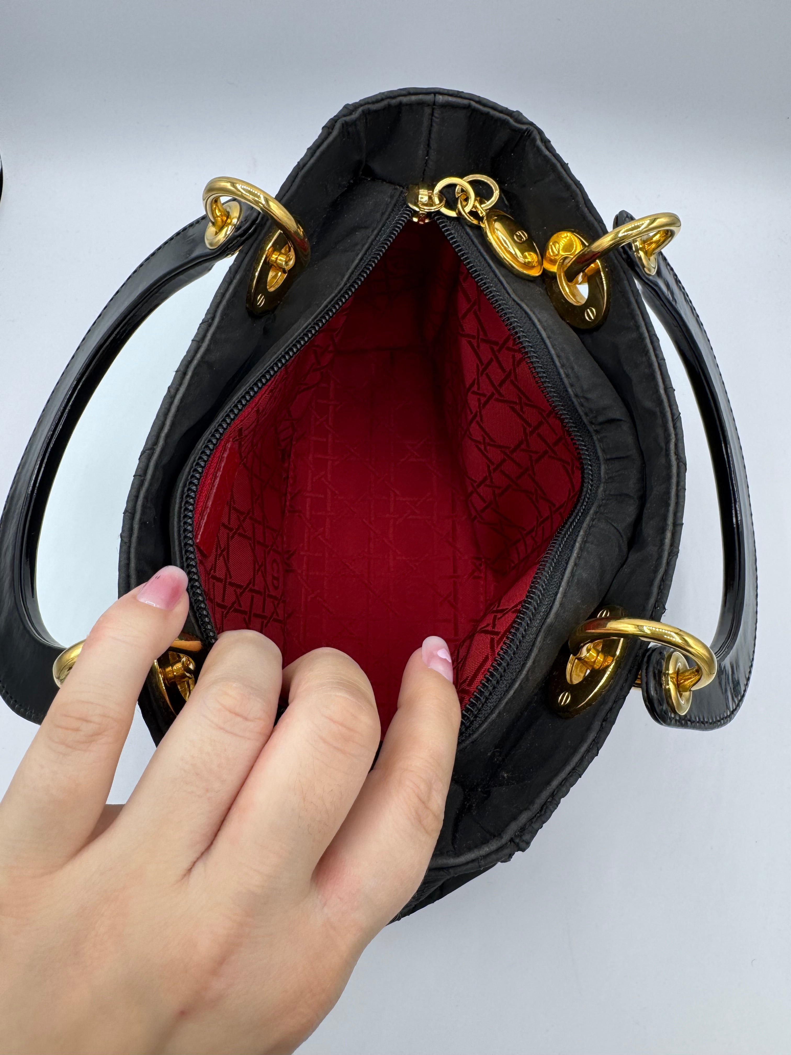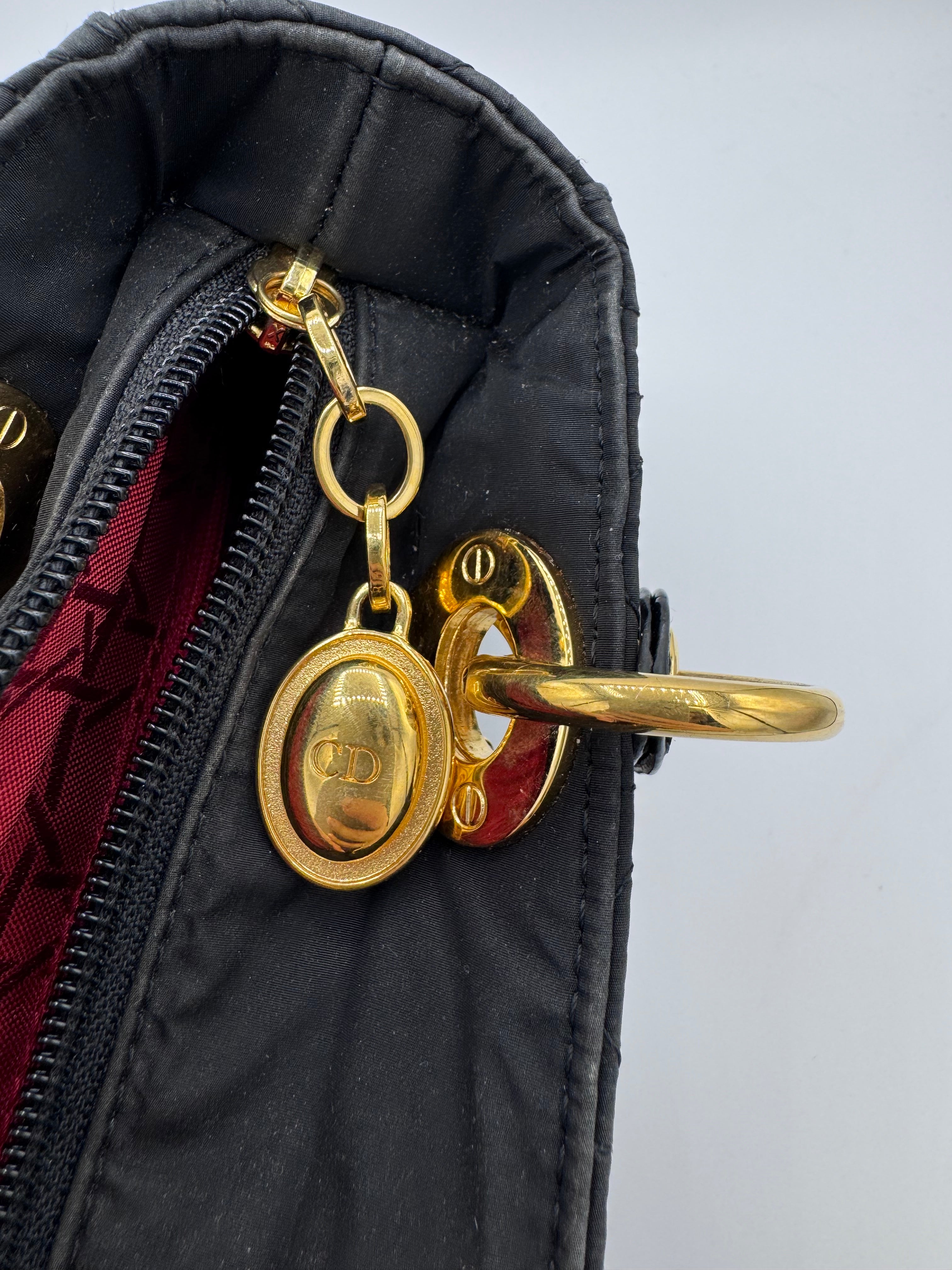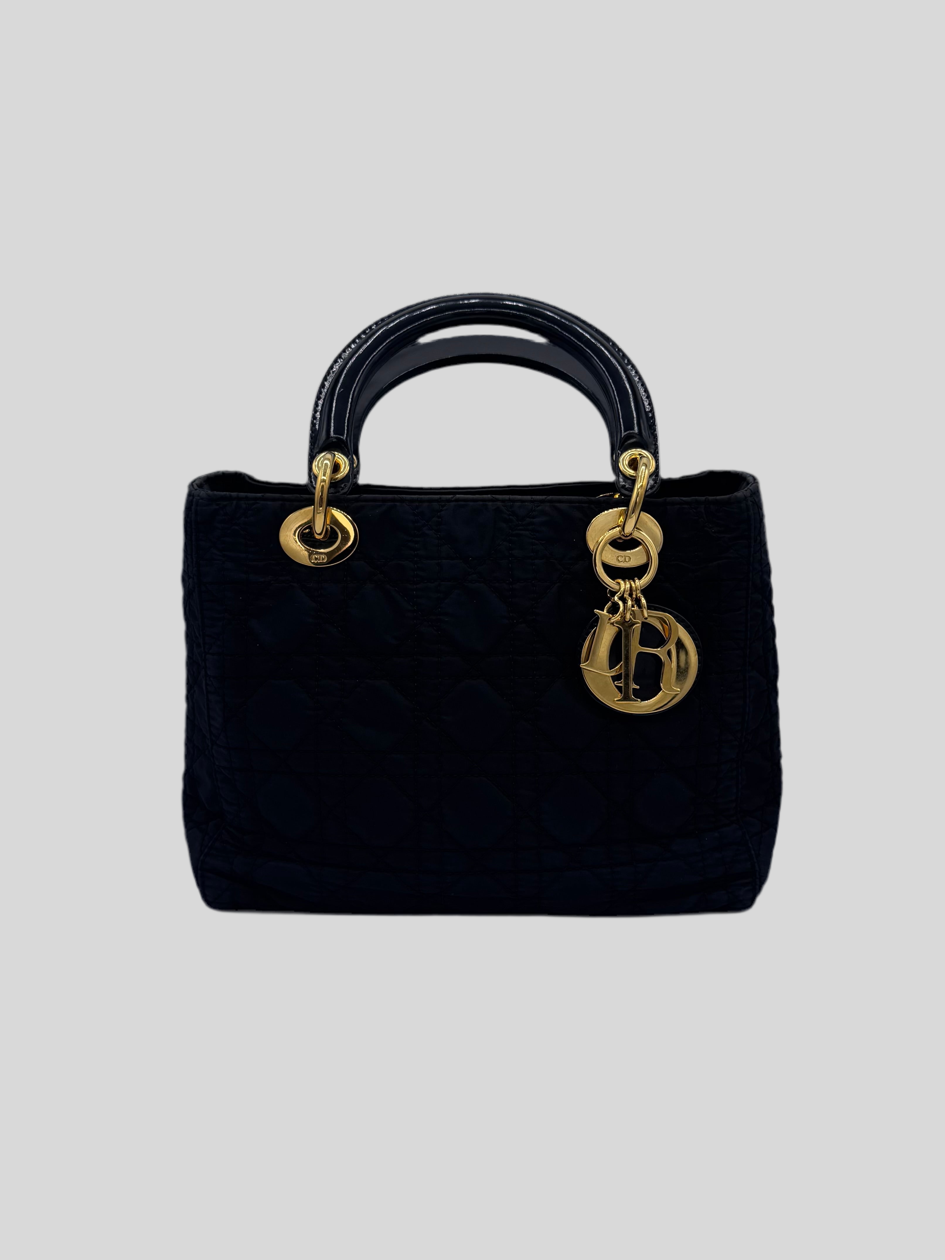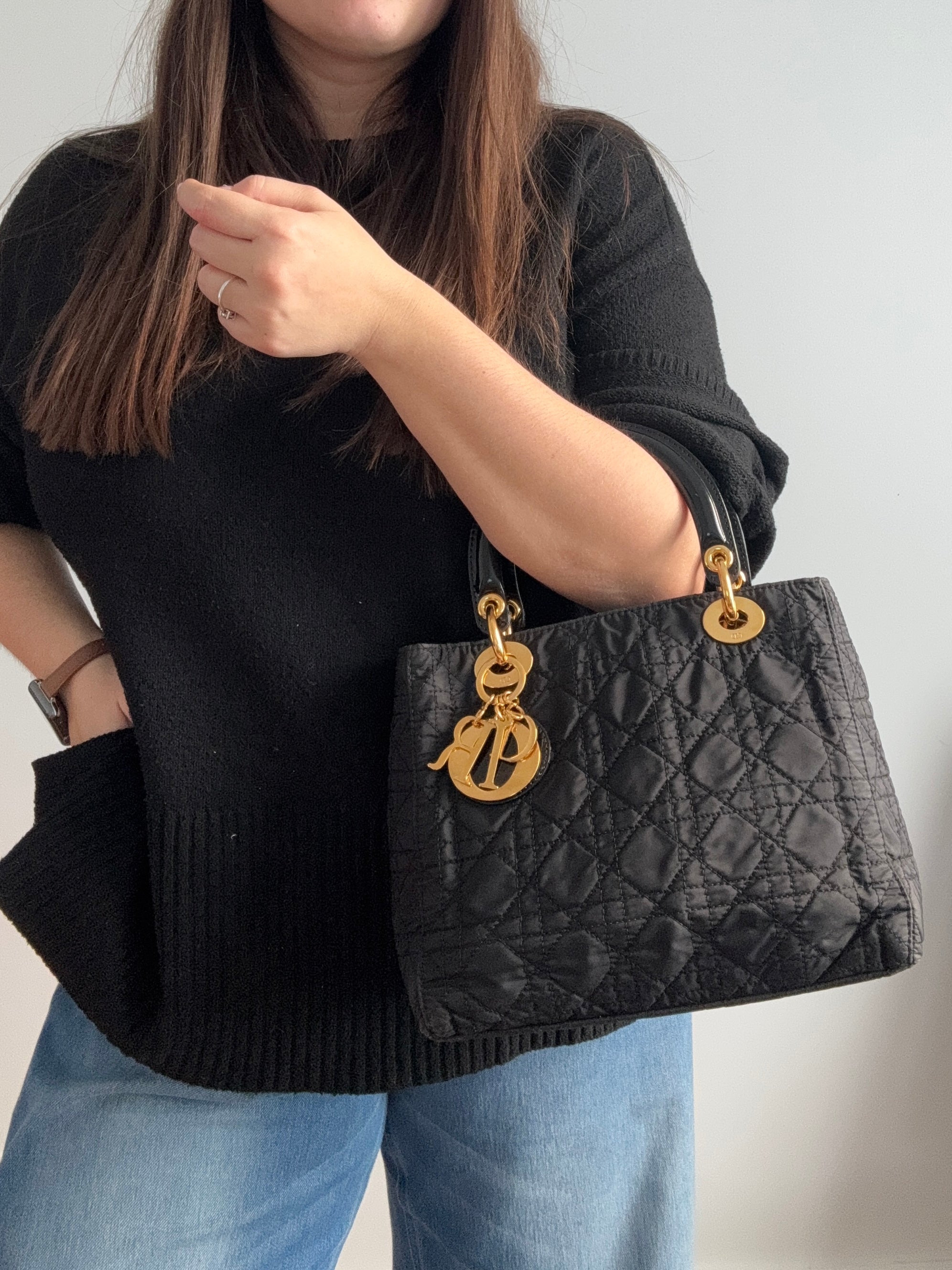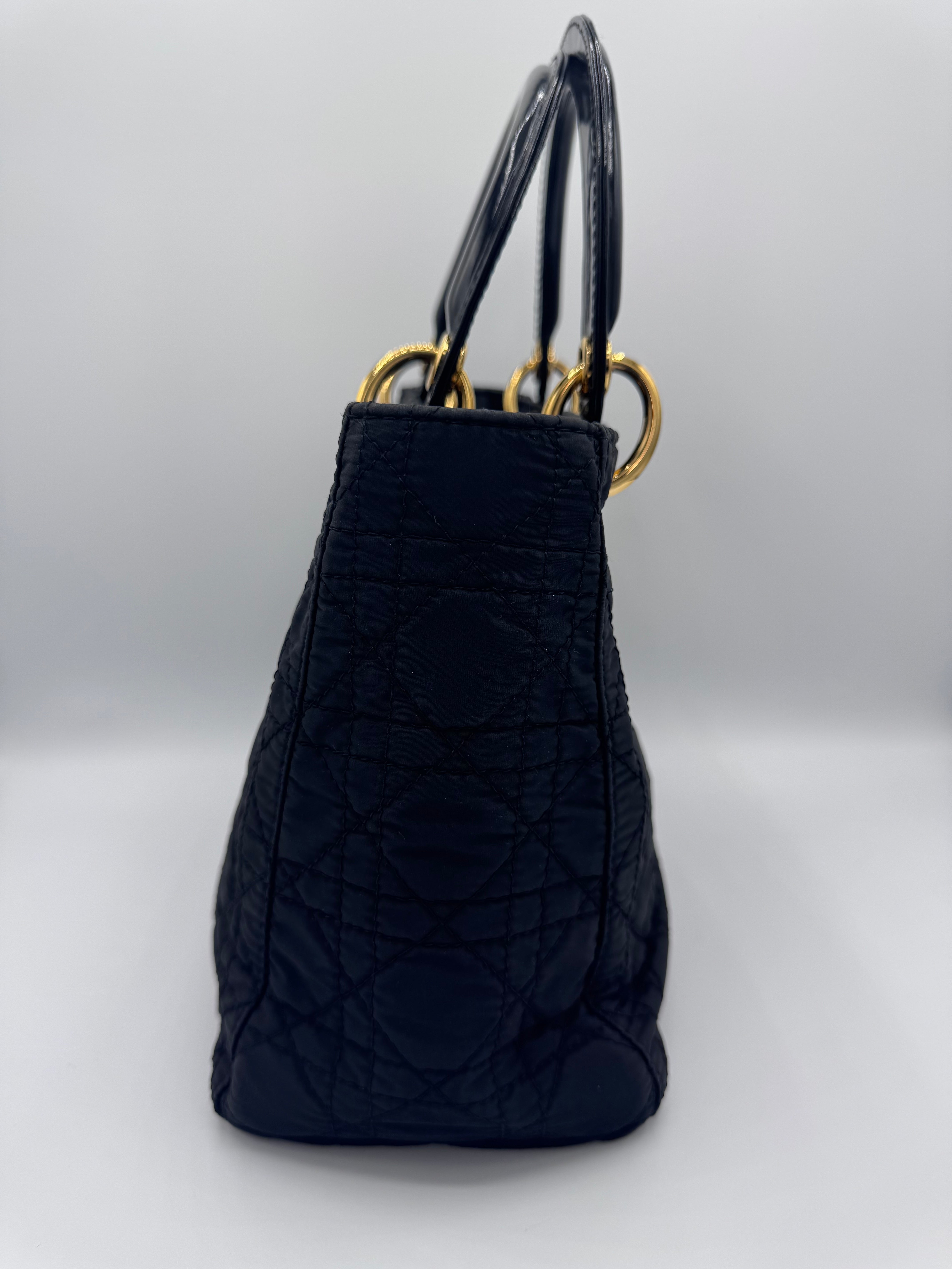 Ce Sac Lady Dior Medium en tissu noir et bijouterie dorée est en très bon état général.