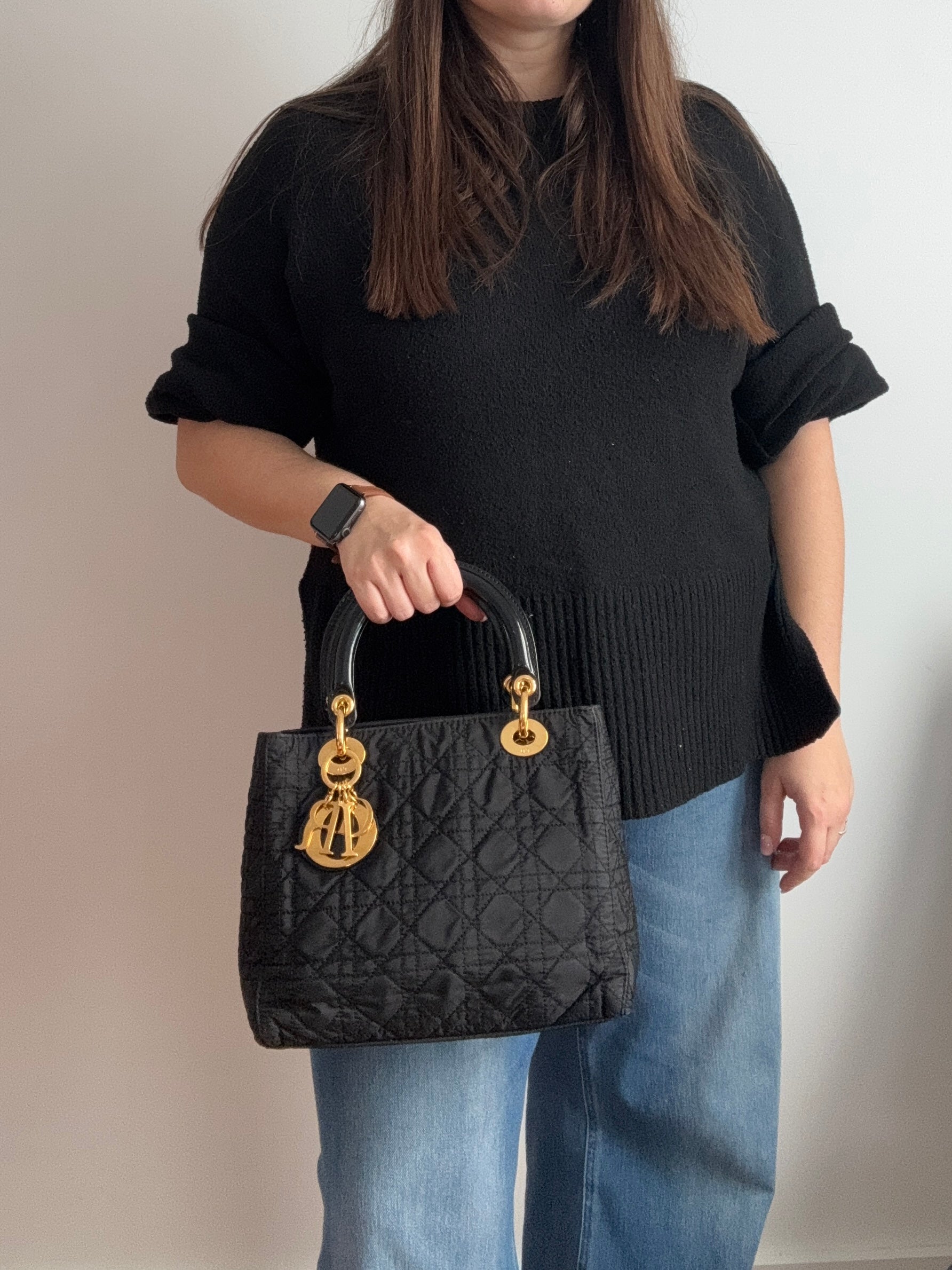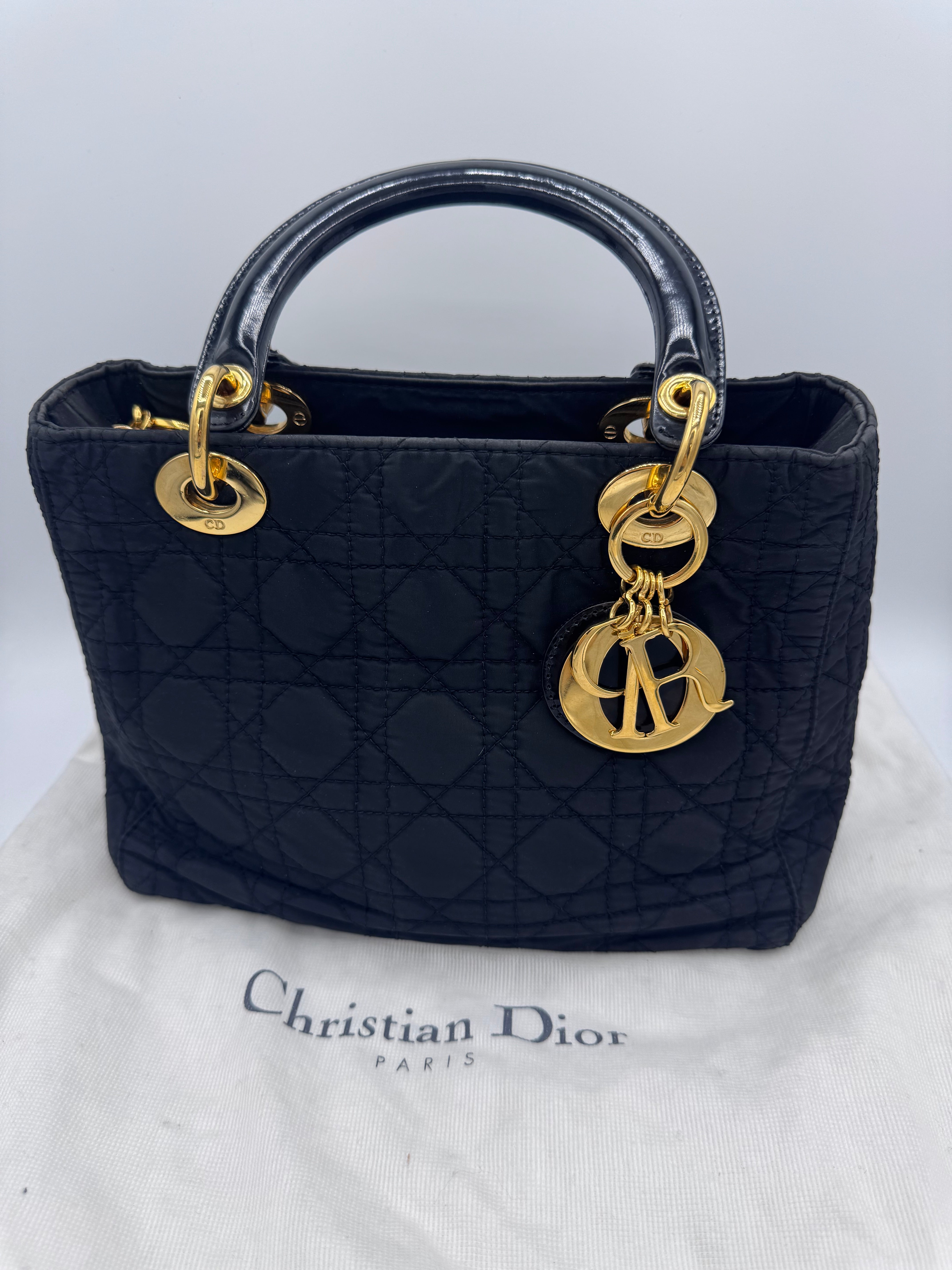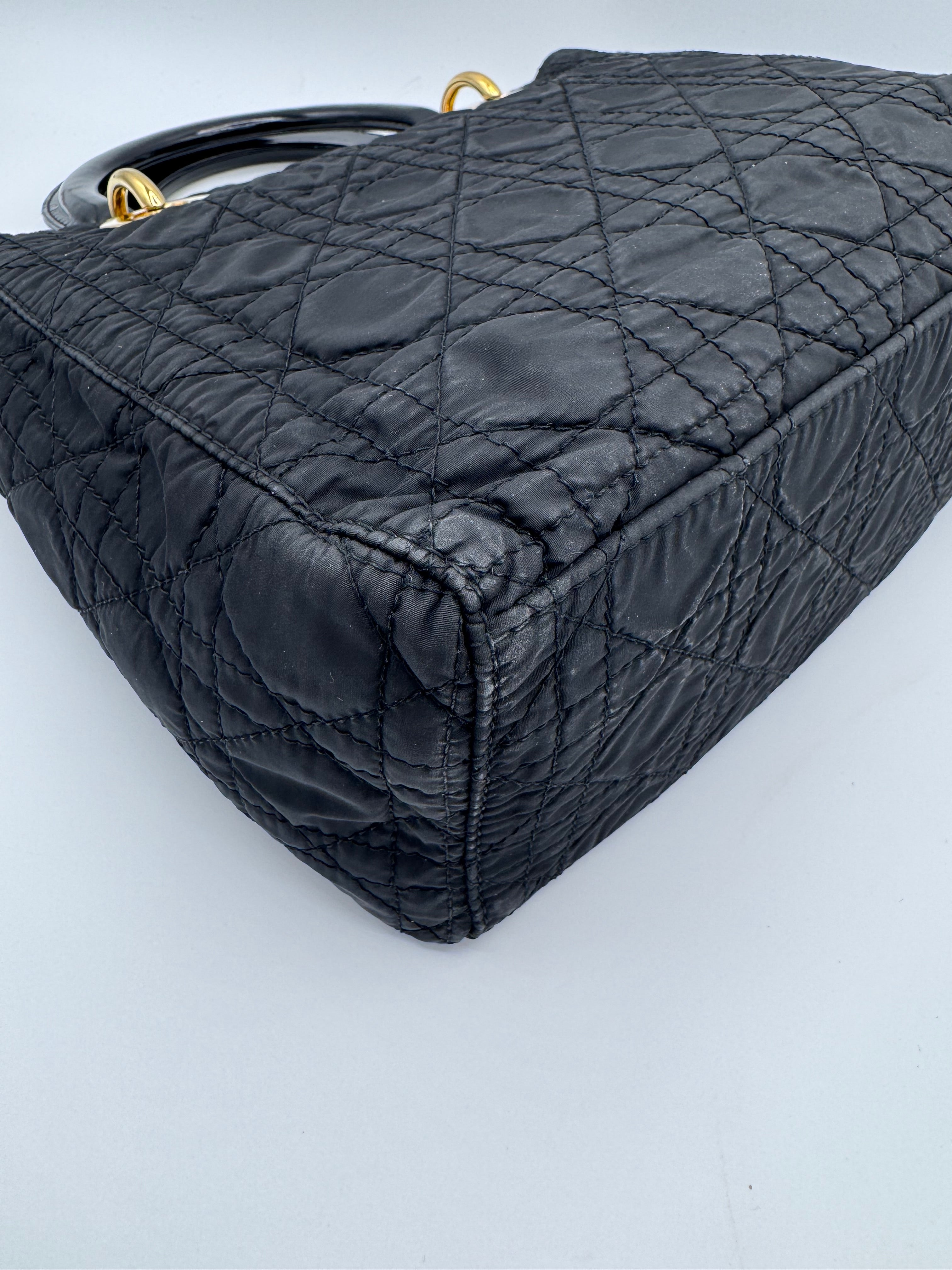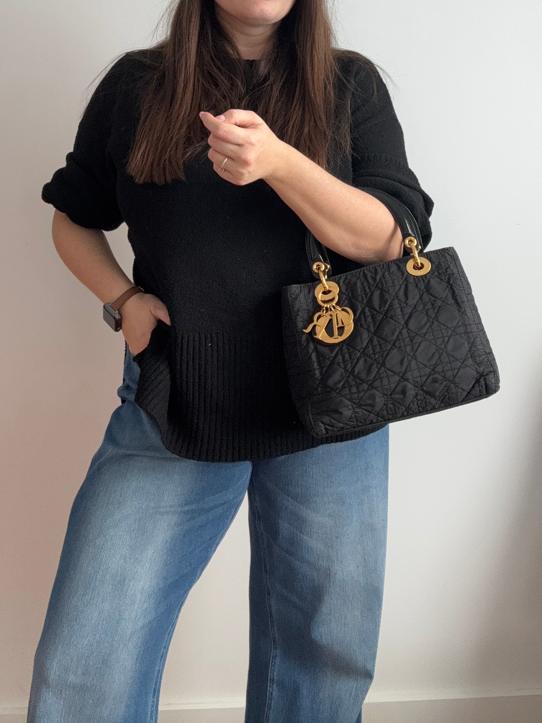 Ce Sac Lady Dior Medium en tissu noir et bijouterie dorée est en très bon état général.