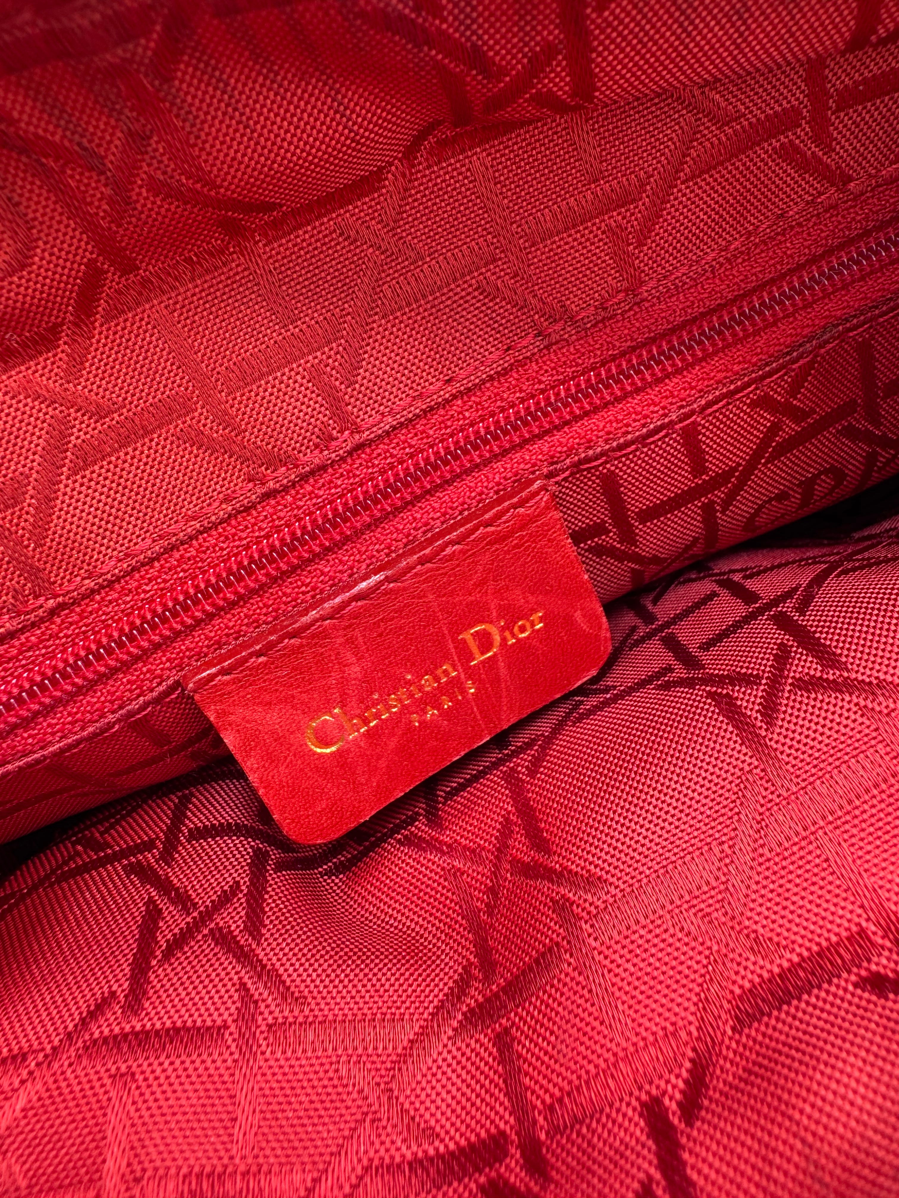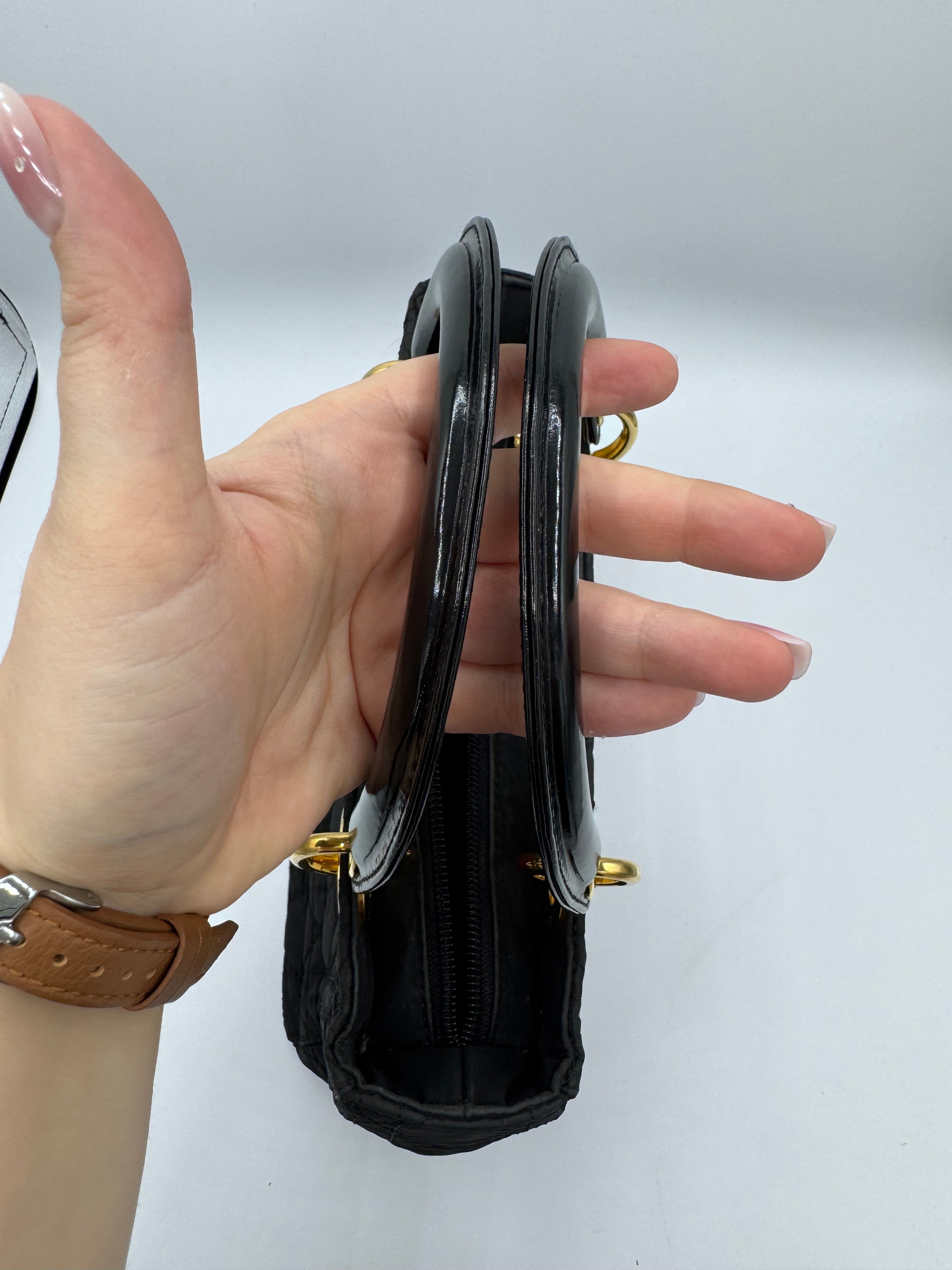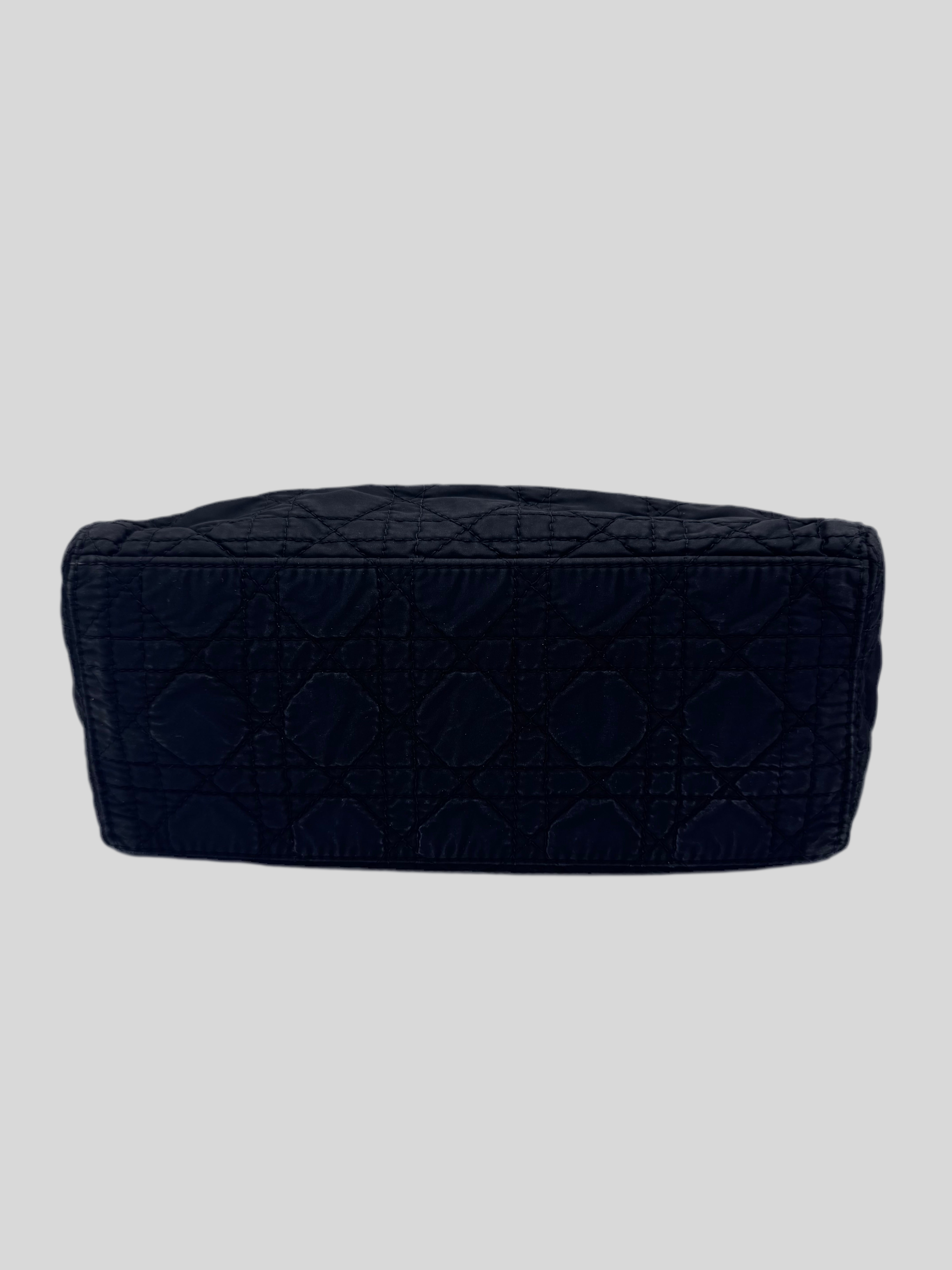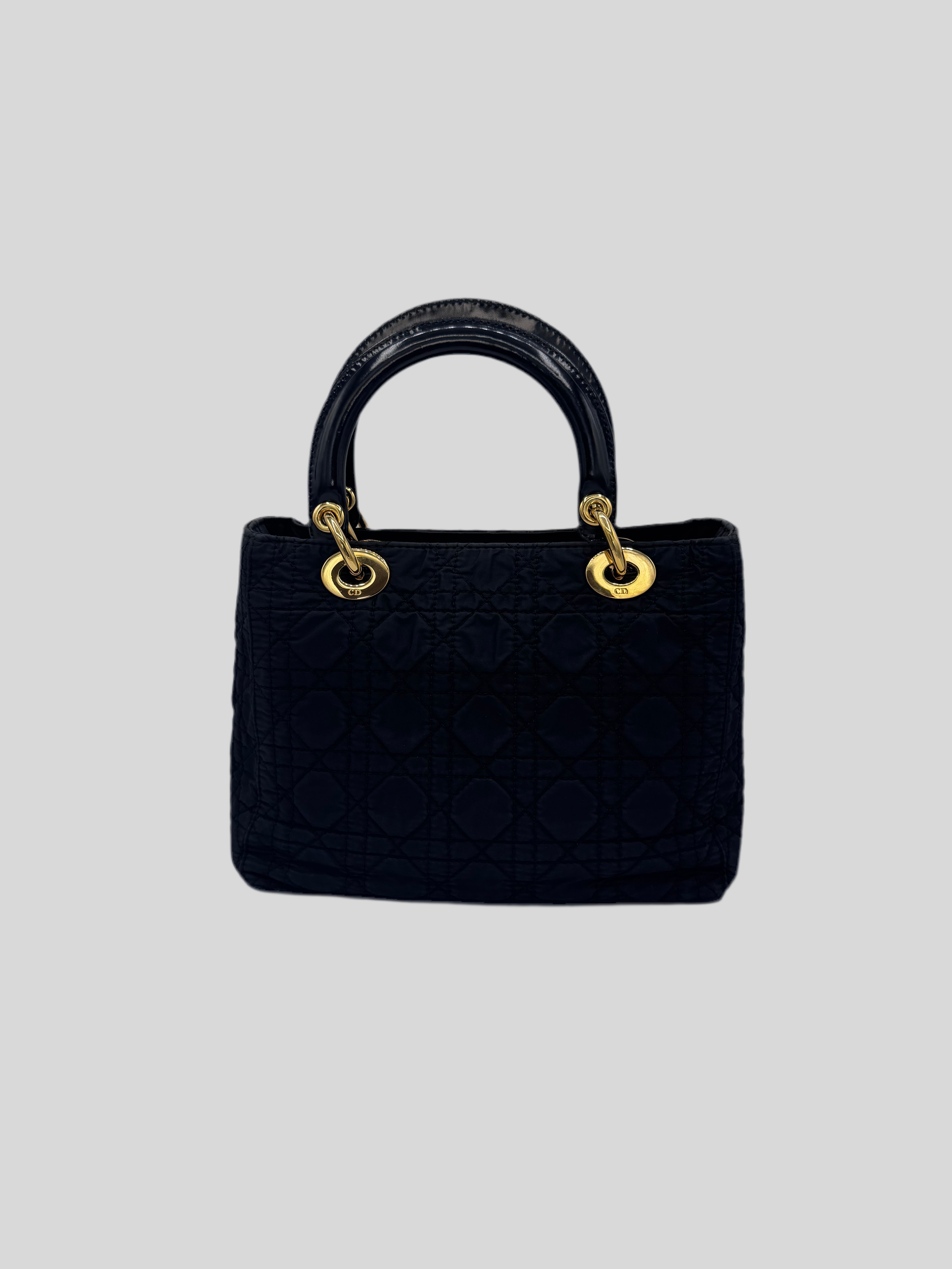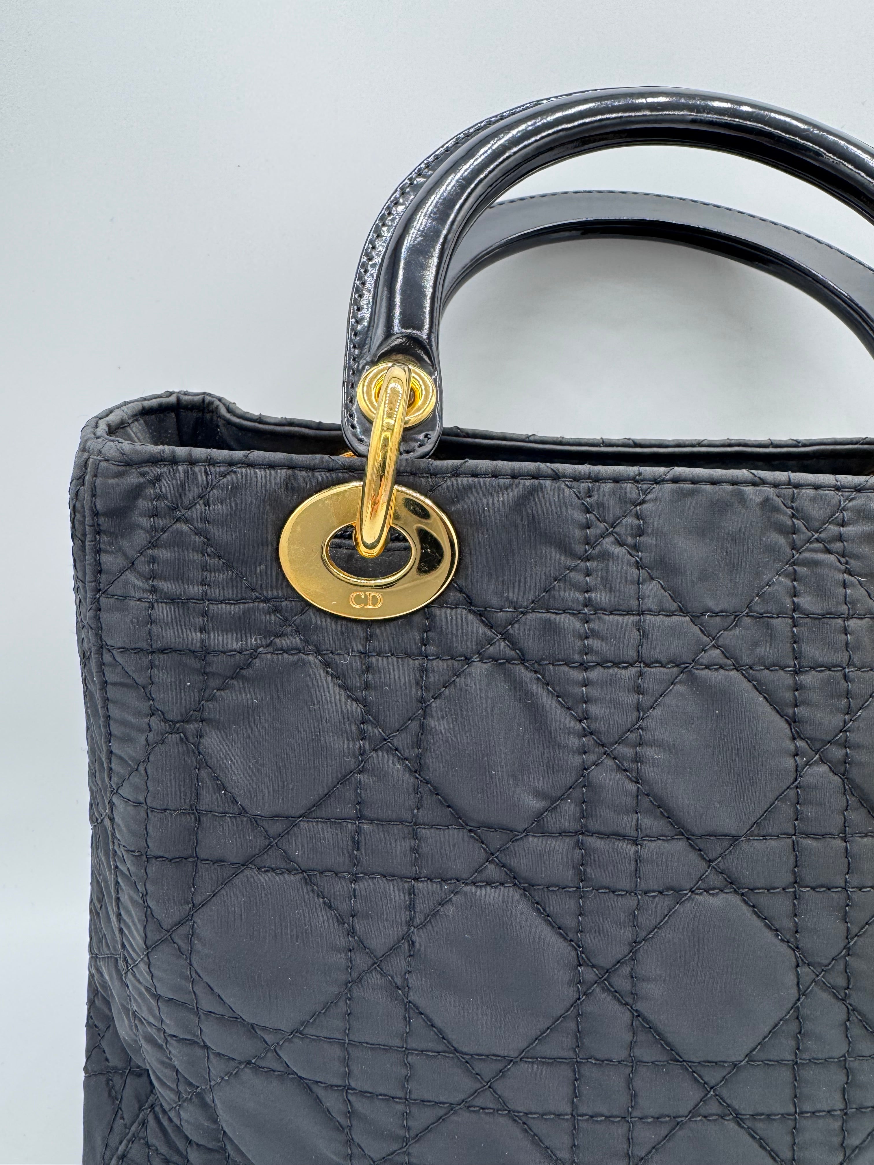 Ce Sac Lady Dior Medium en tissu noir et bijouterie dorée est en très bon état général.