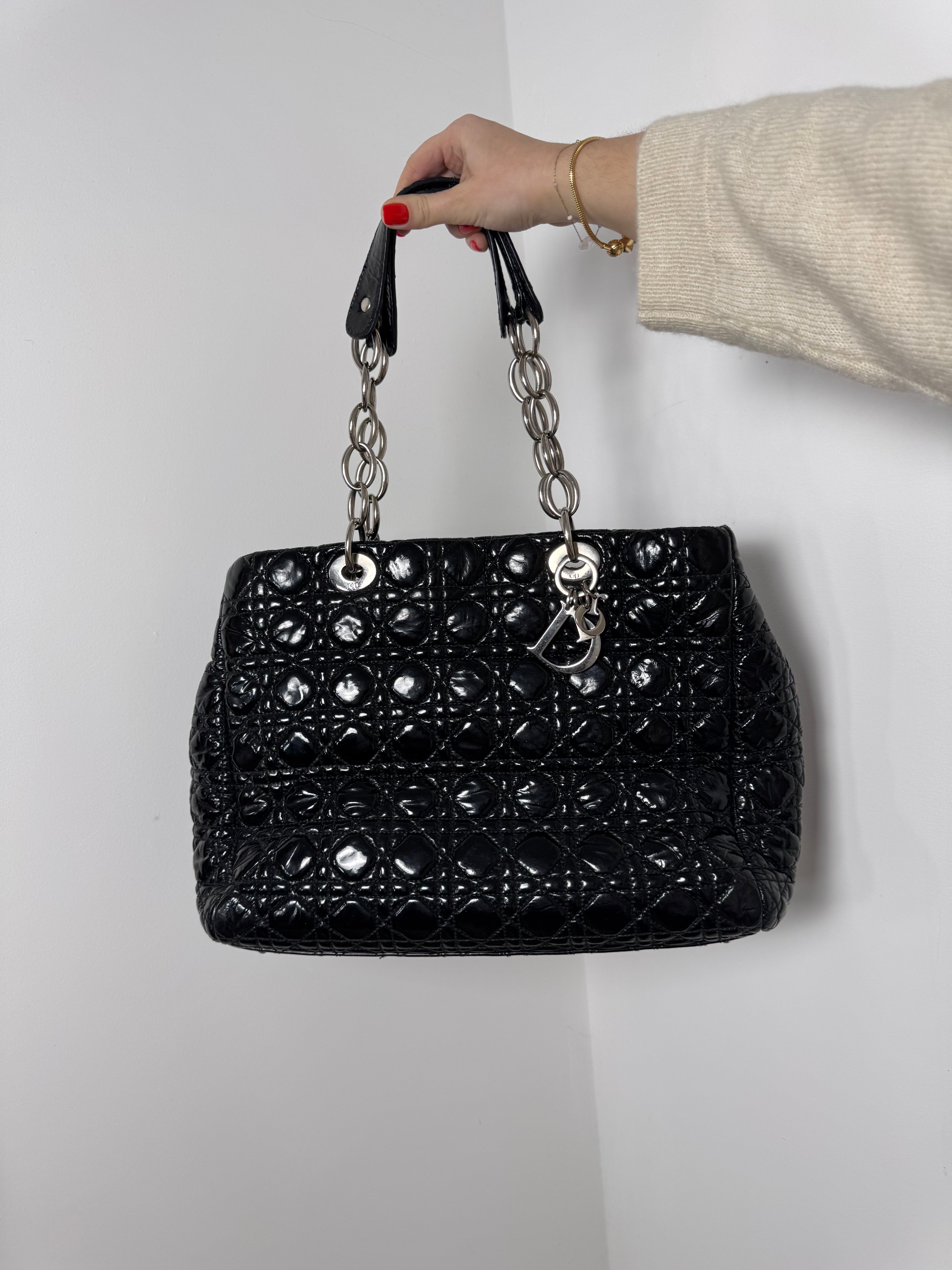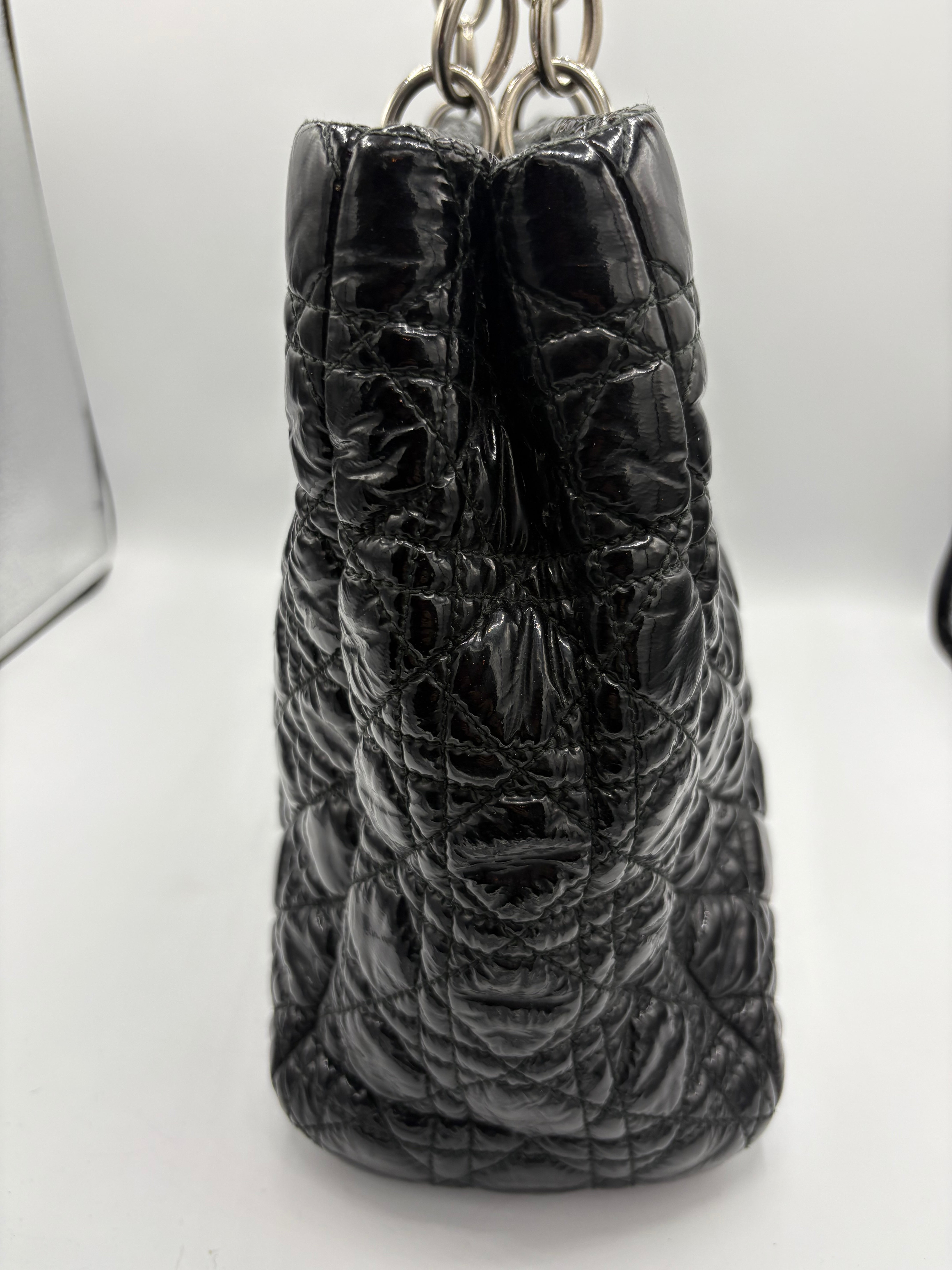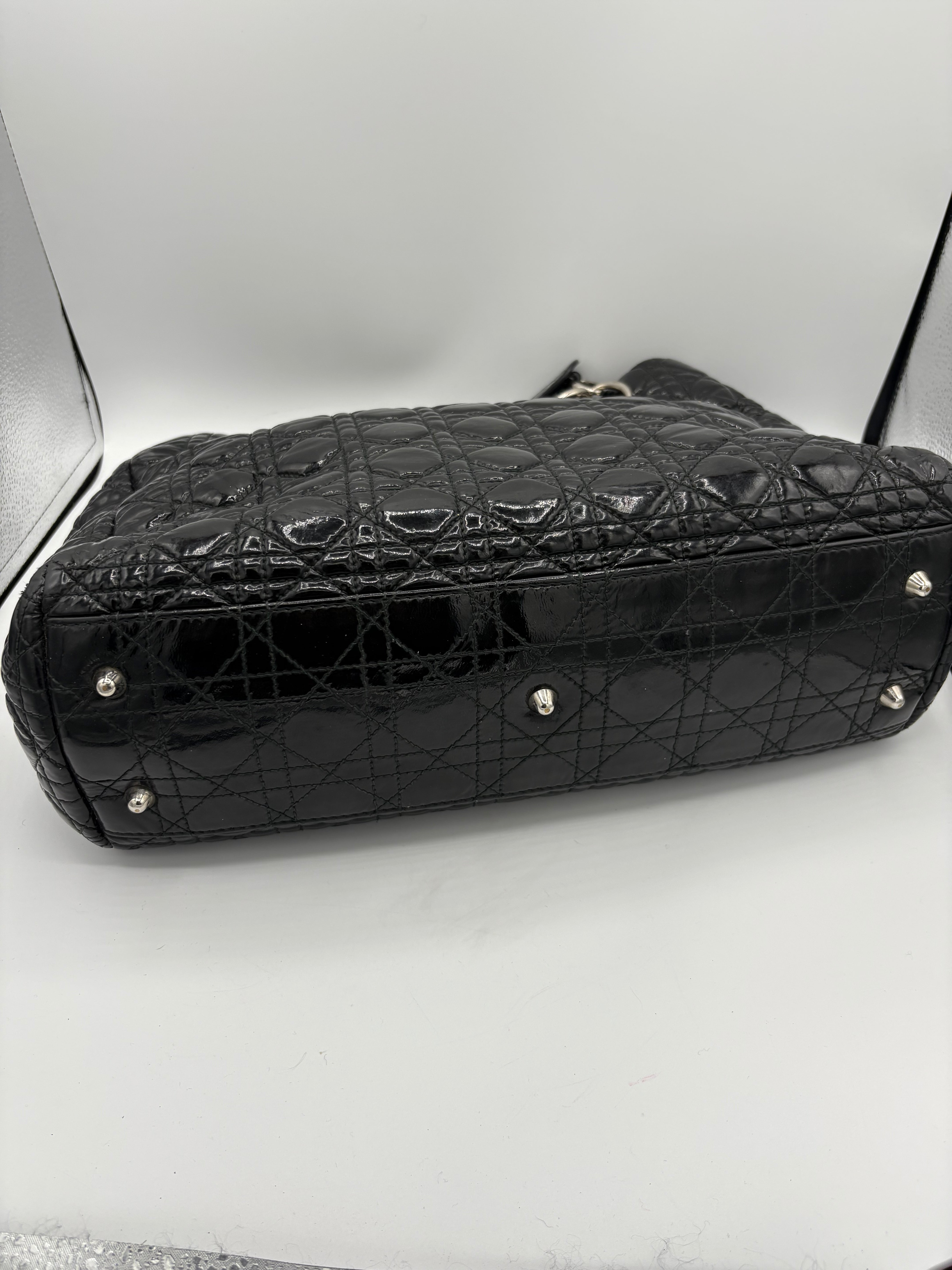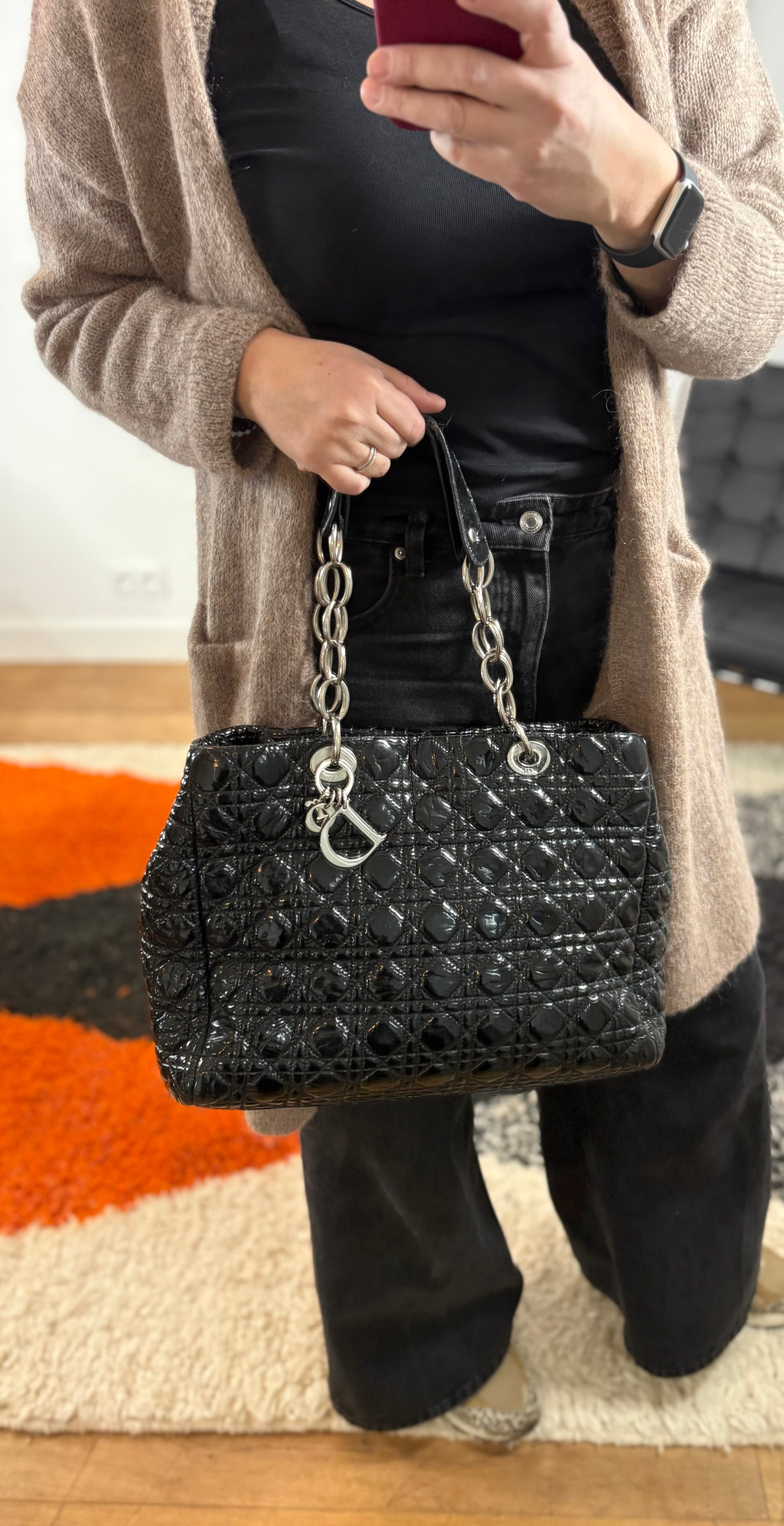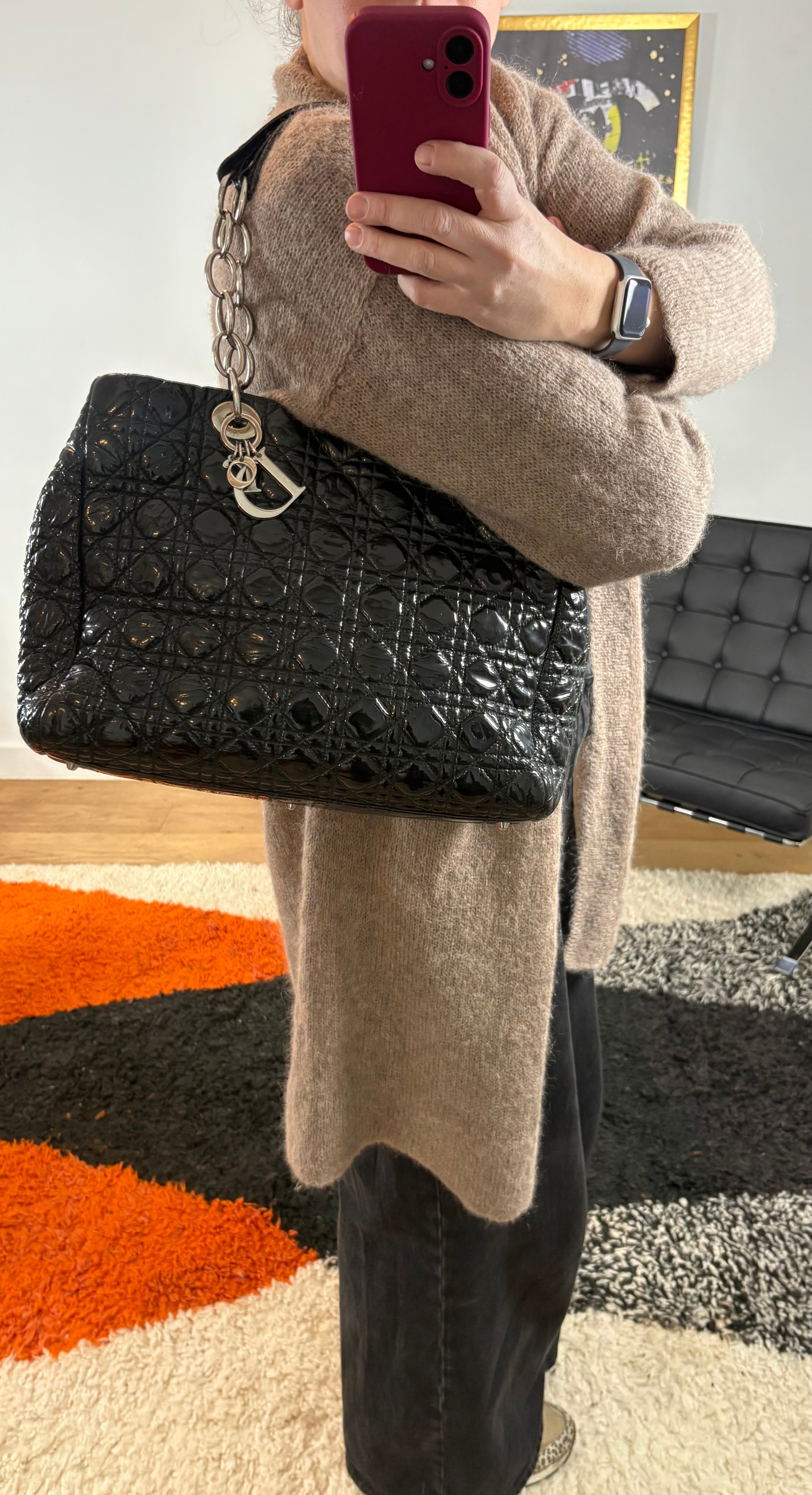 Ce sac Lady Dior Soft de chez Dior en cuir de veau noir vernis et bijouterie argent, est en très bon état.
