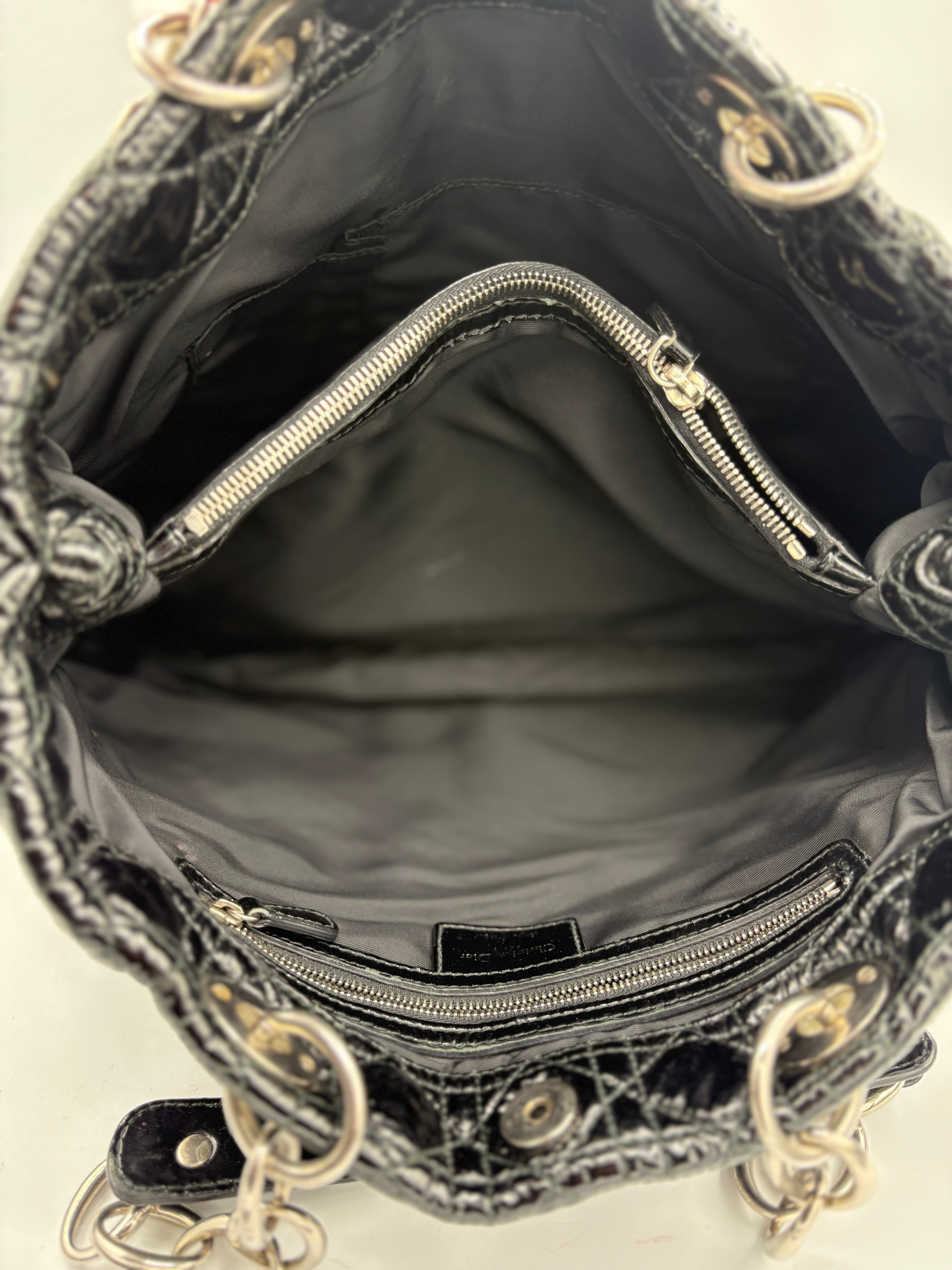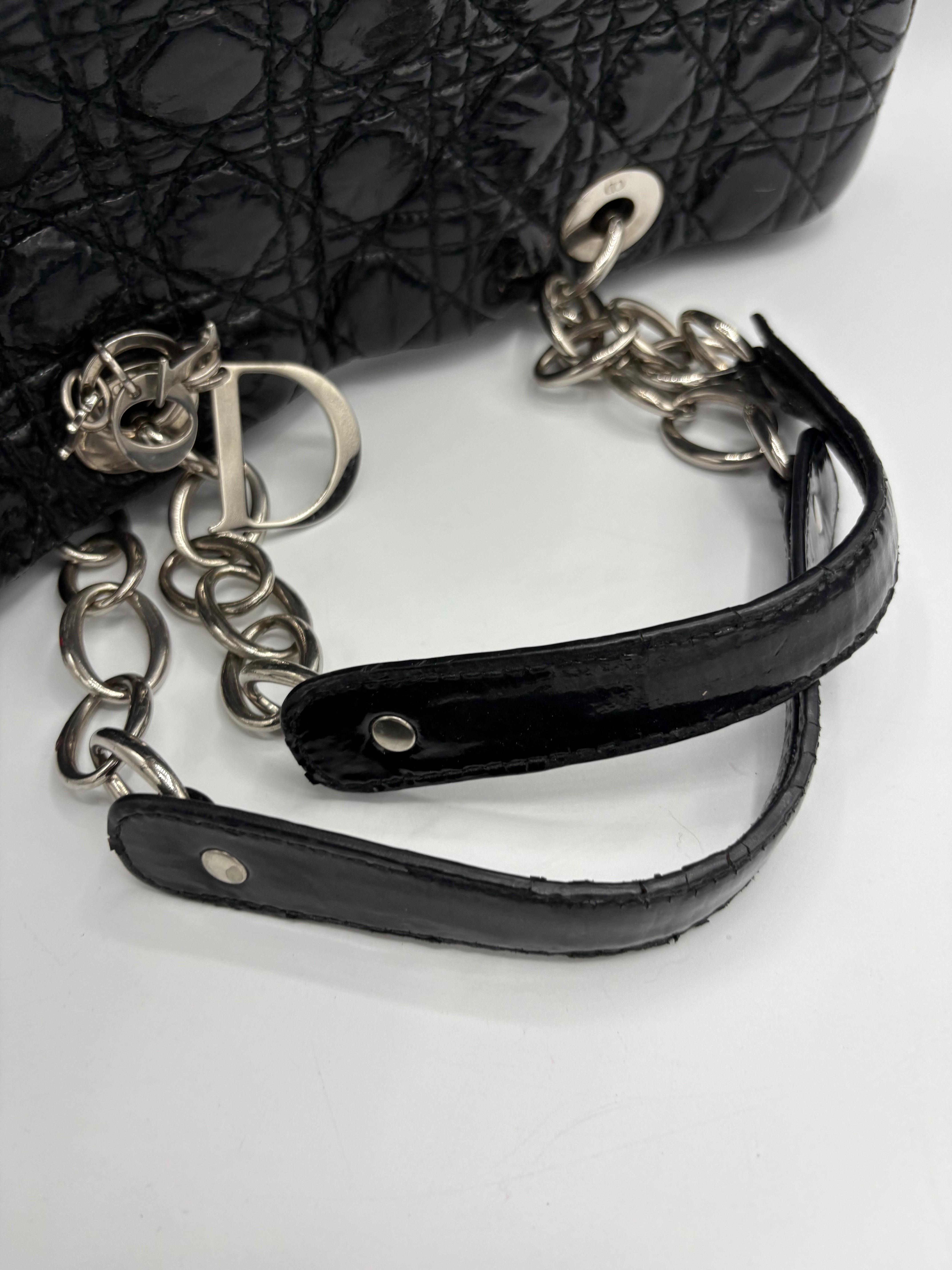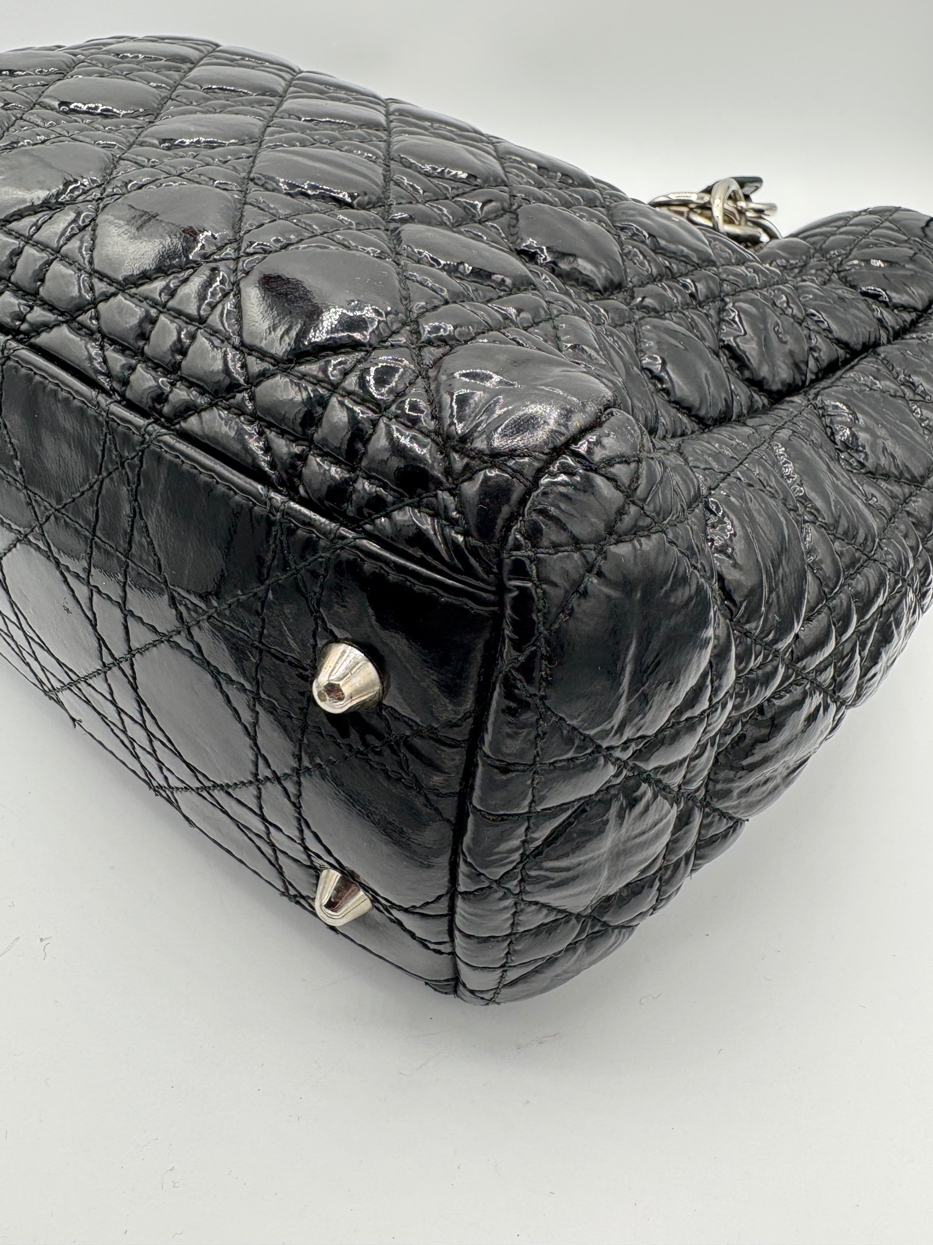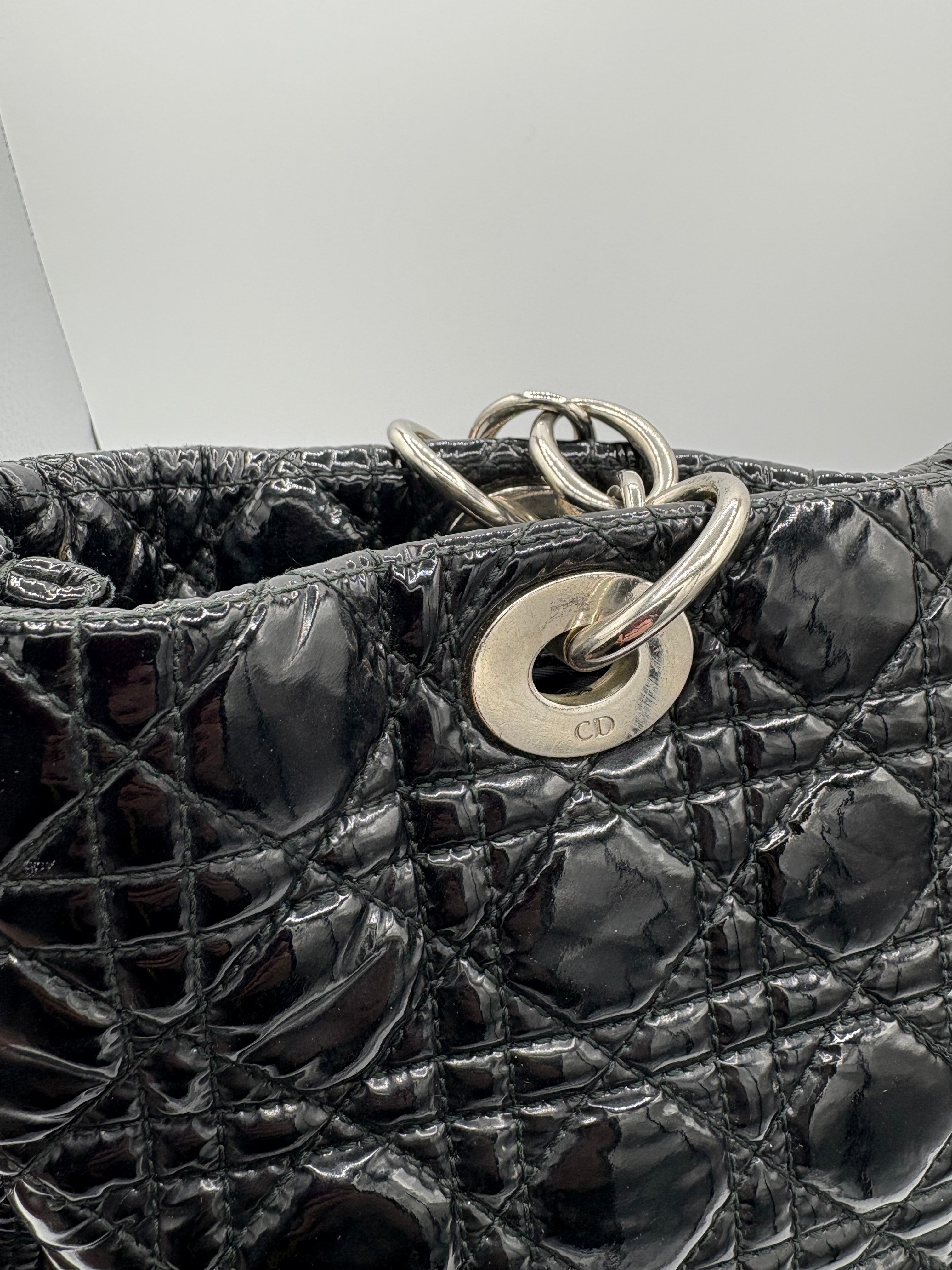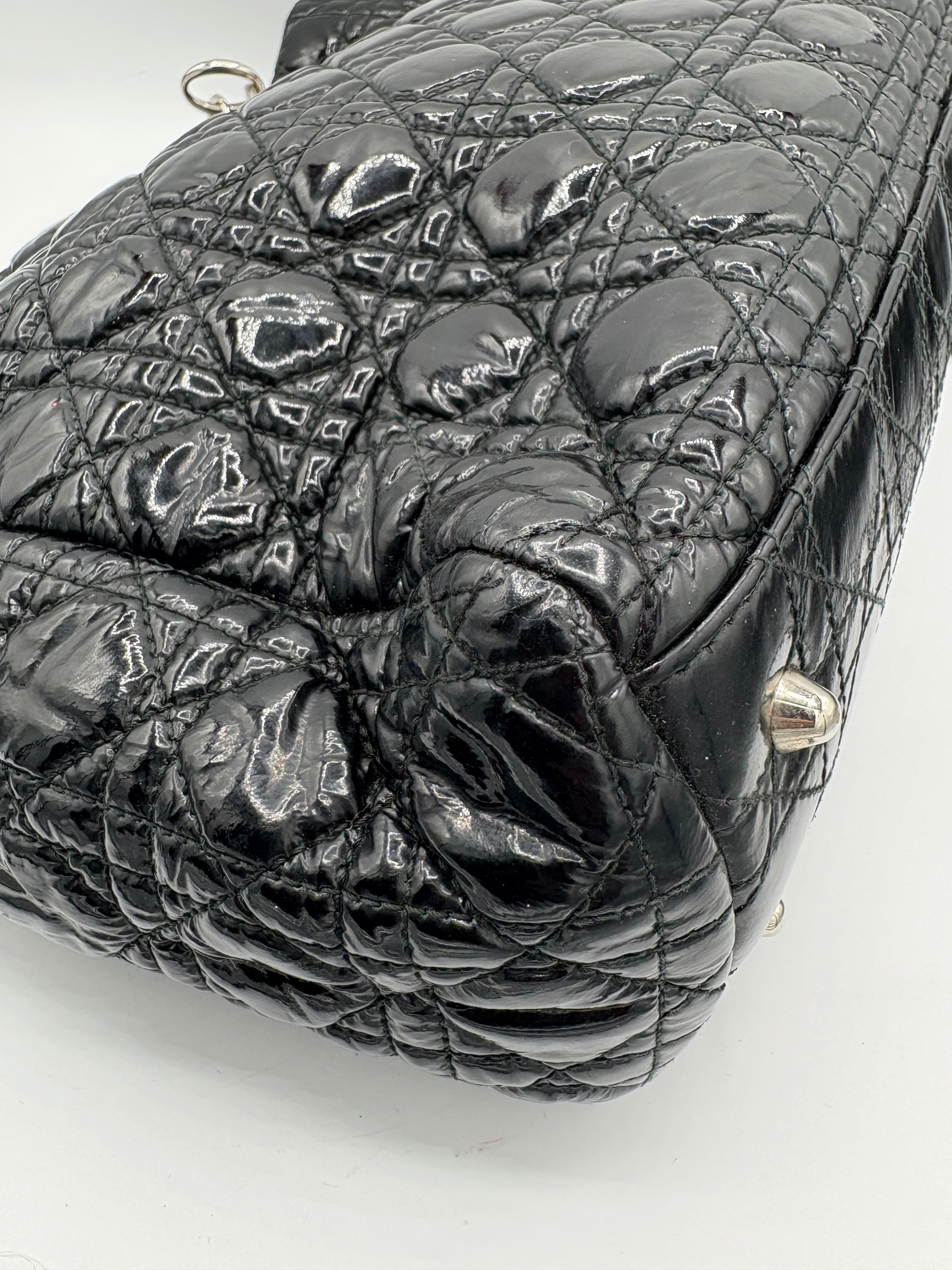 Ce sac Lady Dior Soft de chez Dior en cuir de veau noir vernis et bijouterie argent, est en très bon état.