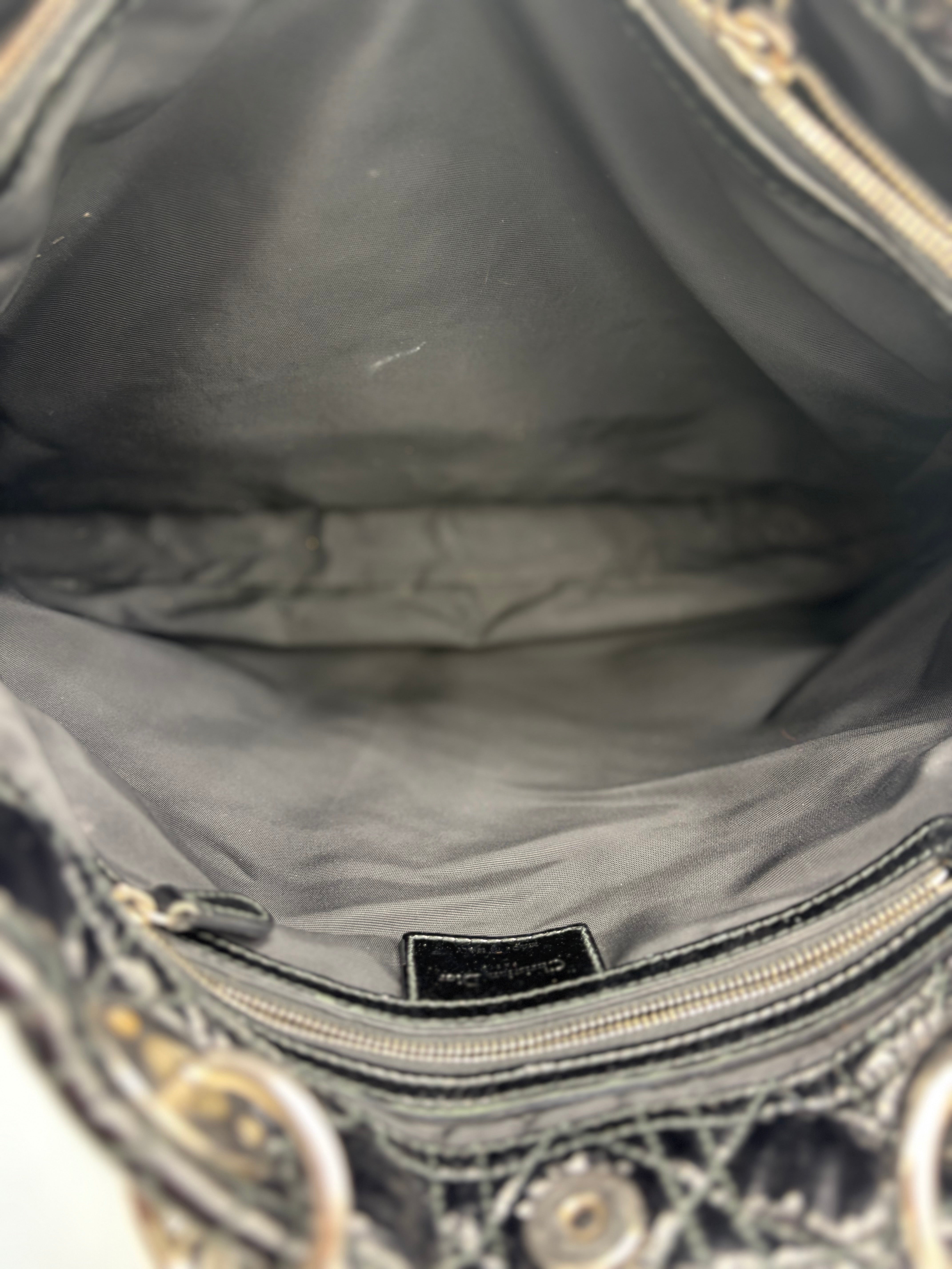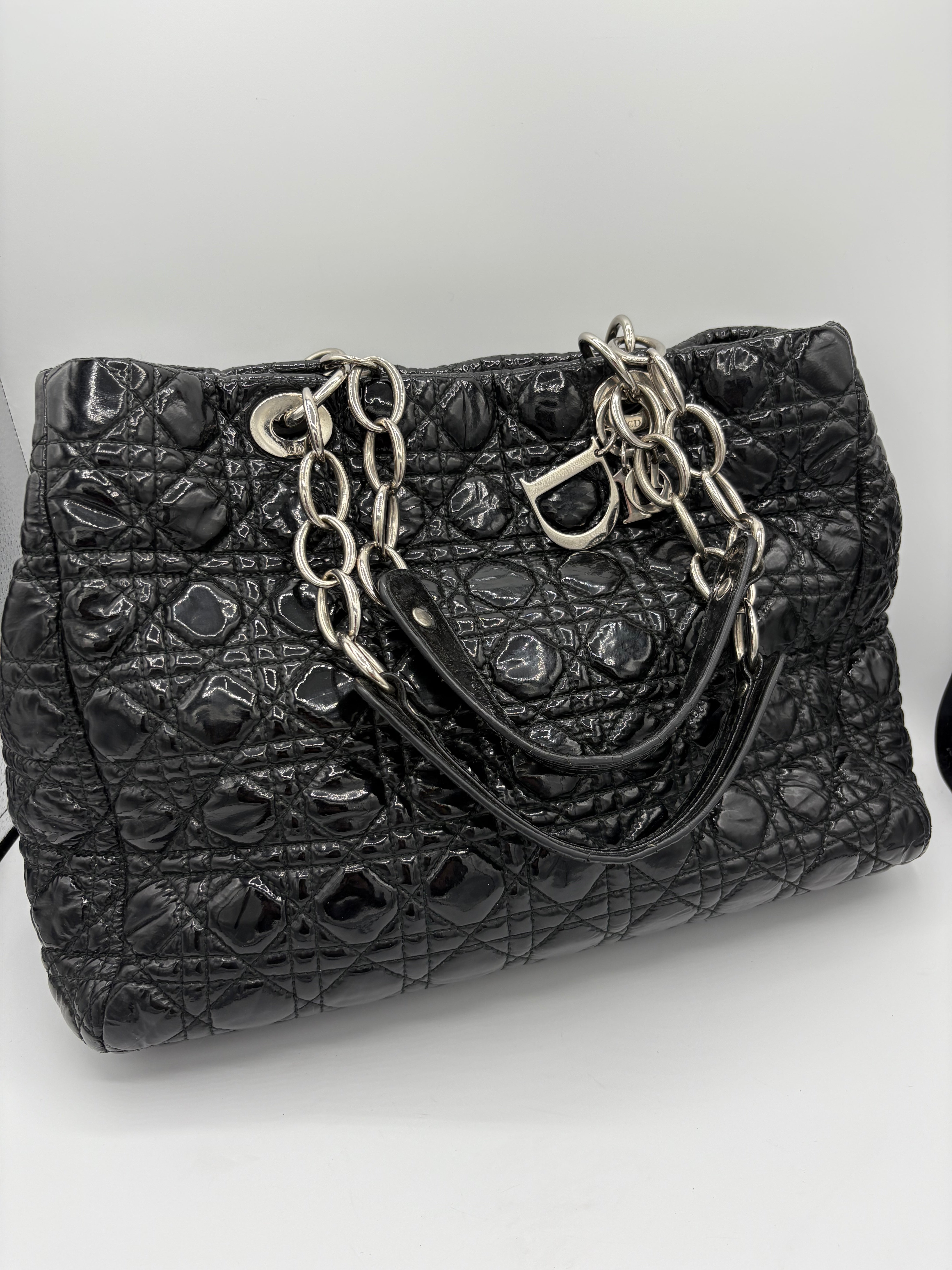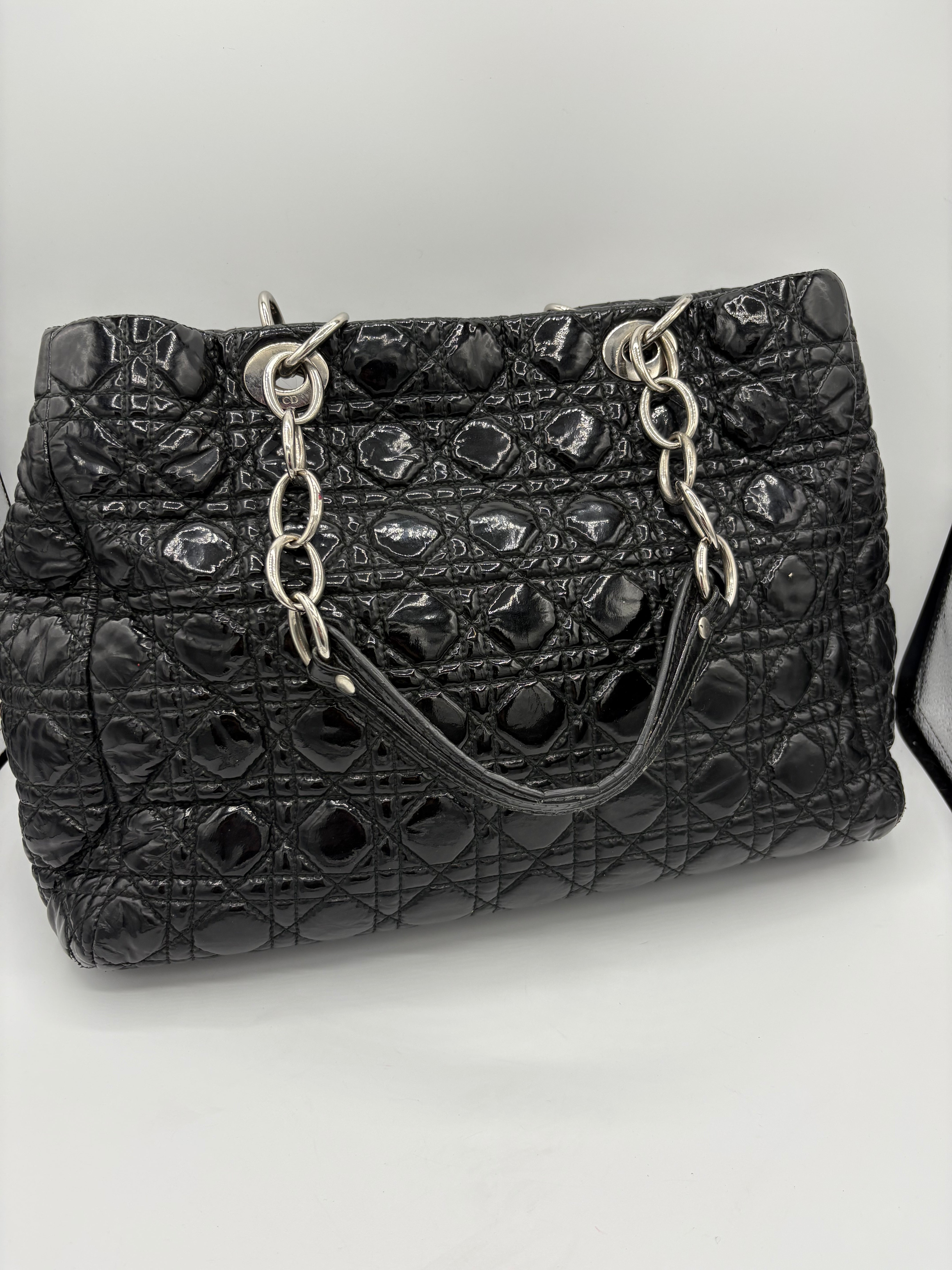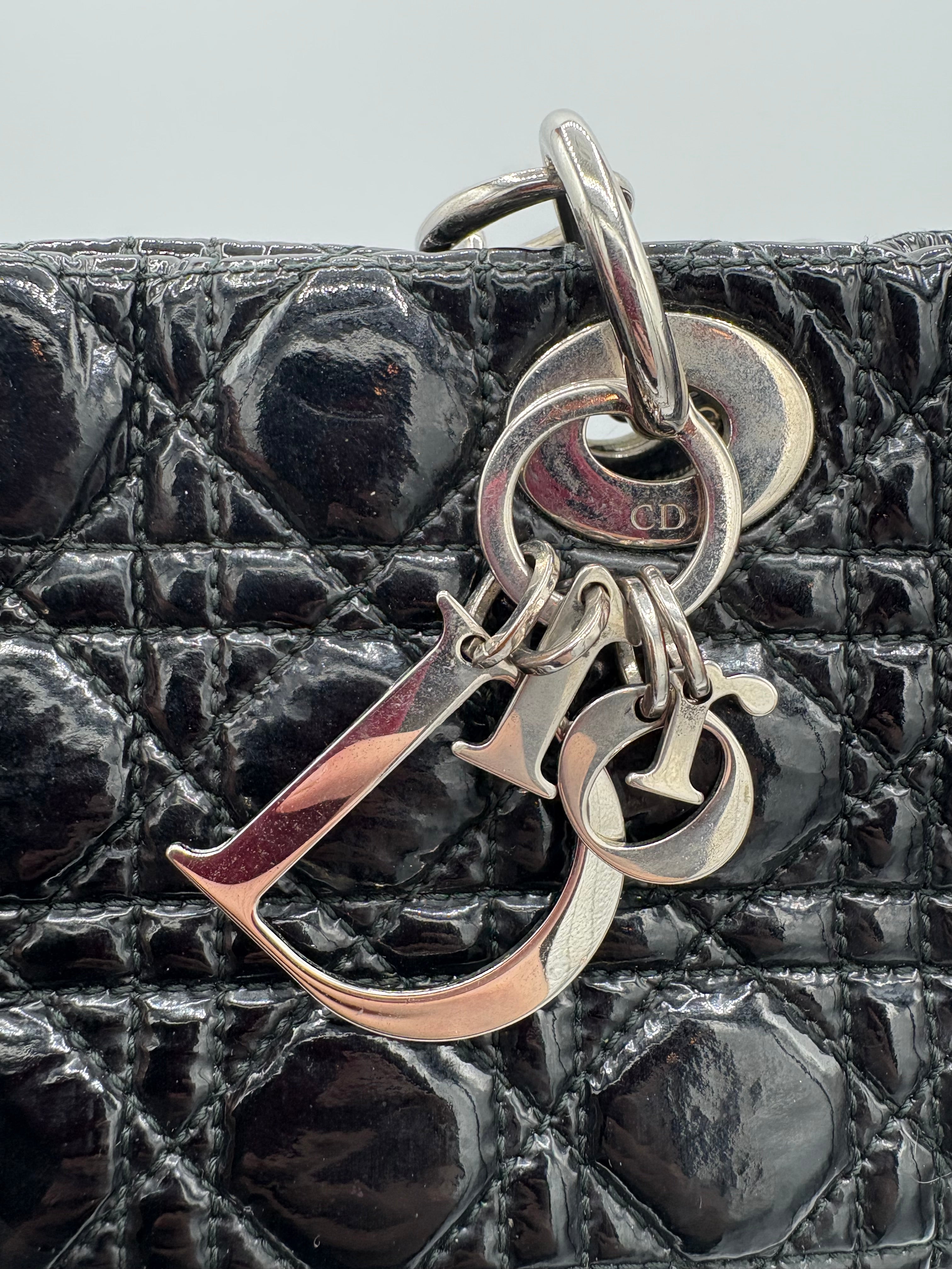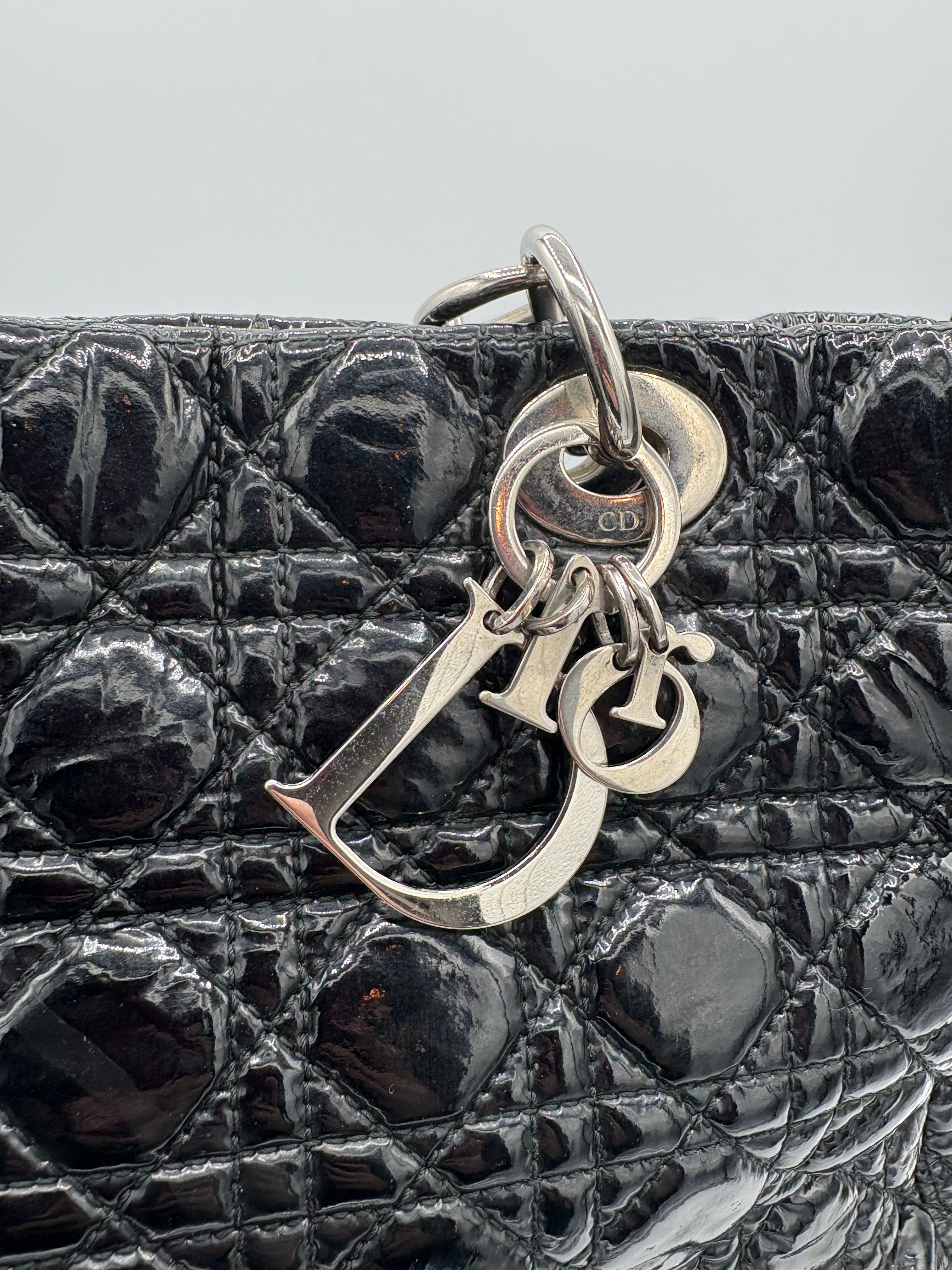 Ce sac Lady Dior Soft de chez Dior en cuir de veau noir vernis et bijouterie argent, est en très bon état.