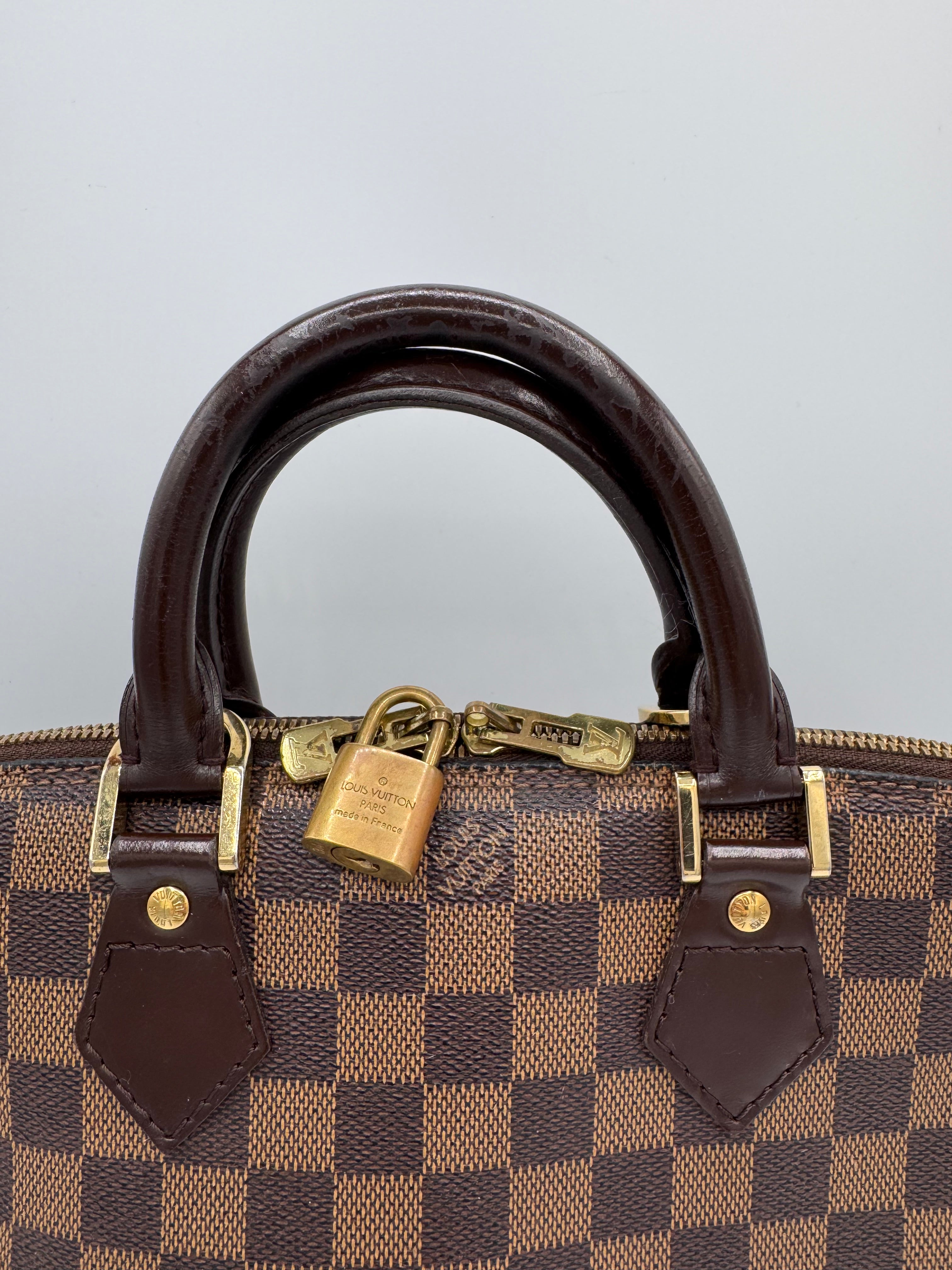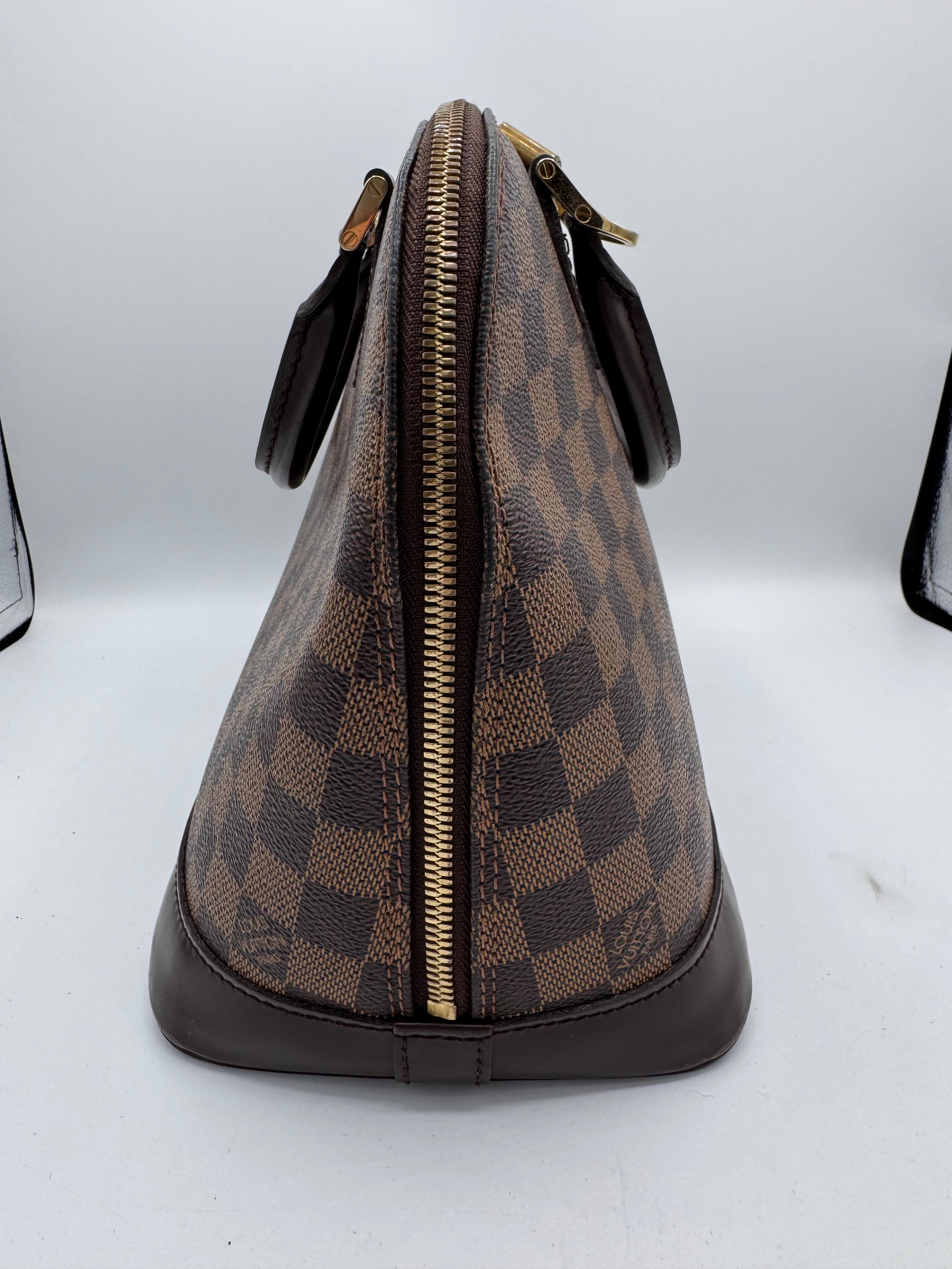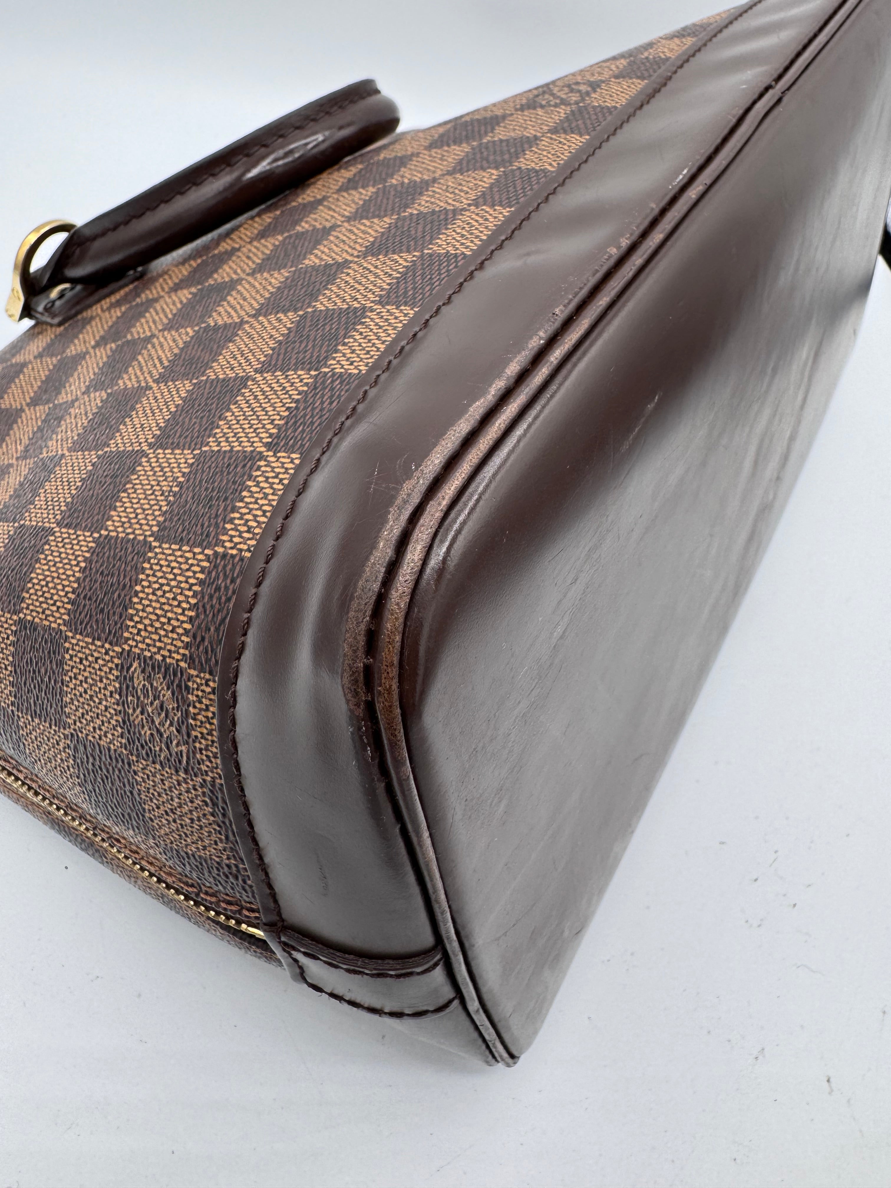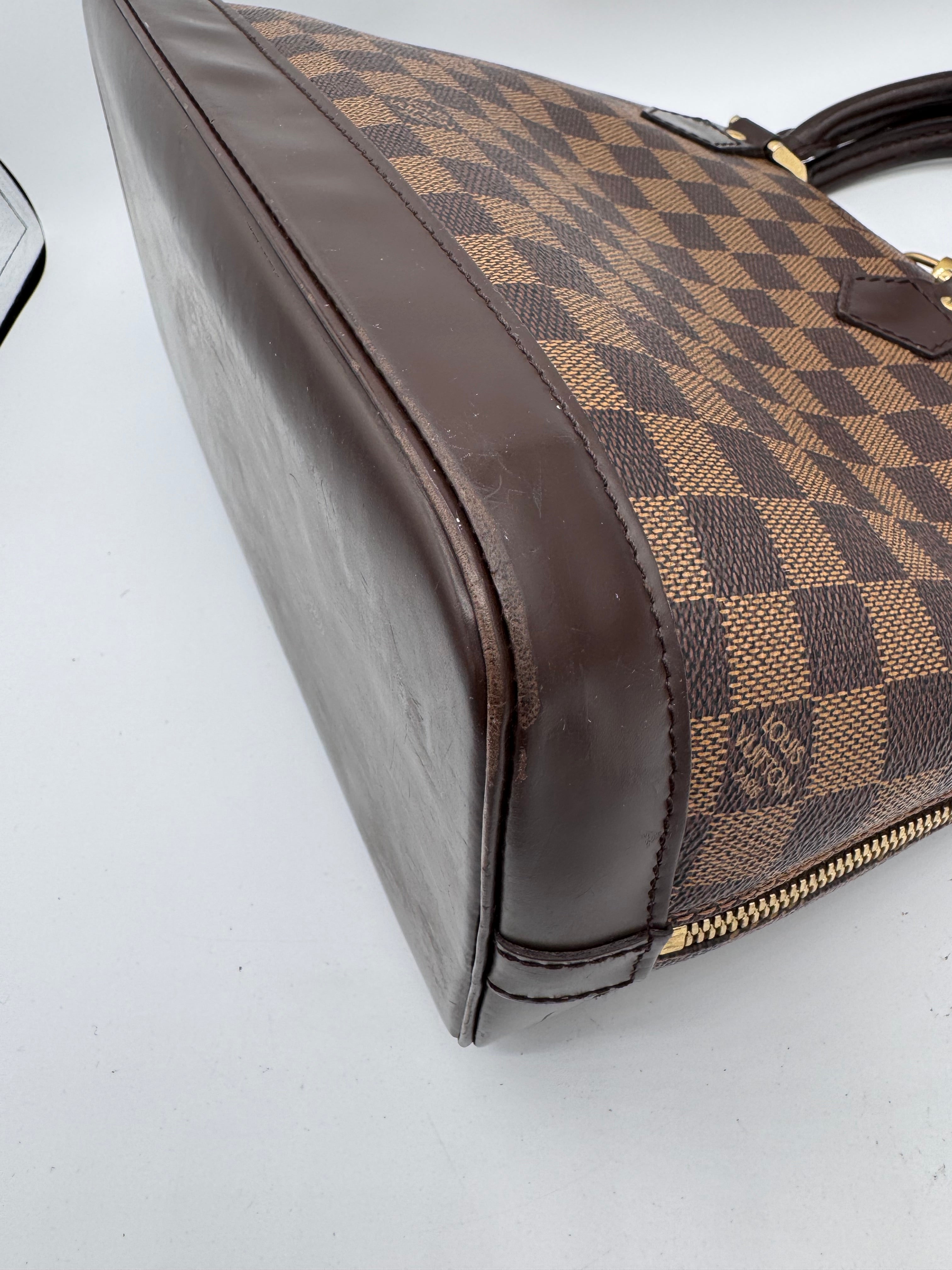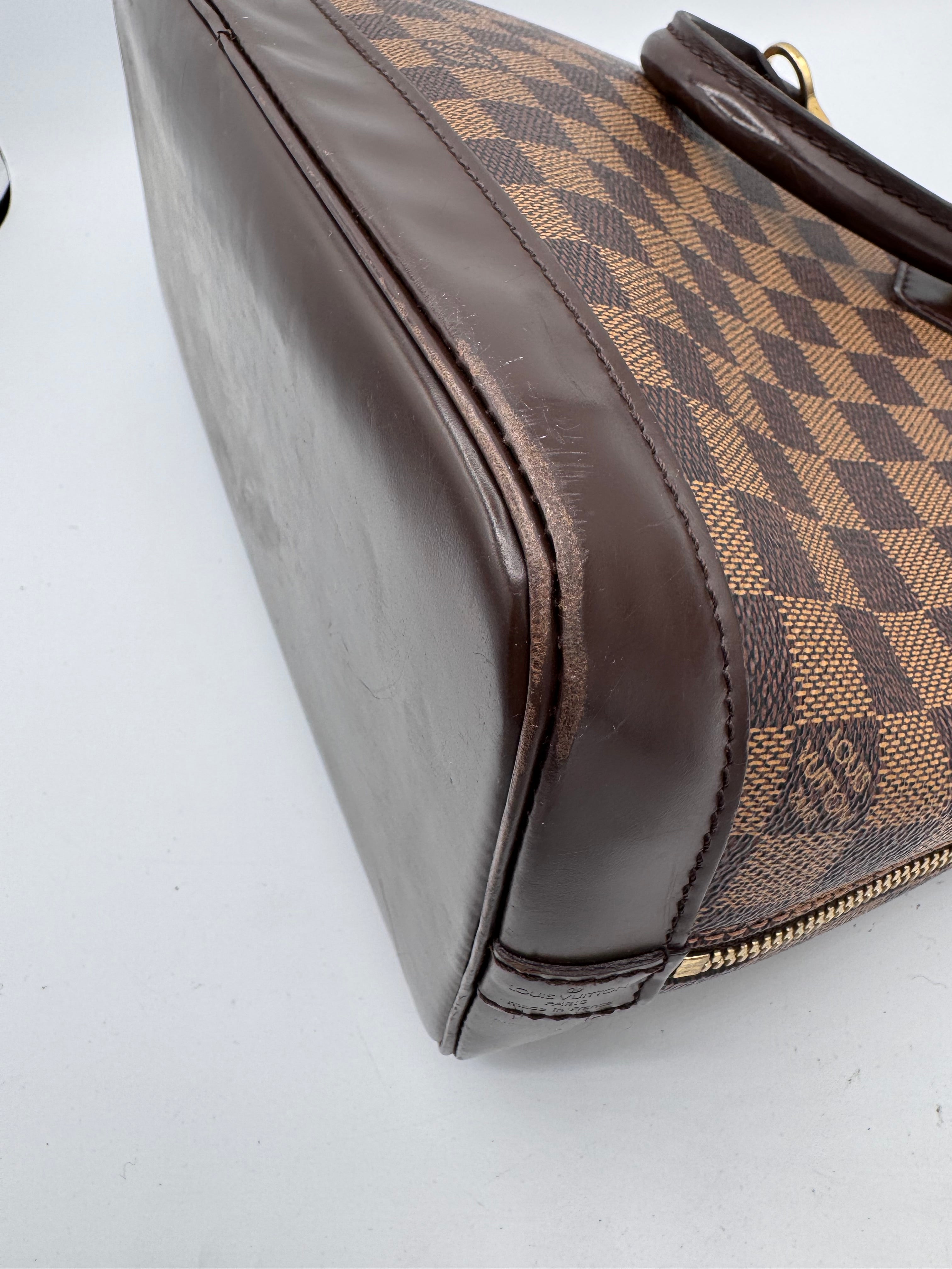 traces sur les angles et le socle en cuir visibles en photos, qui pourront facilement être rénovés soit par un professionnel soit par vos propre moyens avec du colorant pour cuir marron foncé.