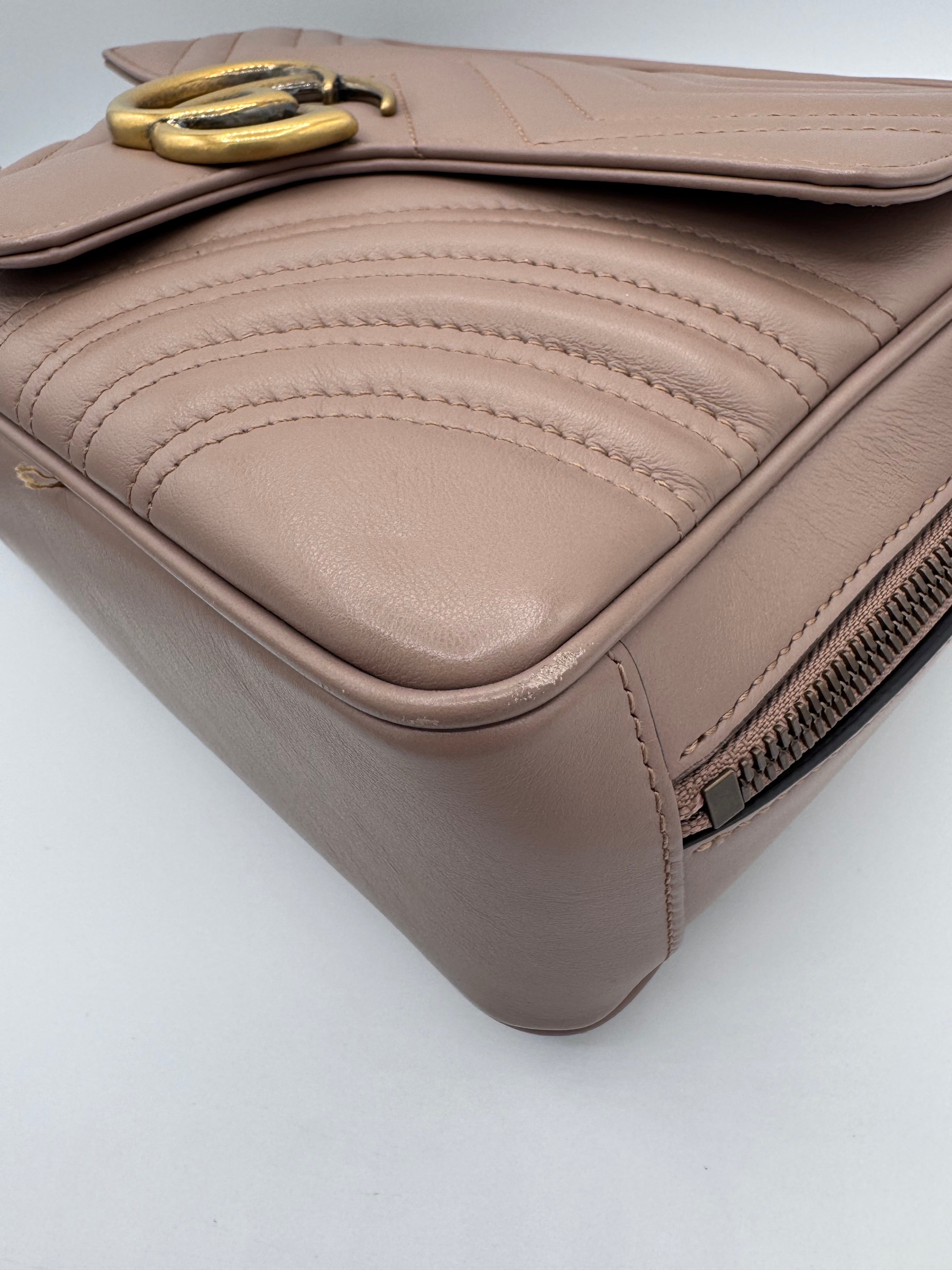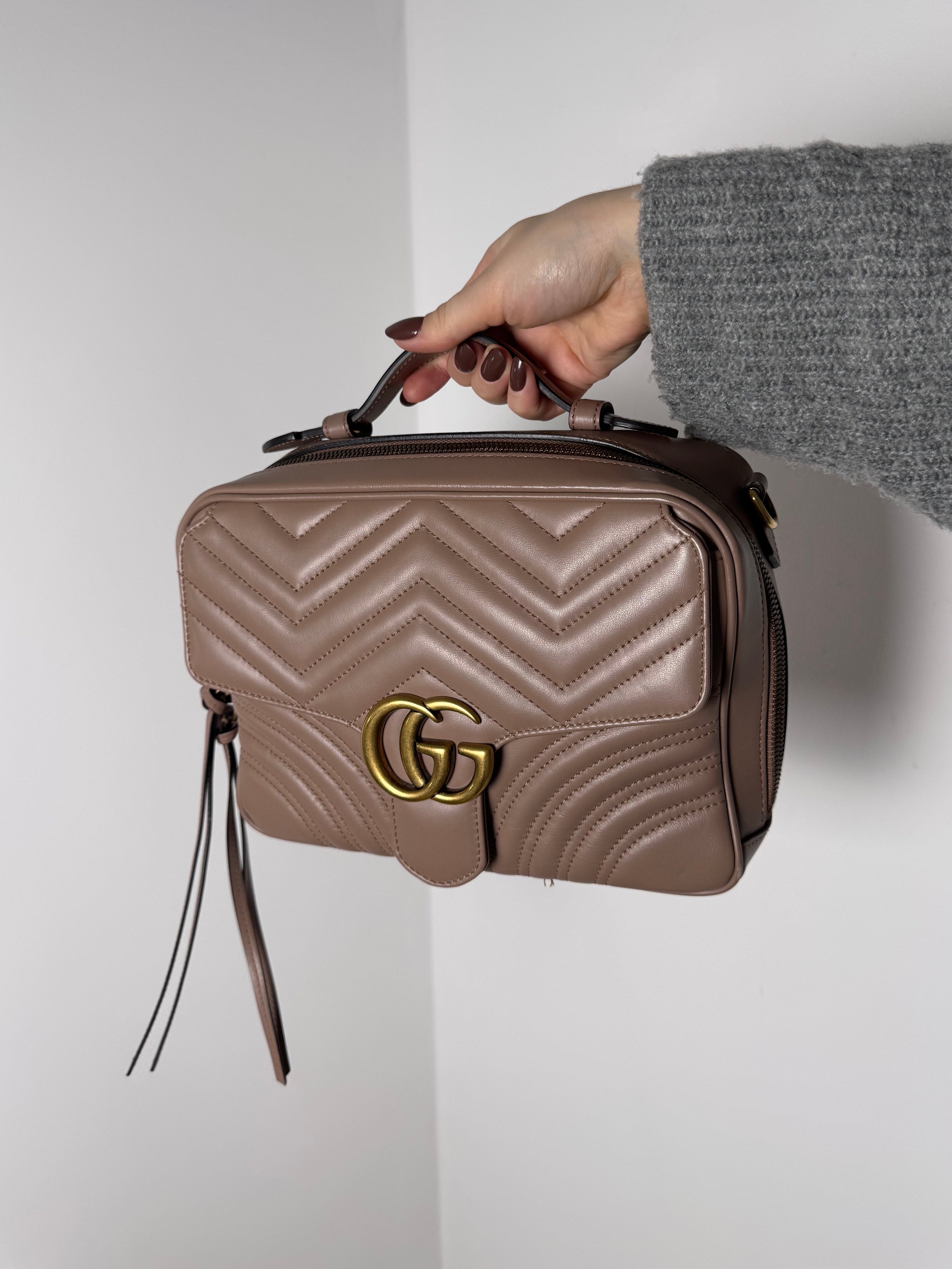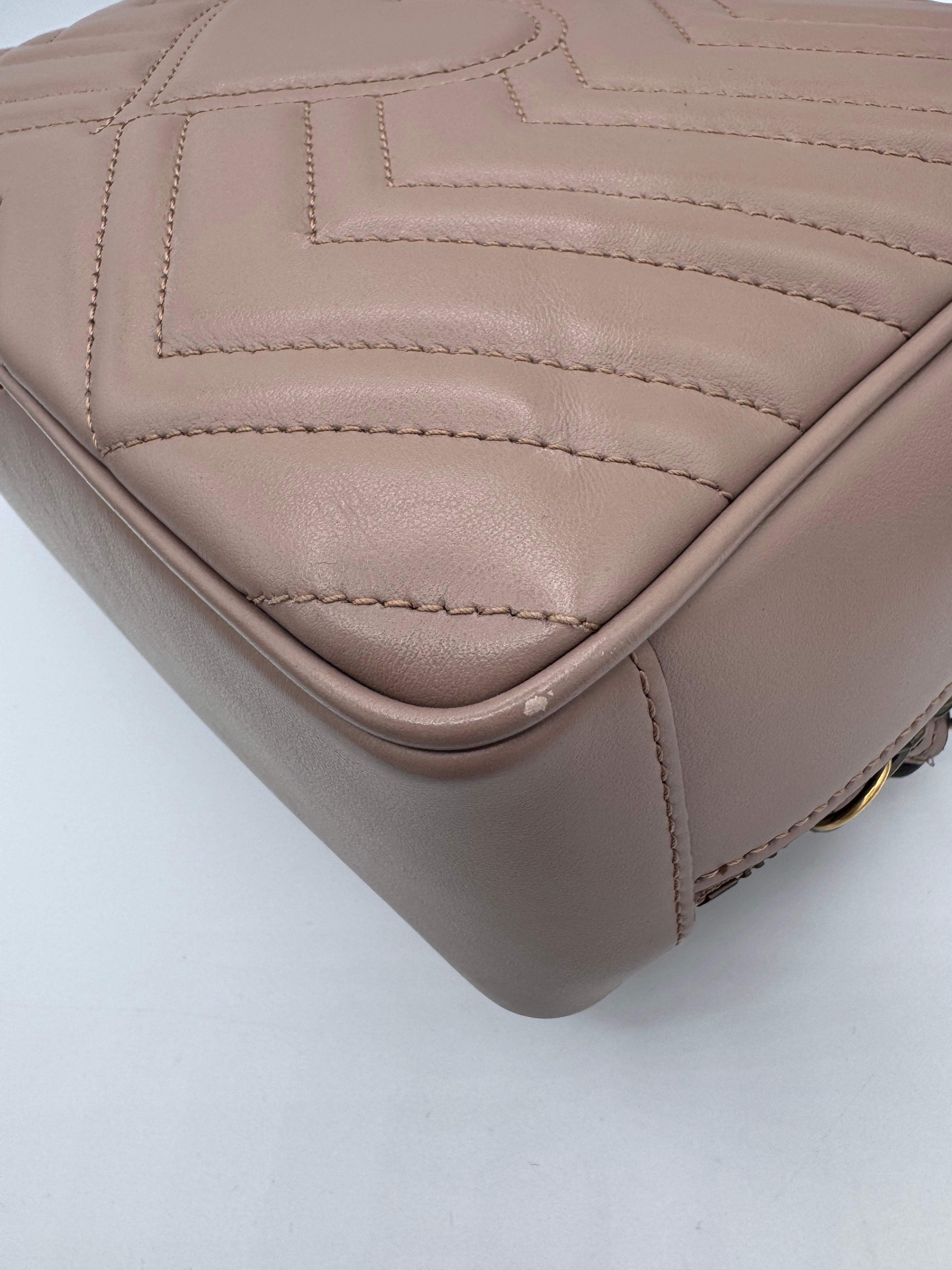 Sac GG Marmont Gucci, en cuir de veau taupe, en état excellent.