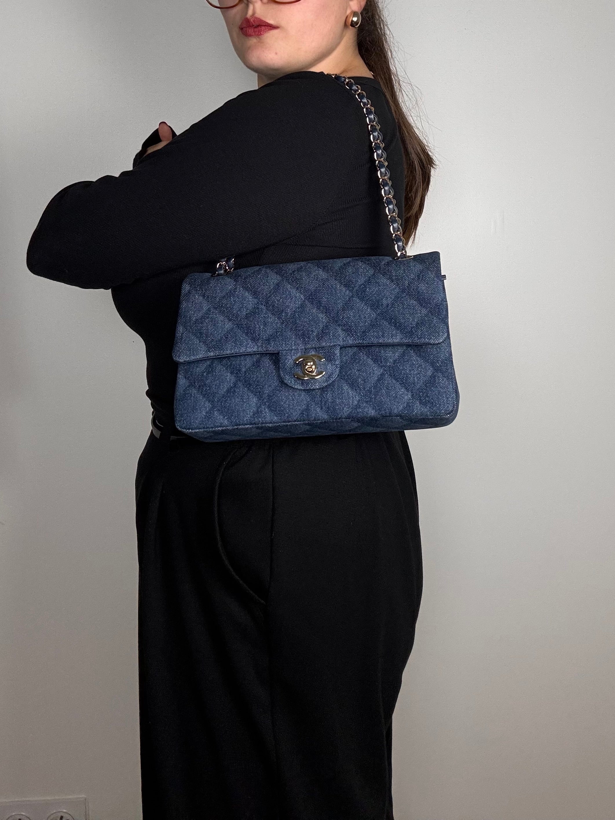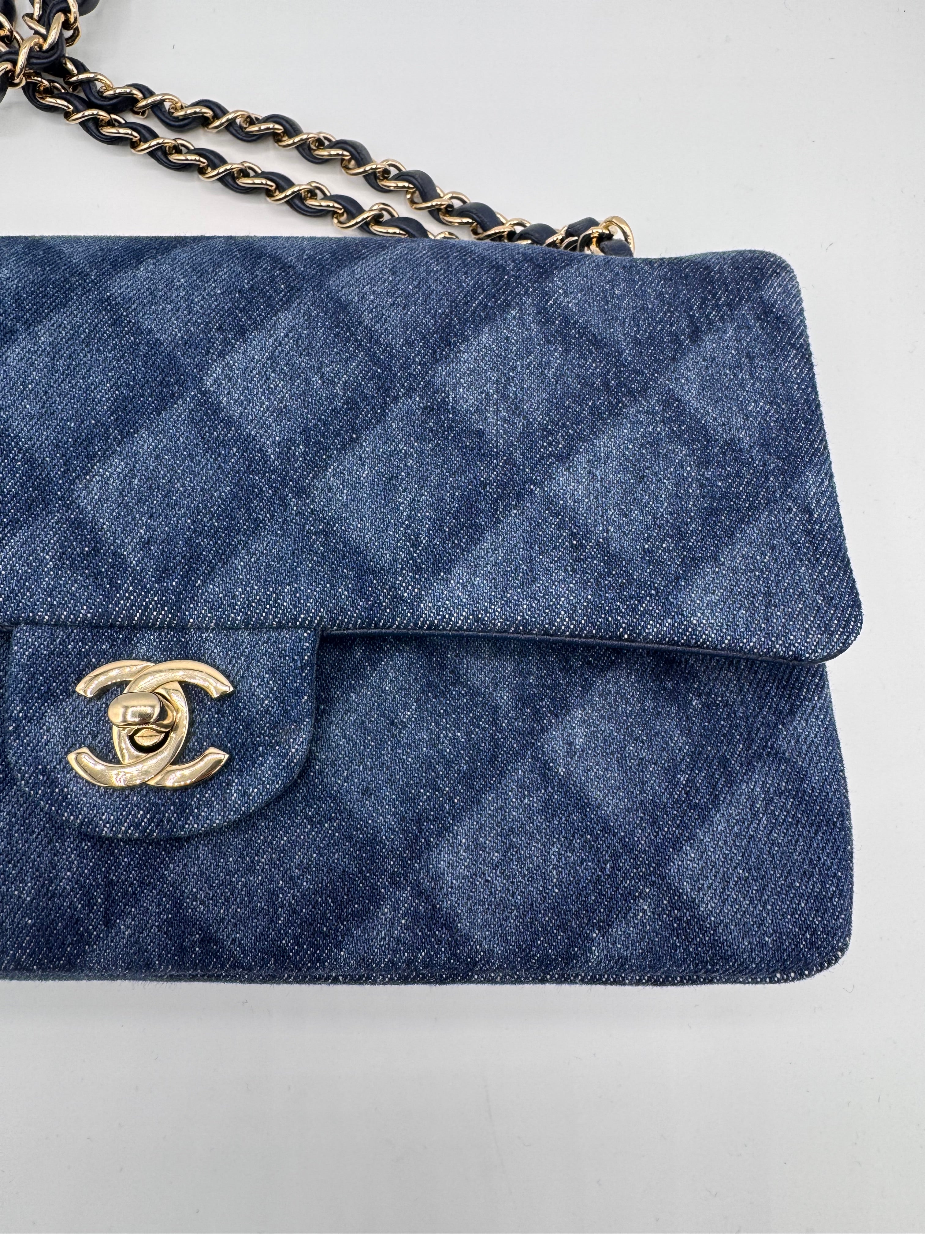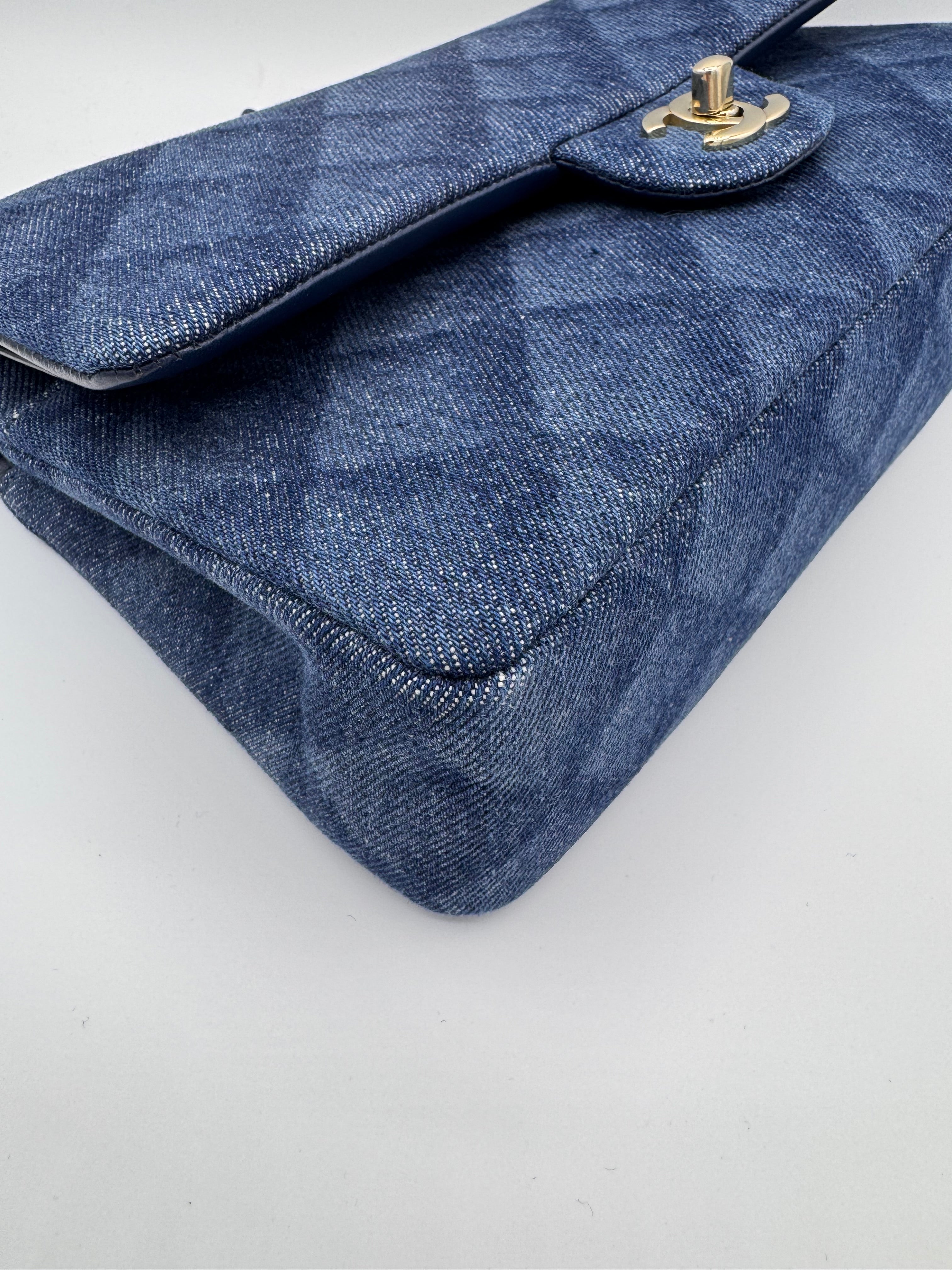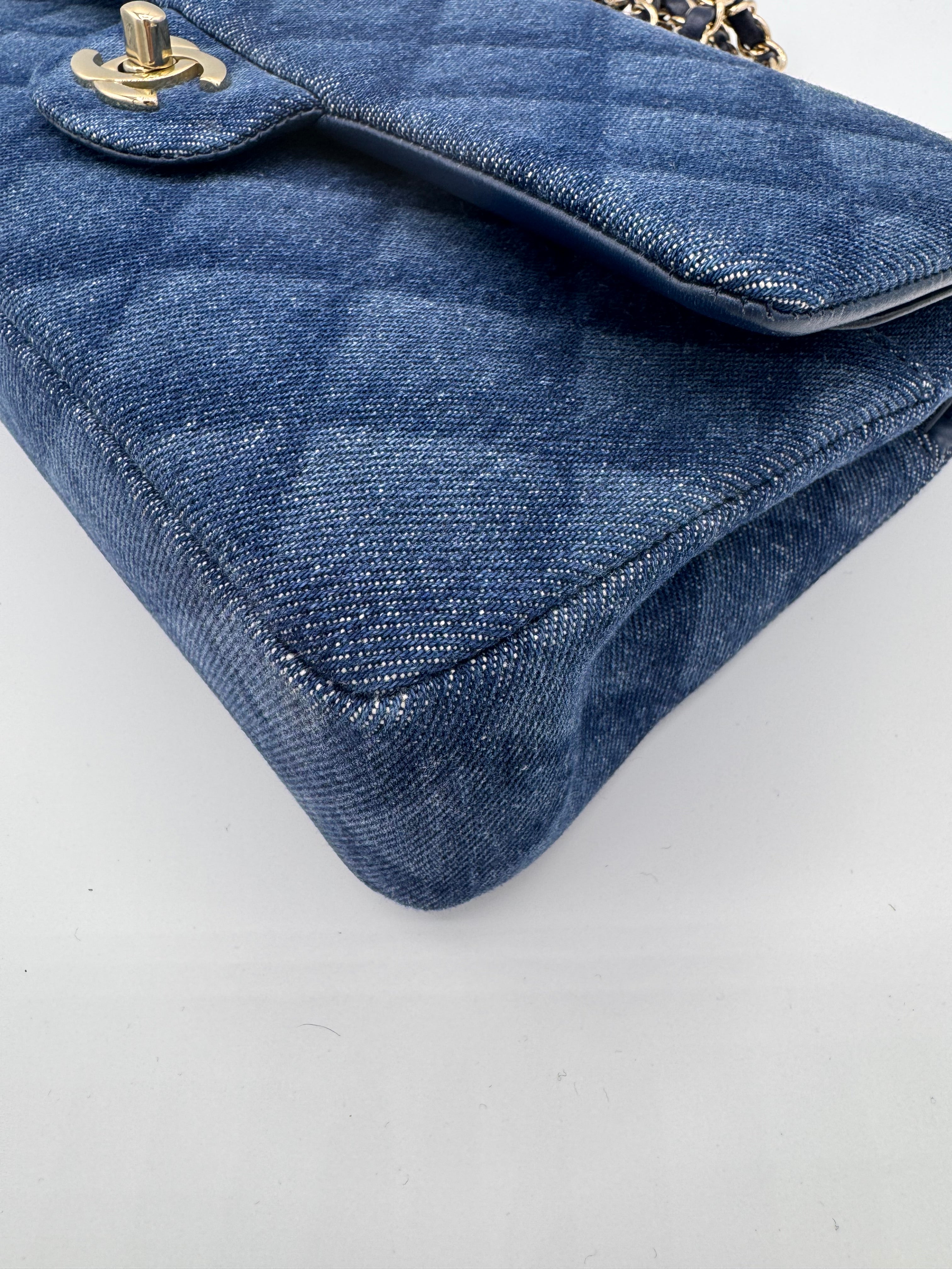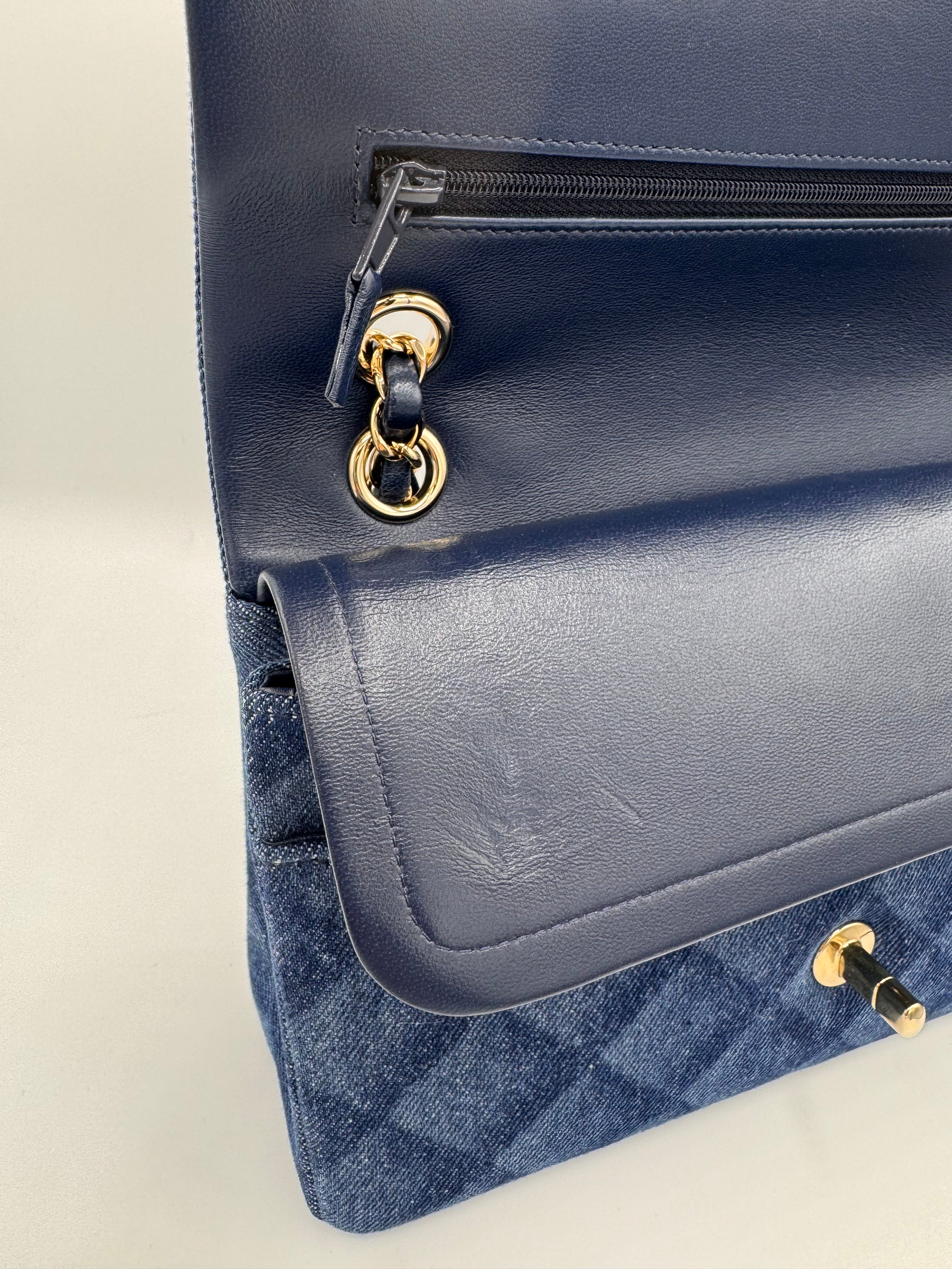 Ce Sac Timeless Classique double rabat de chez Chanel, en tissu bleu jean, cuir d'agneau bleu et bijouterie champagne est en excellent état.
