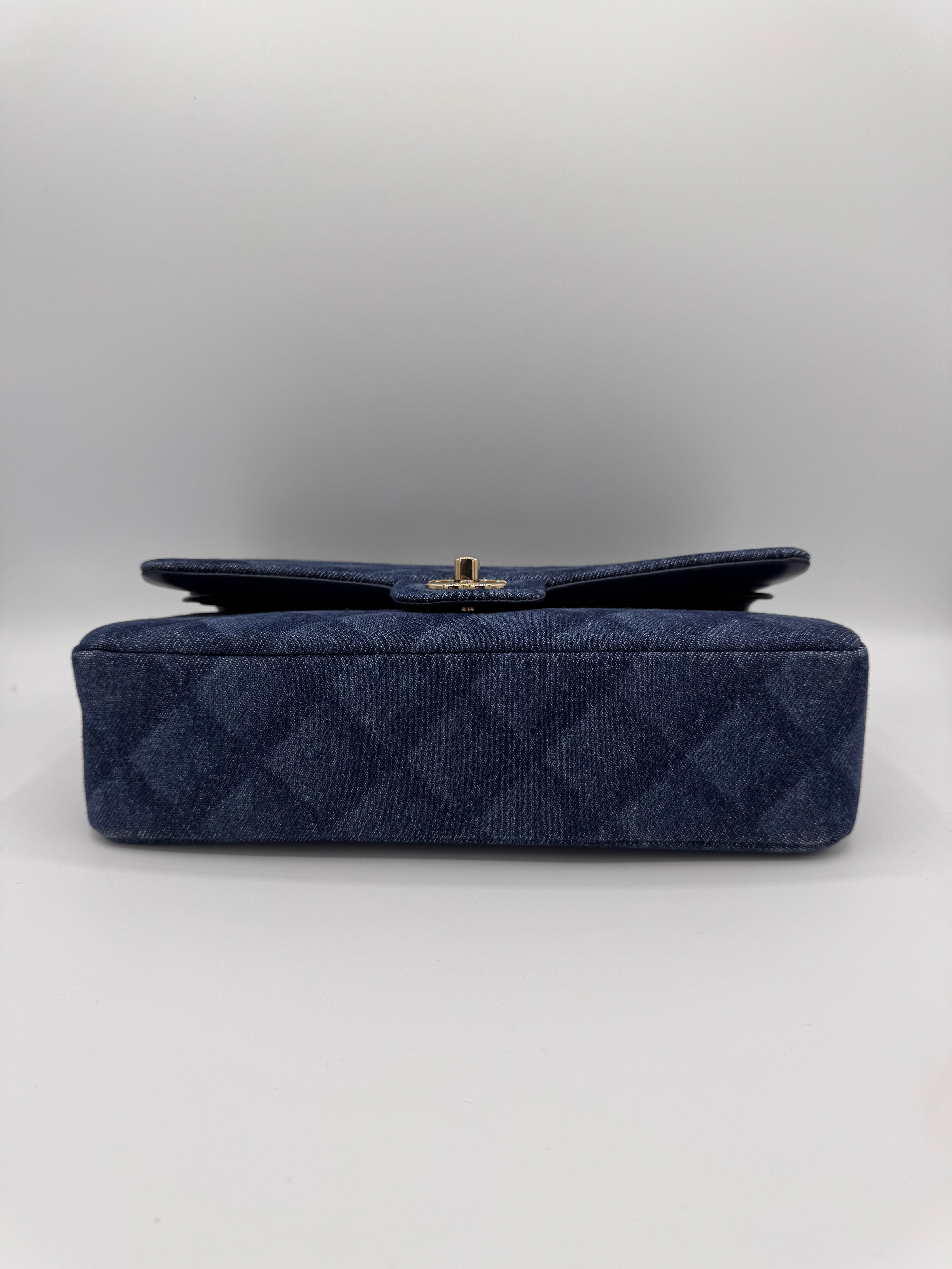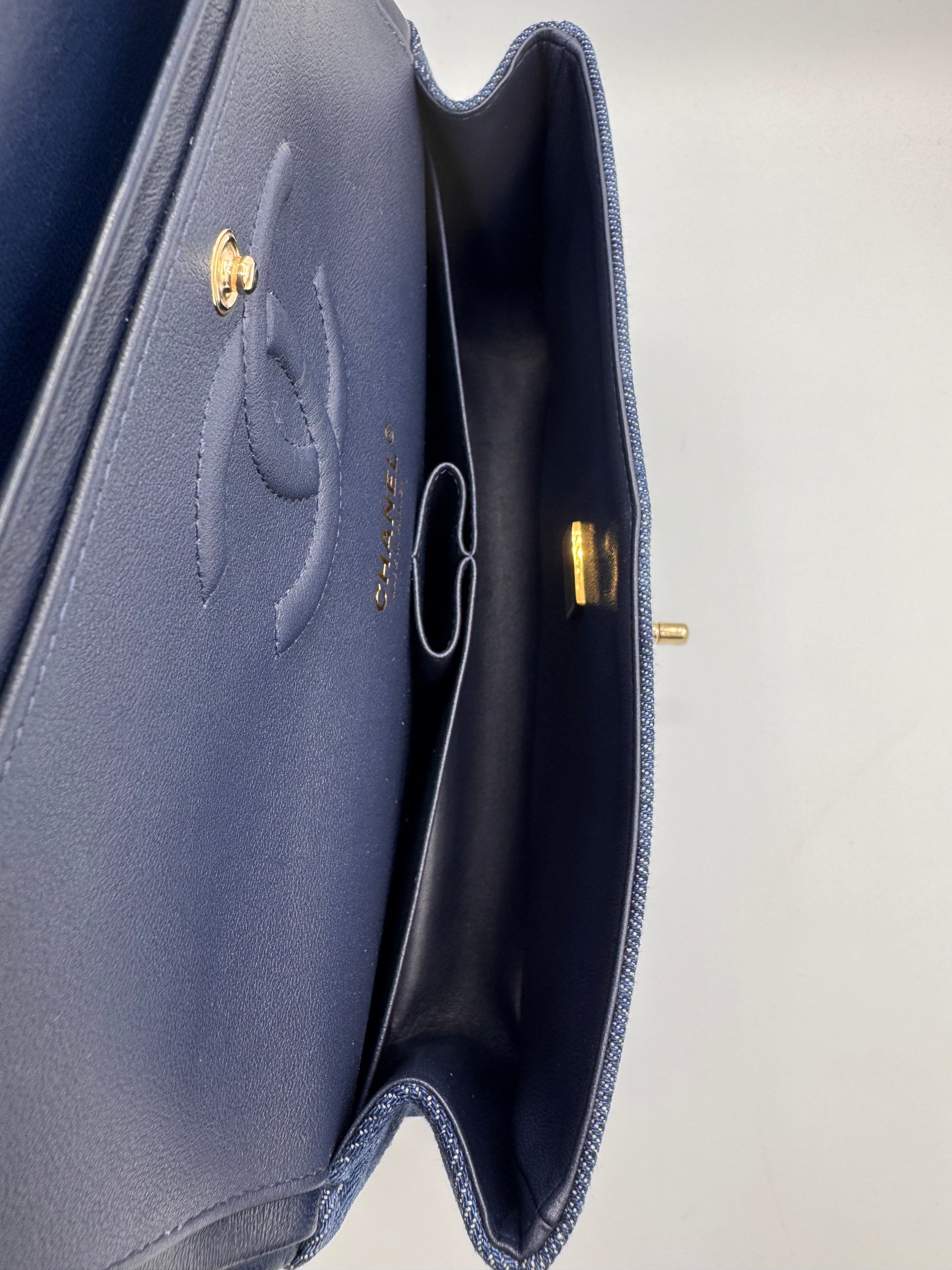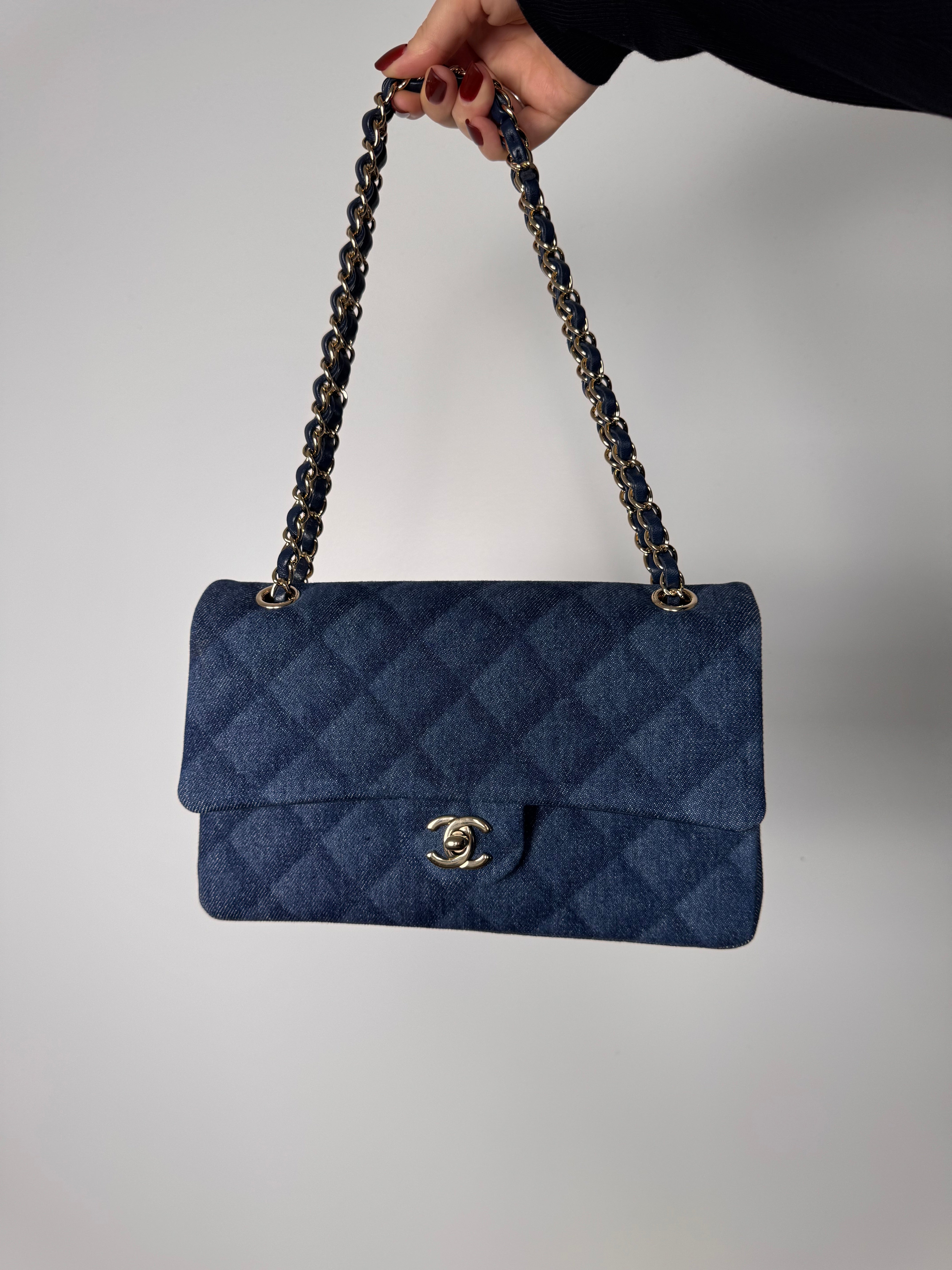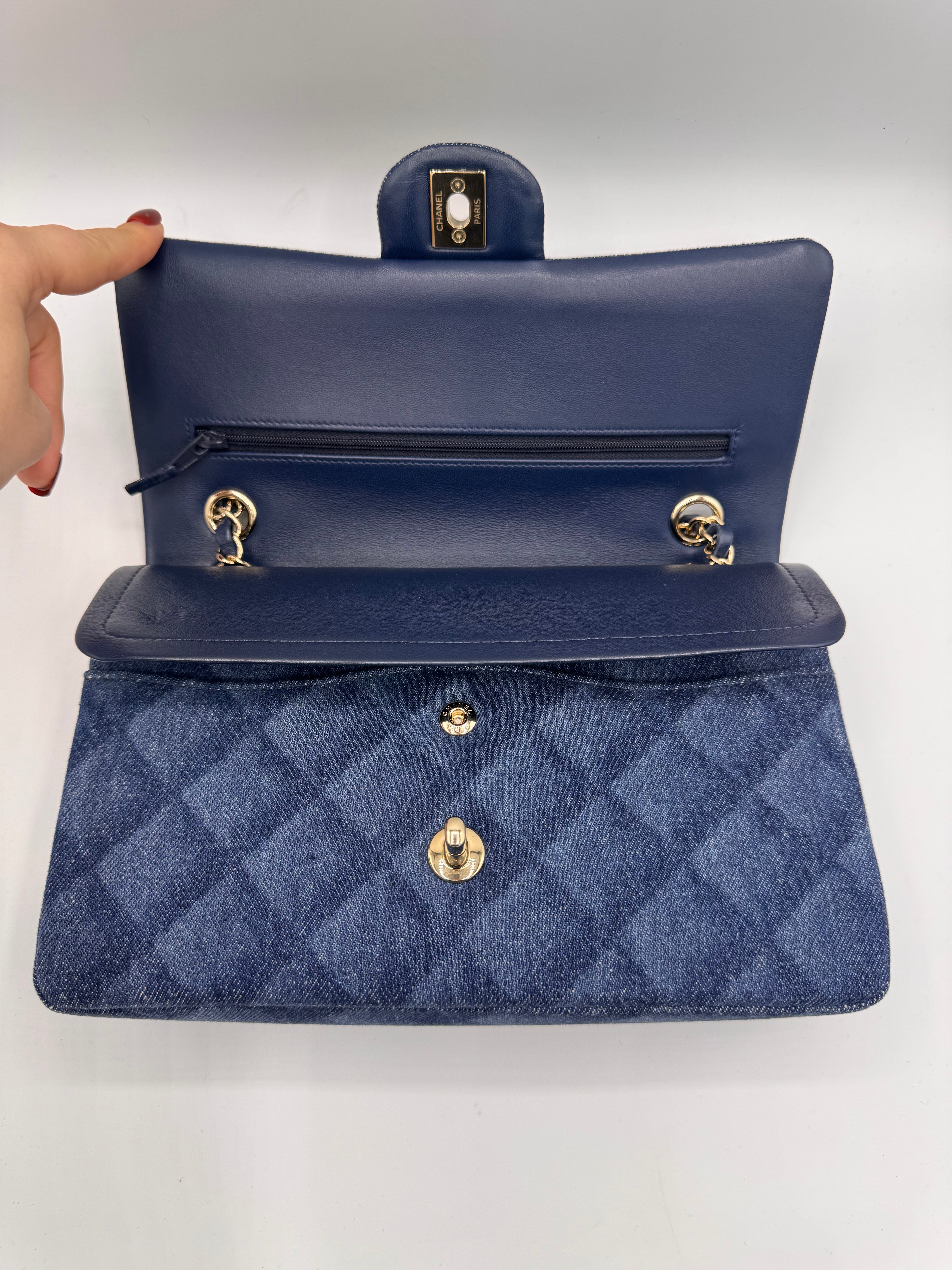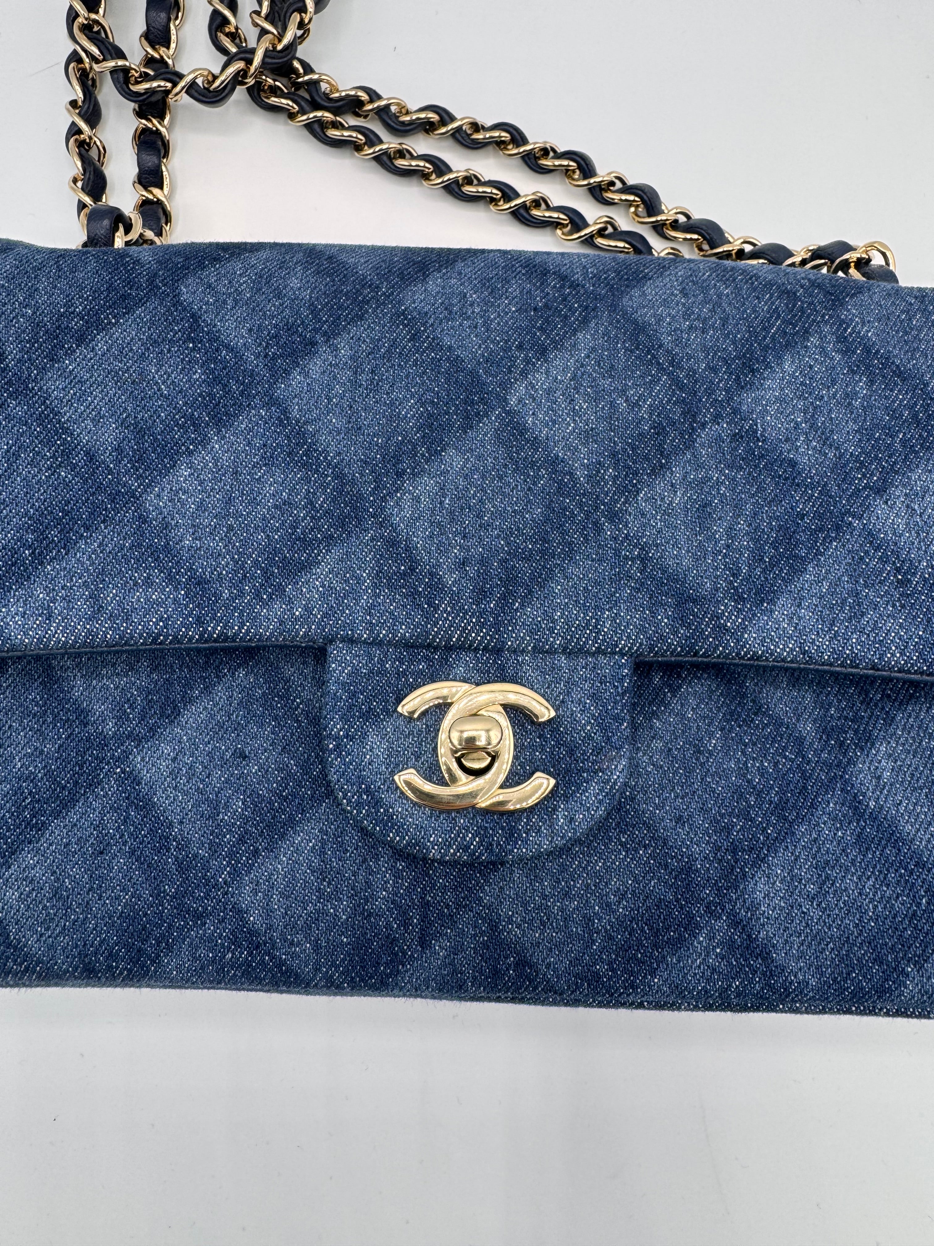 Ce Sac Timeless Classique double rabat de chez Chanel, en tissu bleu jean, cuir d'agneau bleu et bijouterie champagne est en excellent état.