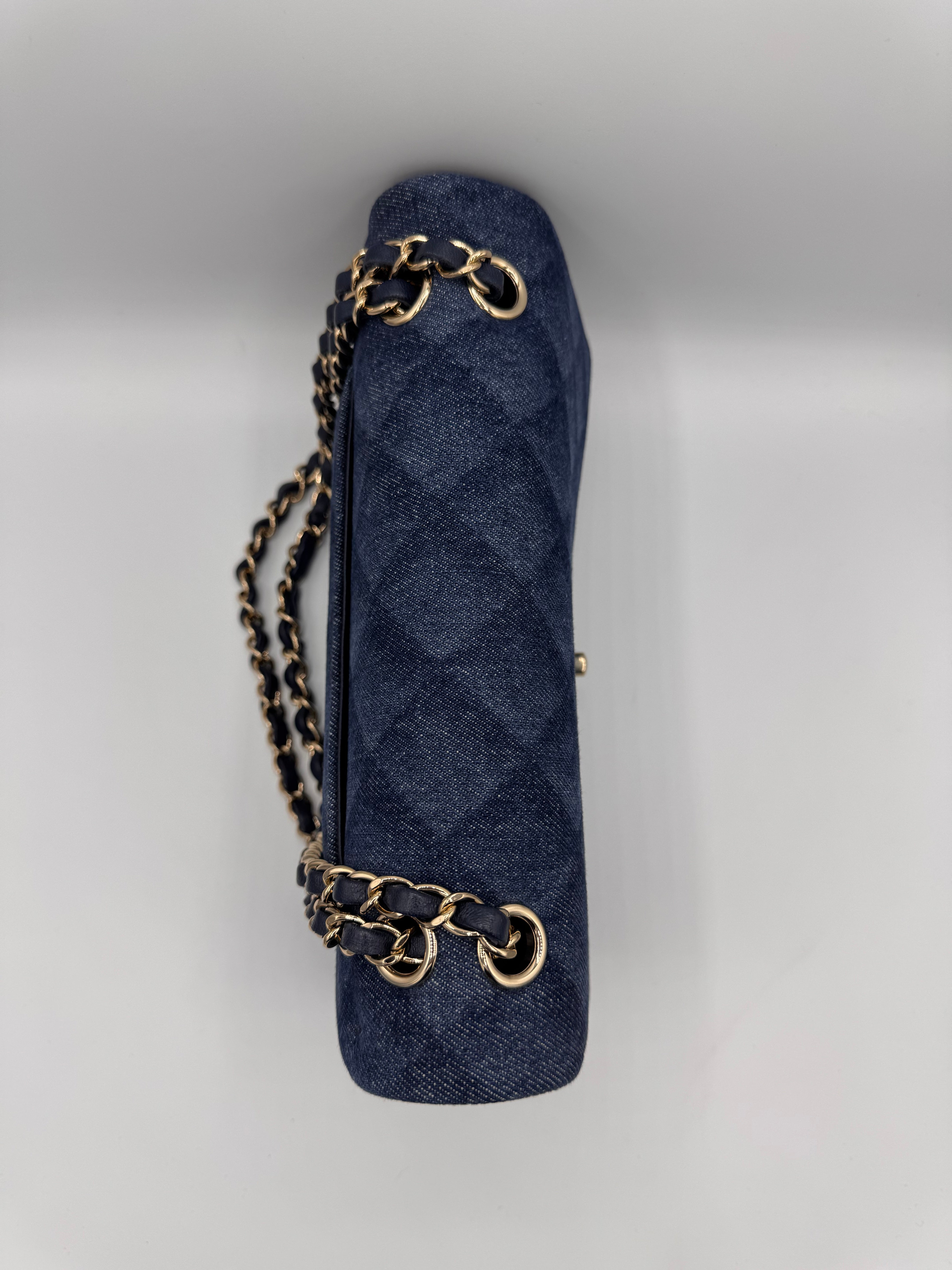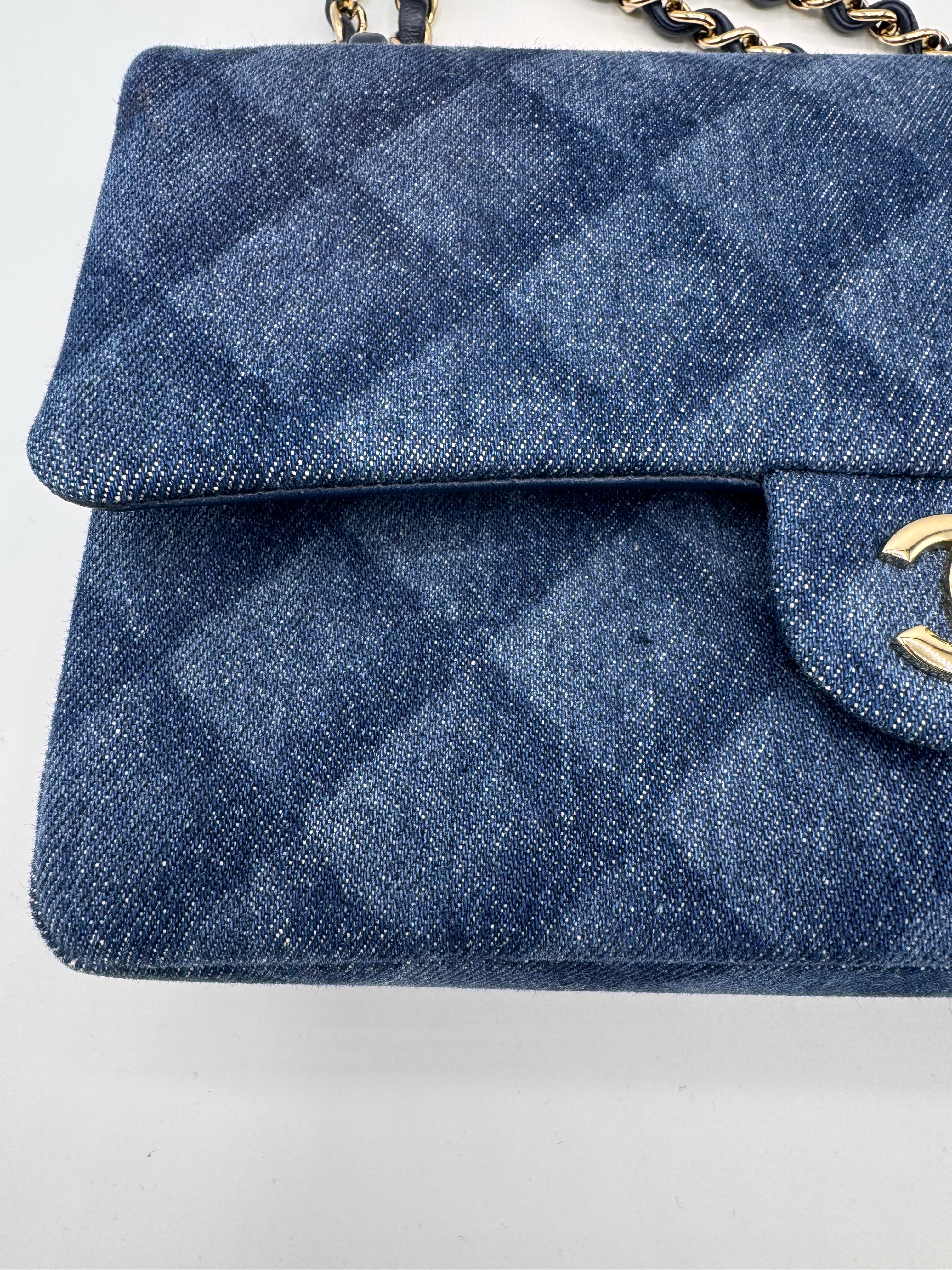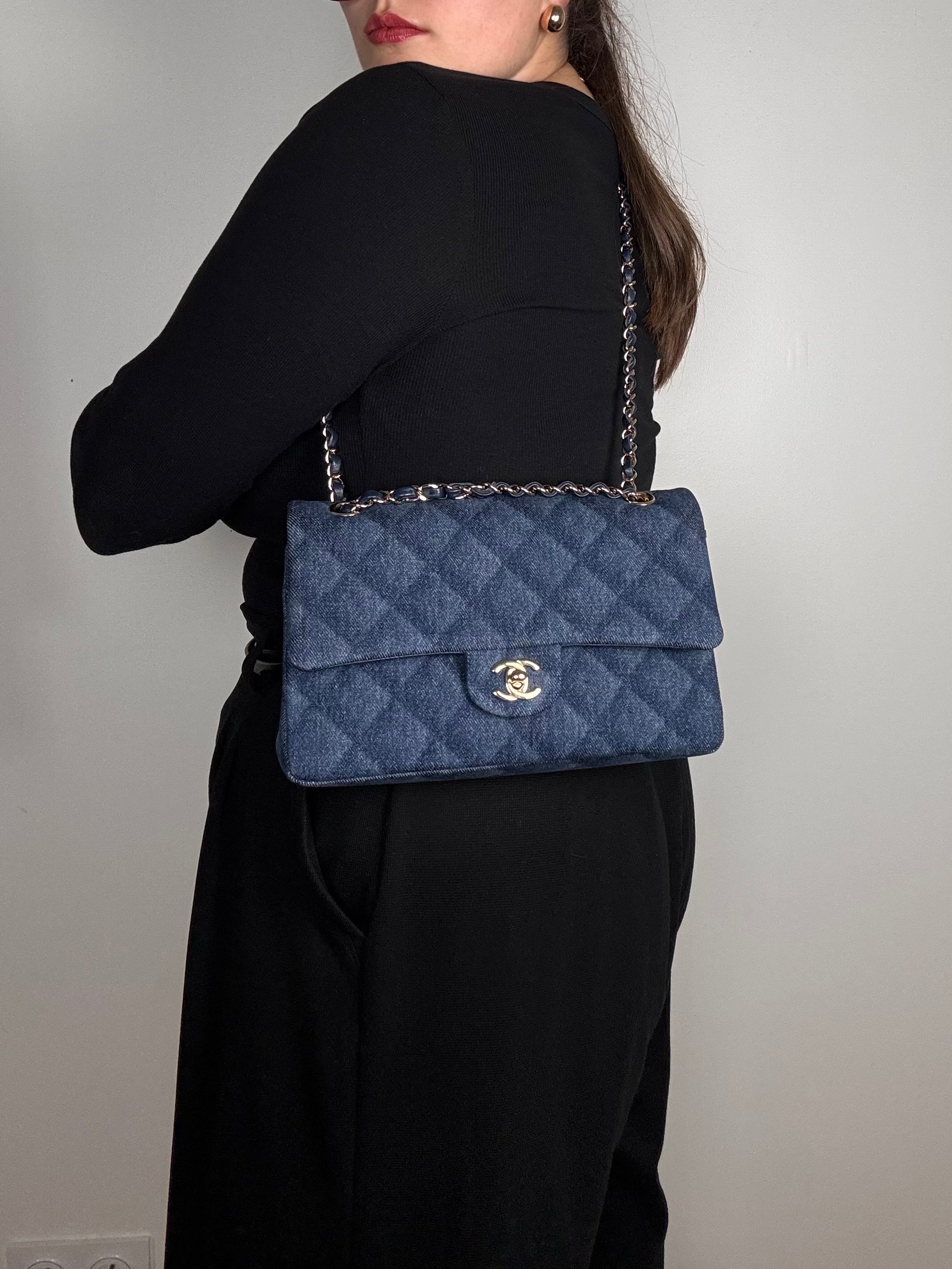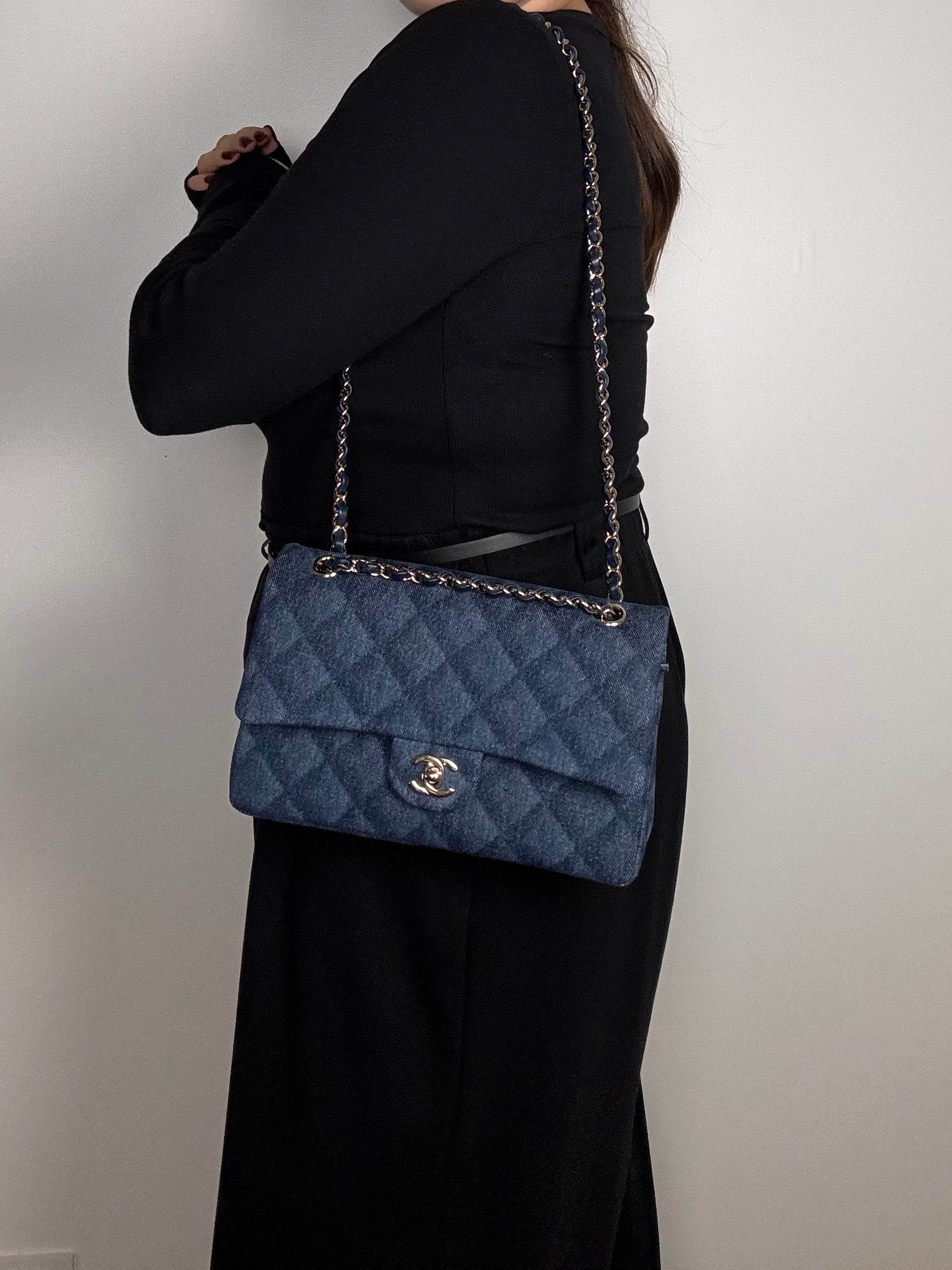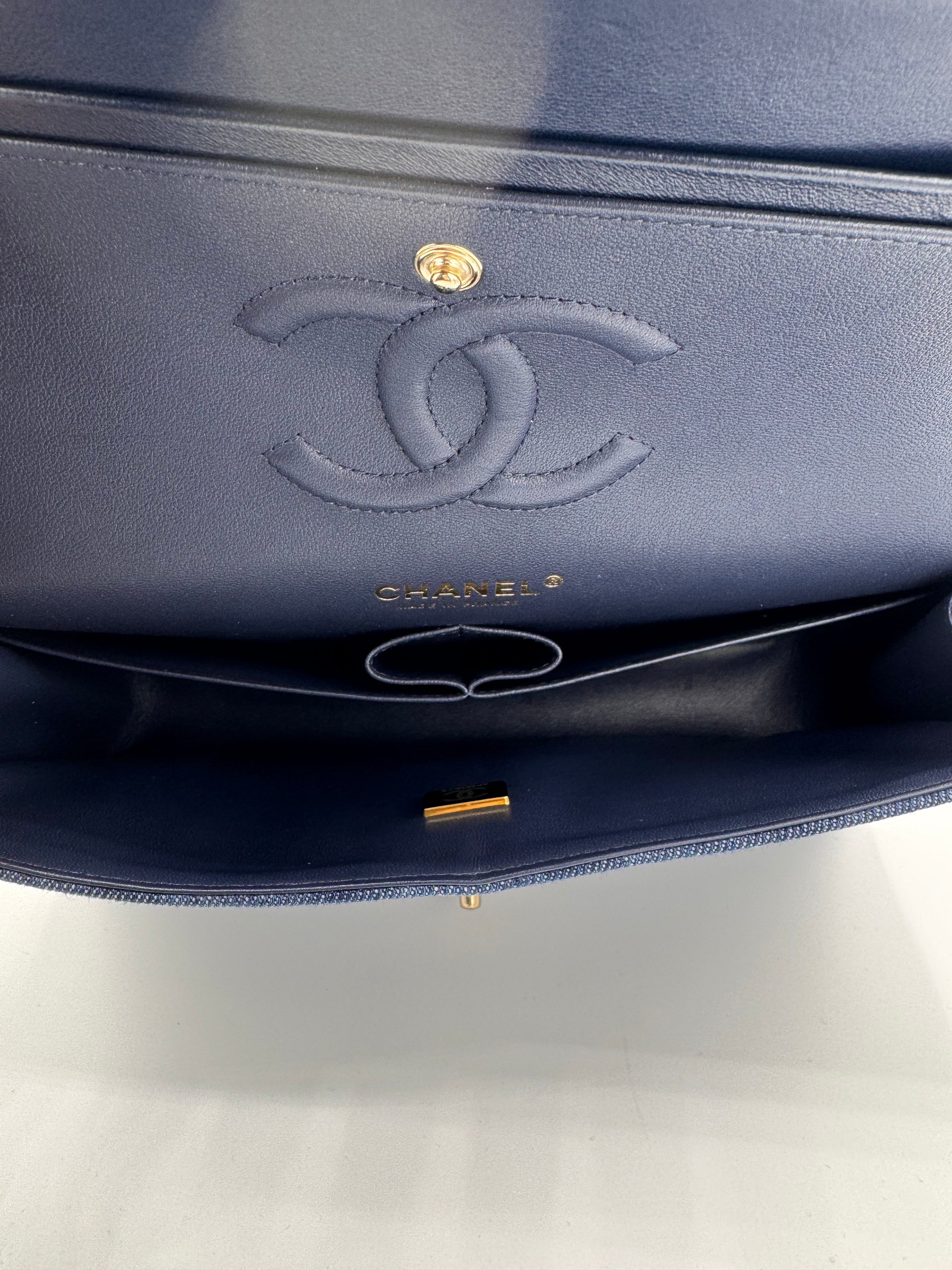 Ce Sac Timeless Classique double rabat de chez Chanel, en tissu bleu jean, cuir d'agneau bleu et bijouterie champagne est en excellent état.
