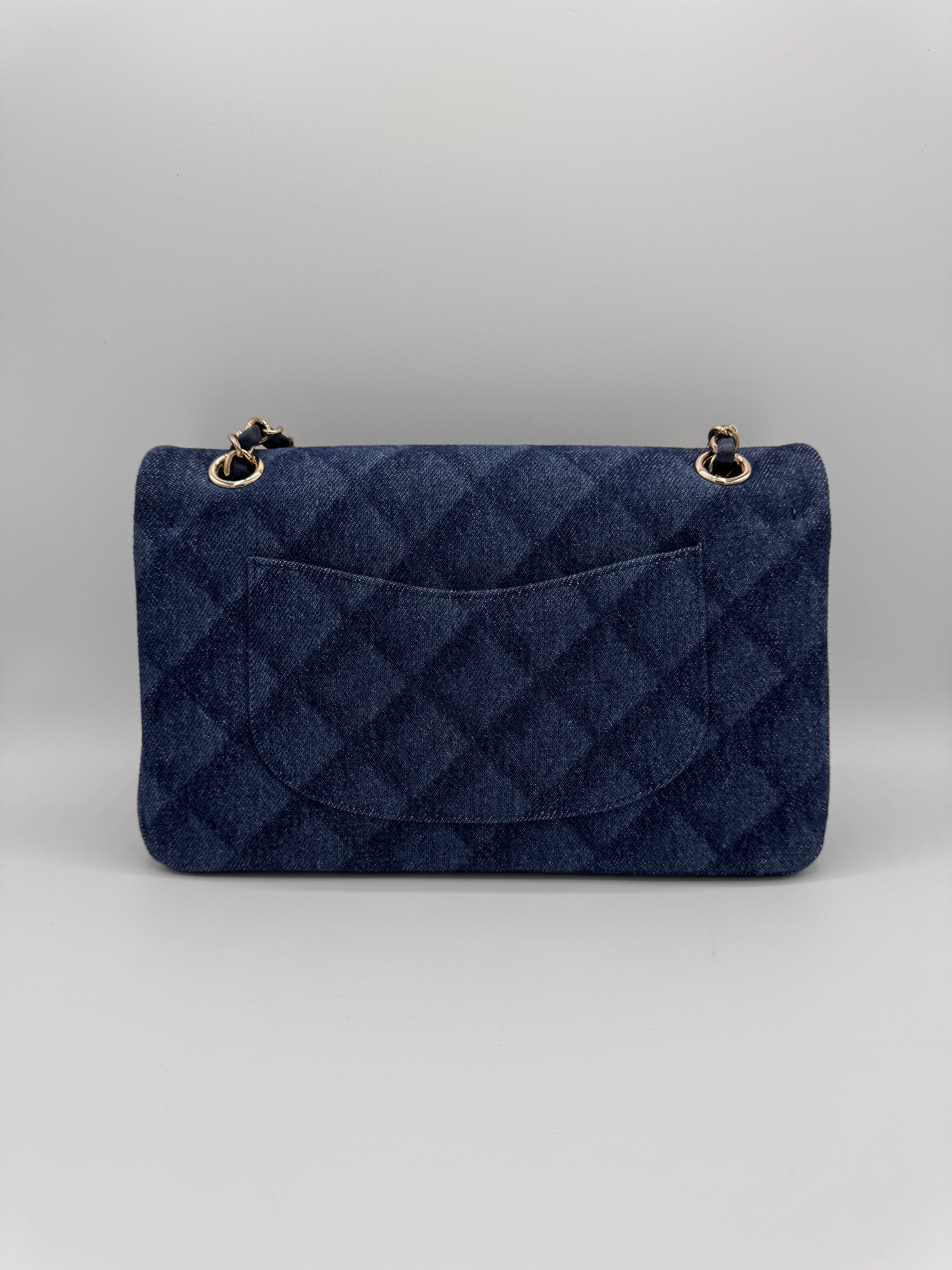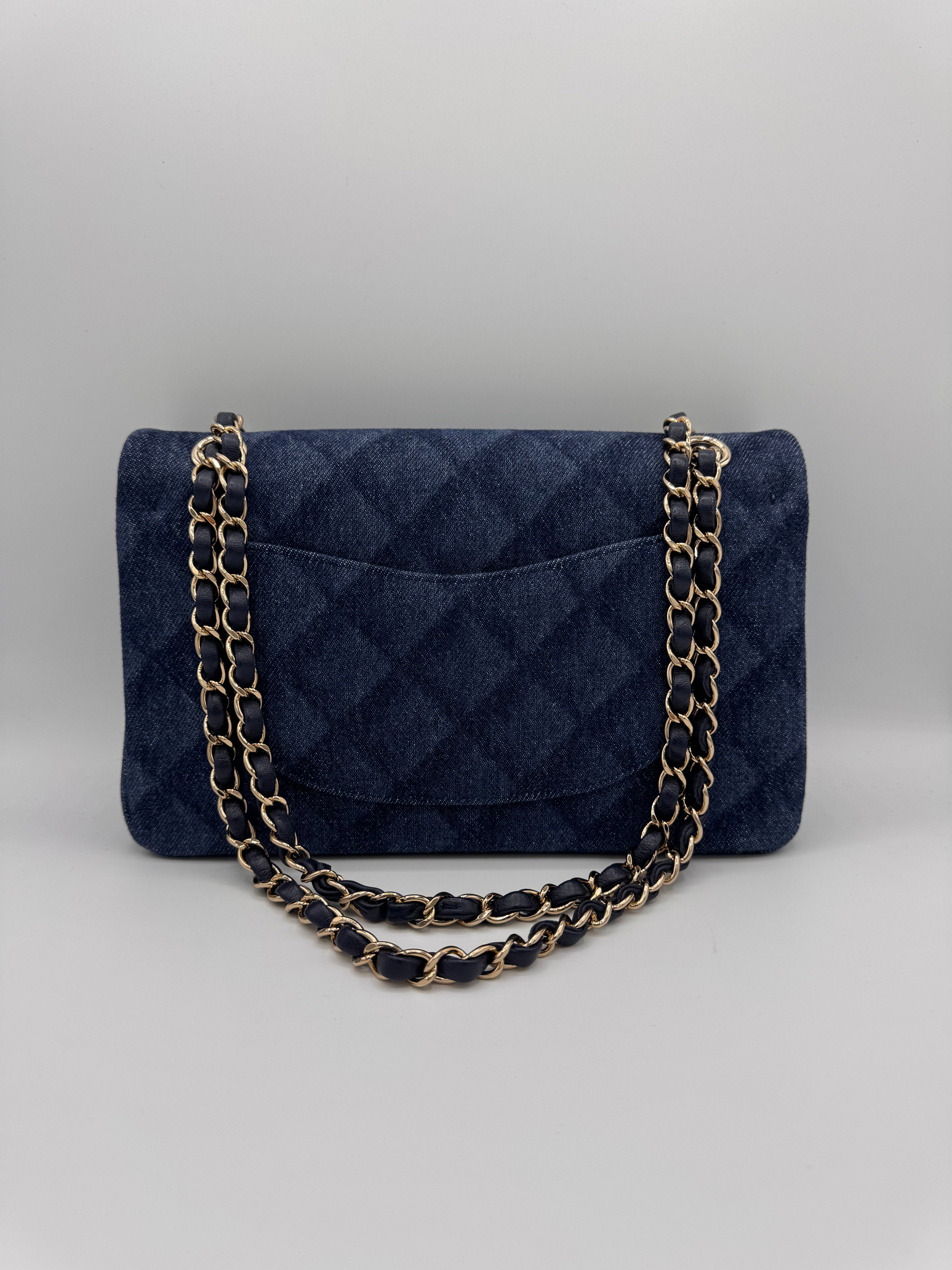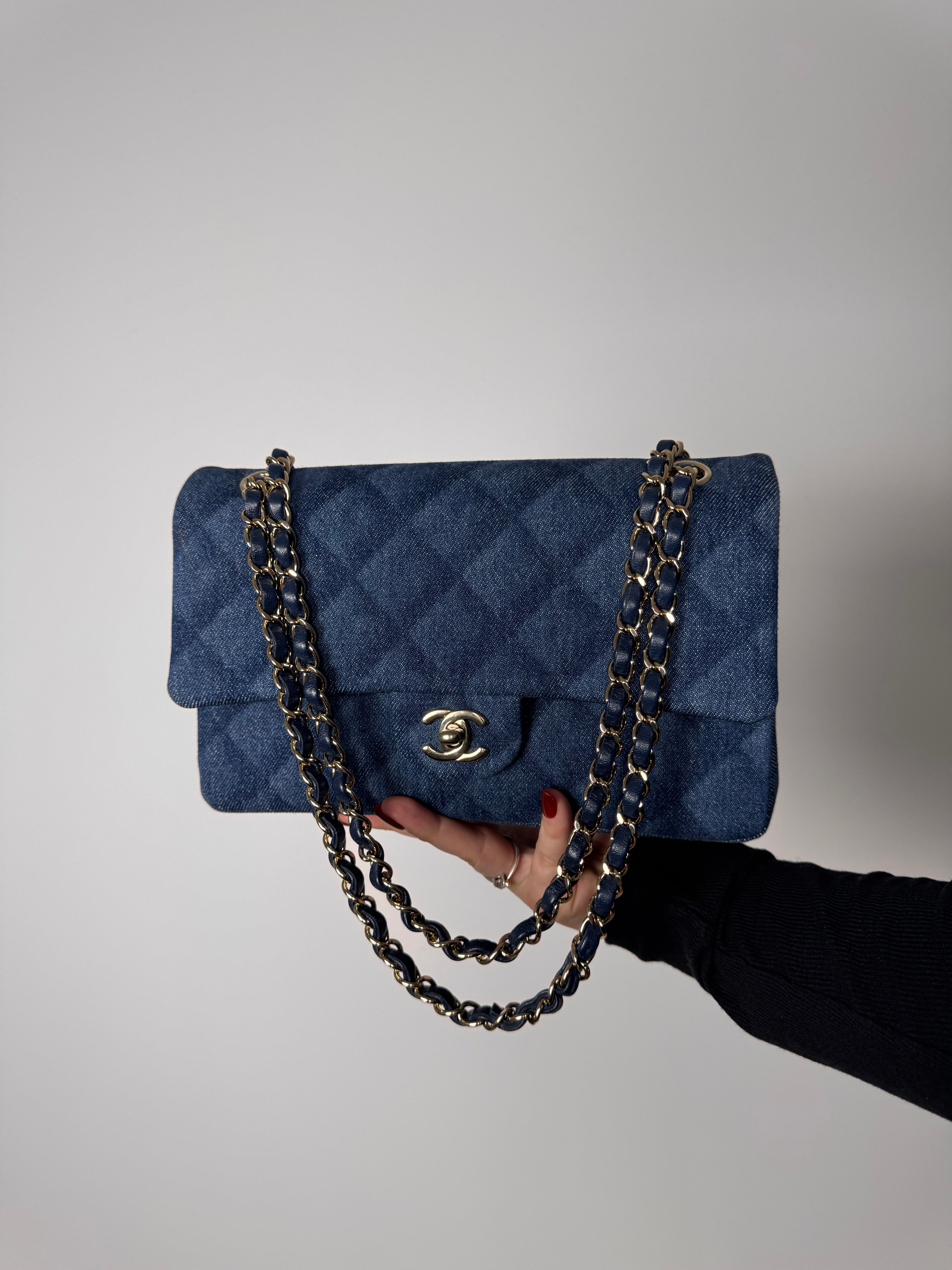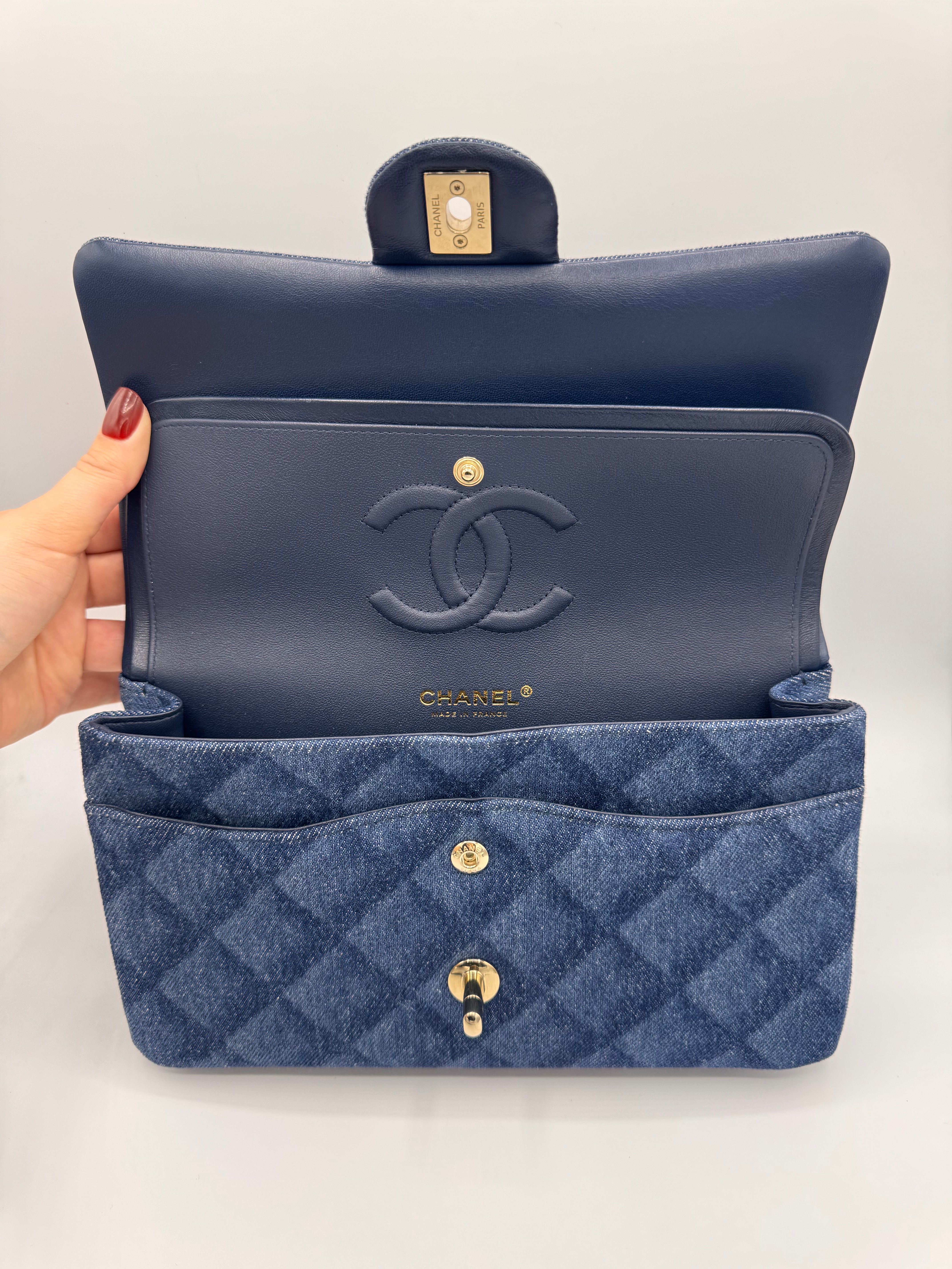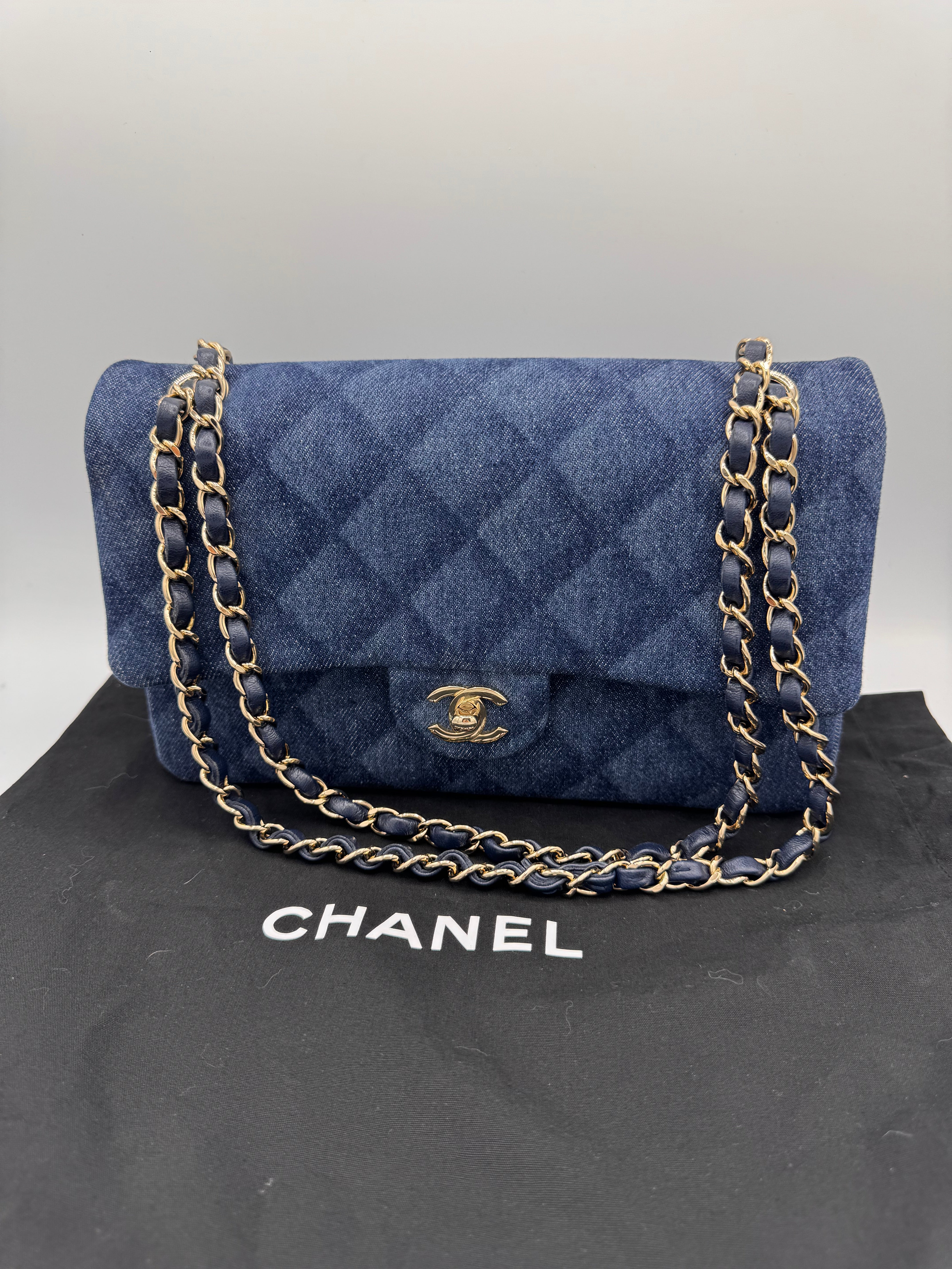 Ce Sac Timeless Classique double rabat de chez Chanel, en tissu bleu jean, cuir d'agneau bleu et bijouterie champagne est en excellent état.