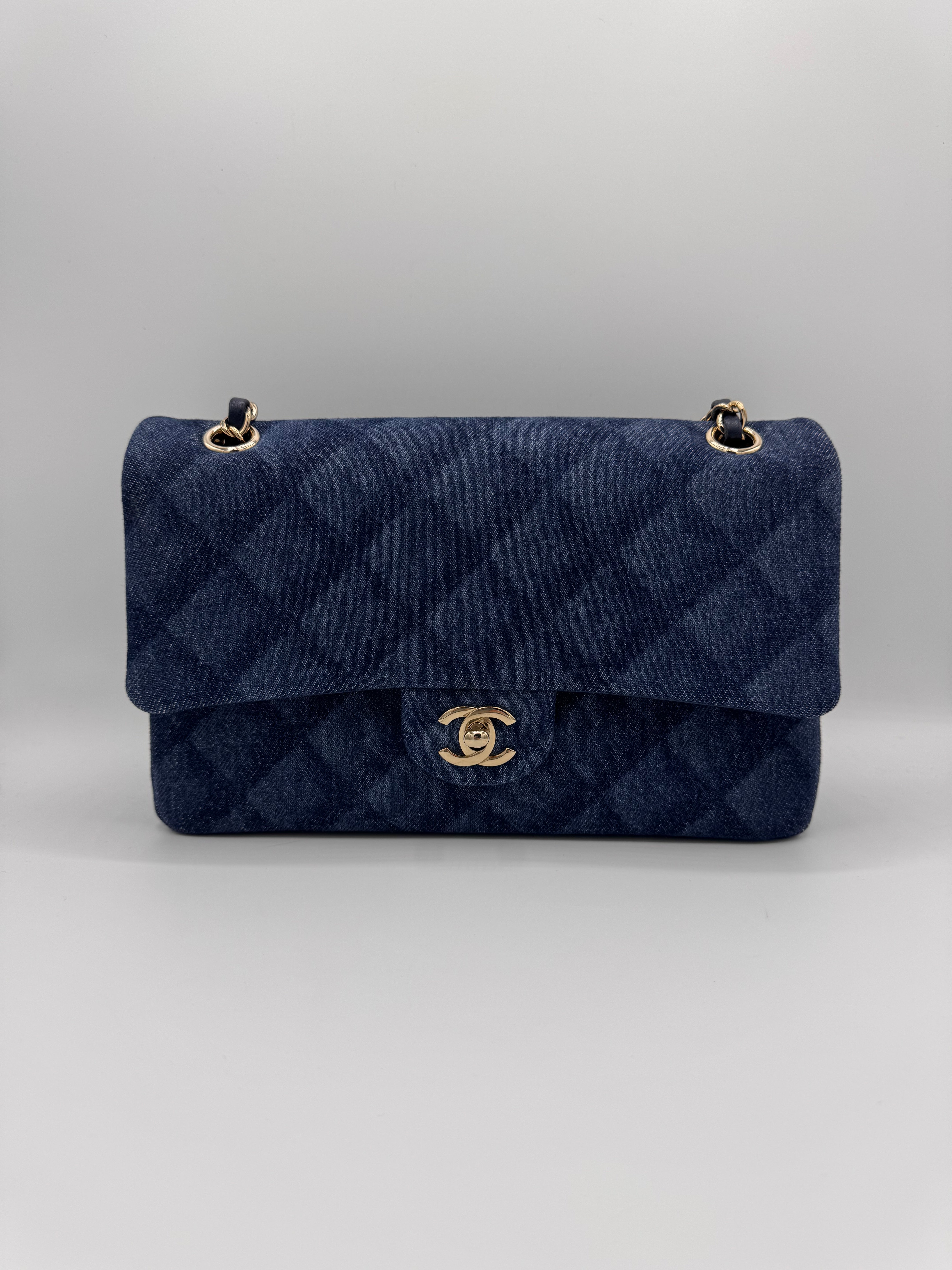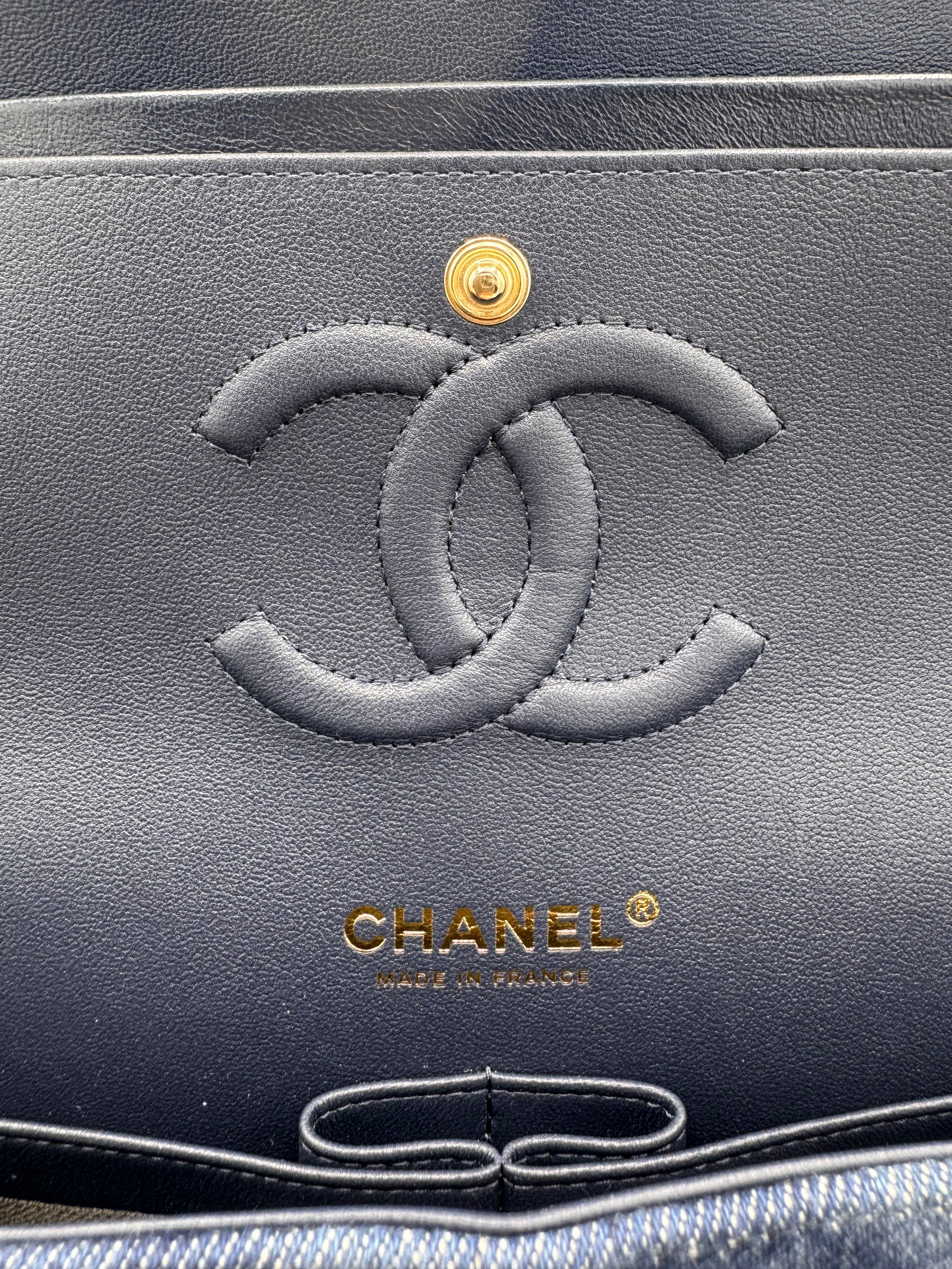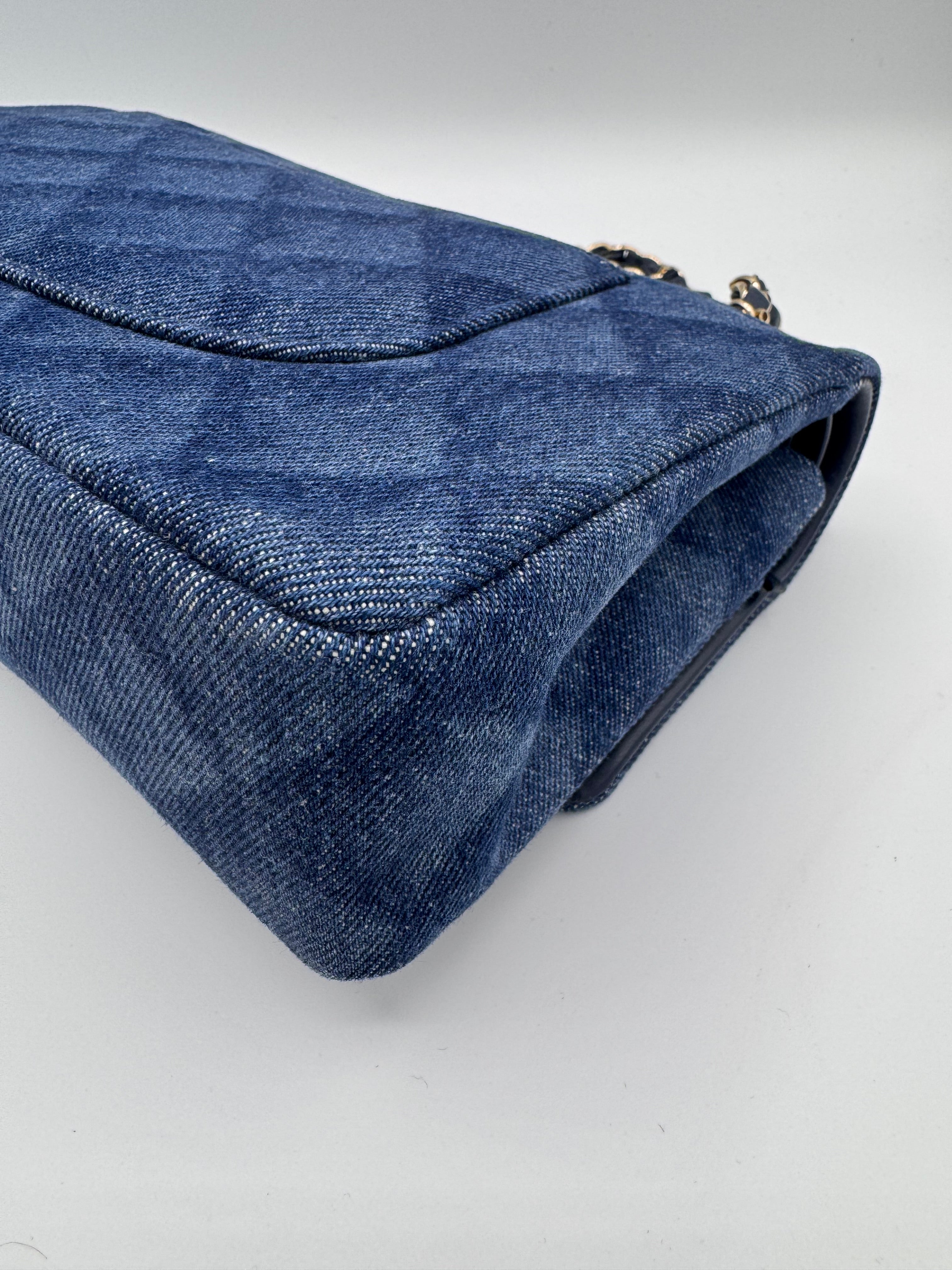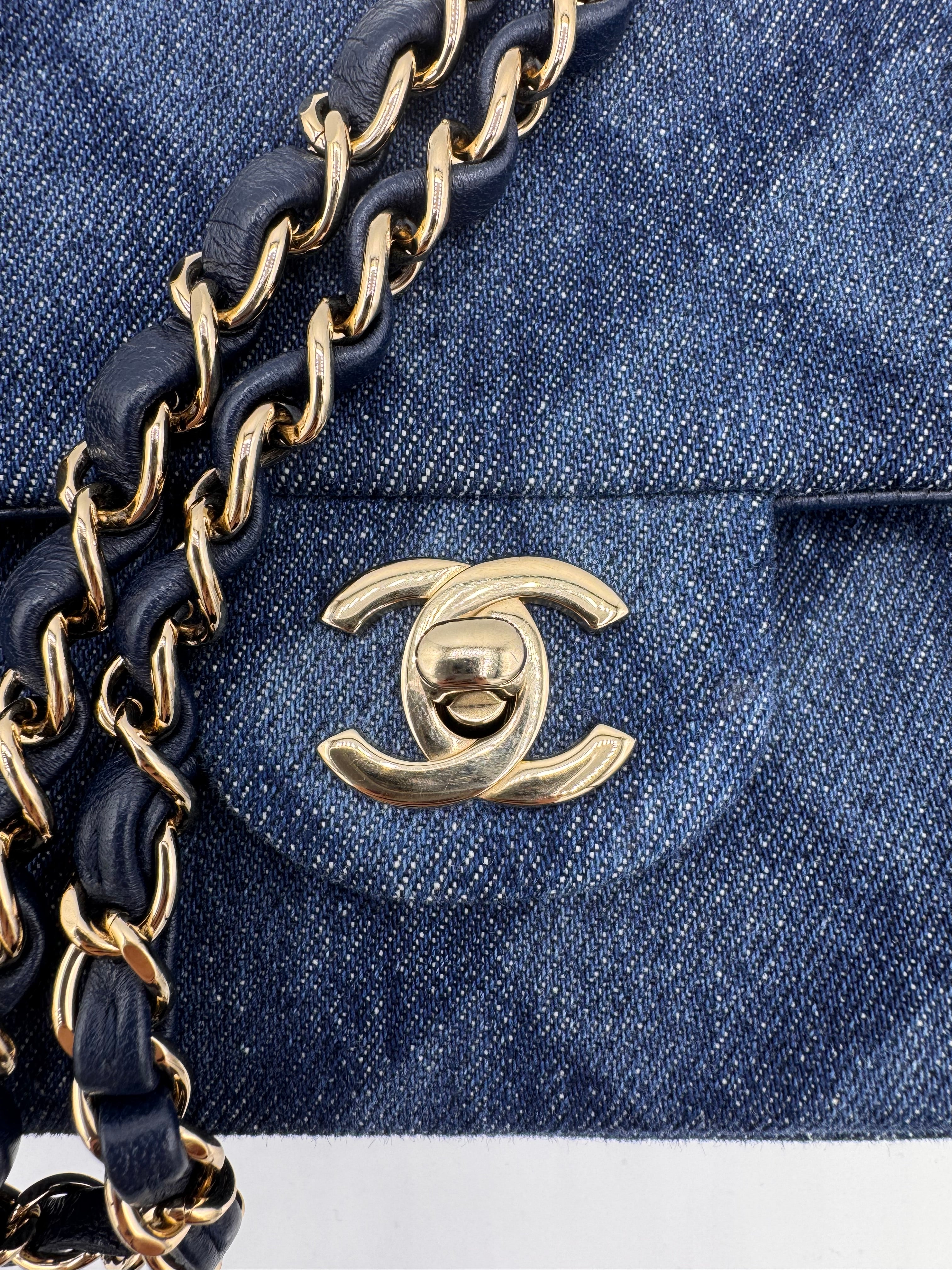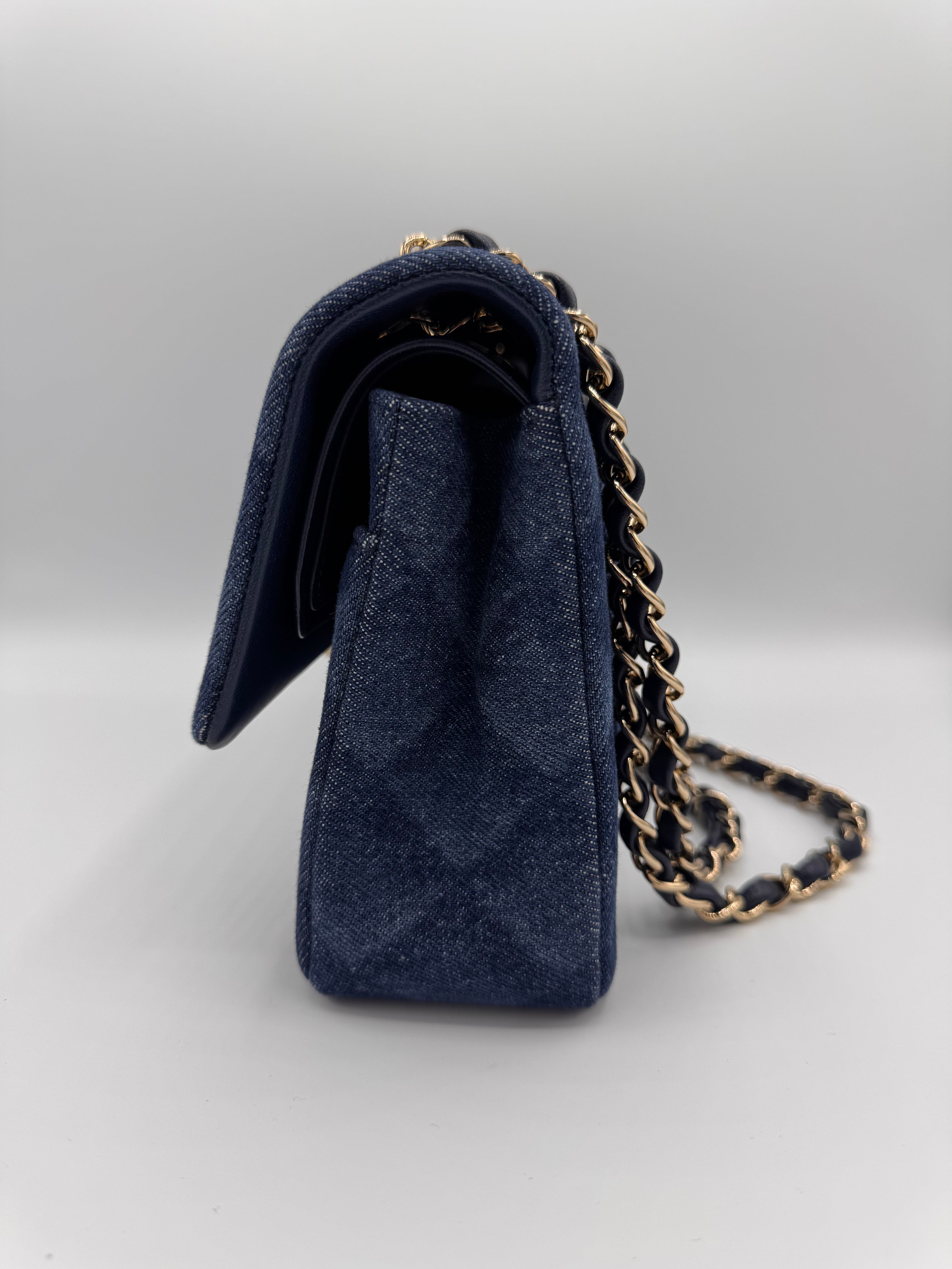 Ce Sac Timeless Classique double rabat de chez Chanel, en tissu bleu jean, cuir d'agneau bleu et bijouterie champagne est en excellent état.