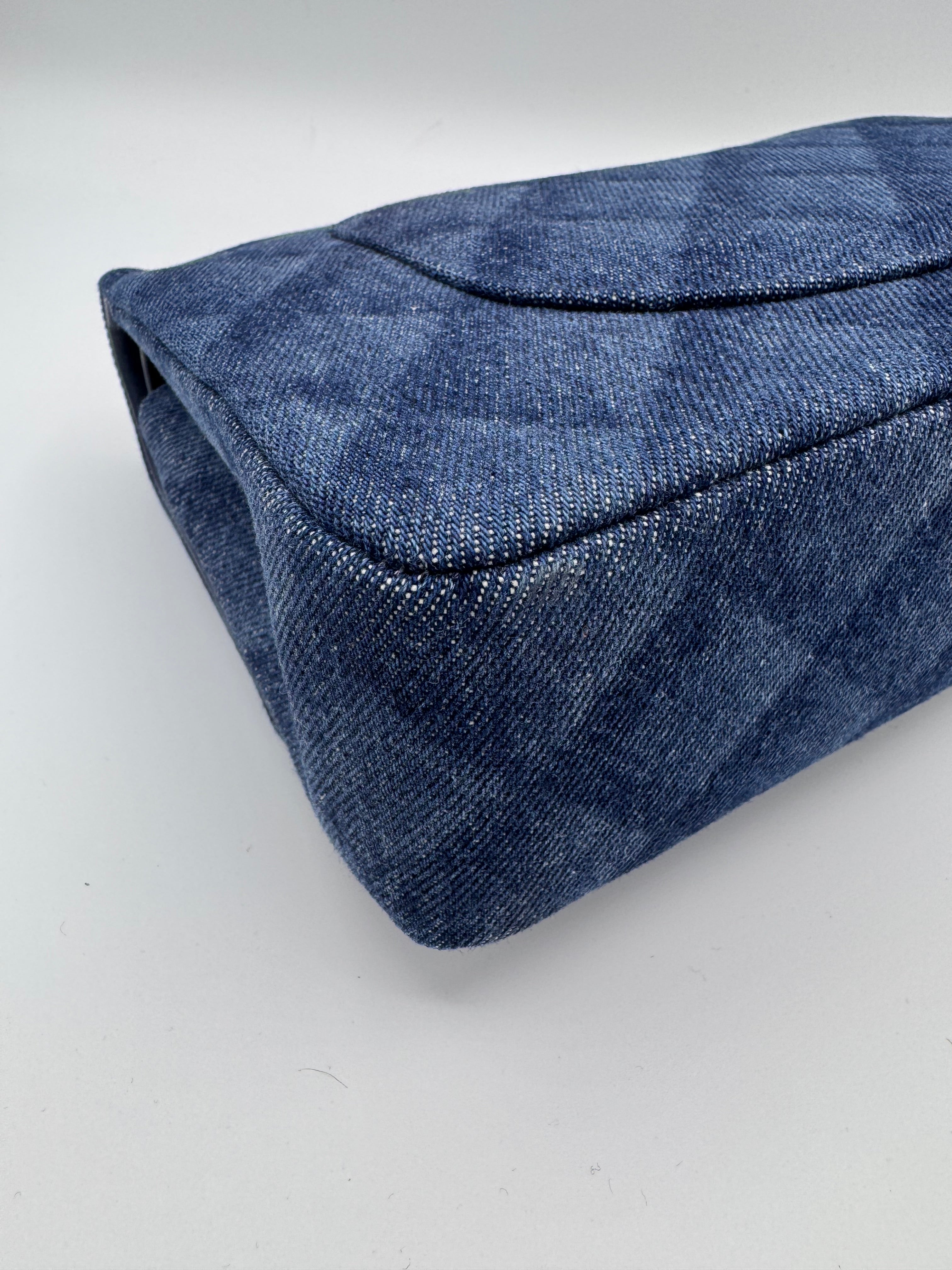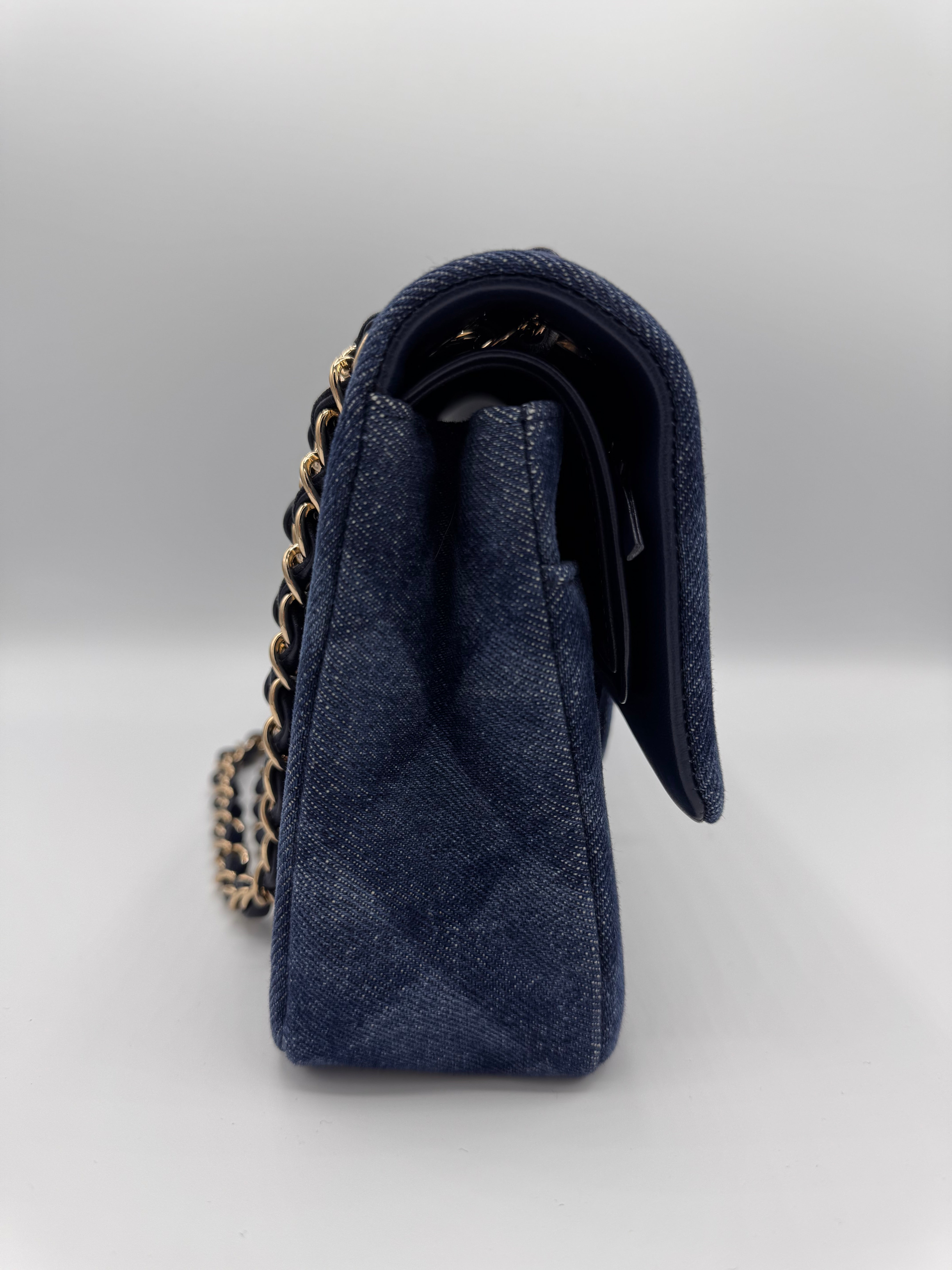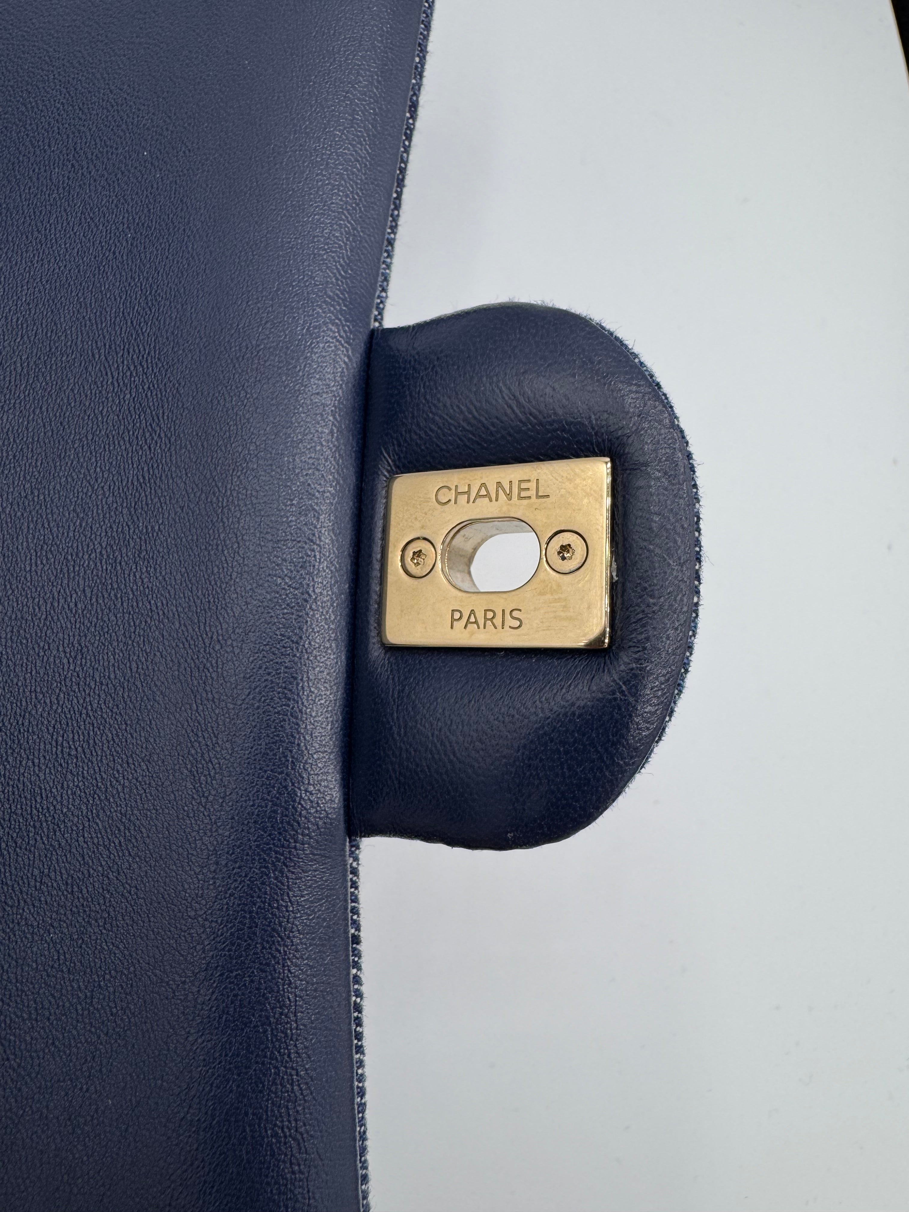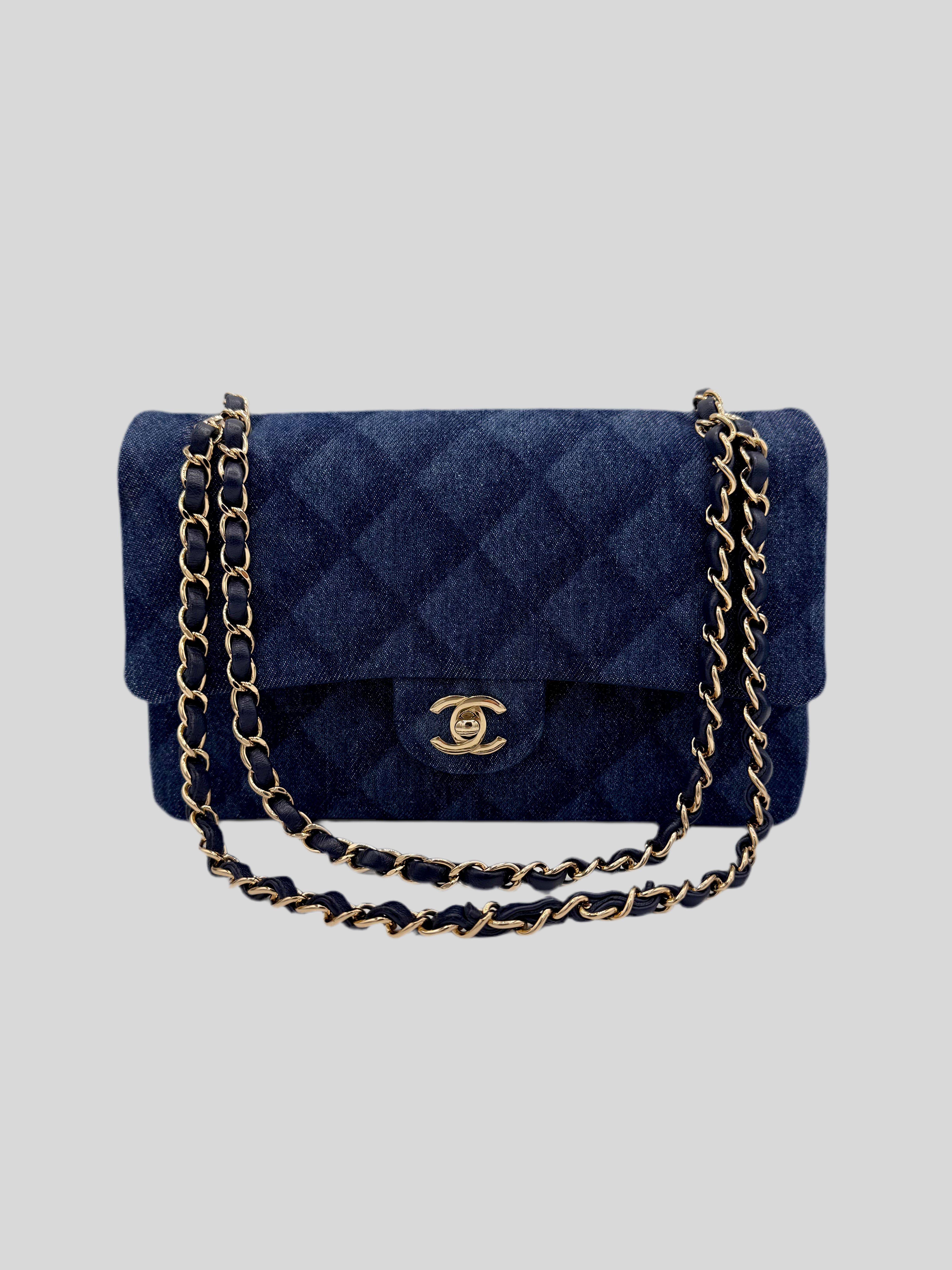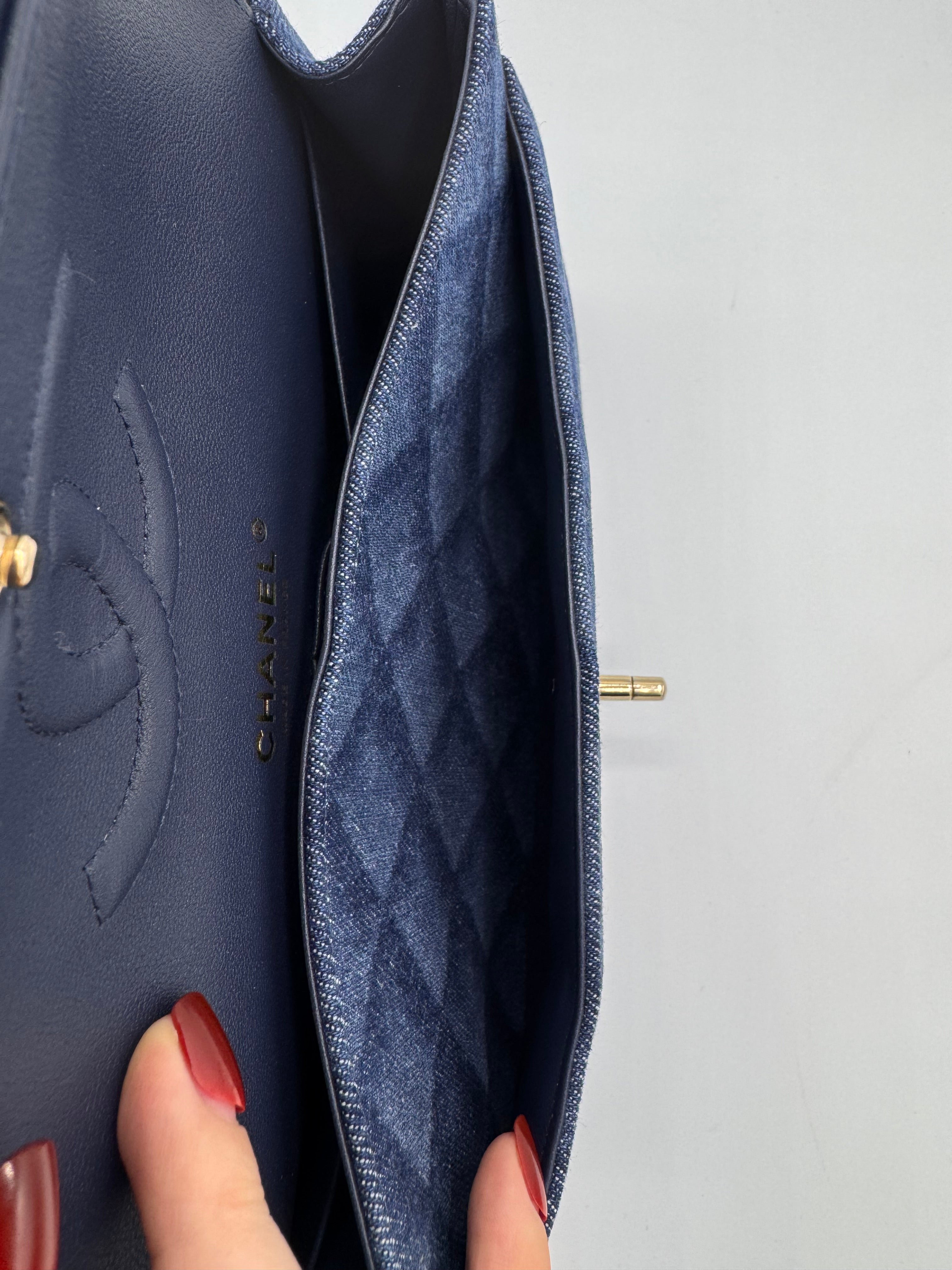 Ce Sac Timeless Classique double rabat de chez Chanel, en tissu bleu jean, cuir d'agneau bleu et bijouterie champagne est en excellent état.