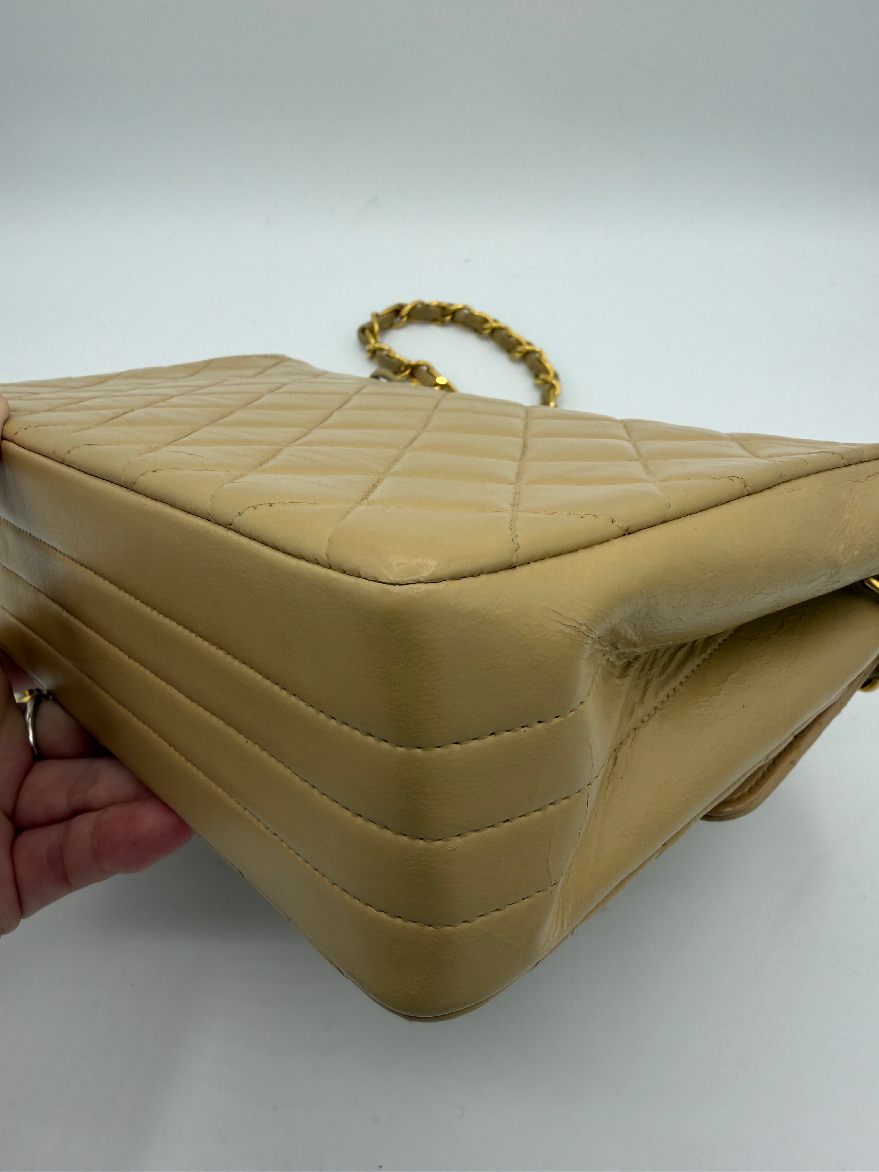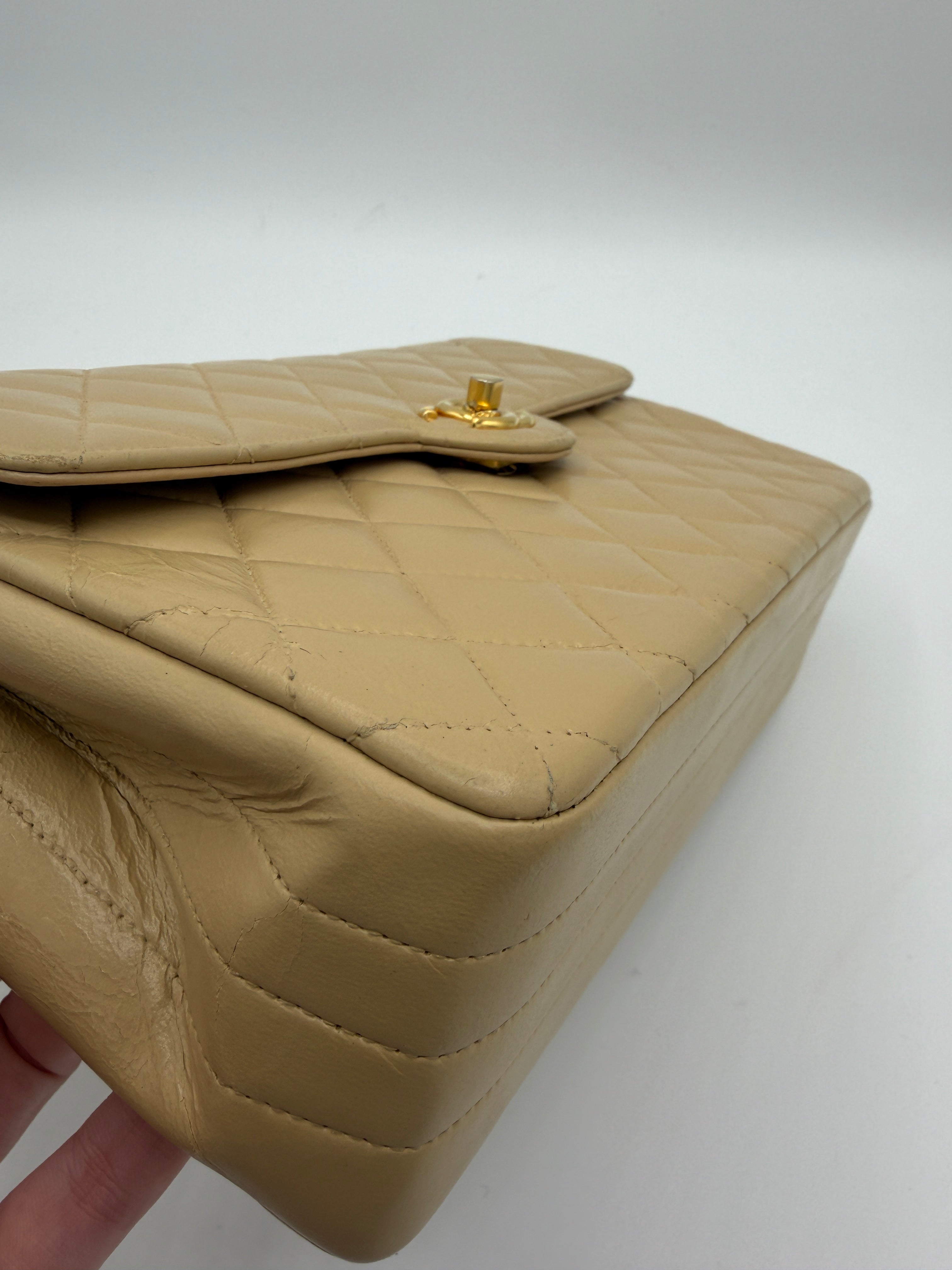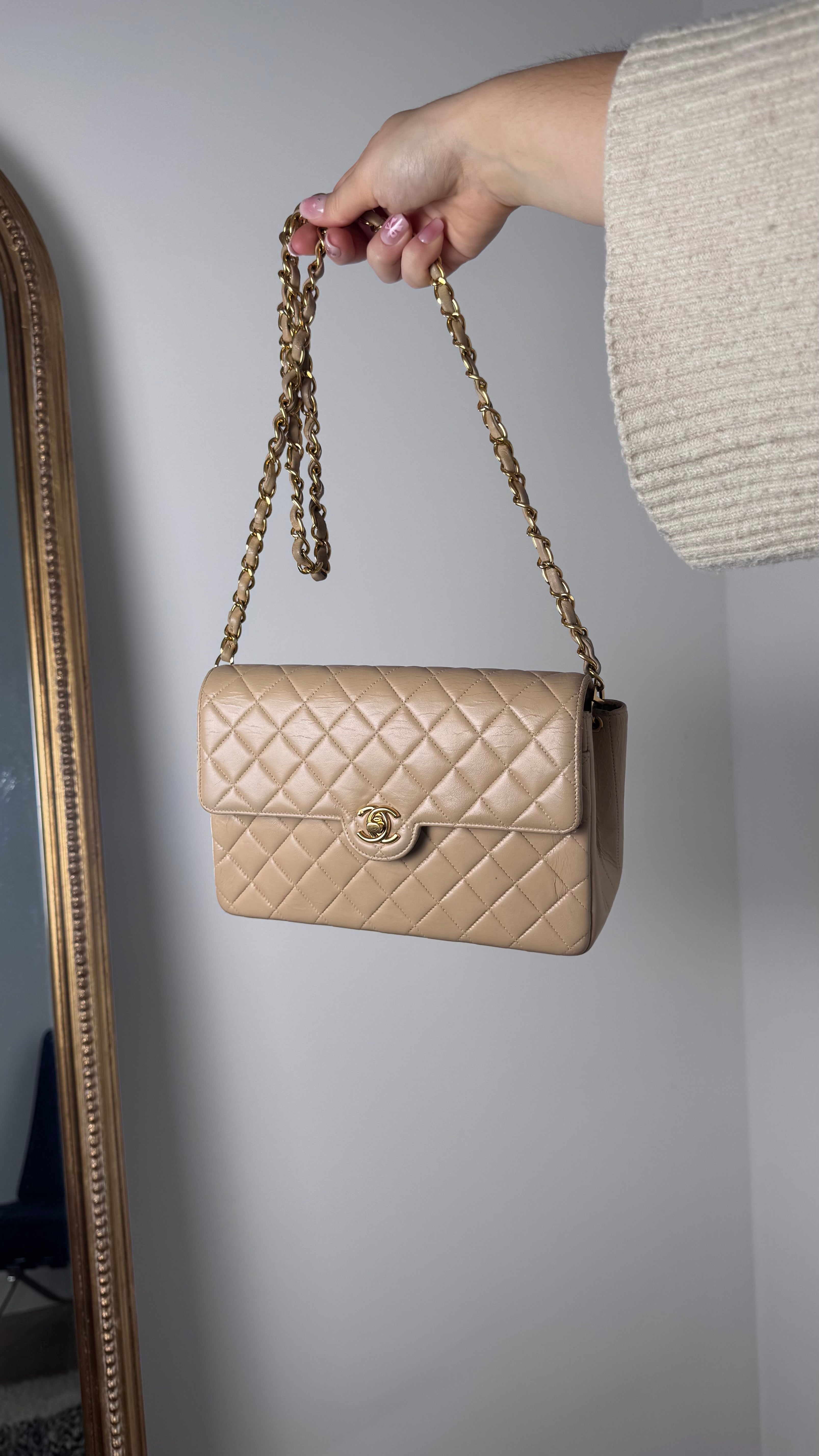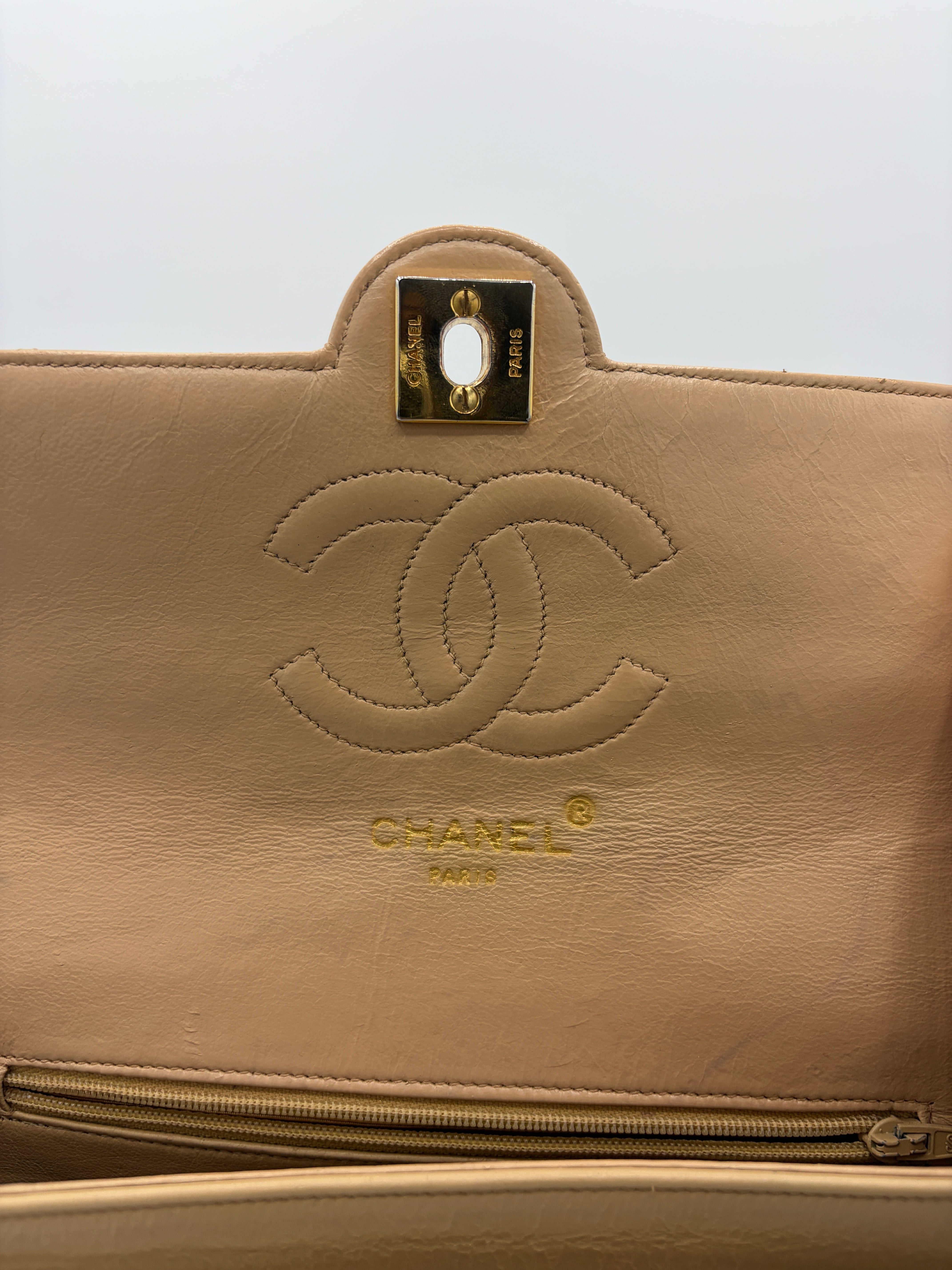 Ce Sac Timeless Vintage de chez Chanel est en bon état, en cuir d'agneau beige et bijouterie plaquée or 24 carats.