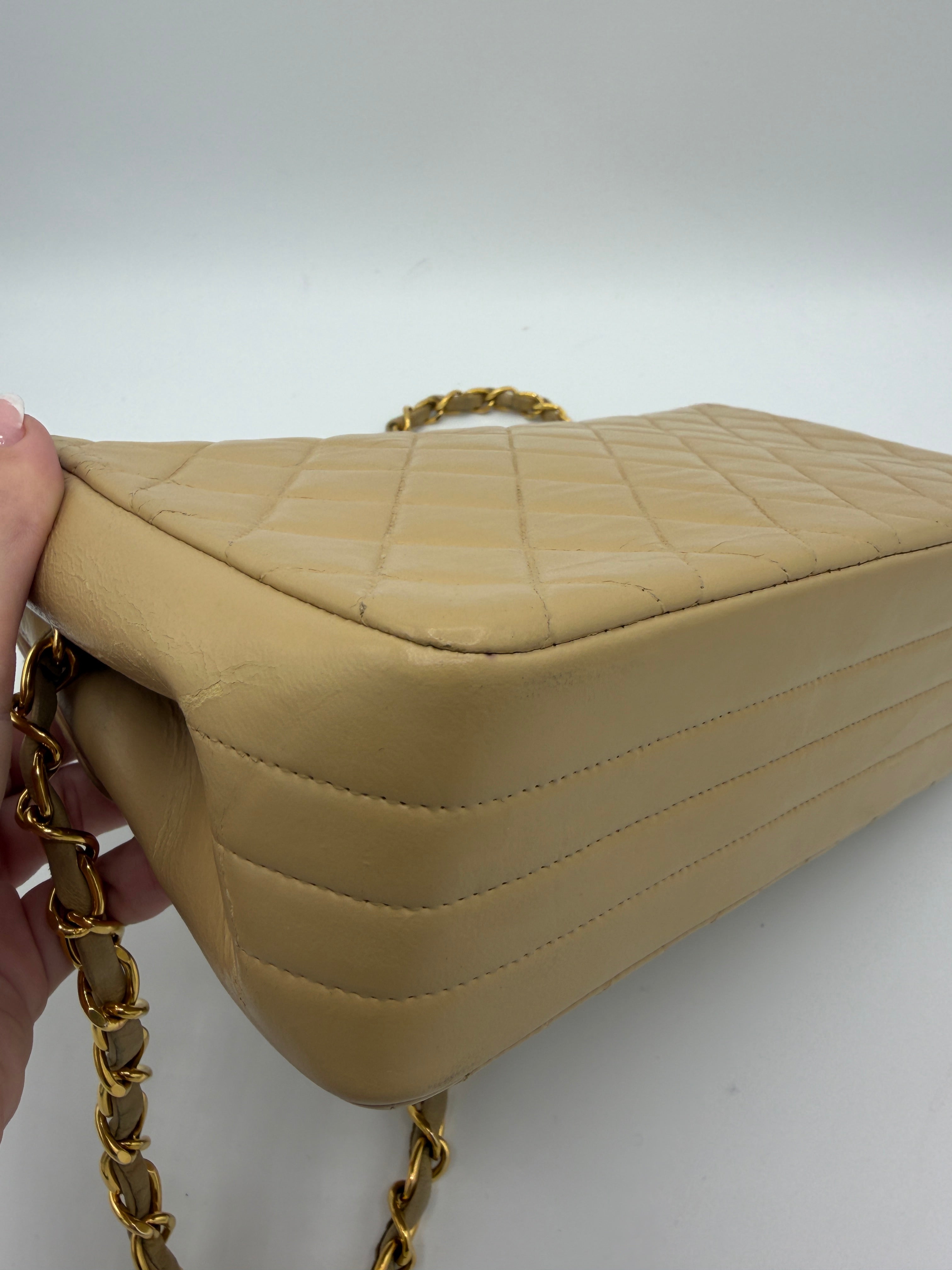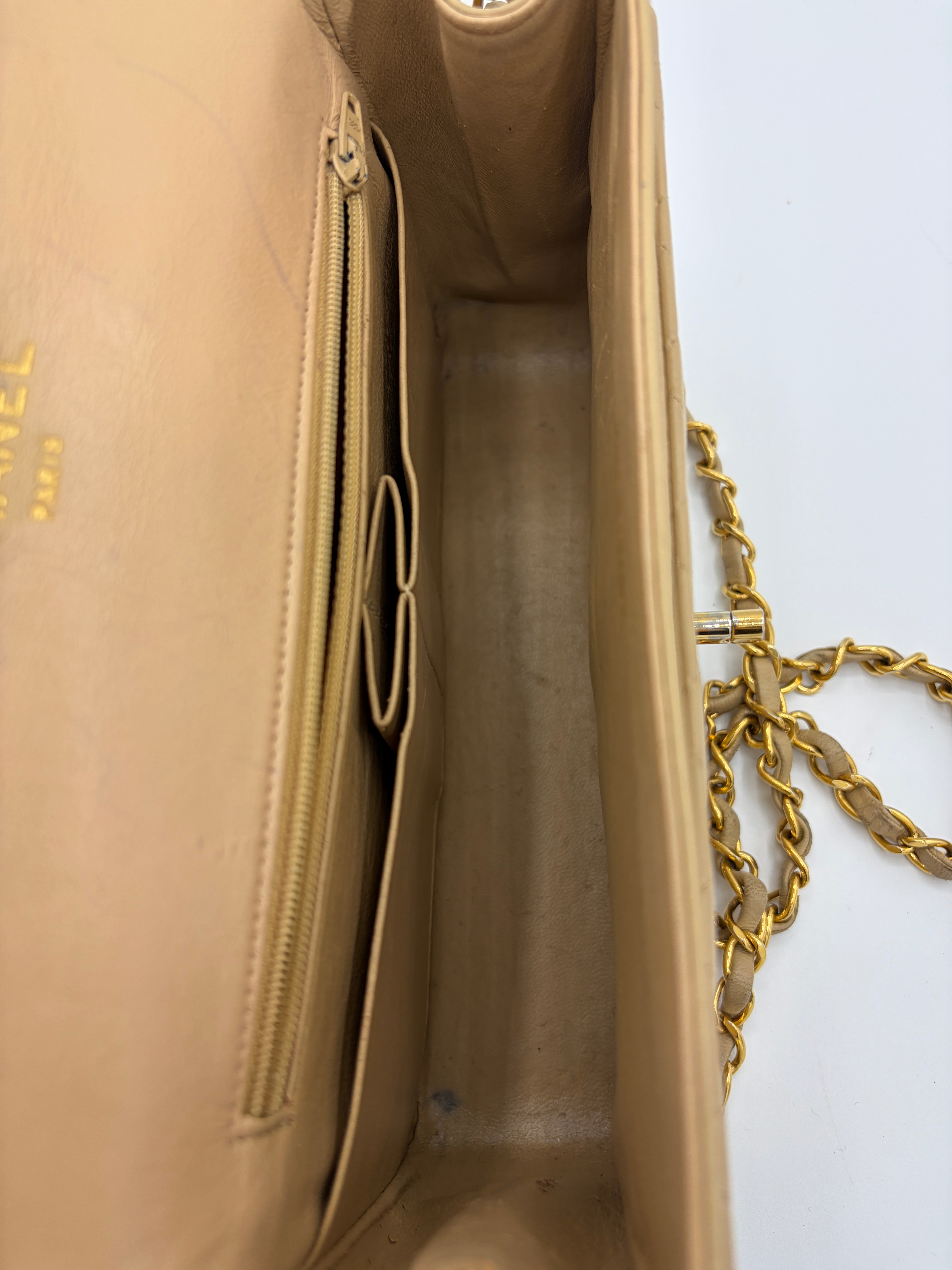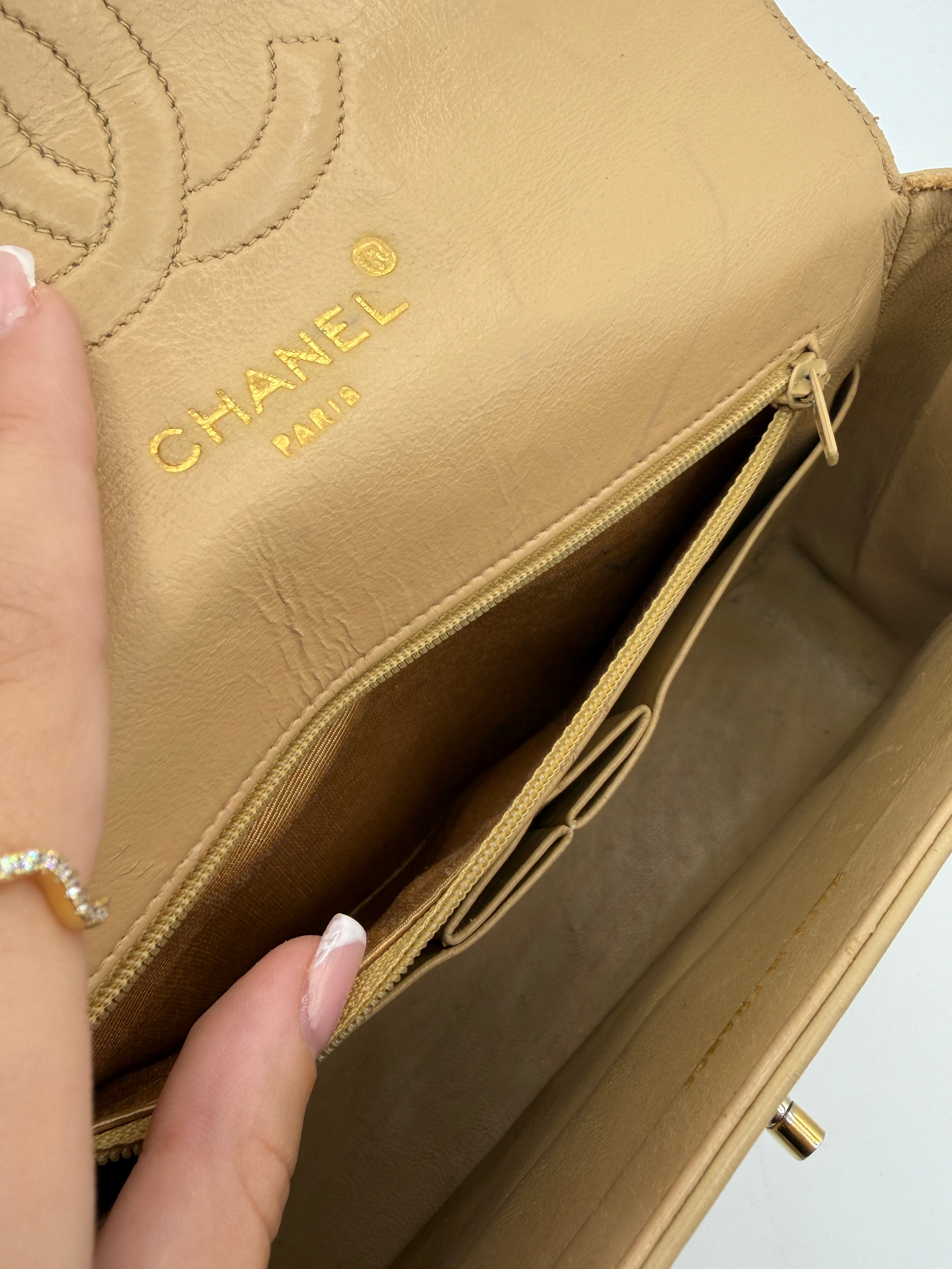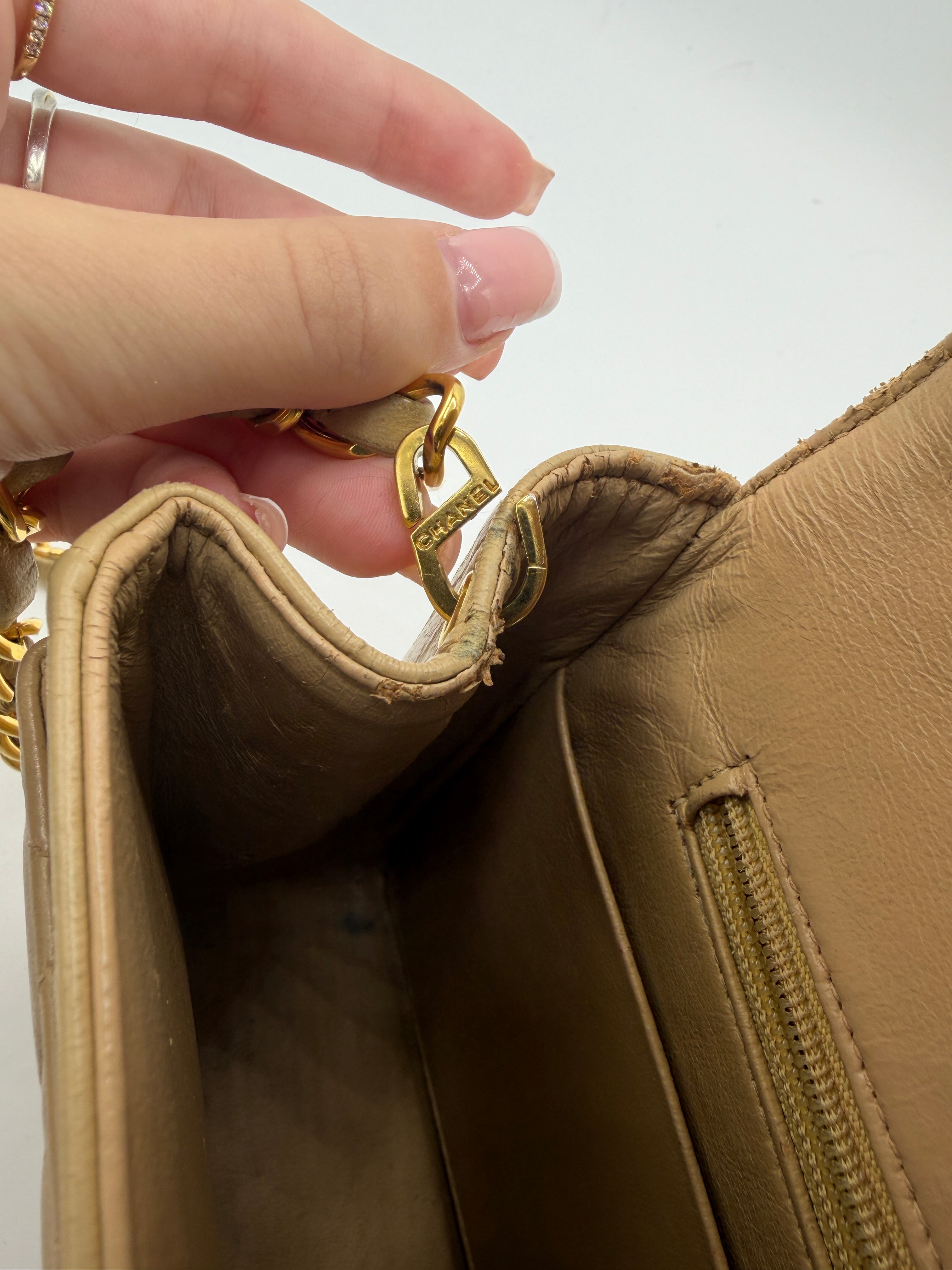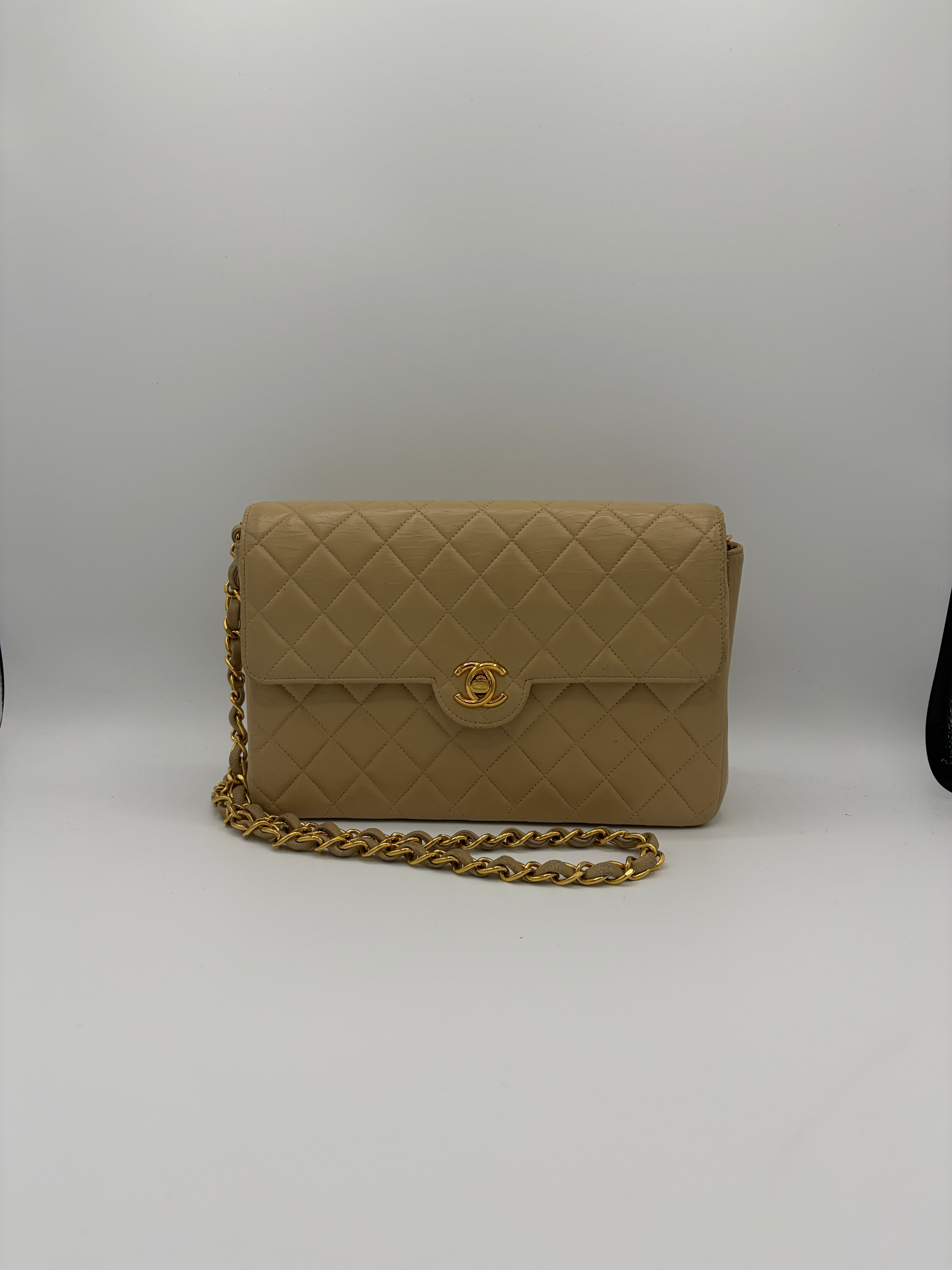 Ce Sac Timeless Vintage de chez Chanel est en bon état, en cuir d'agneau beige et bijouterie plaquée or 24 carats.