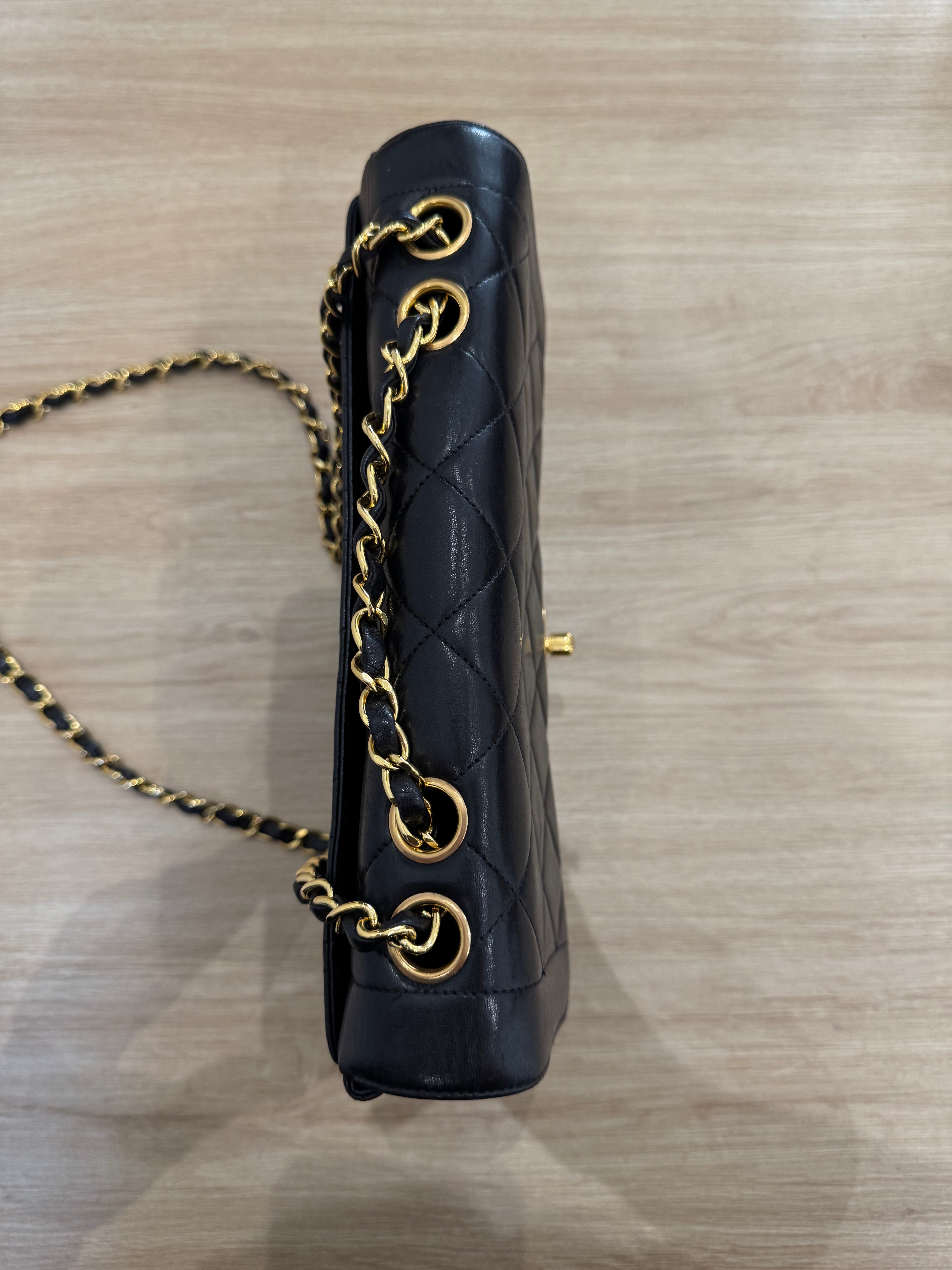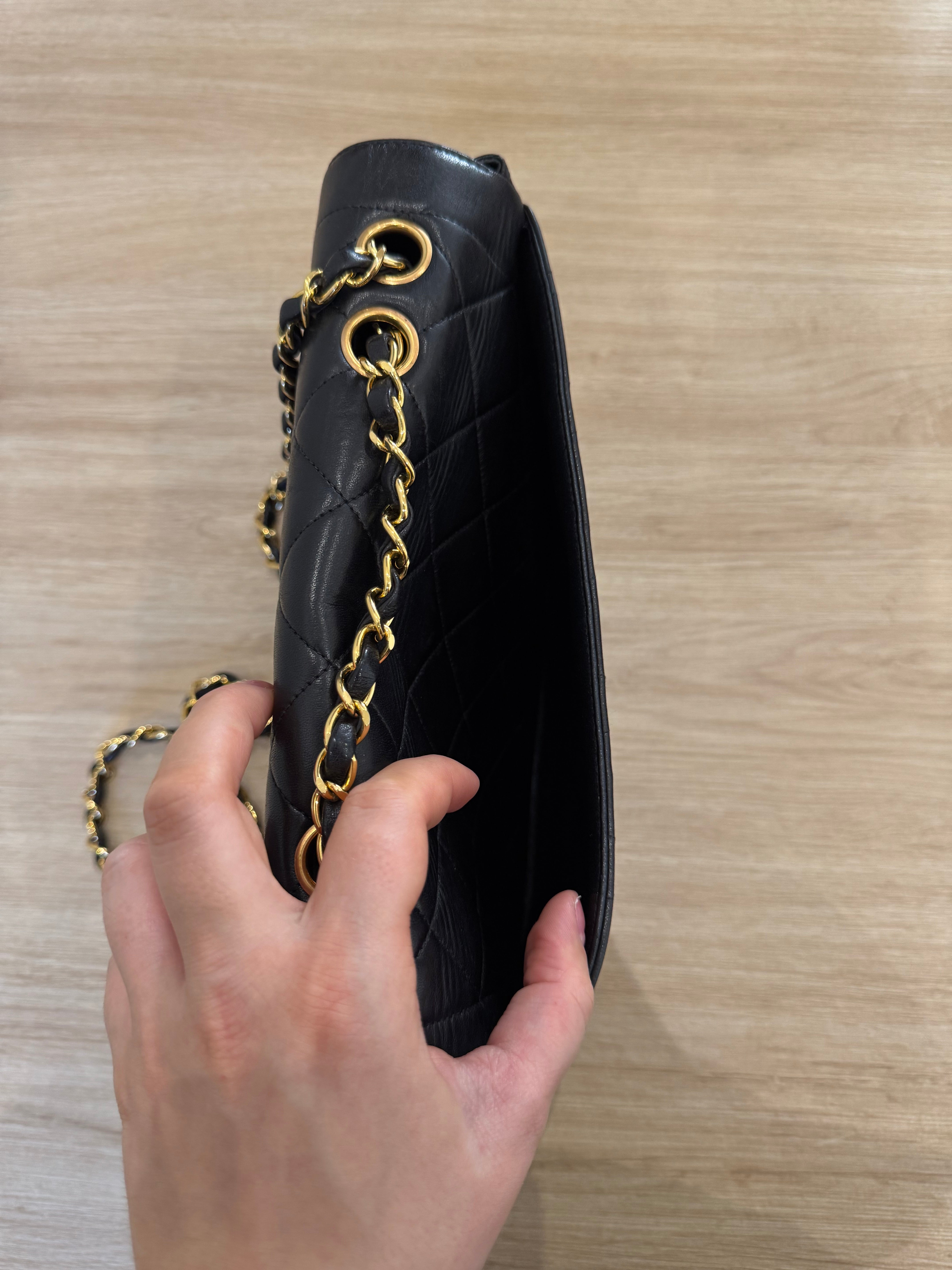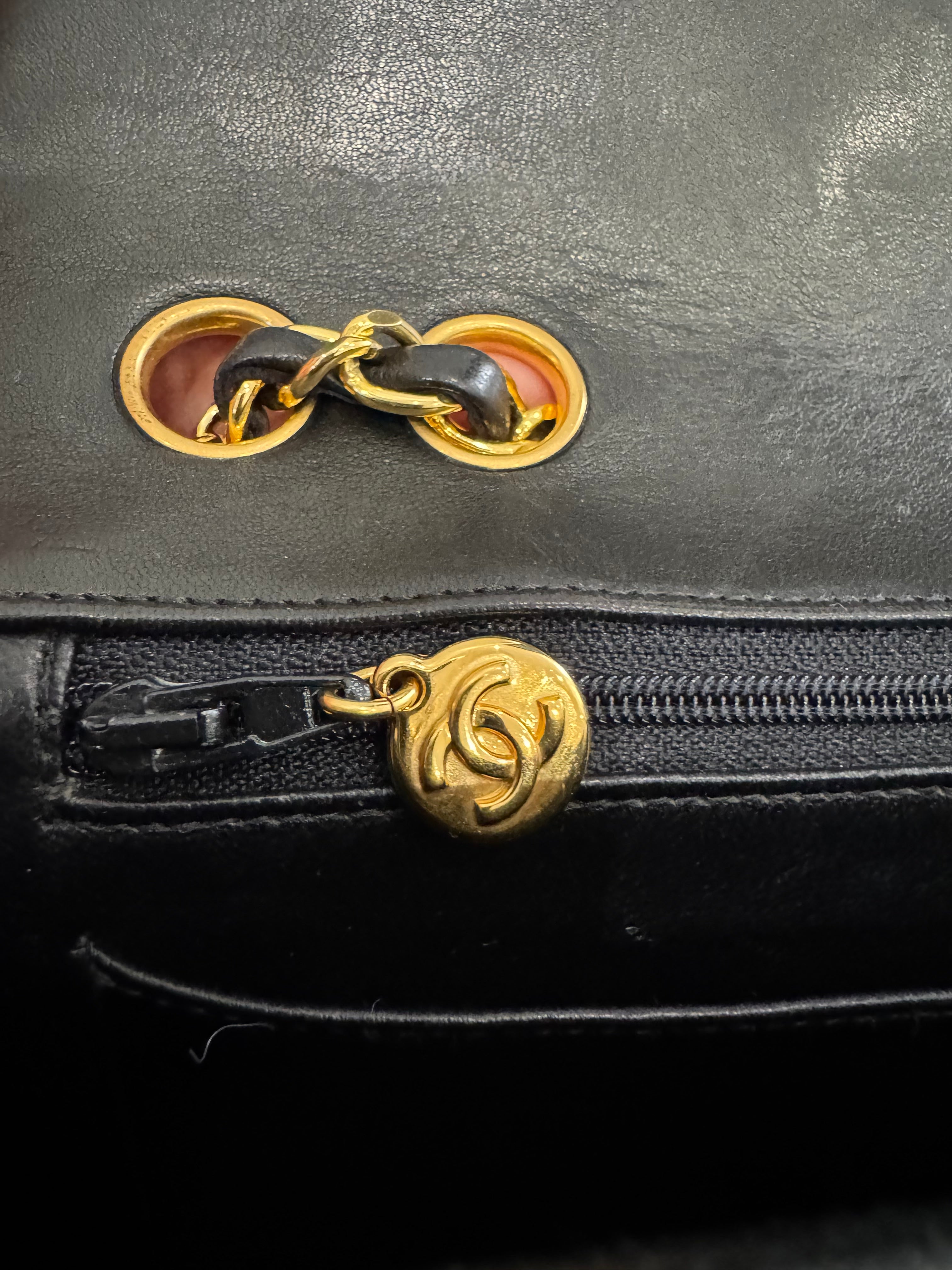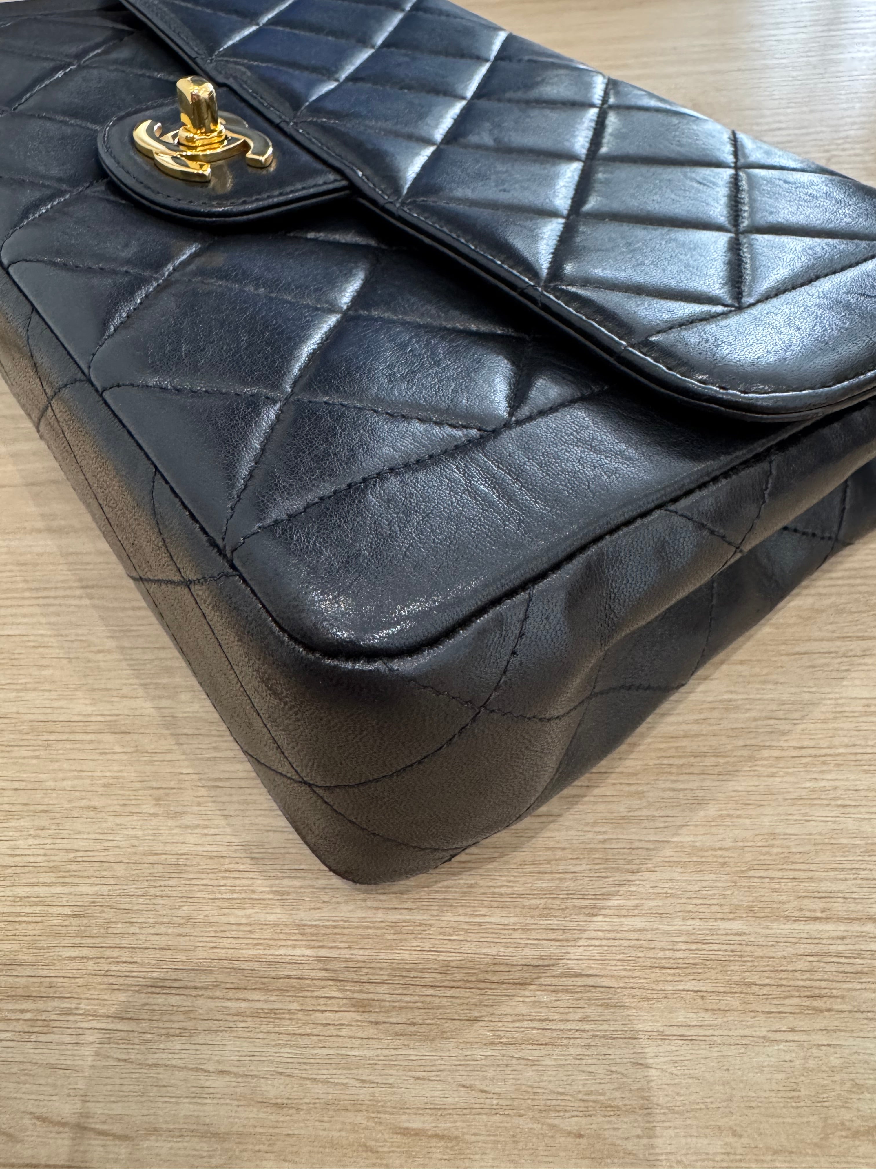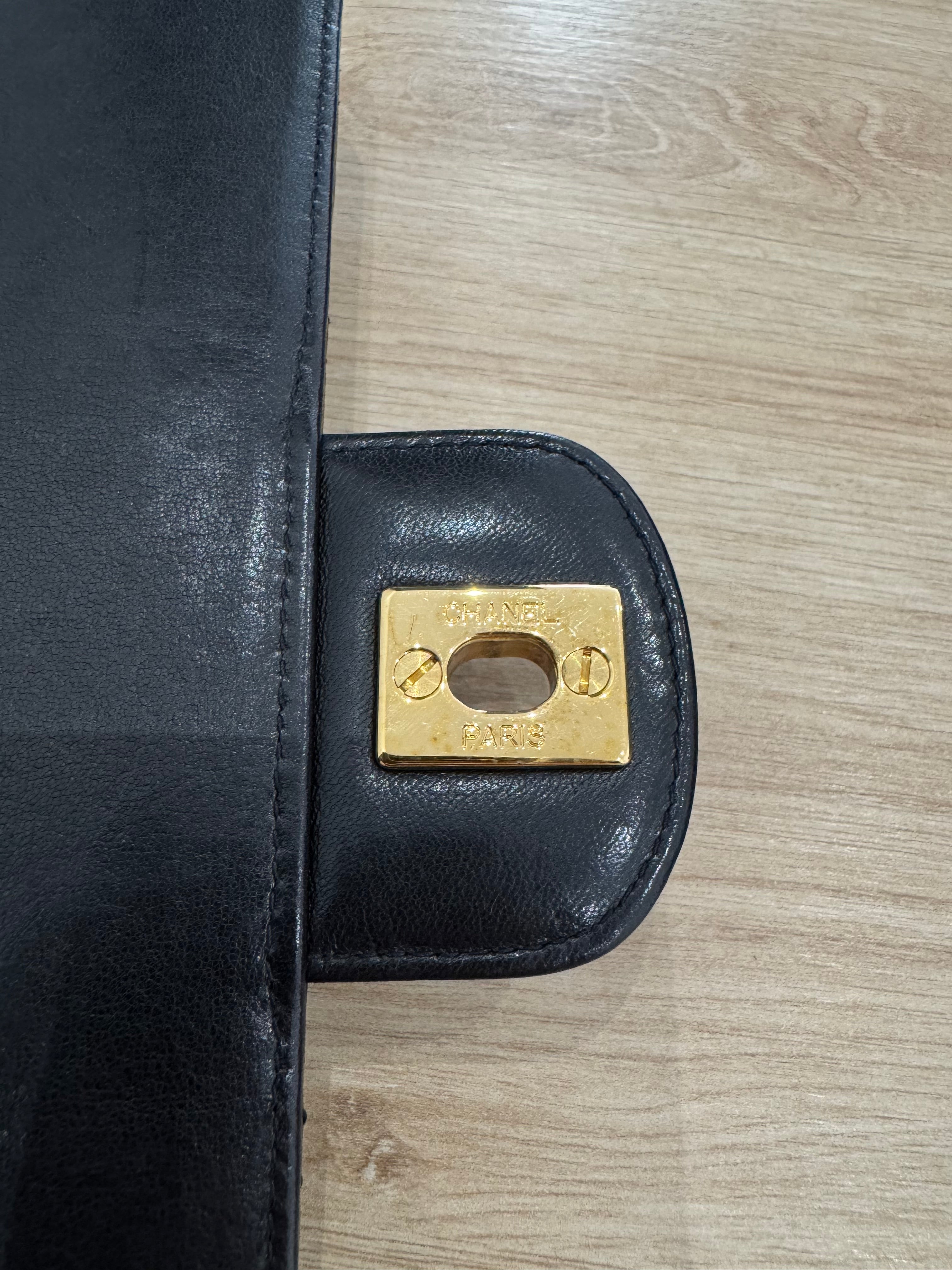Le Sac Chanel Timeless à Rabat Droit, en cuir d'agneau noir et bijouterie plaqué or 24 carats, est en très bon état. C'est un magnifique vintage.