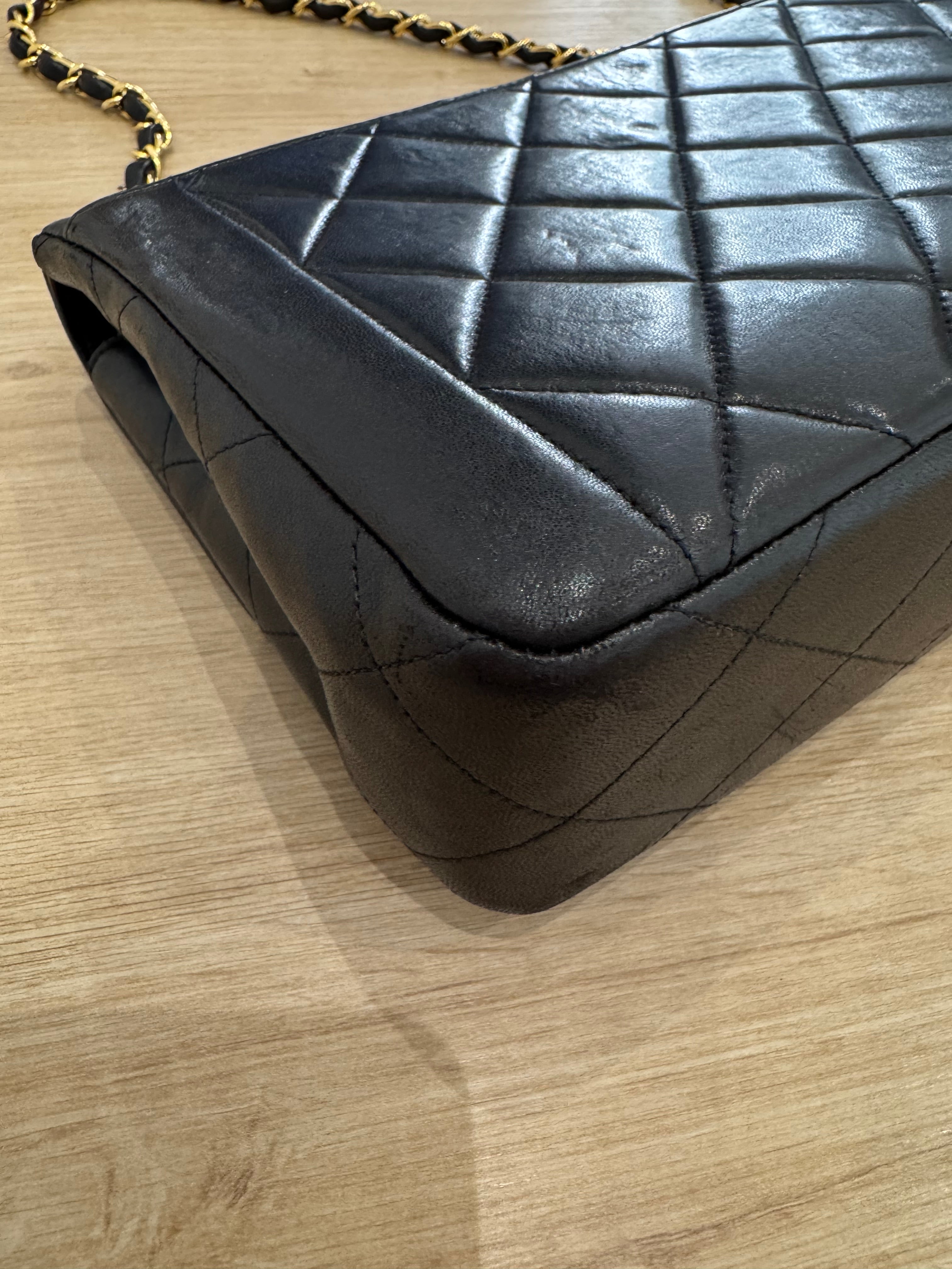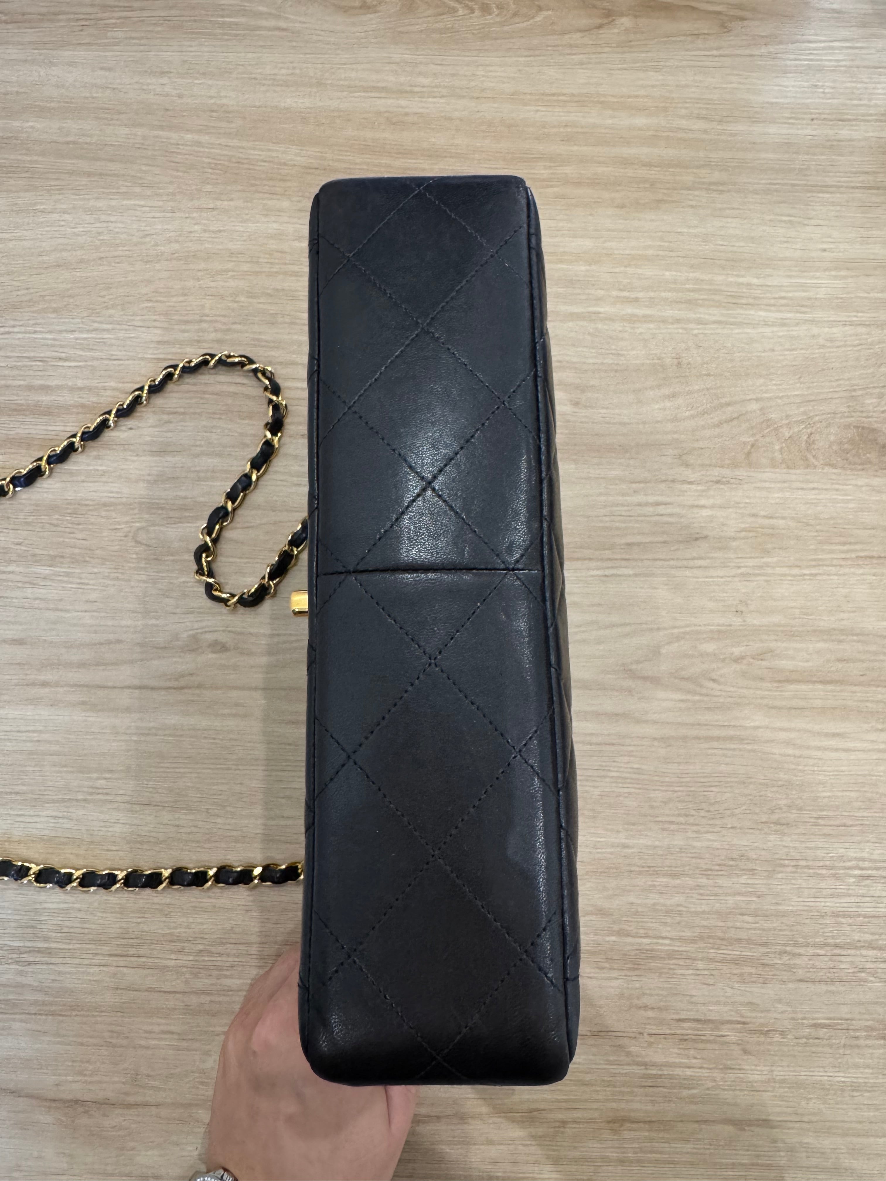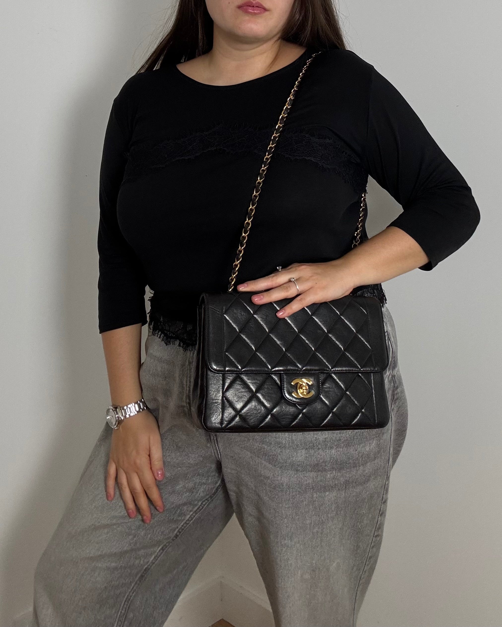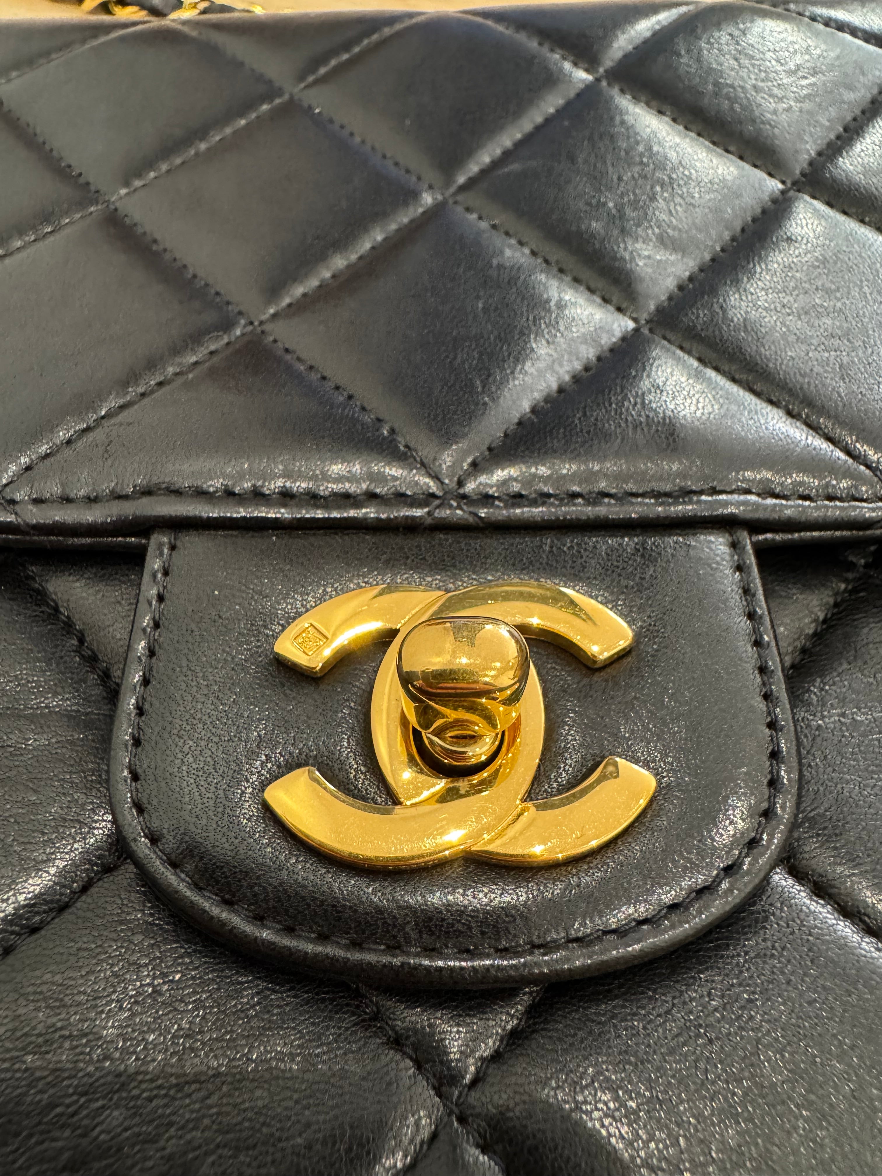 Le Sac Chanel Timeless à Rabat Droit, en cuir d'agneau noir et bijouterie plaqué or 24 carats, est en très bon état. C'est un magnifique vintage.