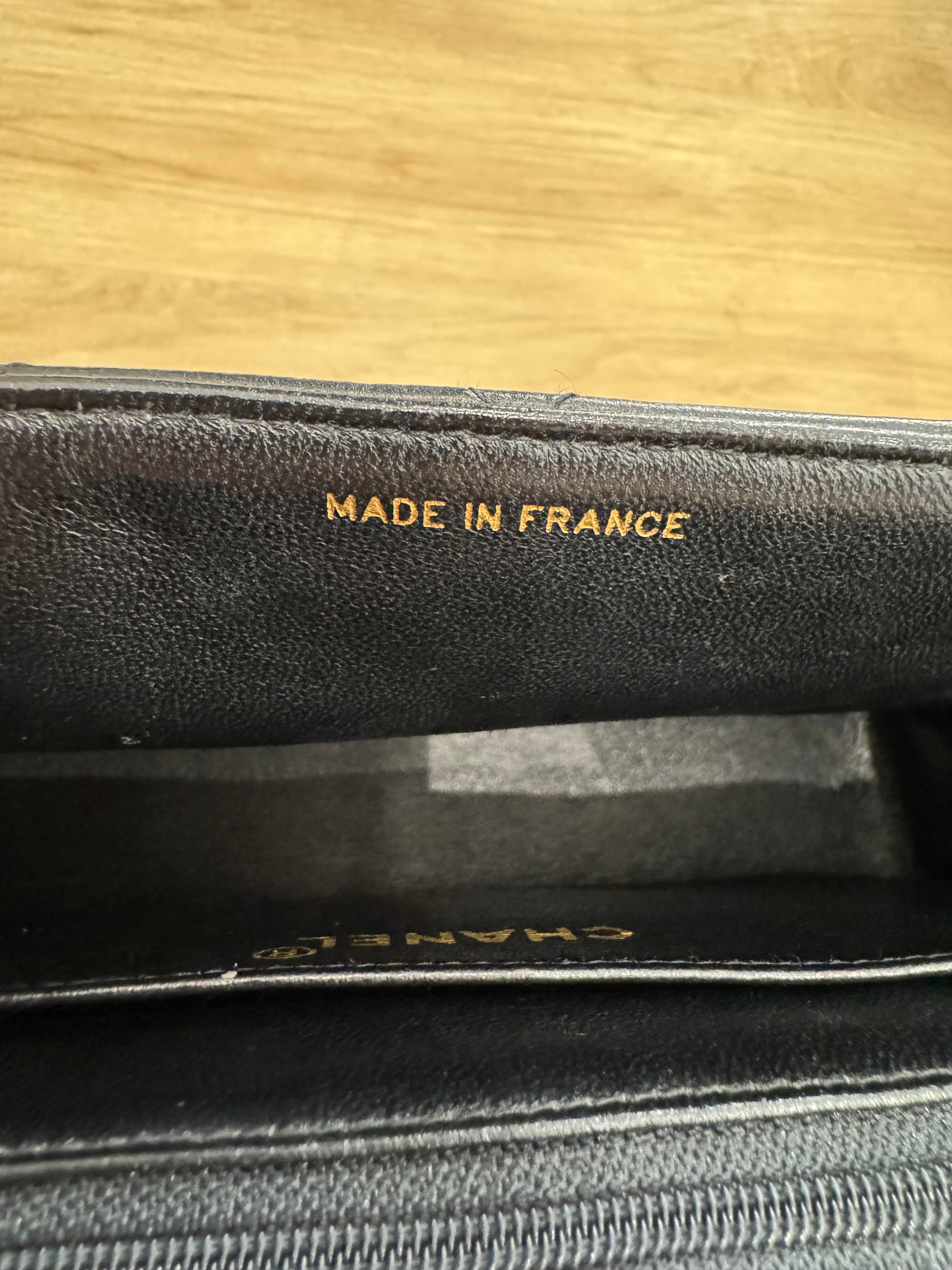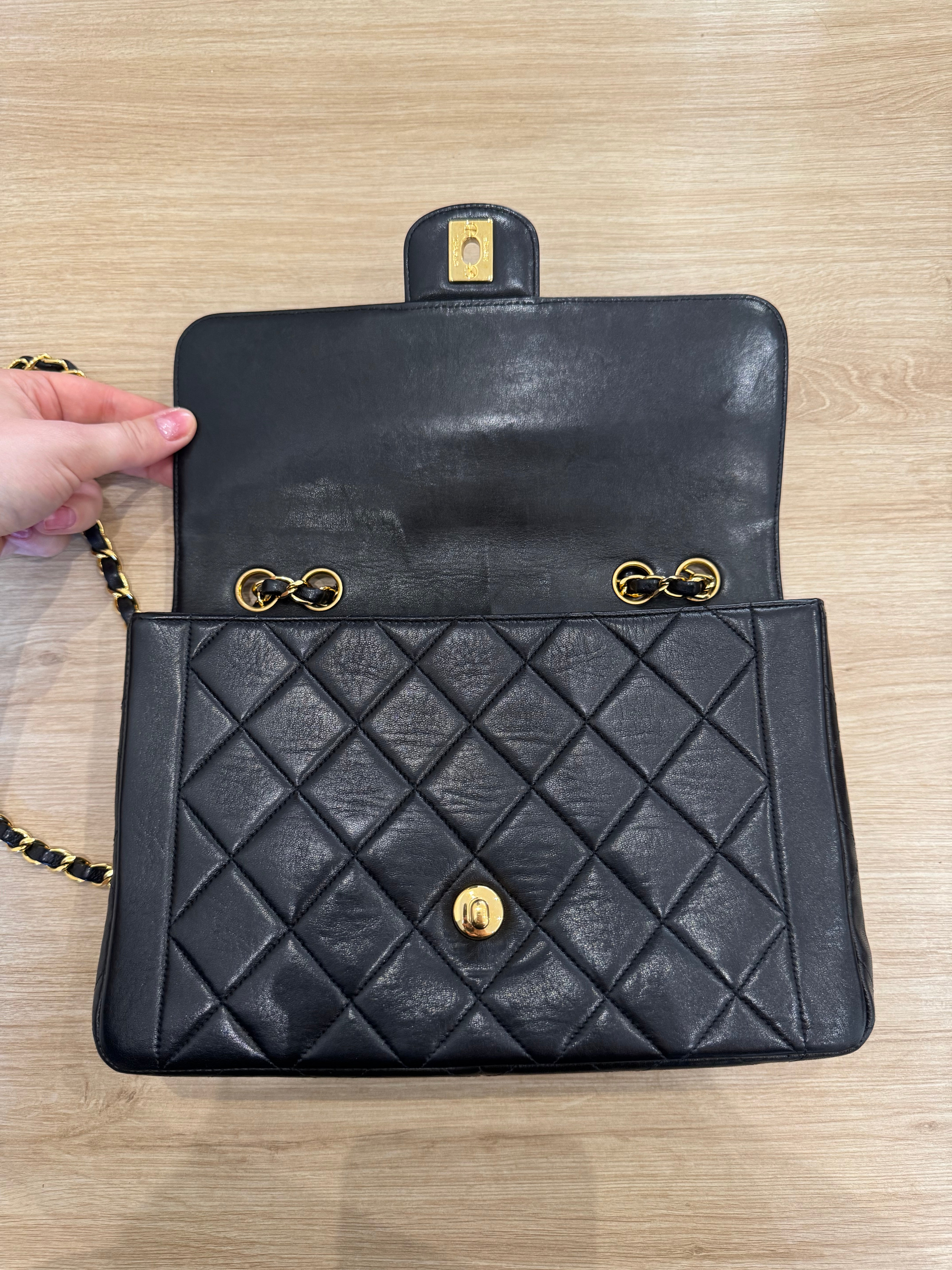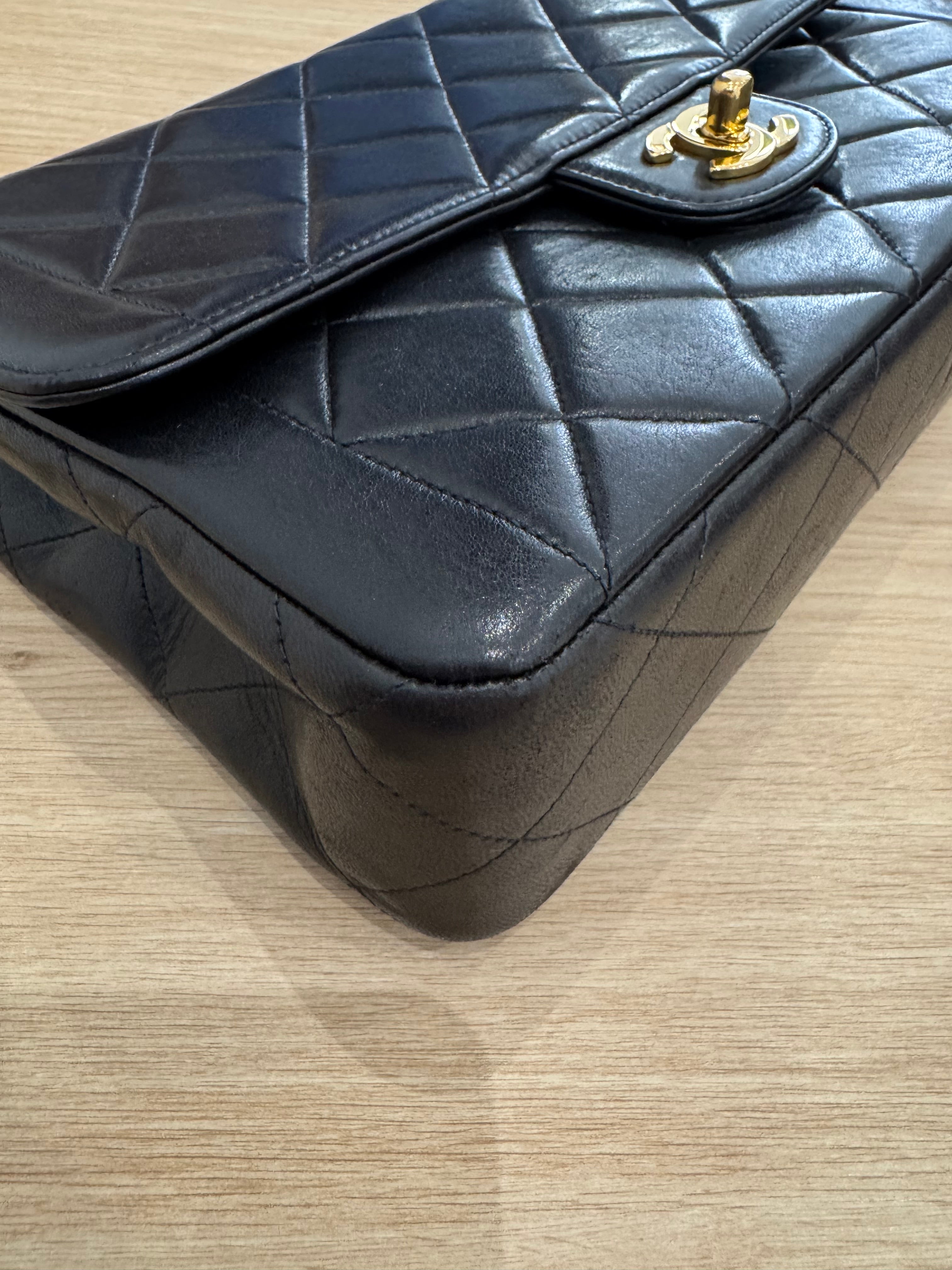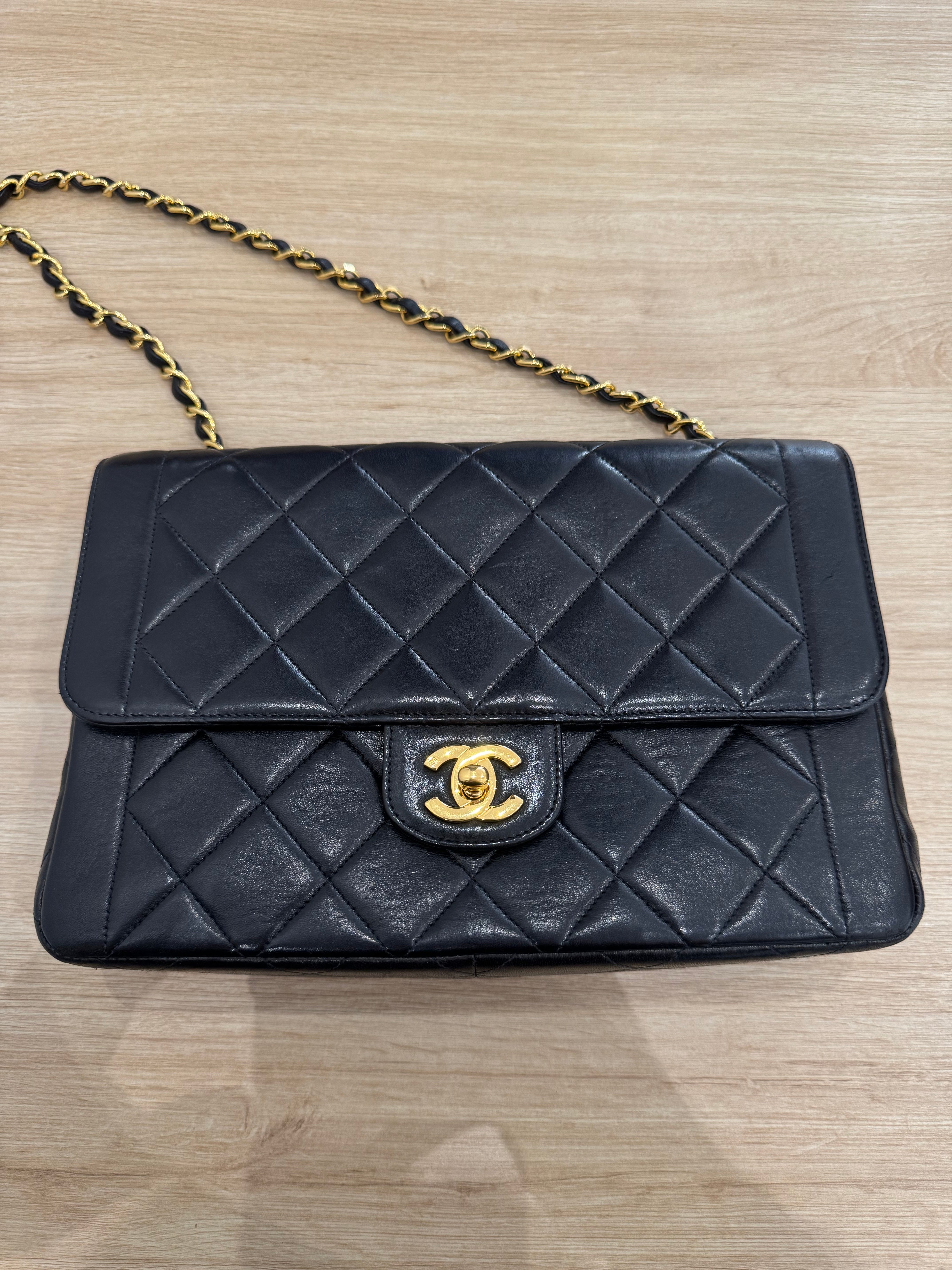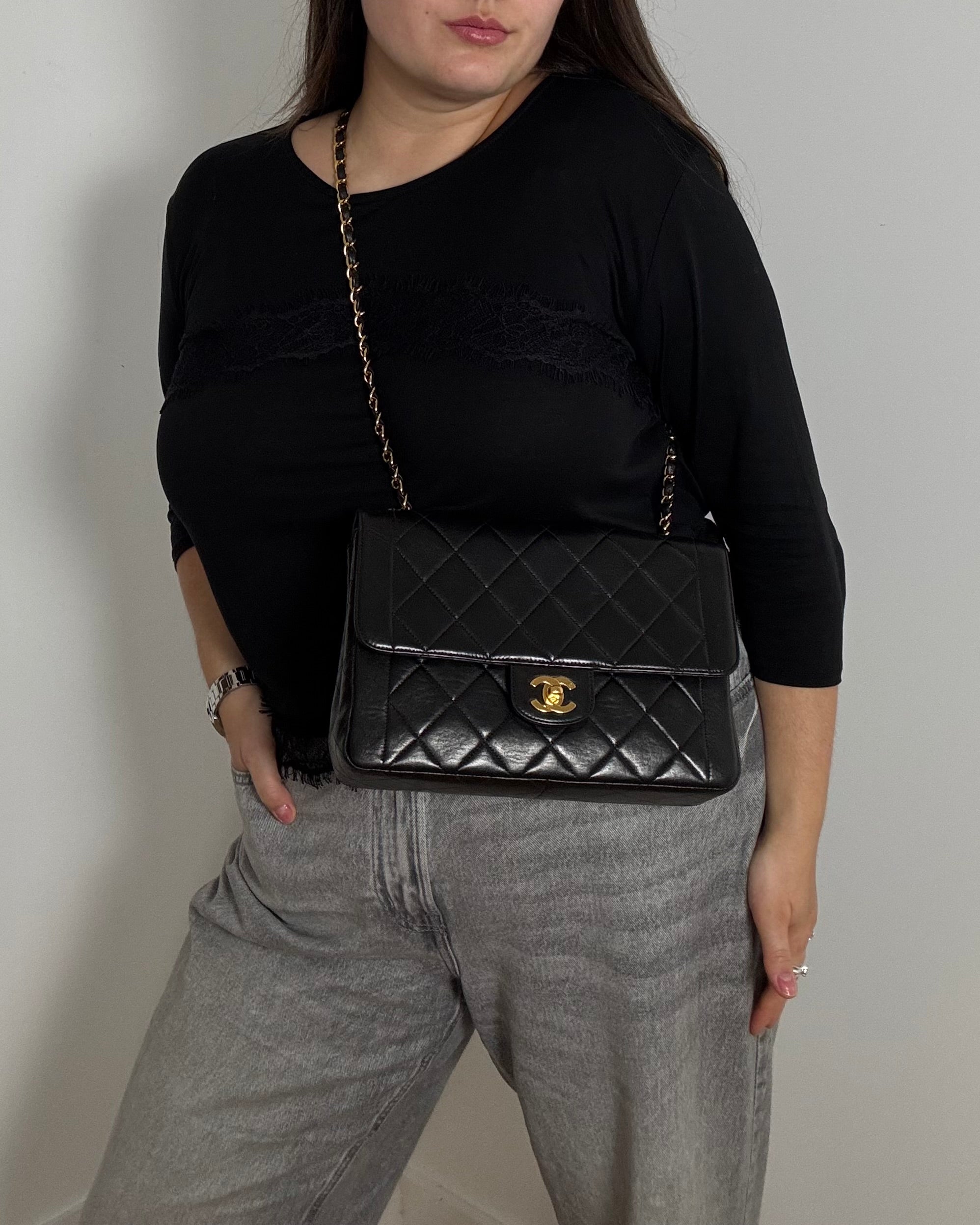 Le Sac Chanel Timeless à Rabat Droit, en cuir d'agneau noir et bijouterie plaqué or 24 carats, est en très bon état. C'est un magnifique vintage.