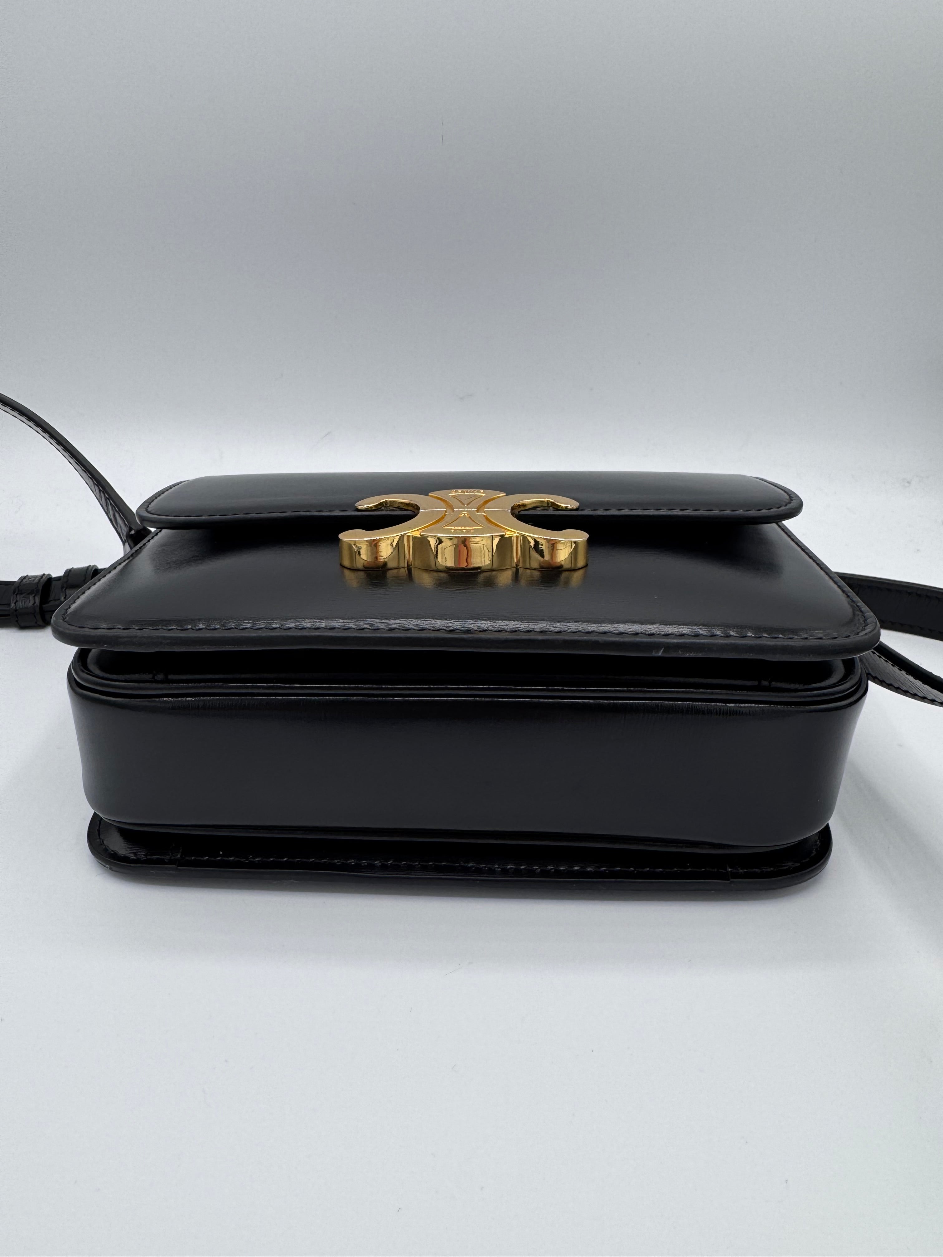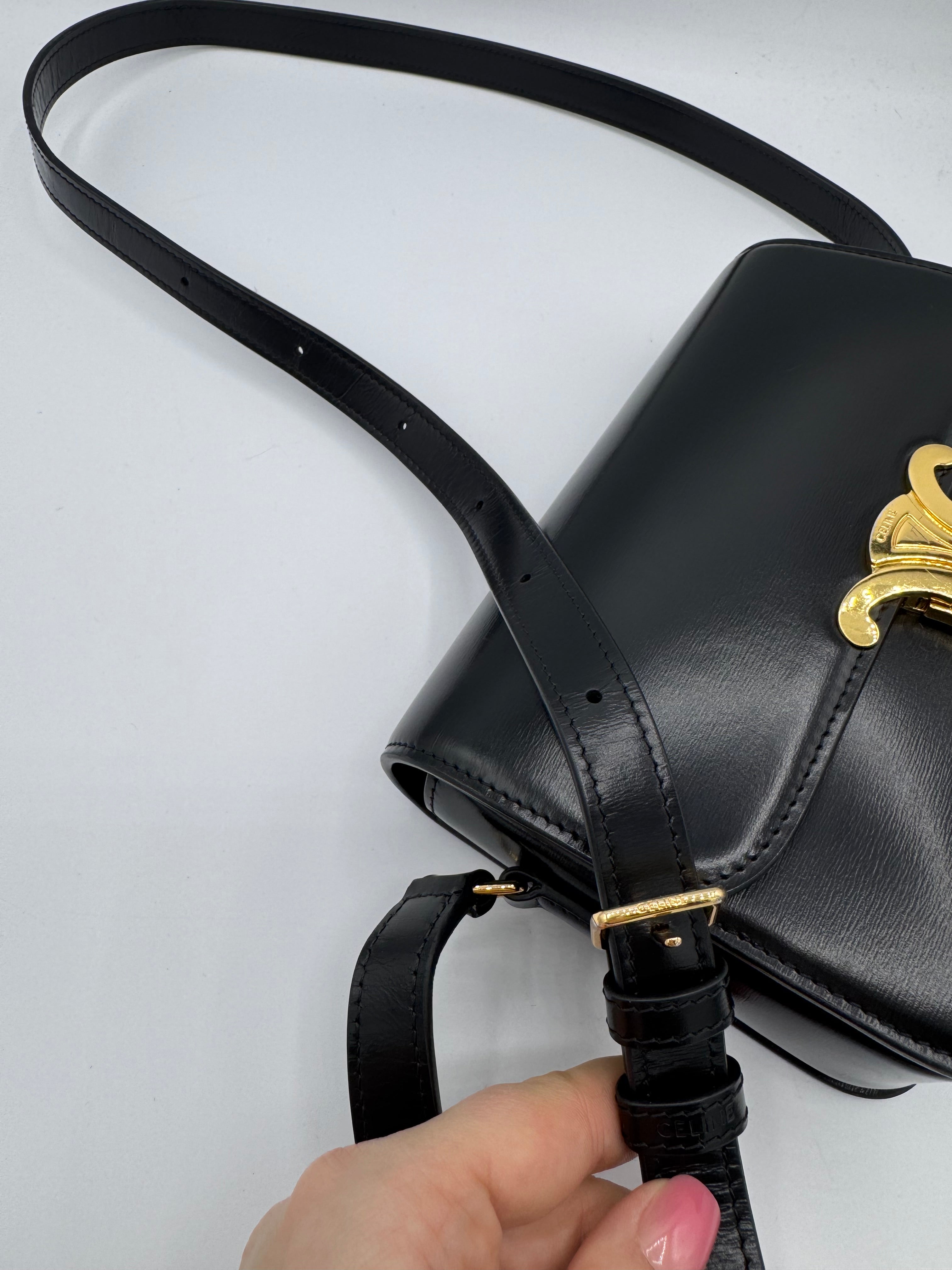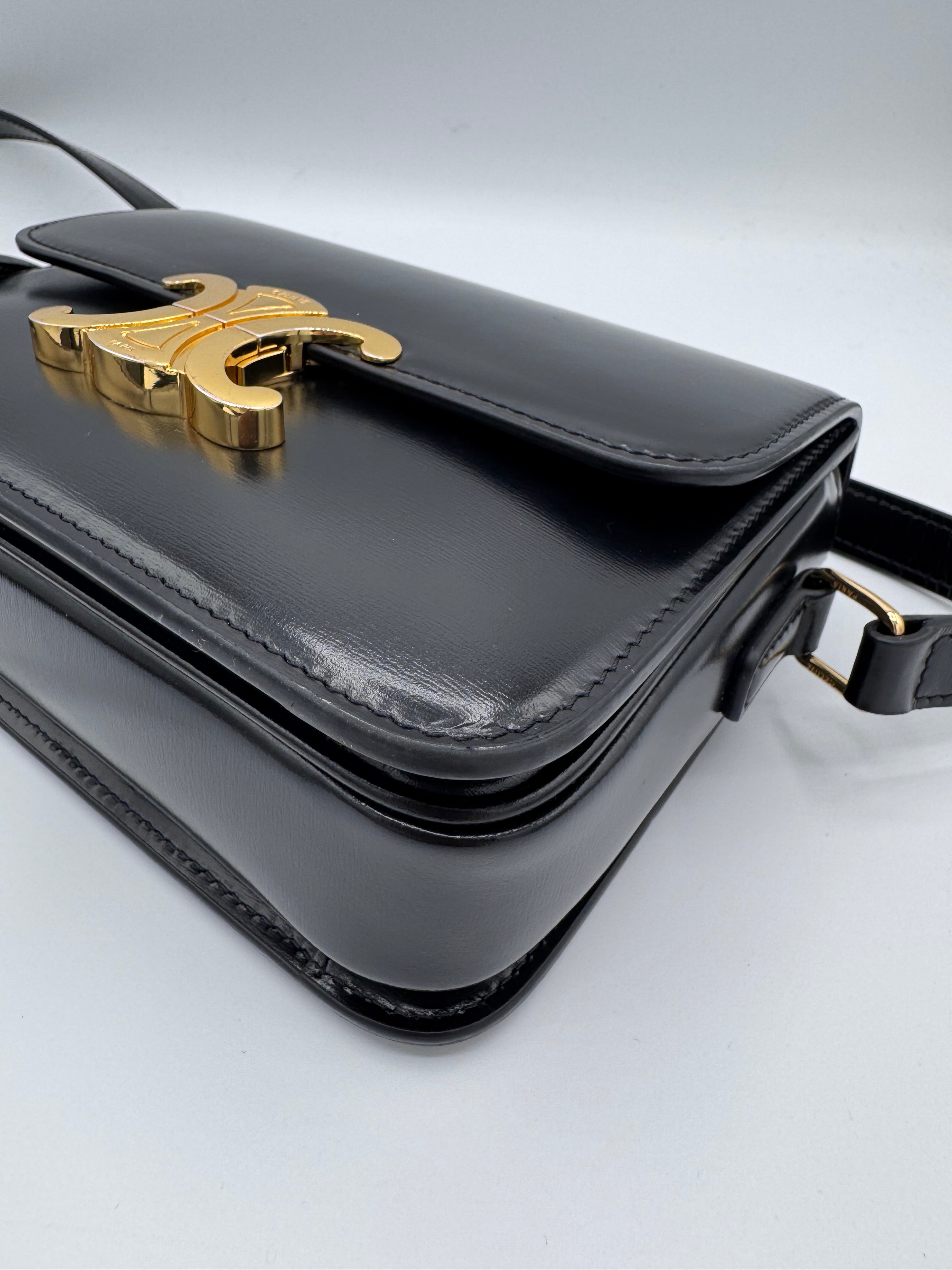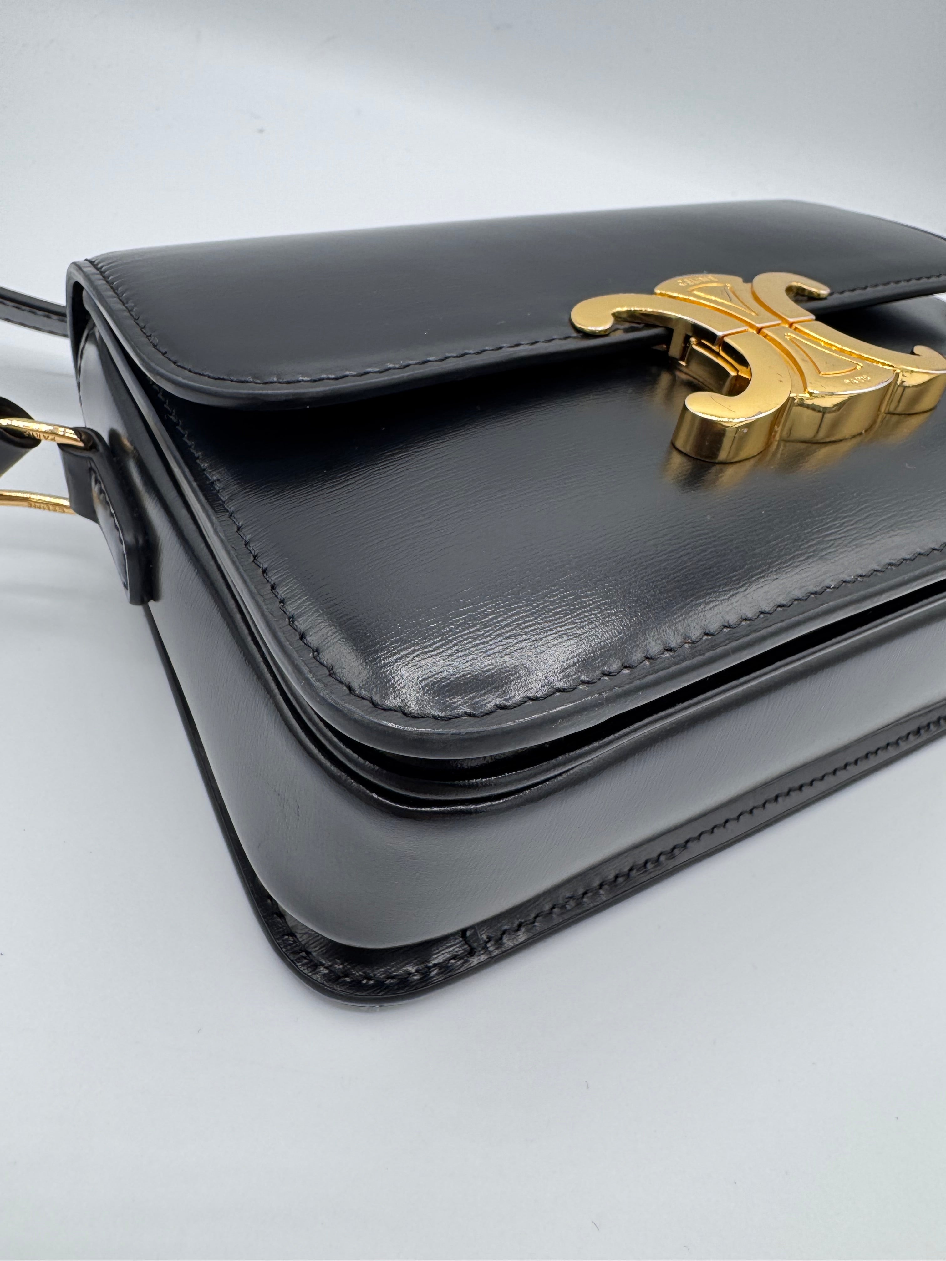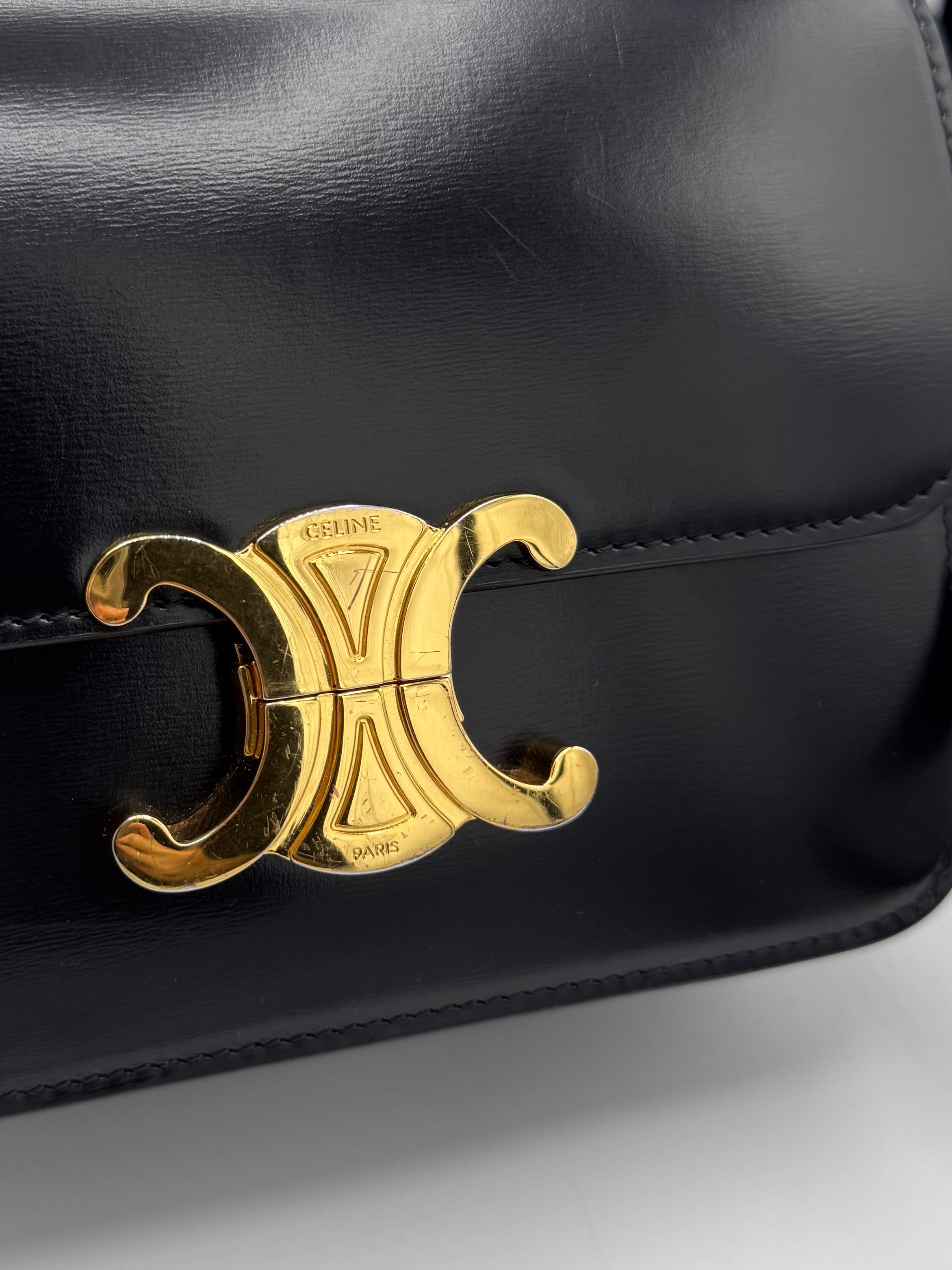 Sac Triomphe Teen de chez Céline en cuir noir et bijouterie dorée en très bon état.