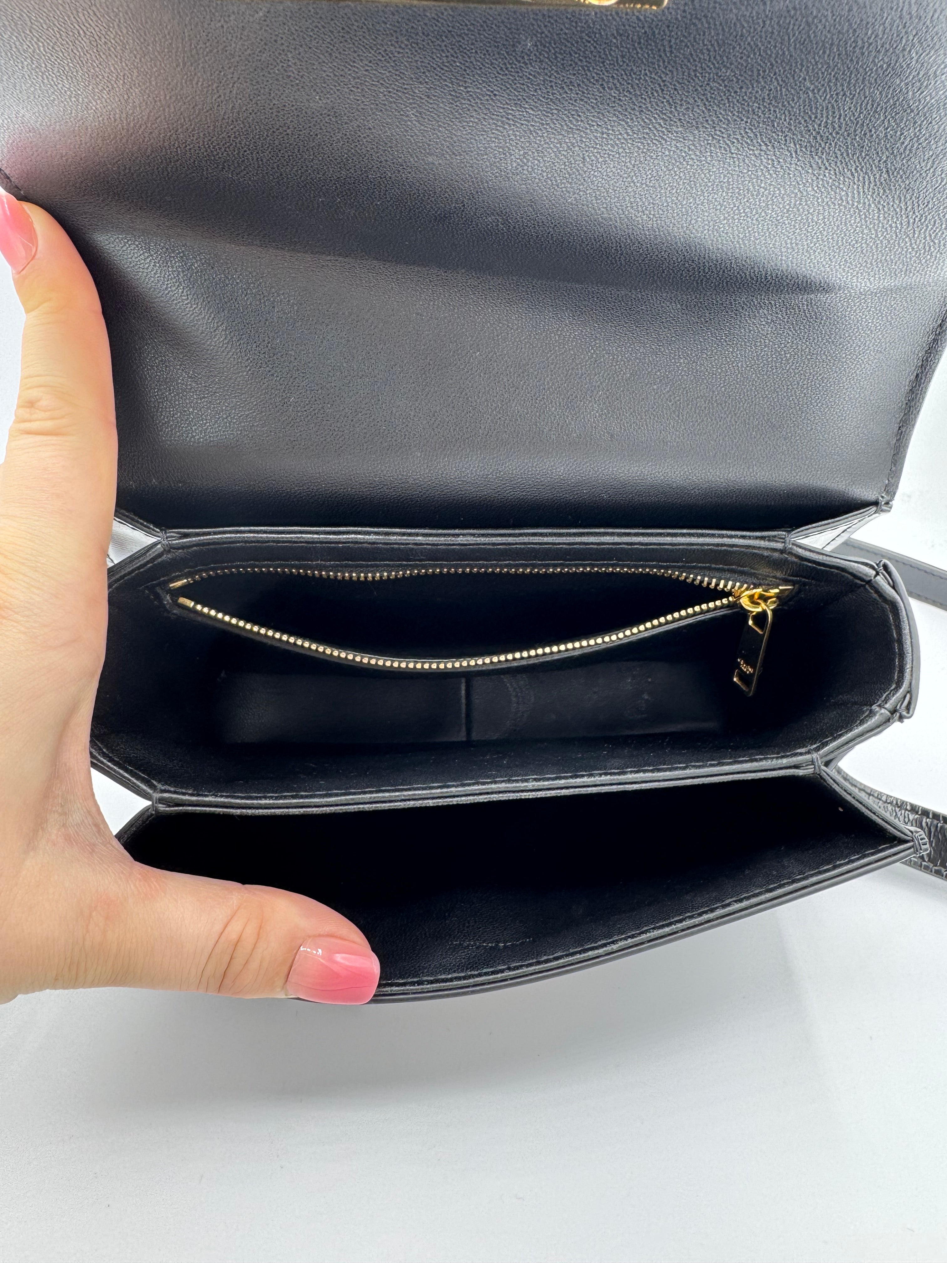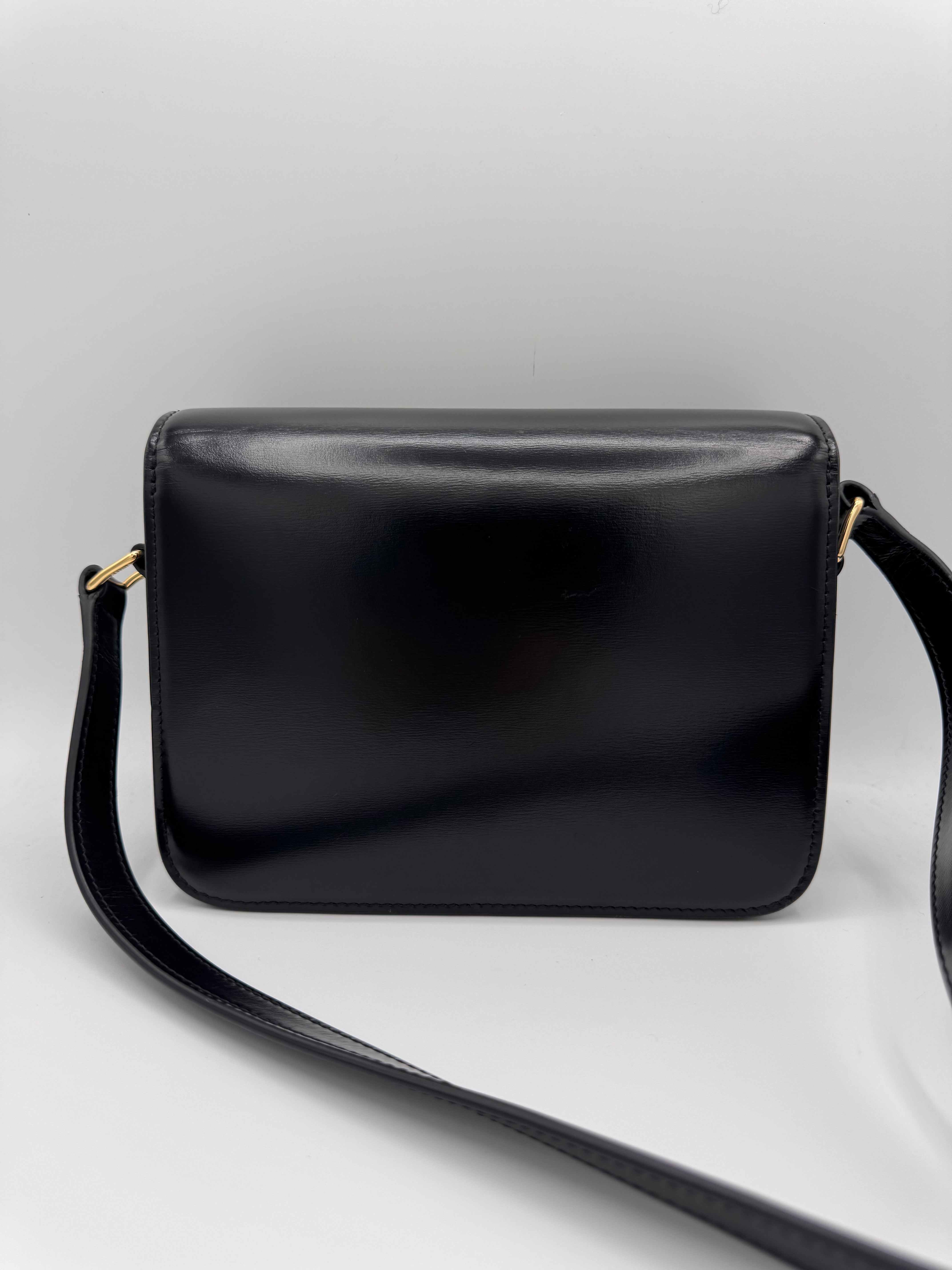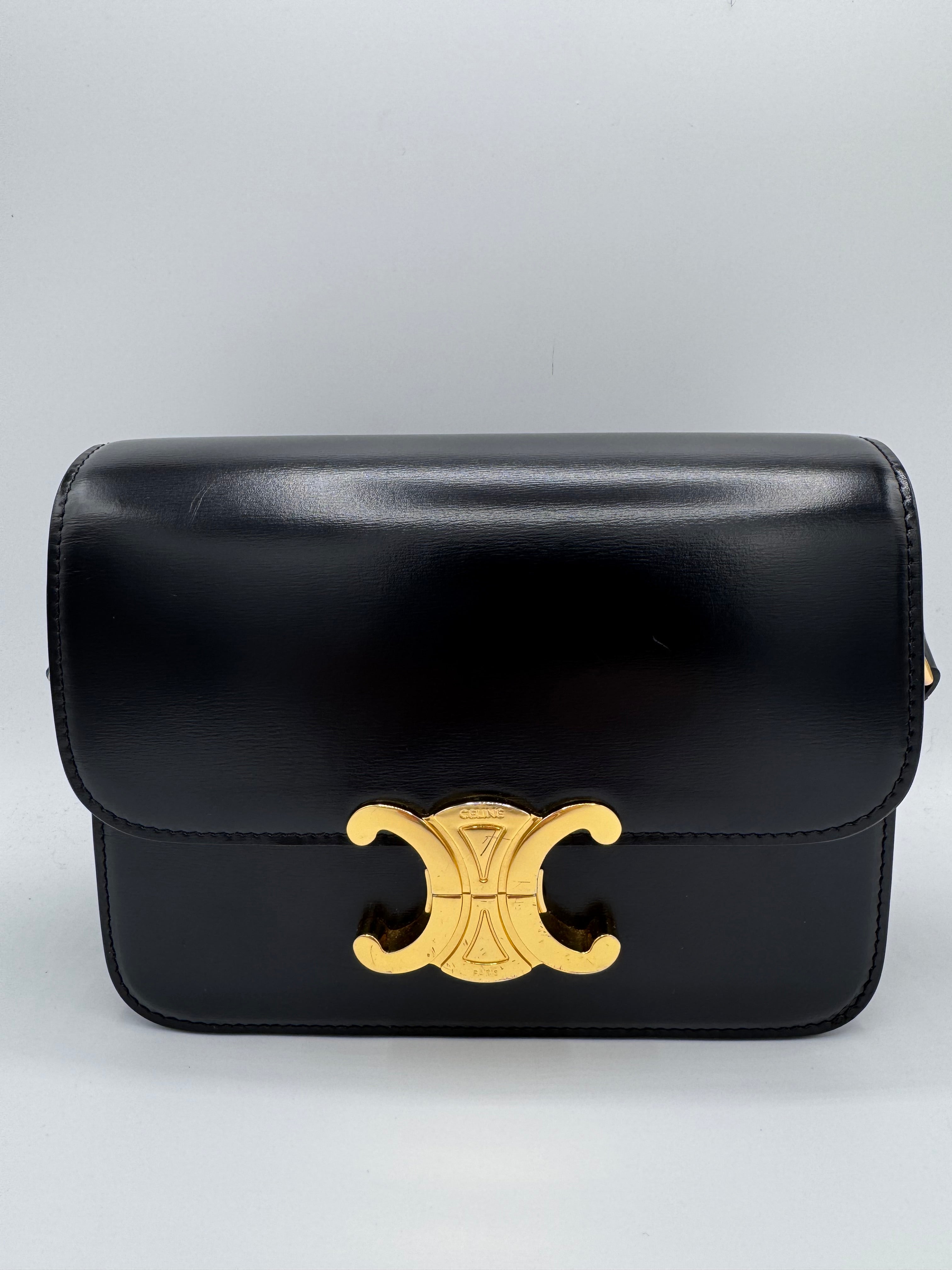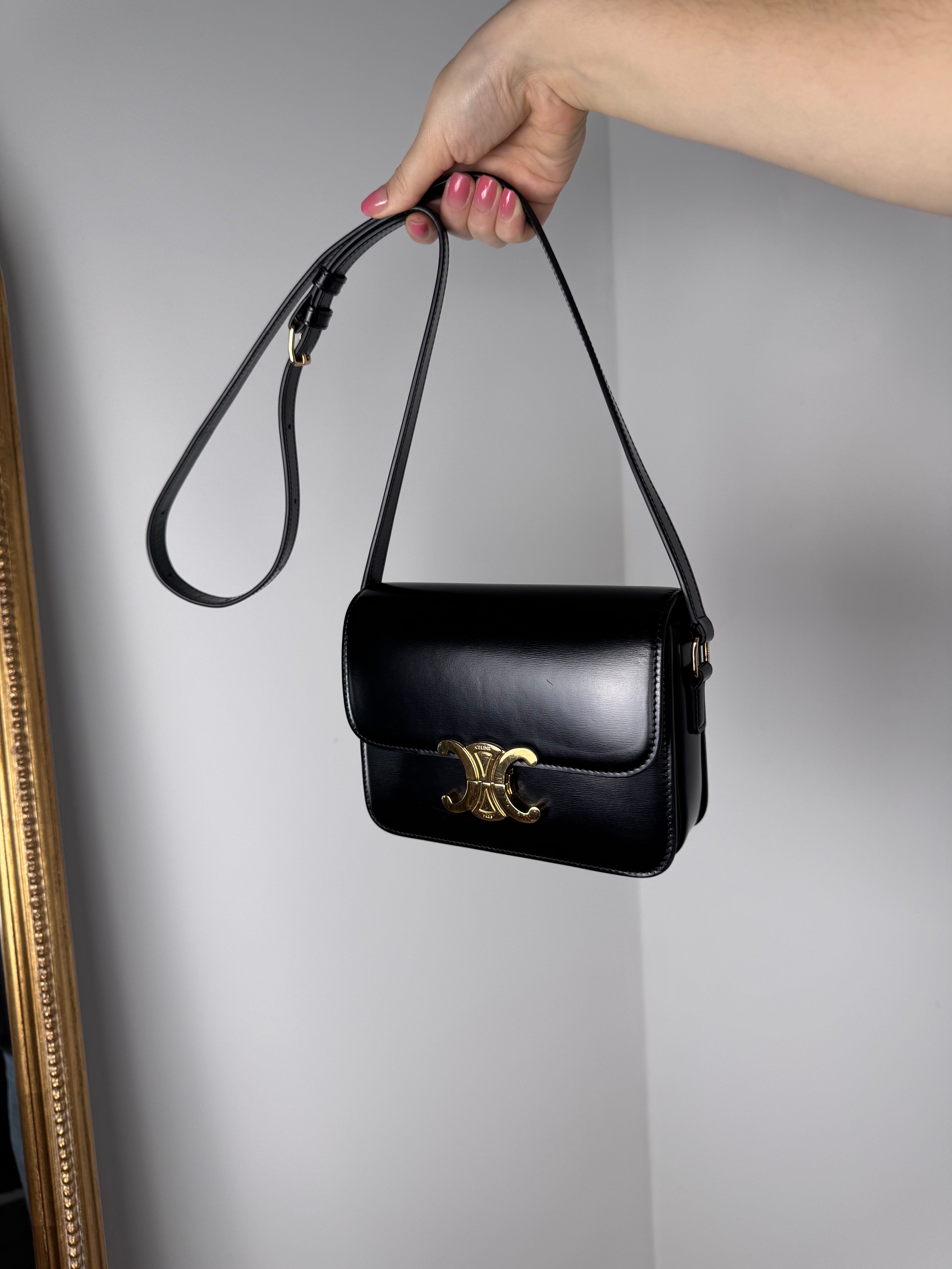 Sac Triomphe Teen de chez Céline en cuir noir et bijouterie dorée en très bon état.