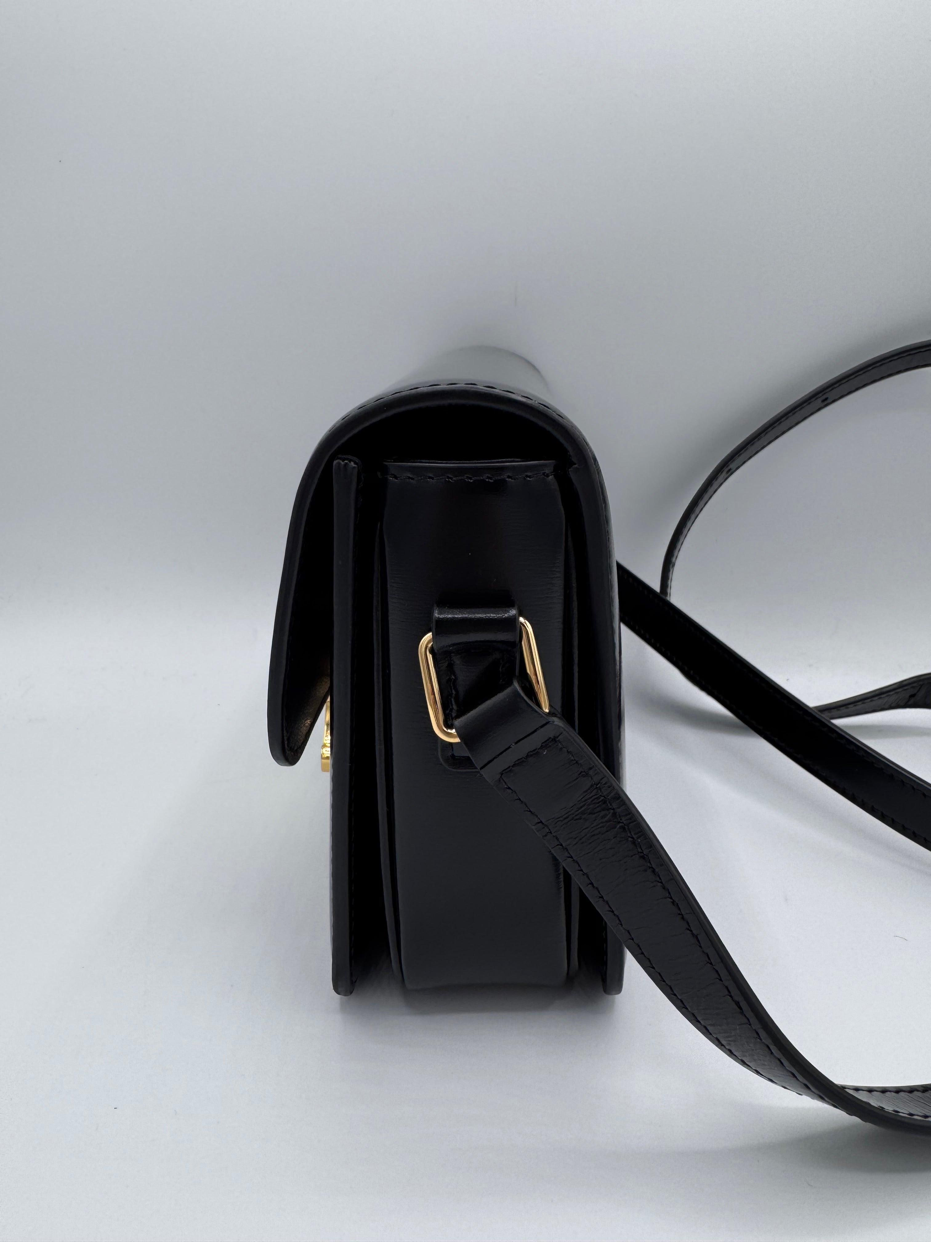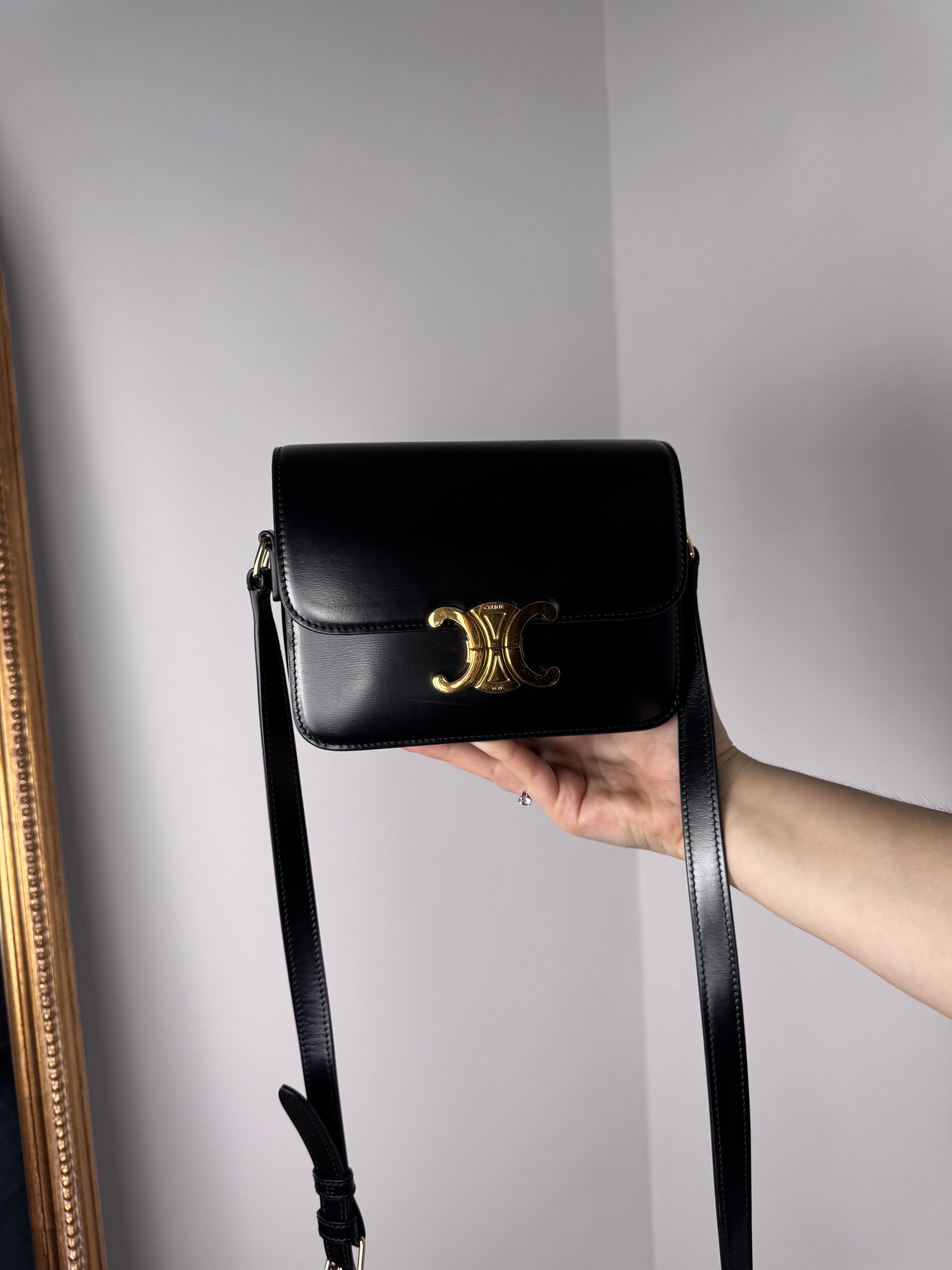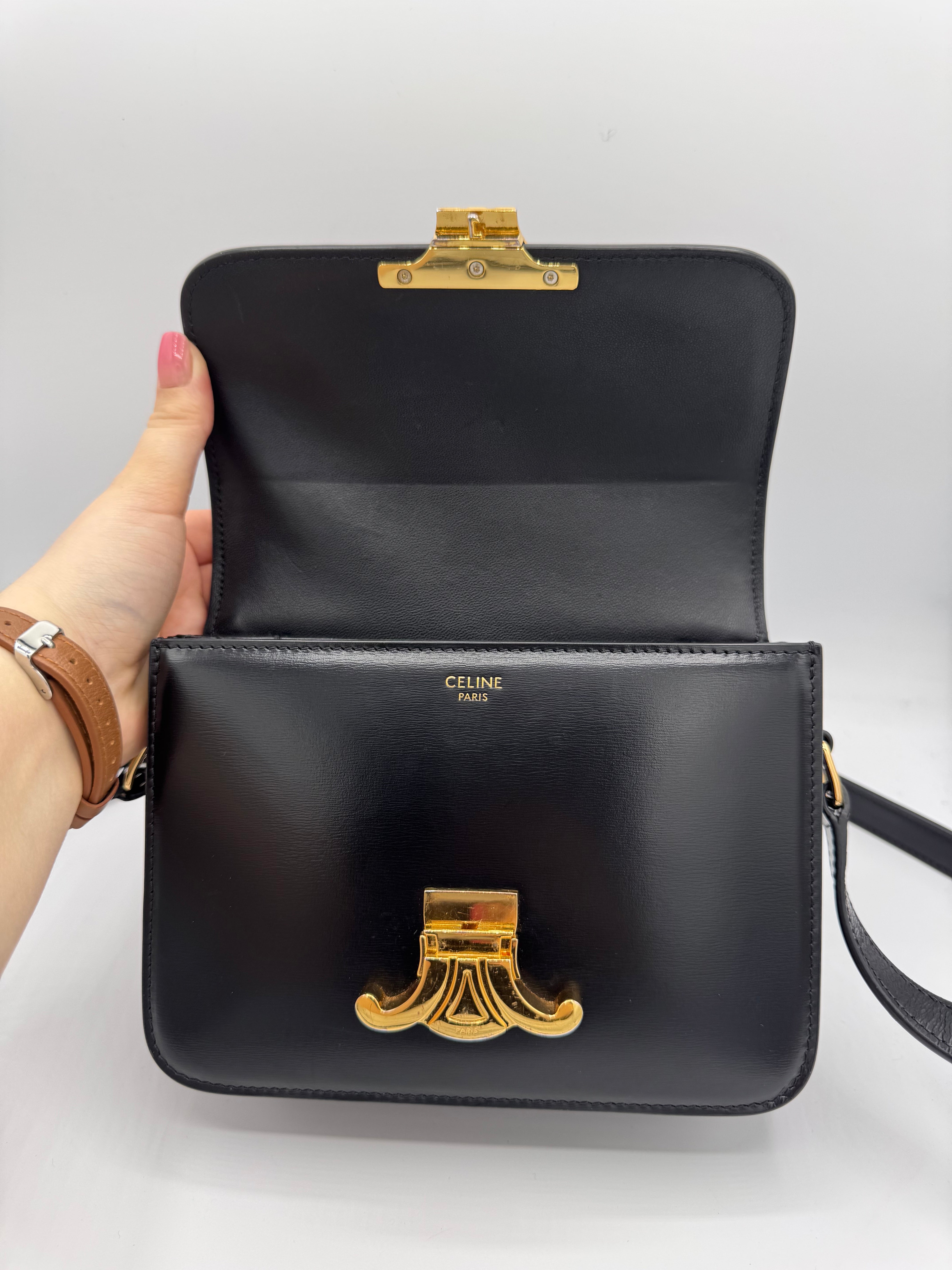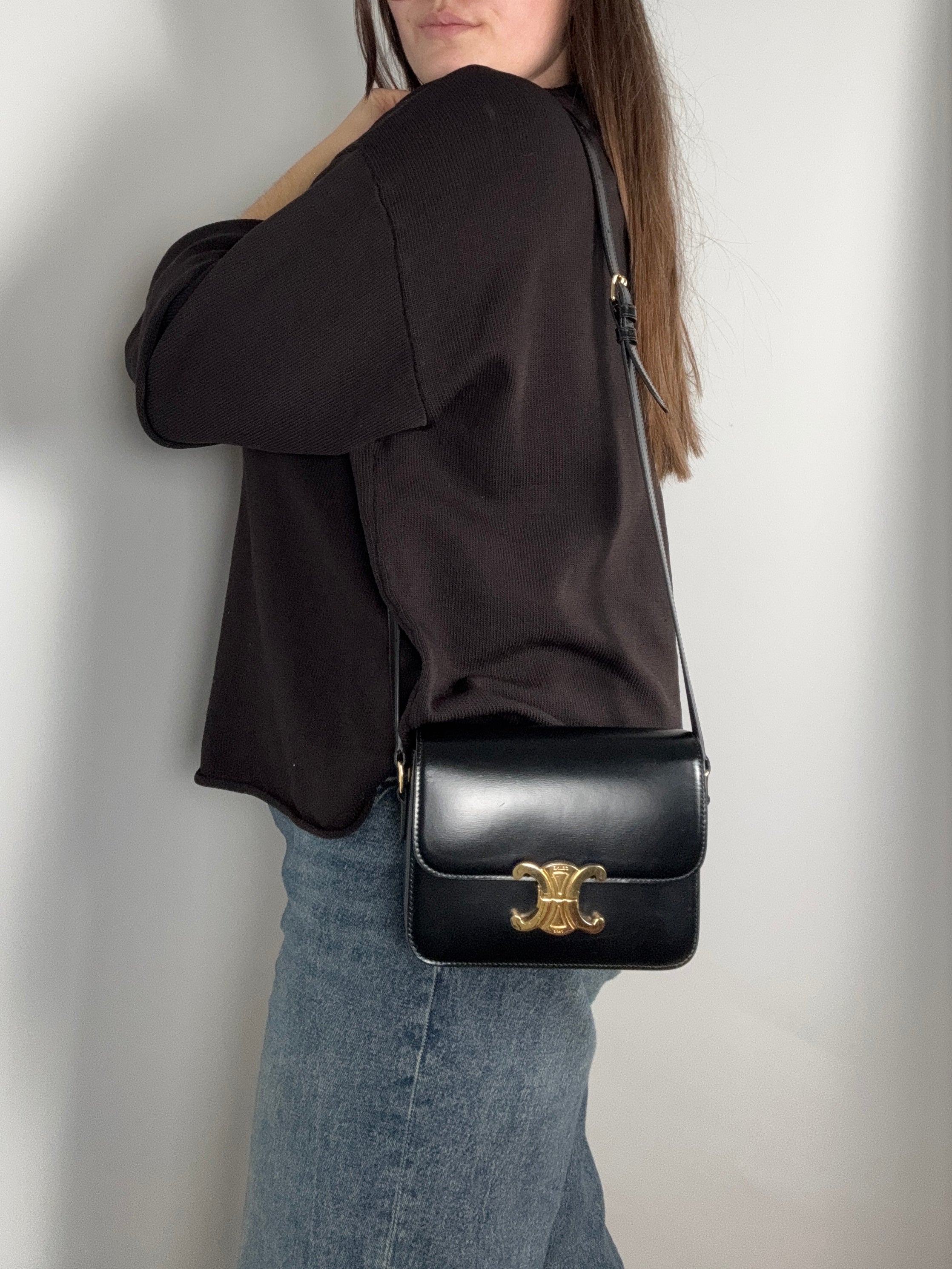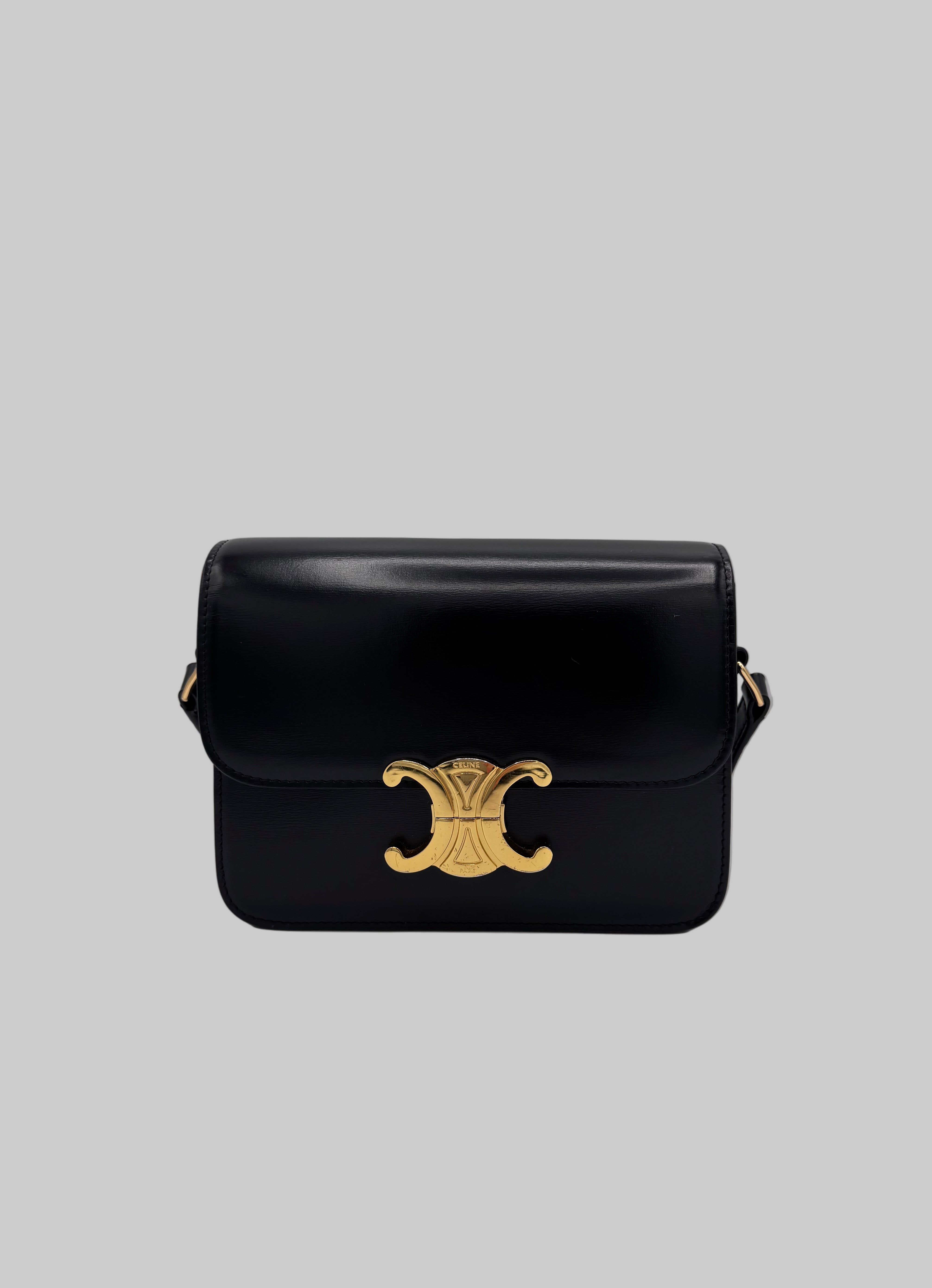 Sac Triomphe Teen de chez Céline en cuir noir et bijouterie dorée en très bon état.