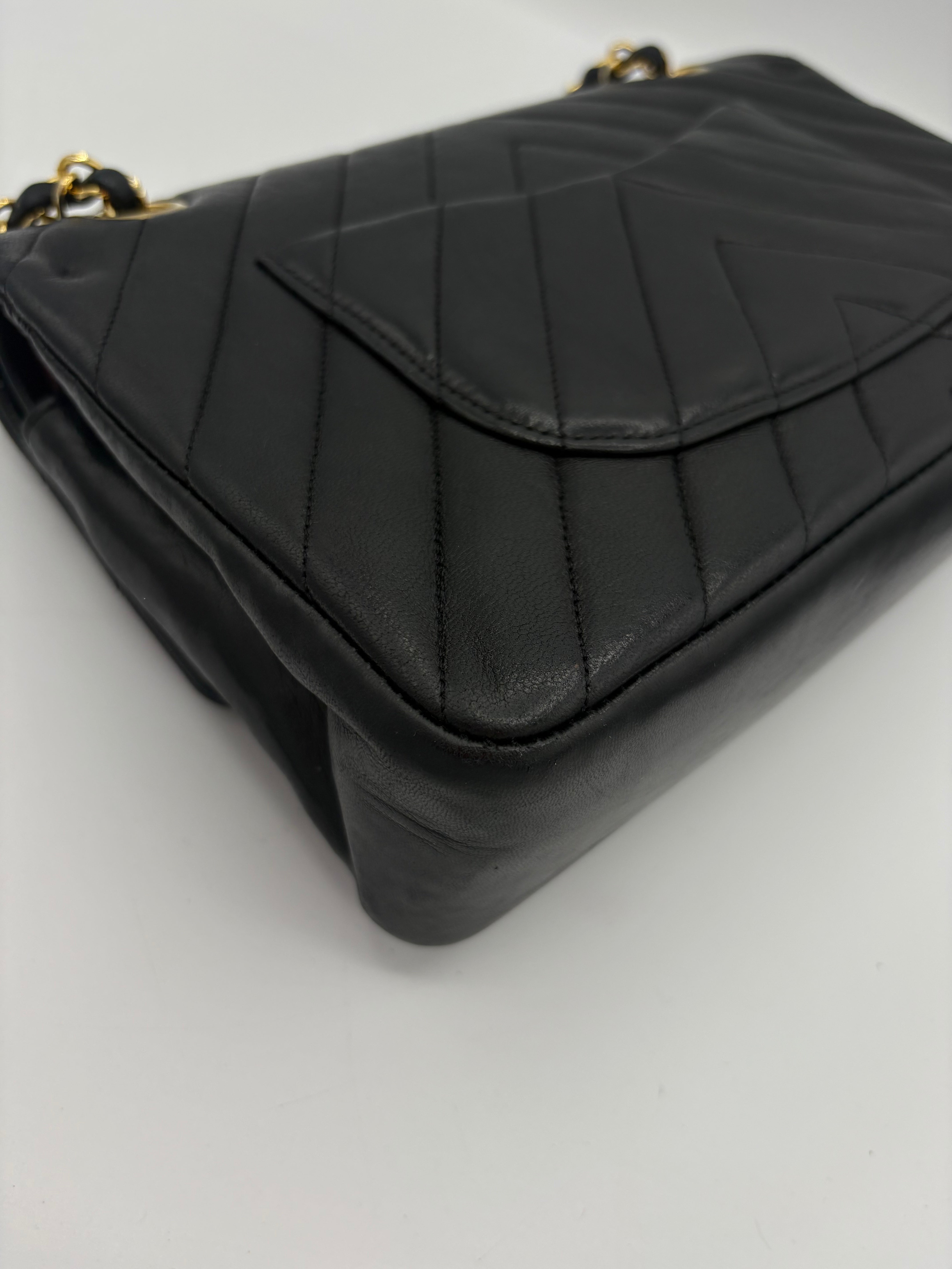 Sac caméra à motifs chevrons en cuir d’agneau noir en très bon état.
