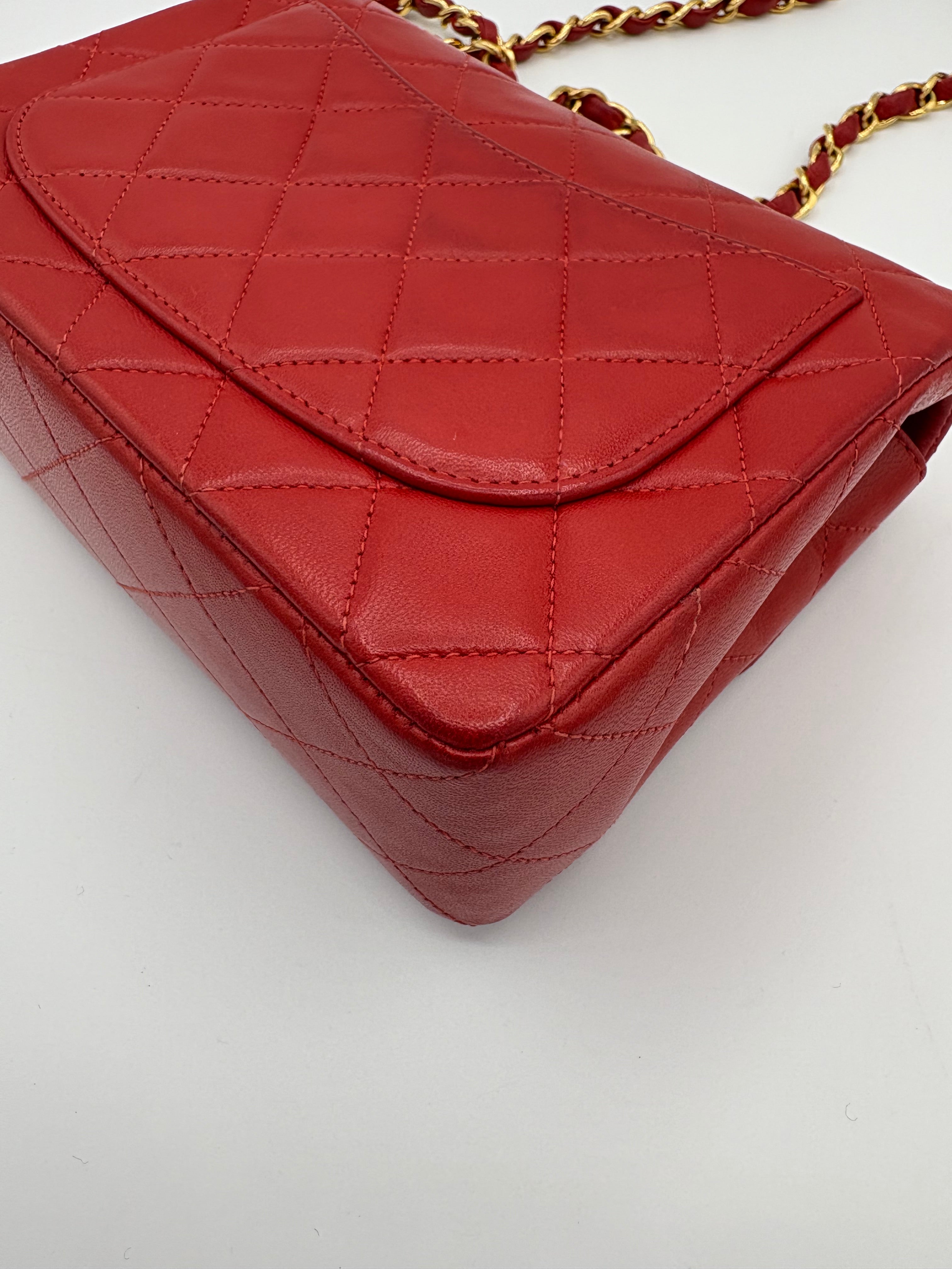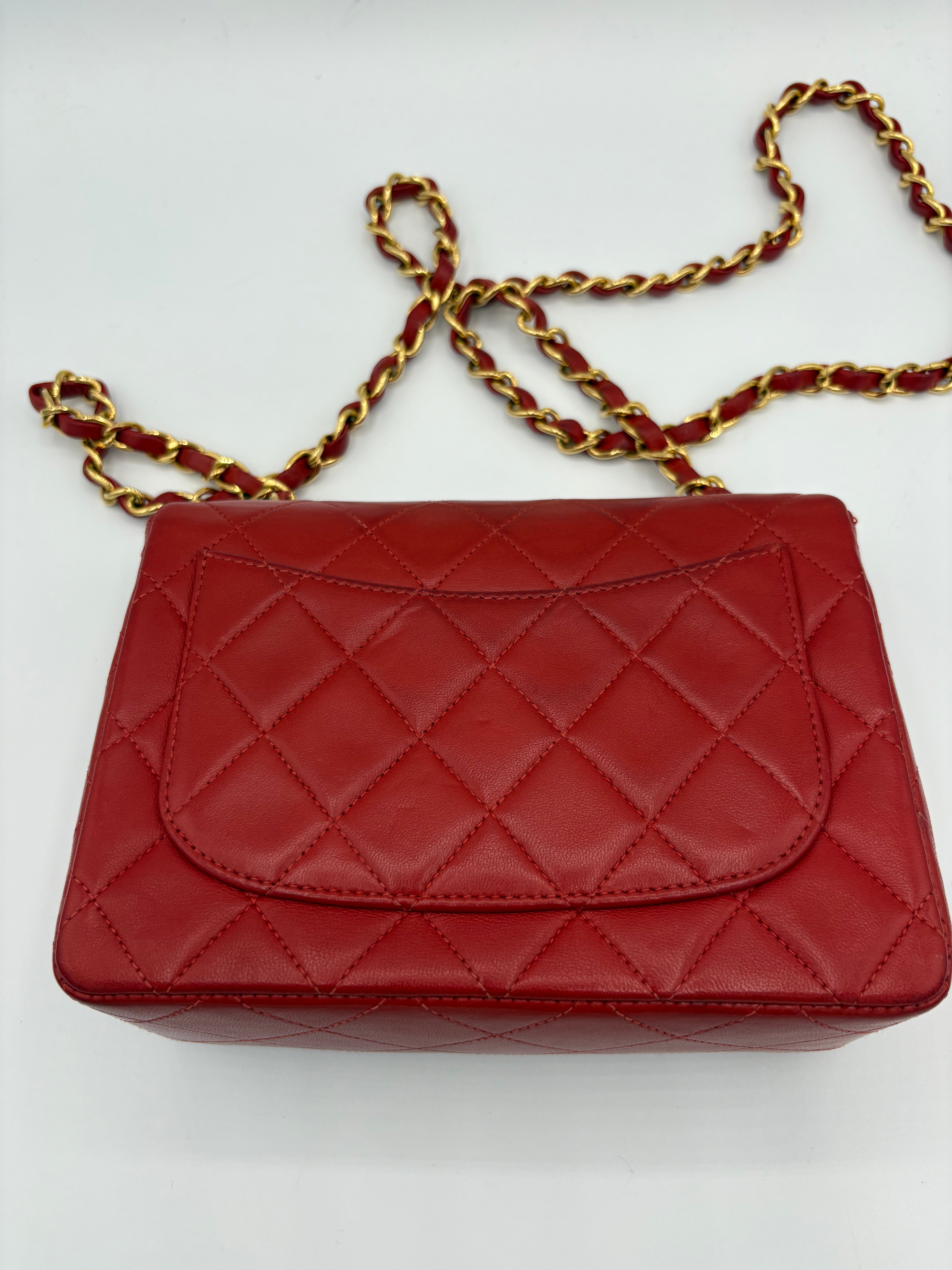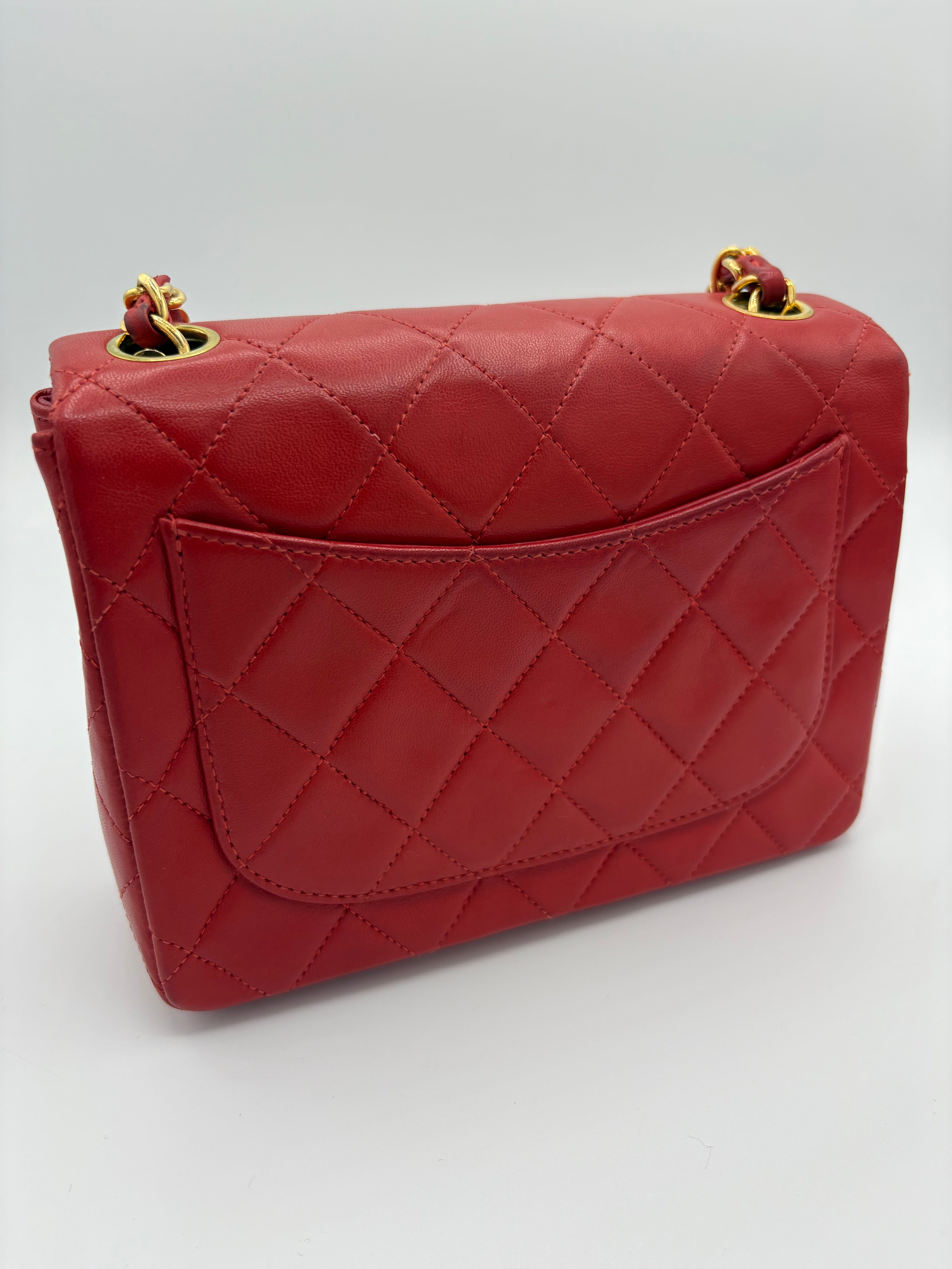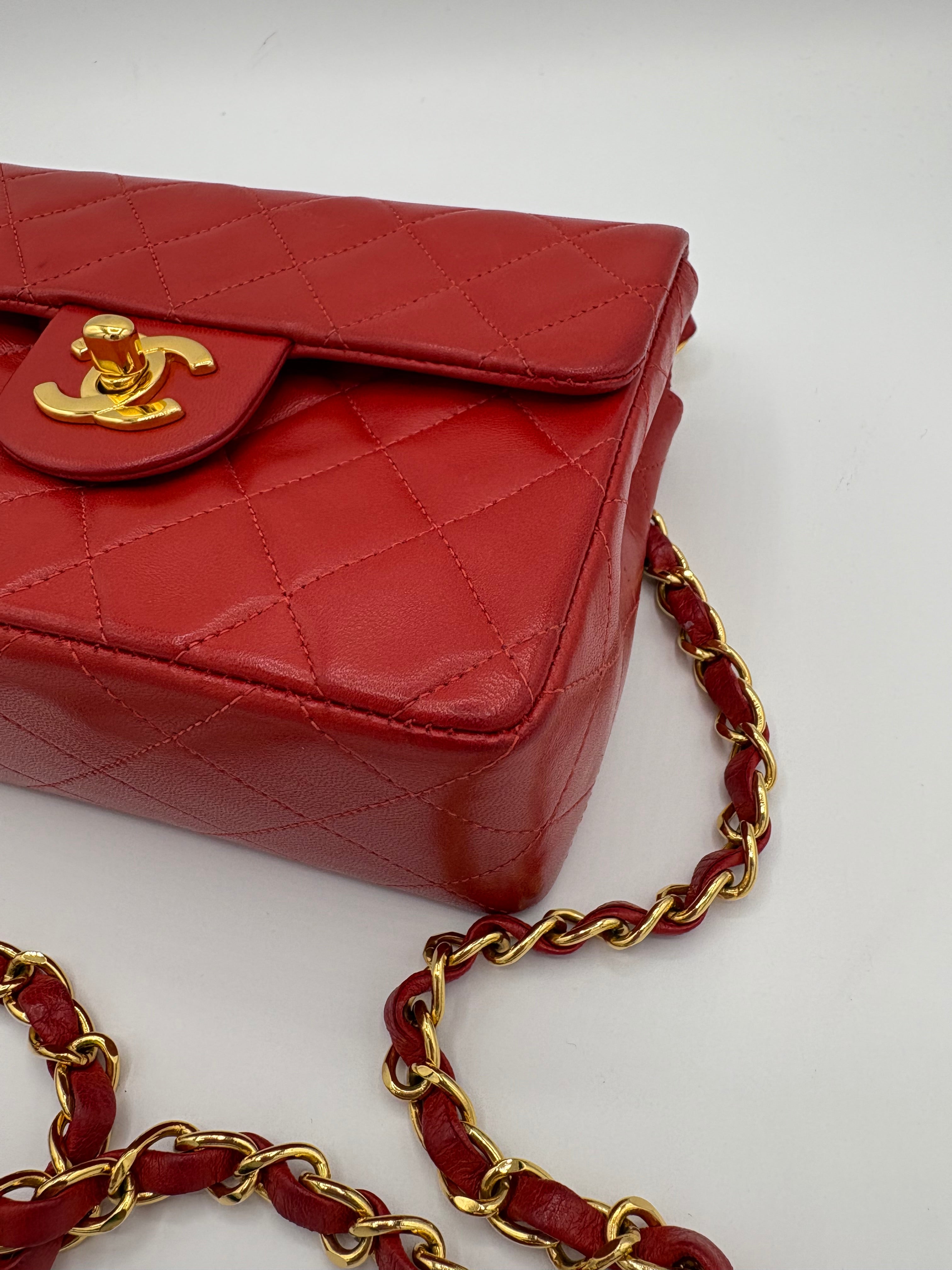 Sac Timeless Mini Square Chanel rouge en très bon état général.
