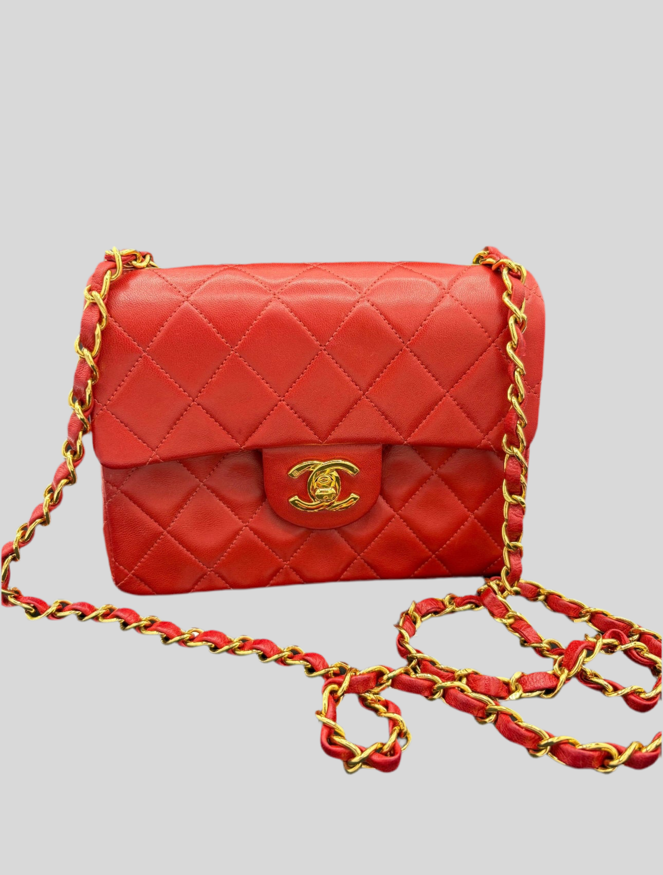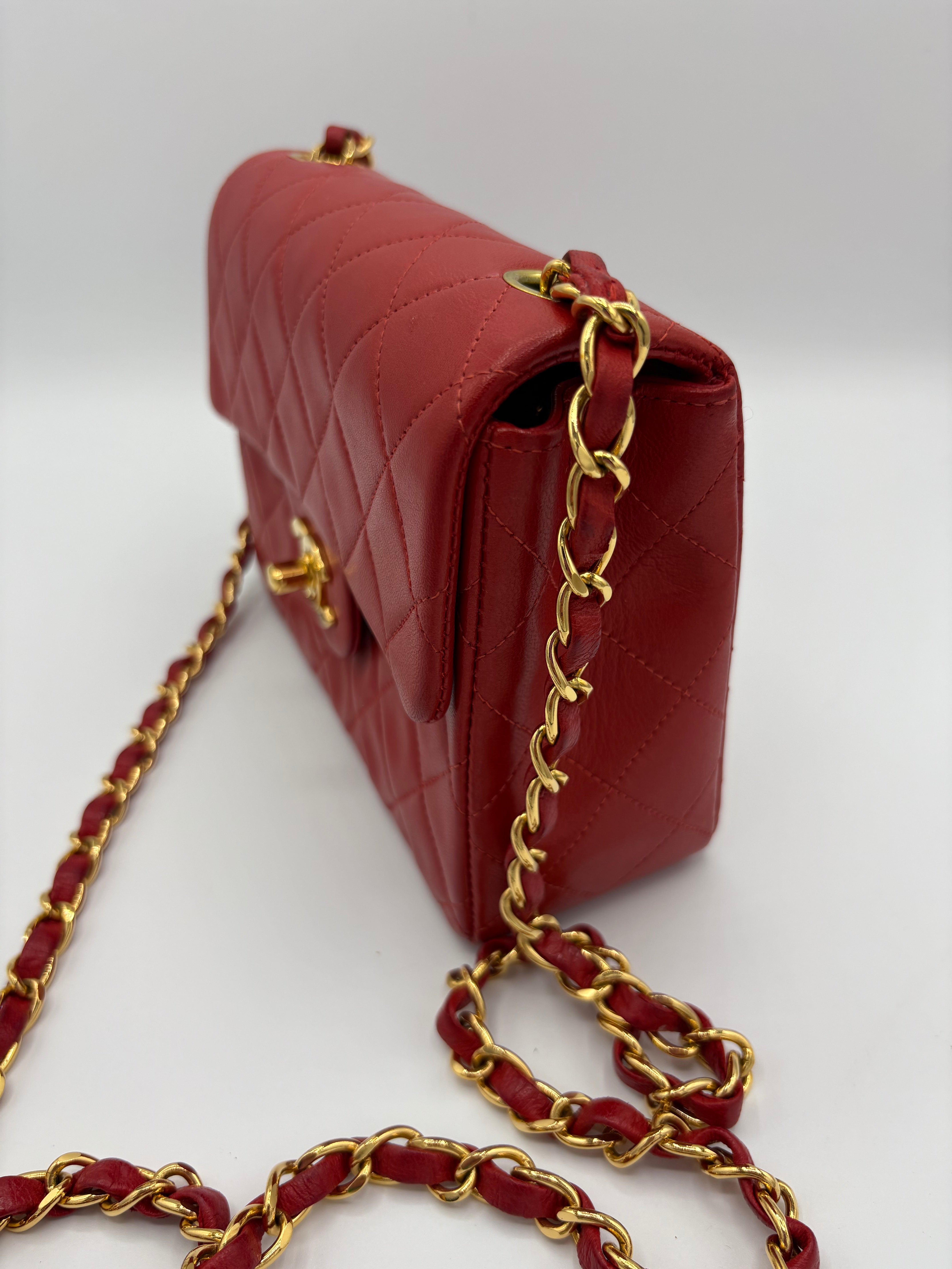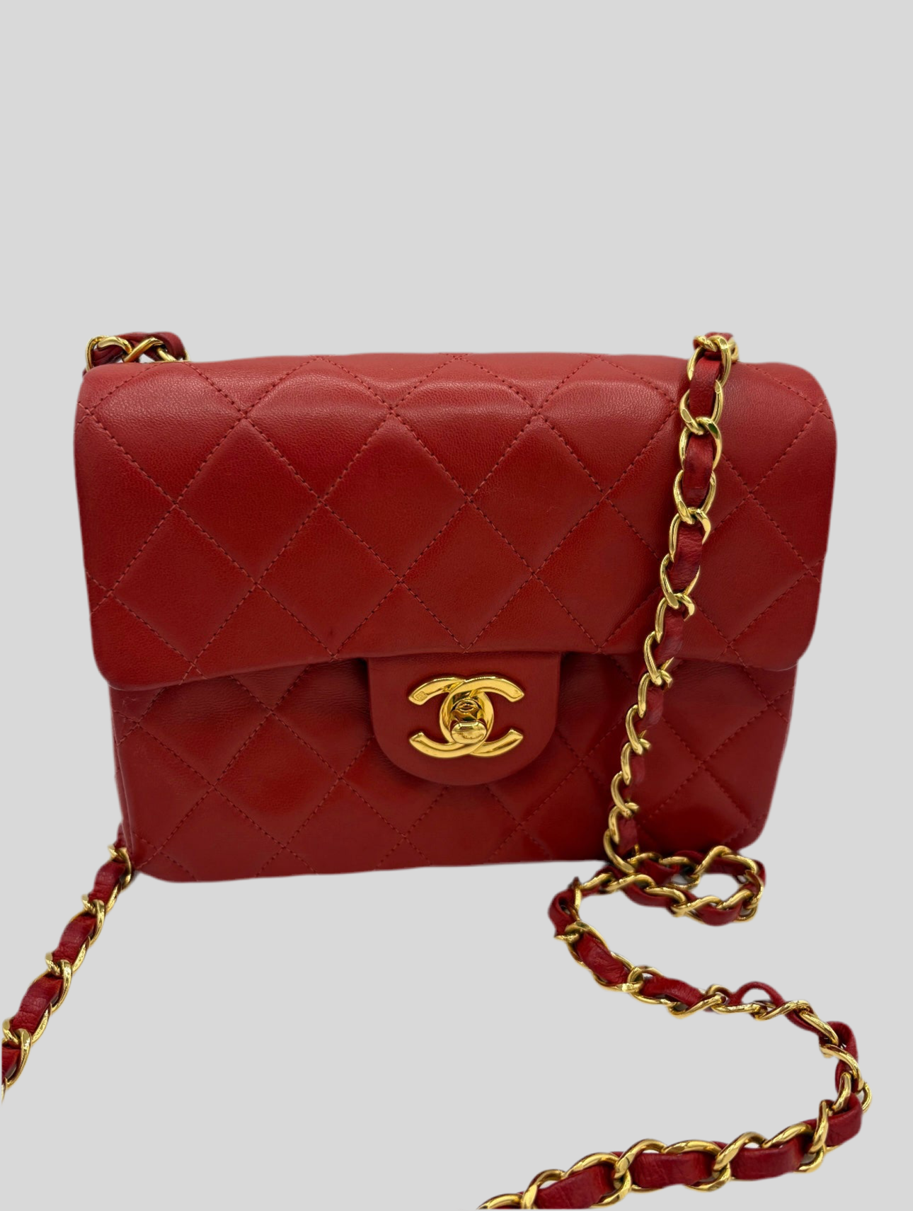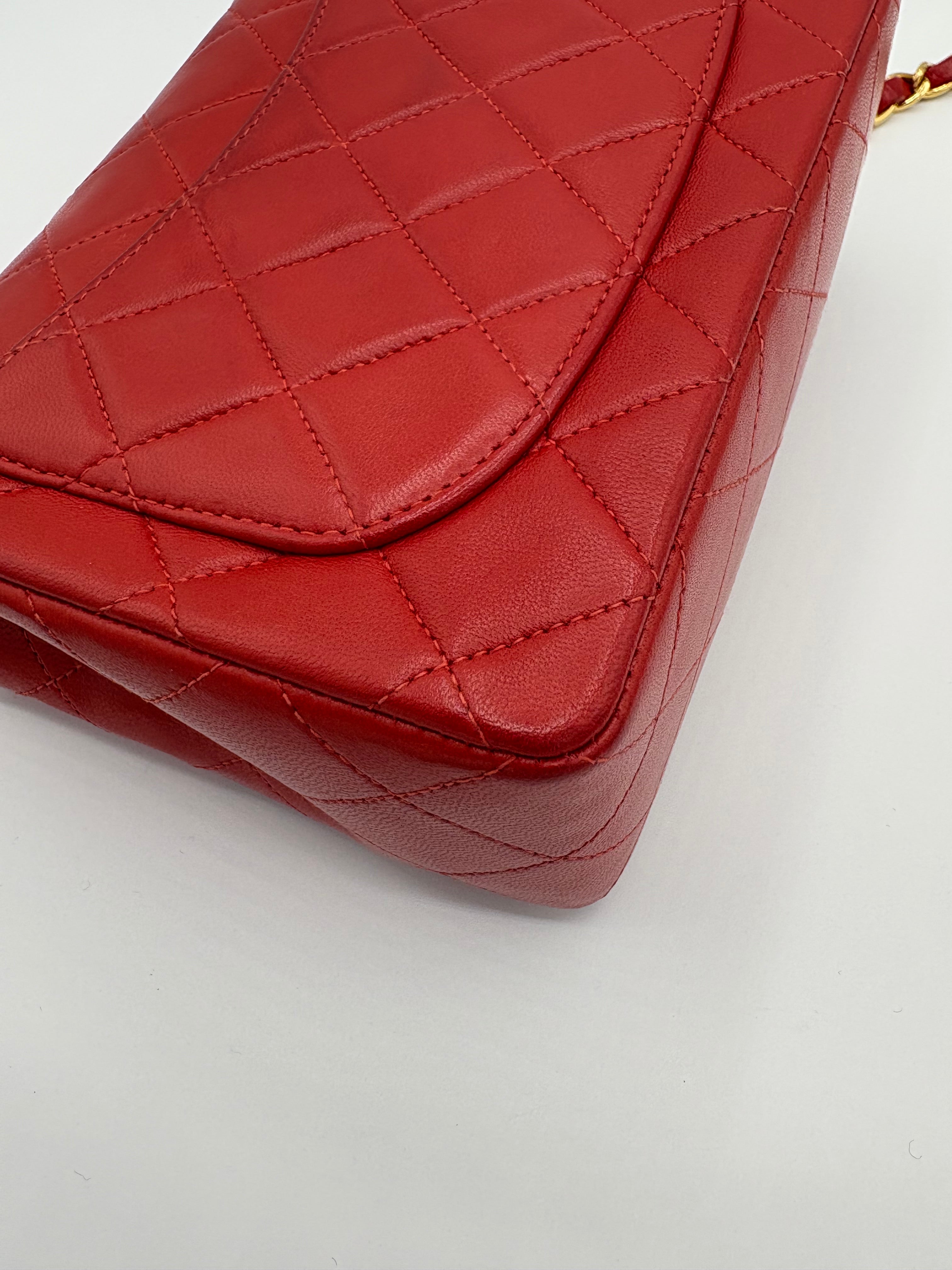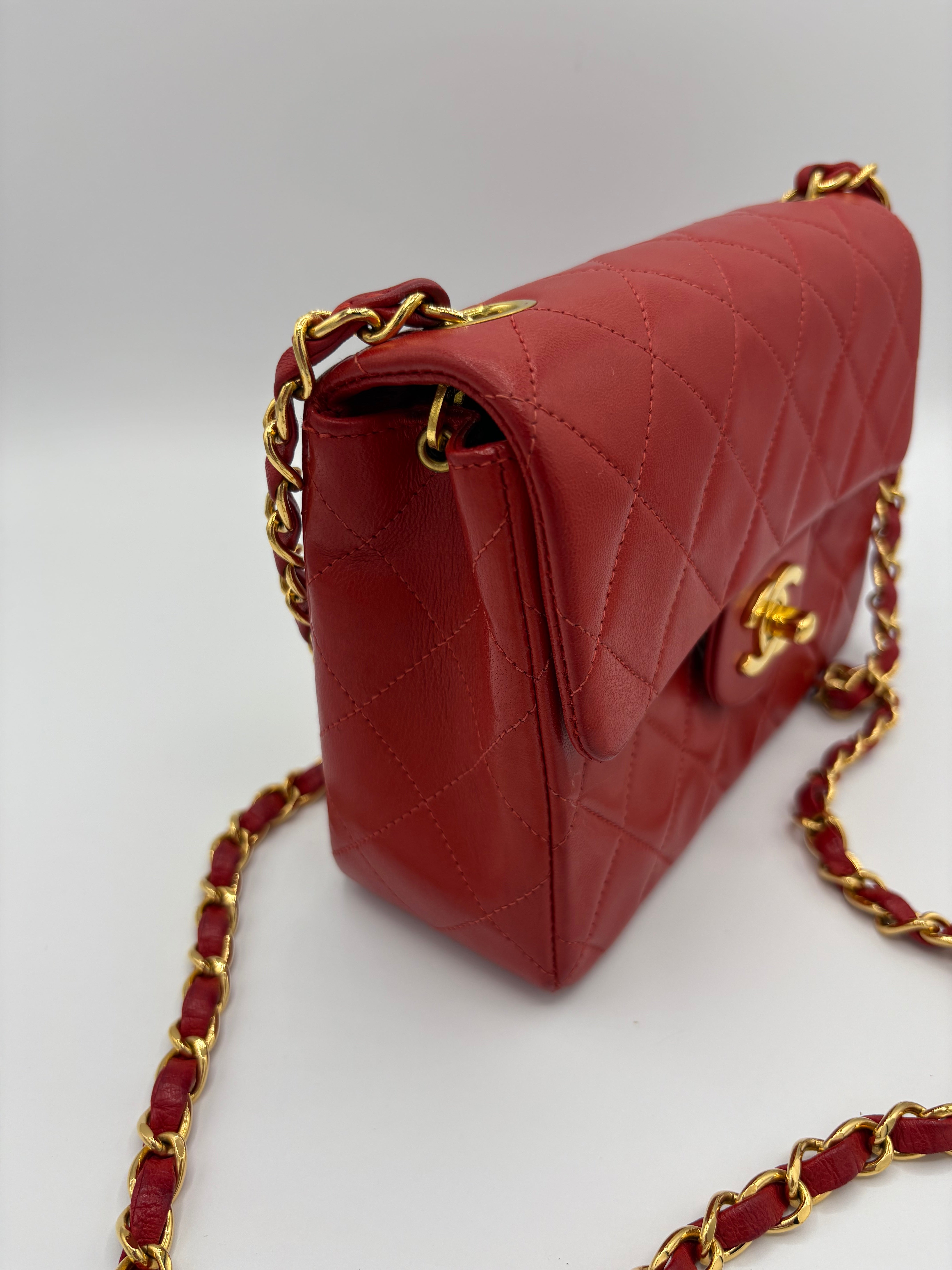 Sac Timeless Mini Square Chanel rouge en très bon état général.